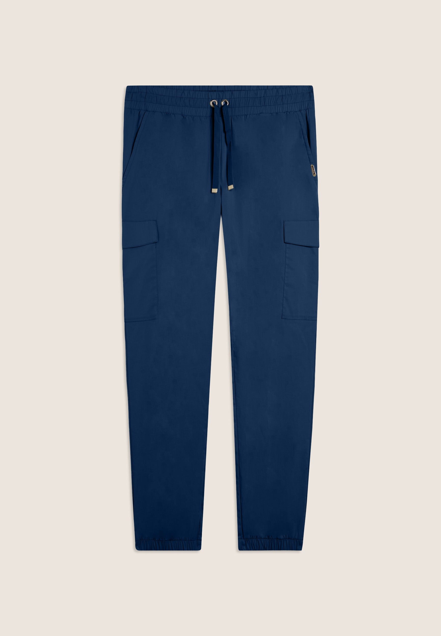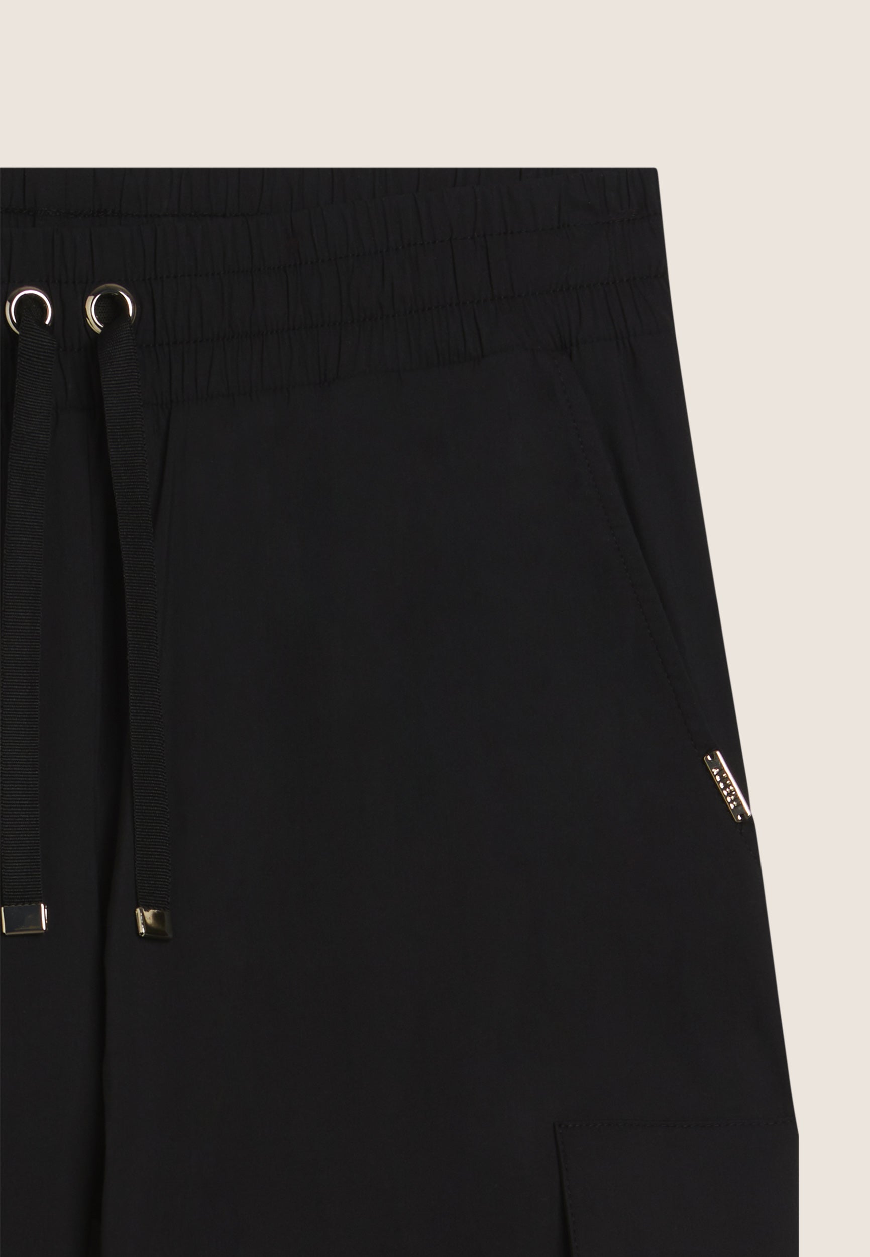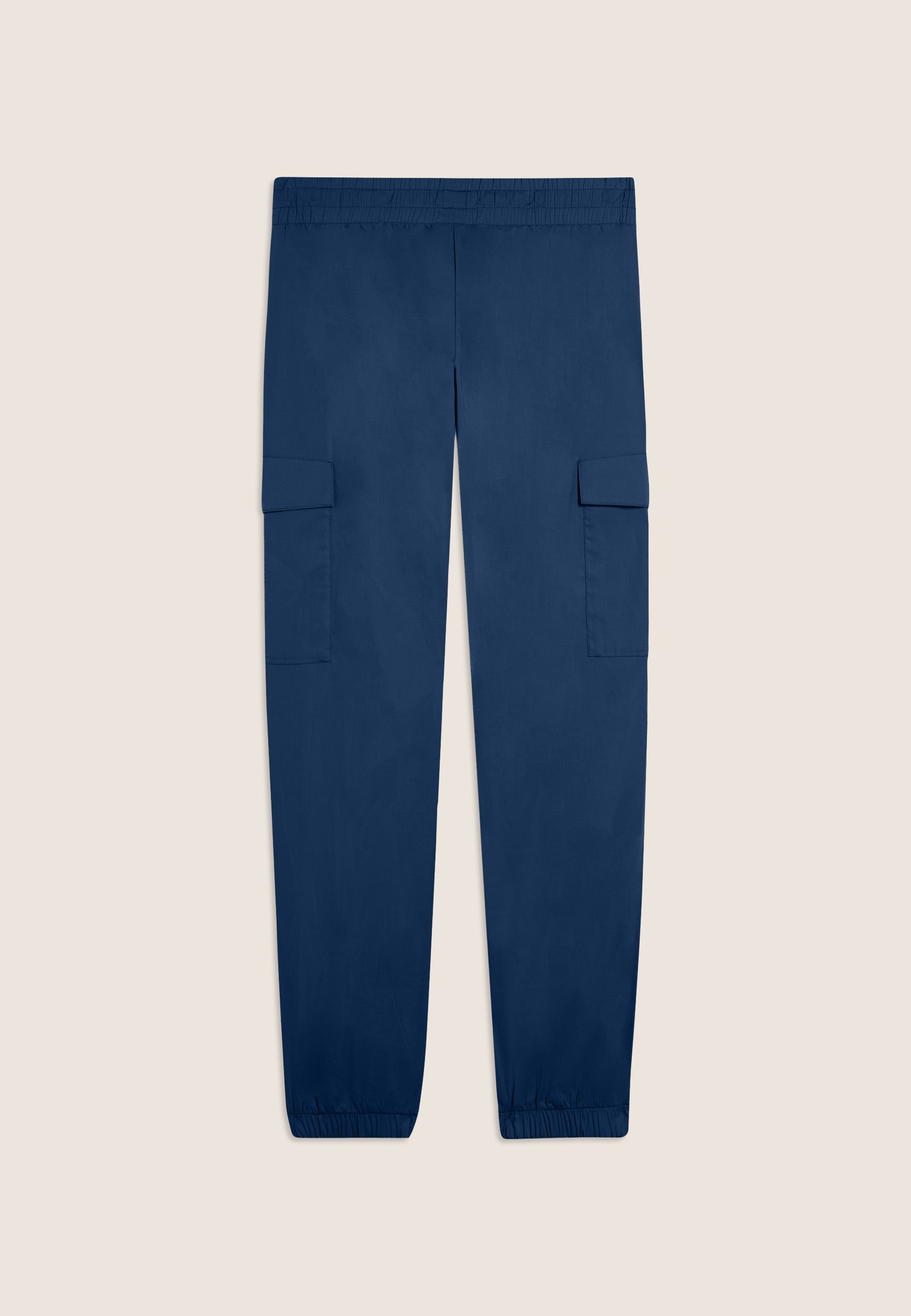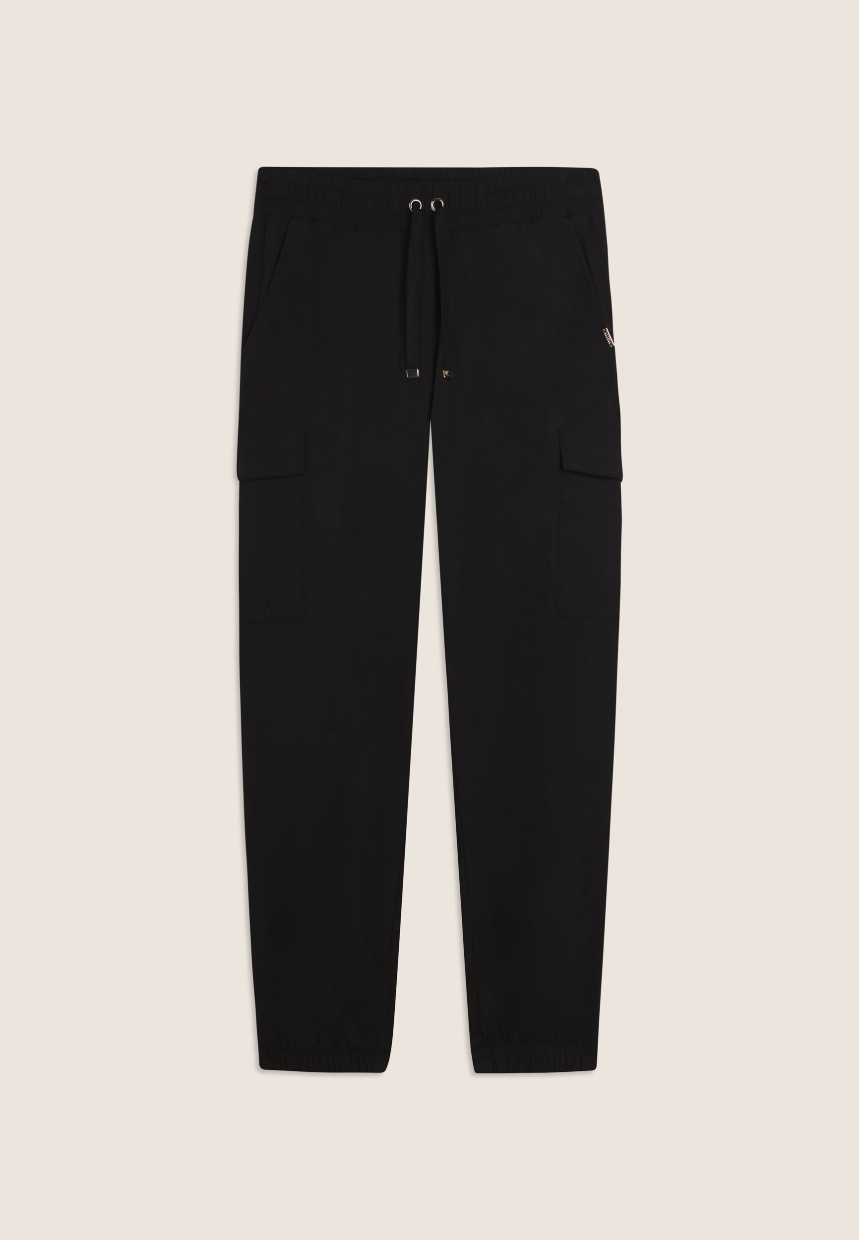 Regular-fit cargo trousers with a regular waist and drawstring and inner elastic for a gathered effect. The bottom is finished with internal elastic. Side flap pockets on the outer thighs and slant besom pockets add functionality and style. An exclusive detail is the golden FREDDY logo tab on the left pocket opening. Made of stretch poplin, these trousers are light and easy to wear, offering a perfect combination of comfort and sophistication.