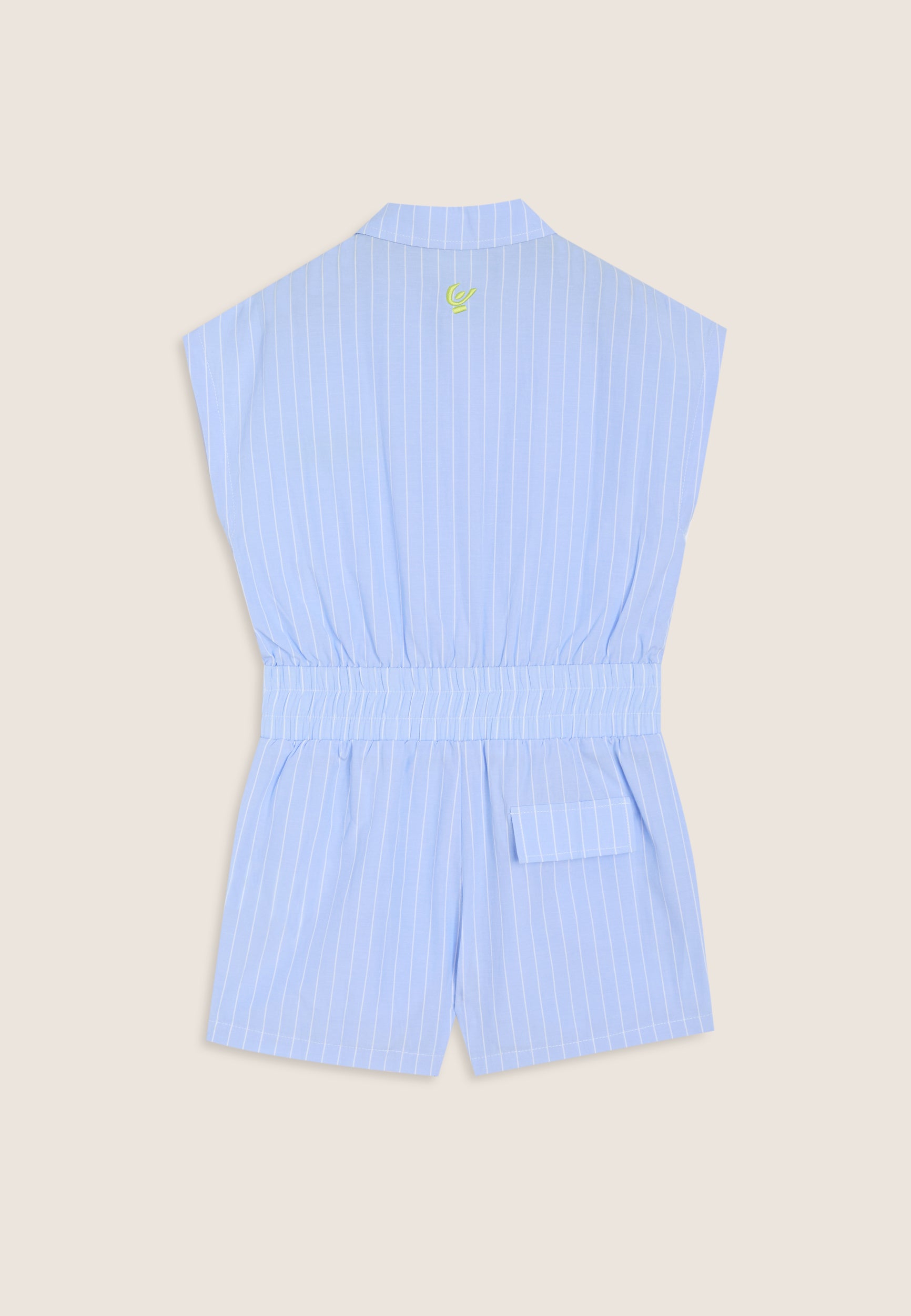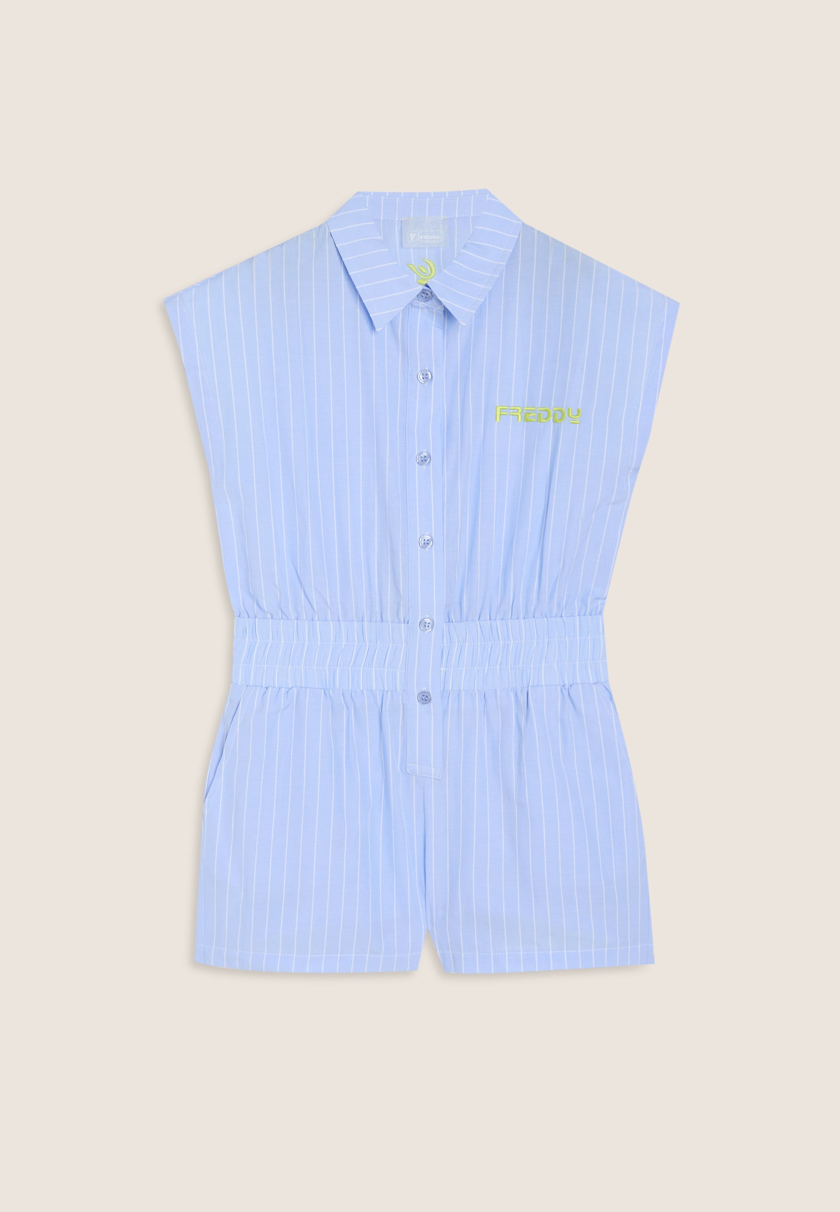 A unique and super practical garment! This regular fit jumpsuit is perfect for a comfortable and fashionable look. The striped design with internal elasticated waist, blouse neckline and buttonhole fastening to the waist makes it easy to wear. Sleeveless for a cool touch, it is embellished with the FREDDY logo on the chest. Equipped with besom slash pockets and a mock rear flap pocket, it is perfect for any occasion!