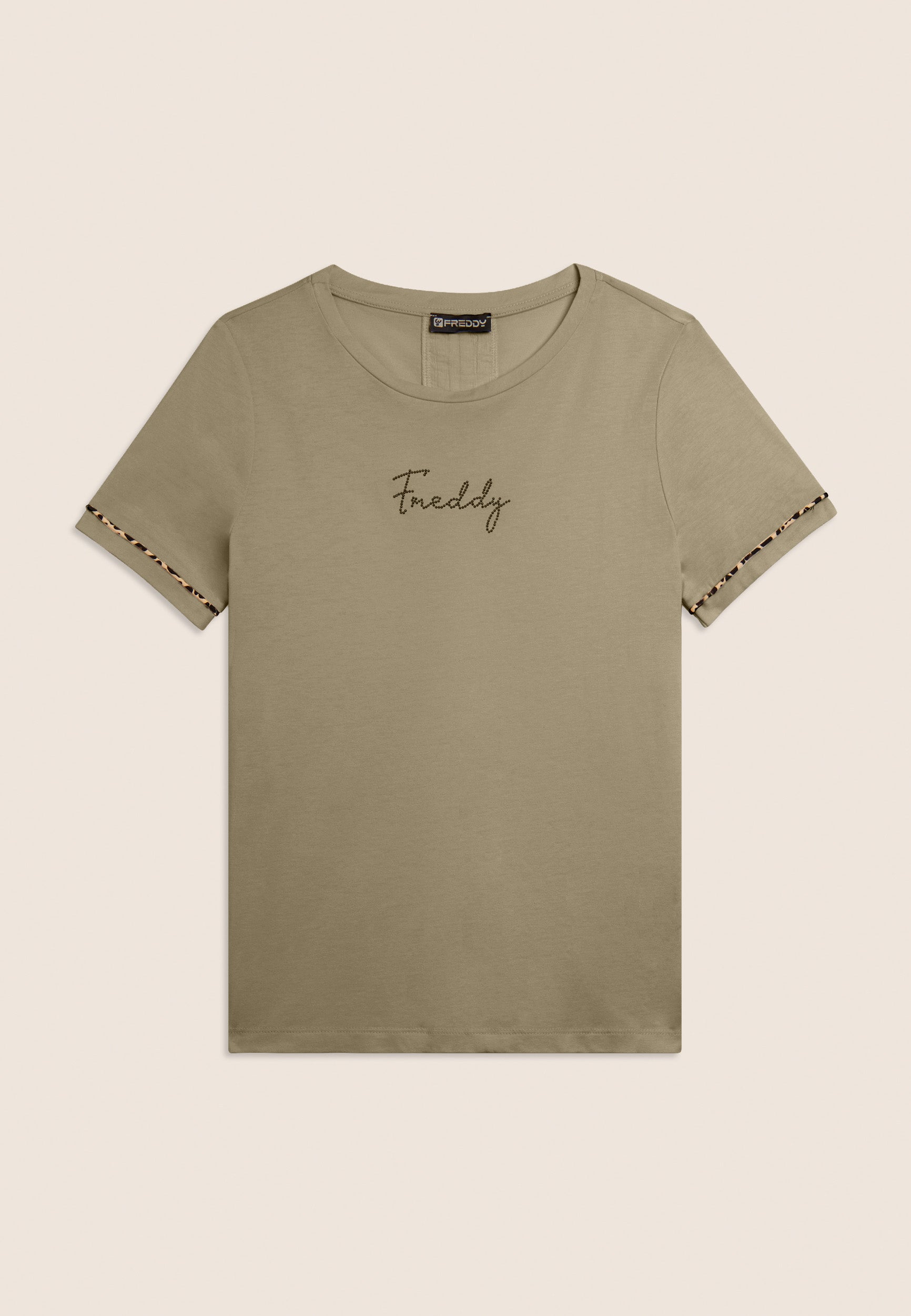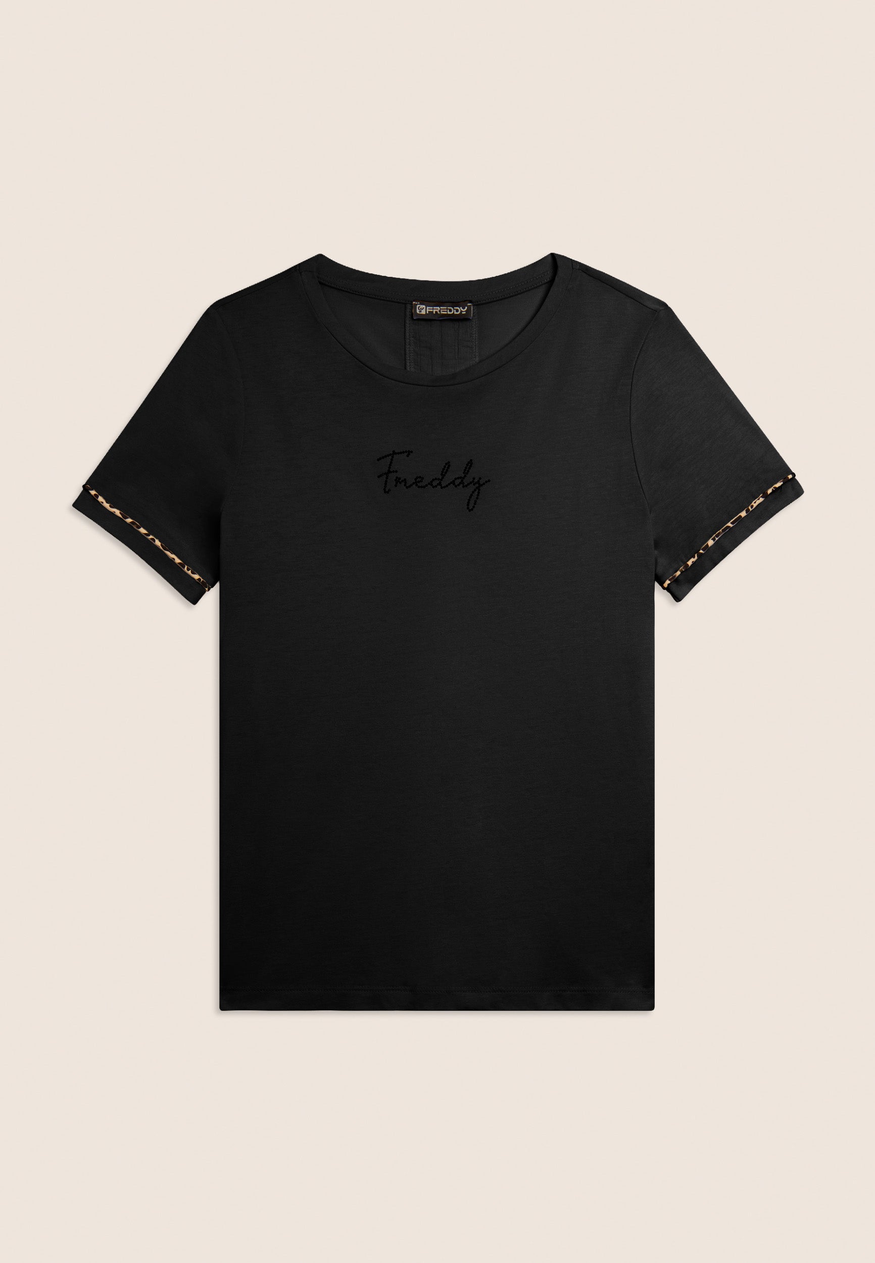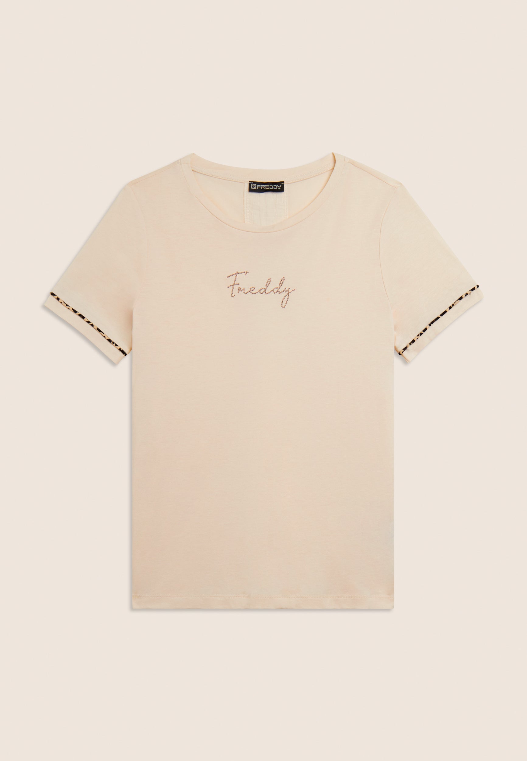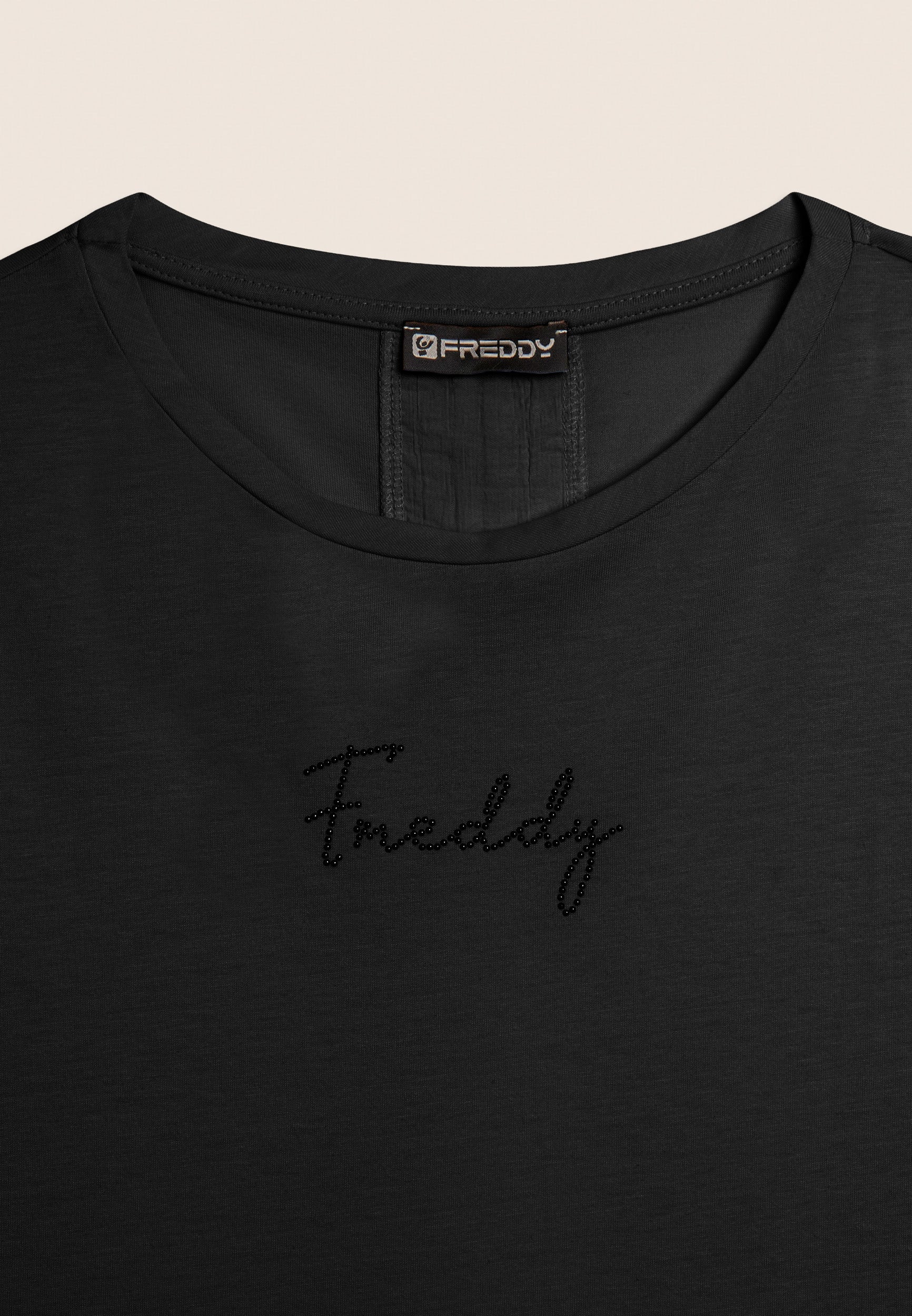 Short sleeve t-shirt in cotton jersey and modal, for a soft and fresh feel on the skin. The design is enriched by an insert on the back in light crinkle shuttle-woven fabric with a crinkled effect for a touch of movement. Animal piping on the sleeve bottom gives a fashionable touch, and the small studded Freddy logo illuminates the chest. Regular fit and straight bottom for an essential yet detailed look.