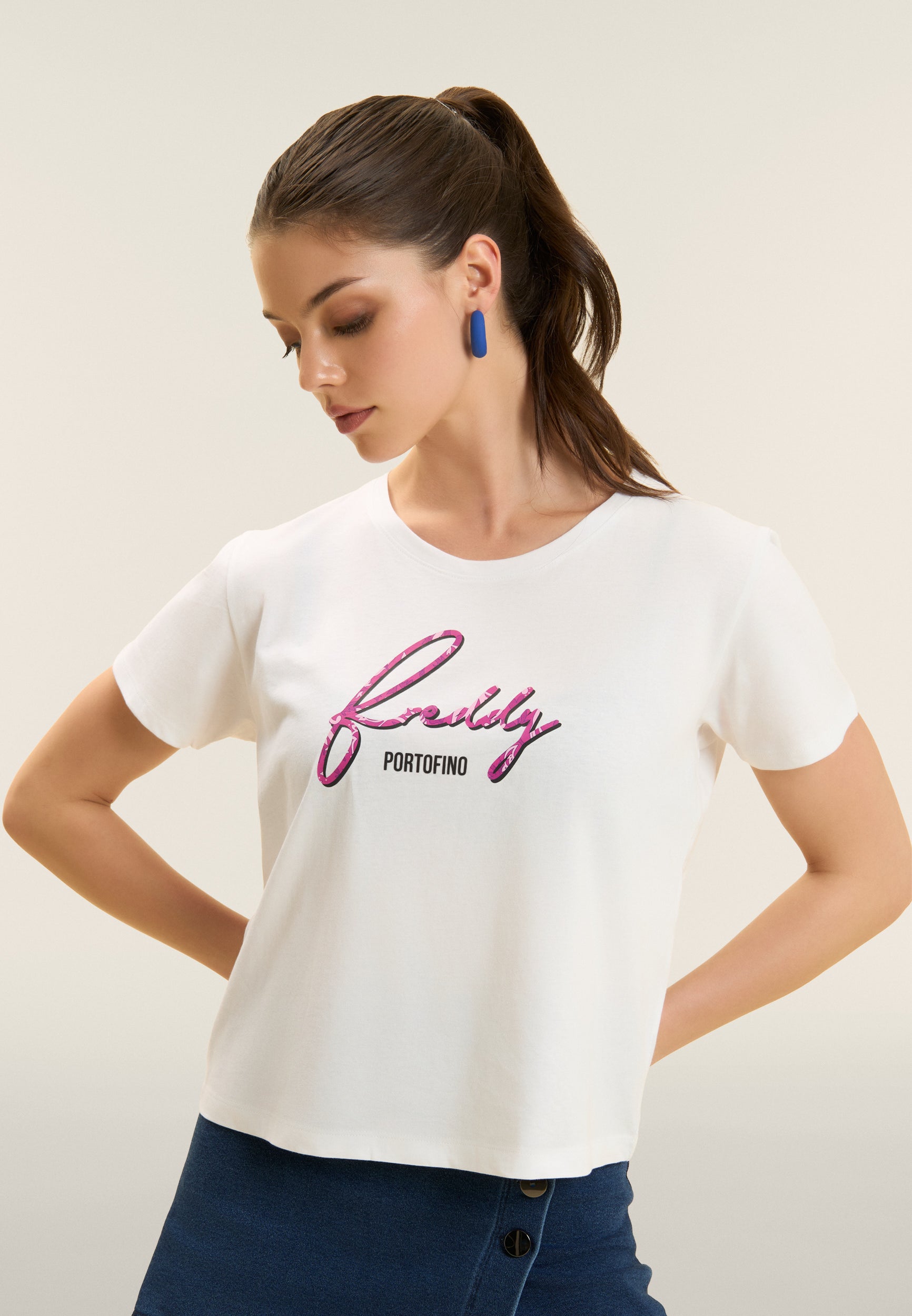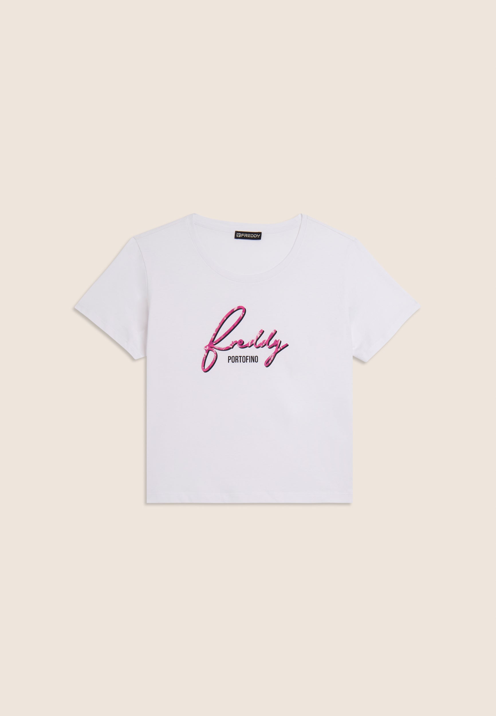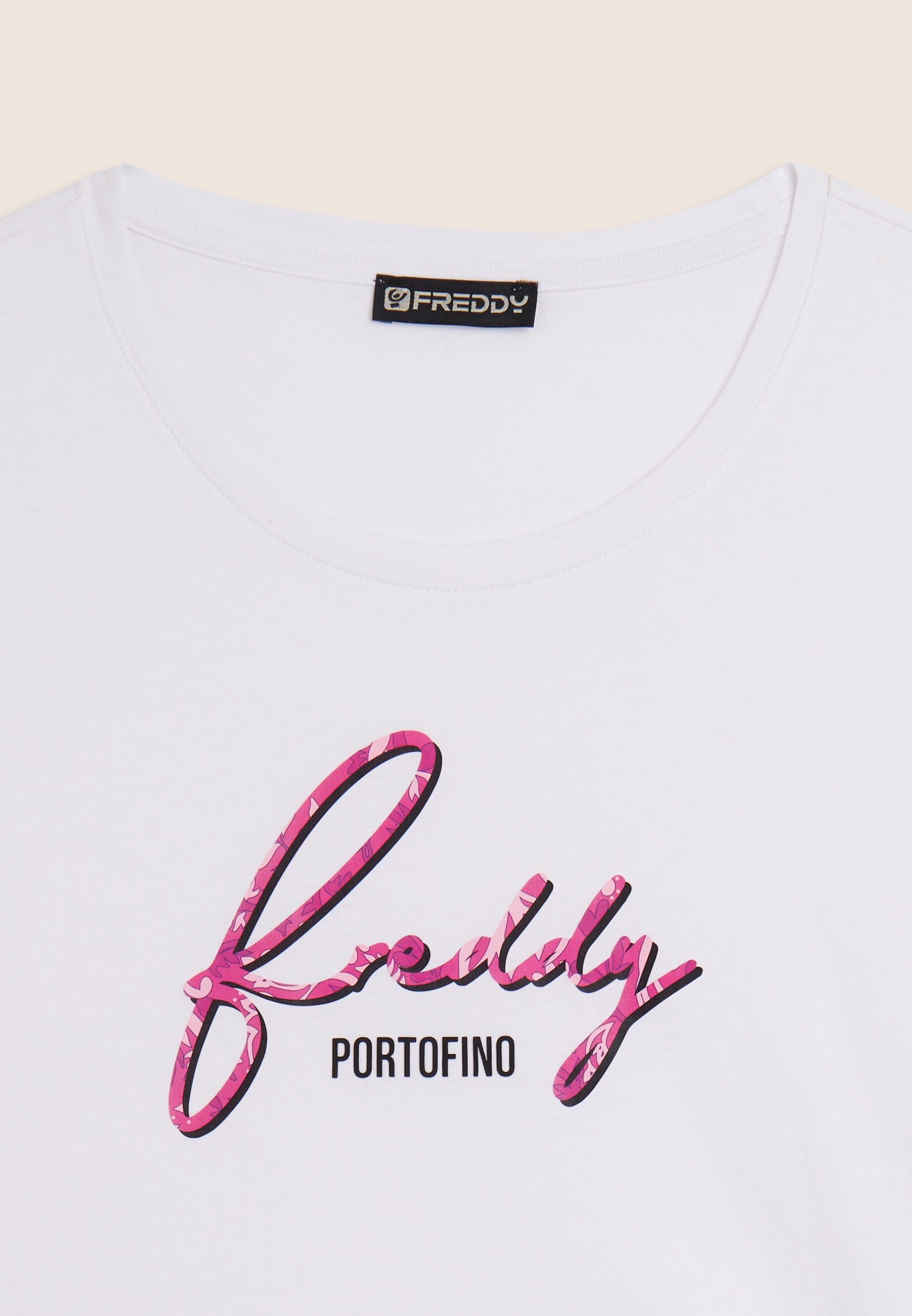A classic revisited in a feminine key: this short-sleeved t-shirt in Supima cotton jersey is distinguished by the FREDDY logo in italics printed with a floral texture. The regular design with straight bottom, round neckline and short sleeves makes it ideal for detailed casual looks. The comfort of the fabric is combined with a distinctive style, perfect for every moment of the day.