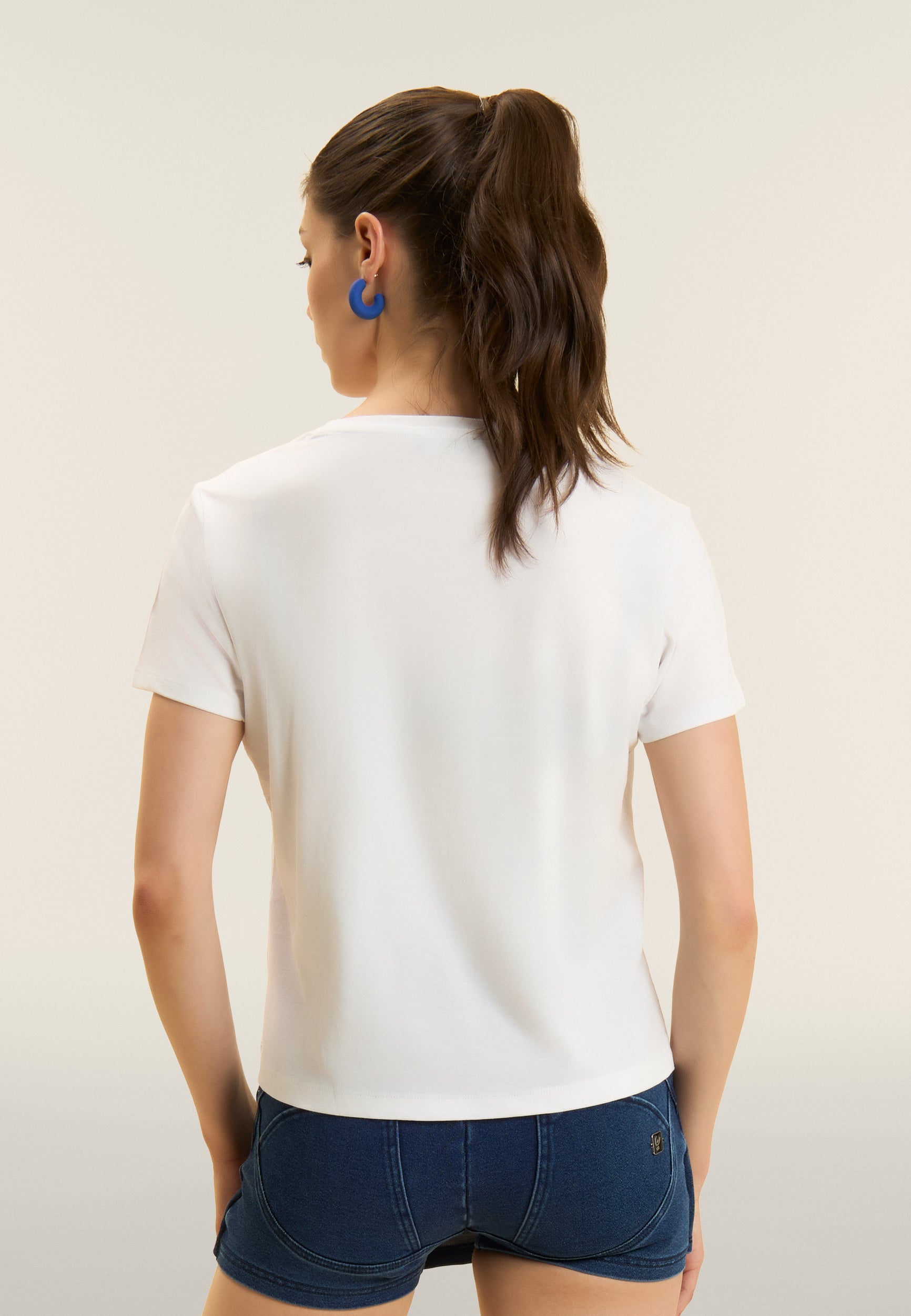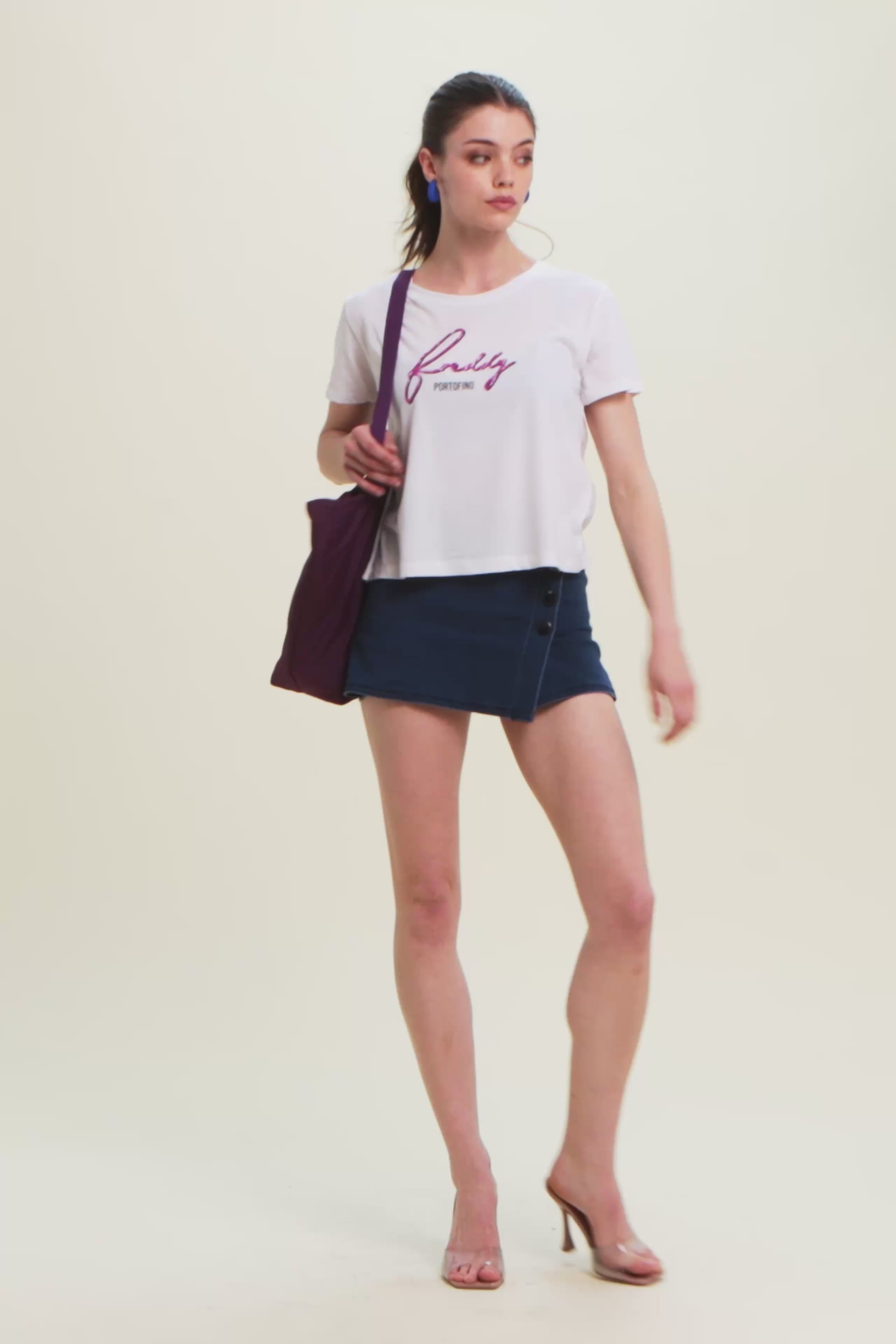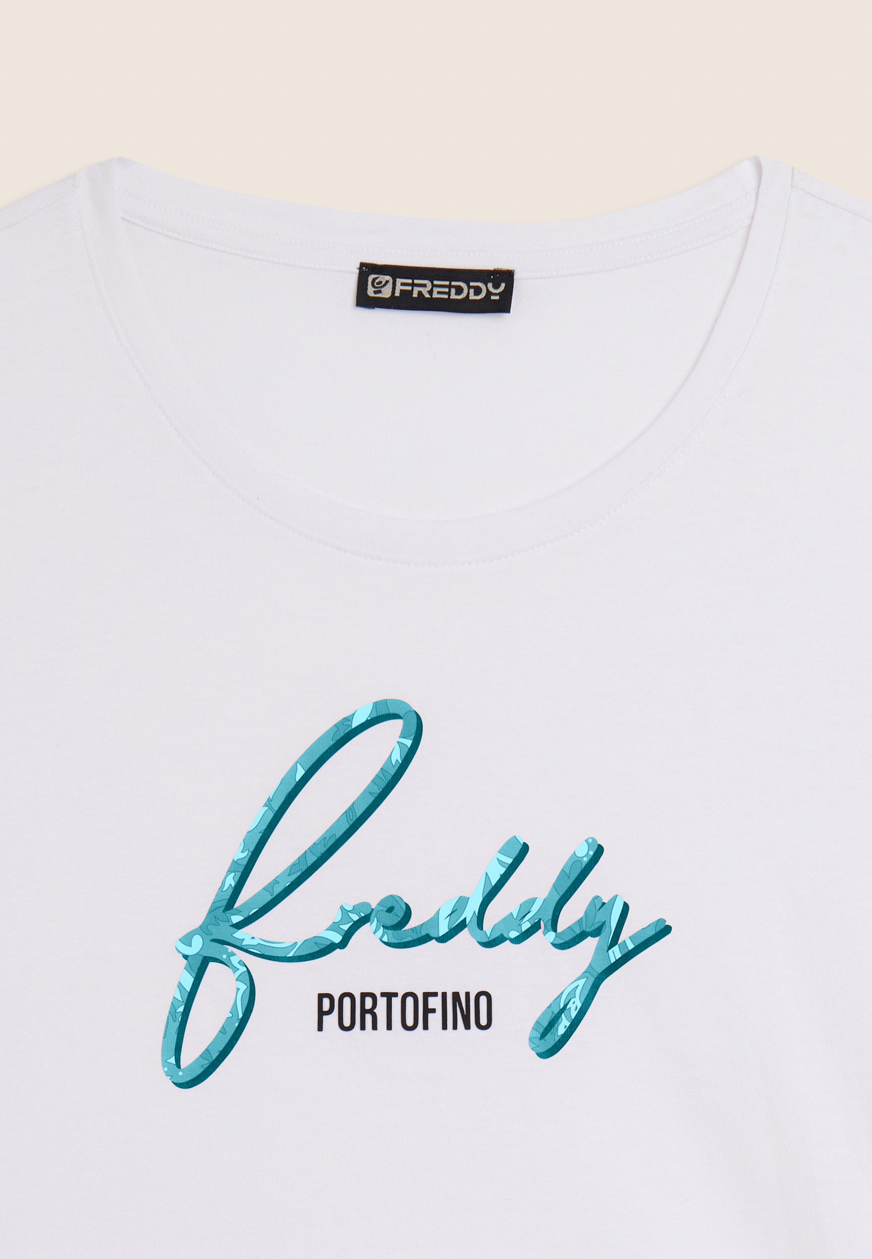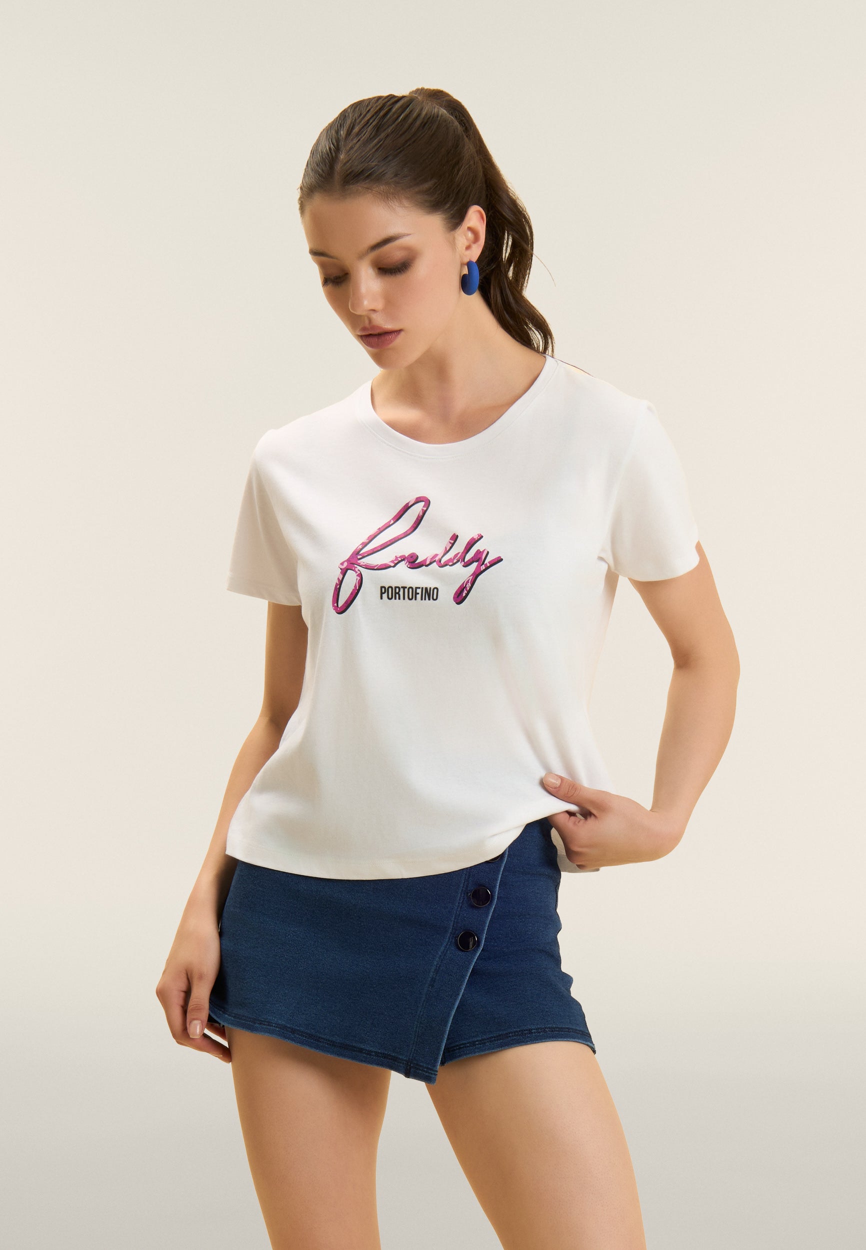 A classic revisited in a feminine key: this short-sleeved t-shirt in Supima cotton jersey is distinguished by the FREDDY logo in italics printed with a floral texture. The regular design with straight bottom, round neckline and short sleeves makes it ideal for detailed casual looks. The comfort of the fabric is combined with a distinctive style, perfect for every moment of the day.