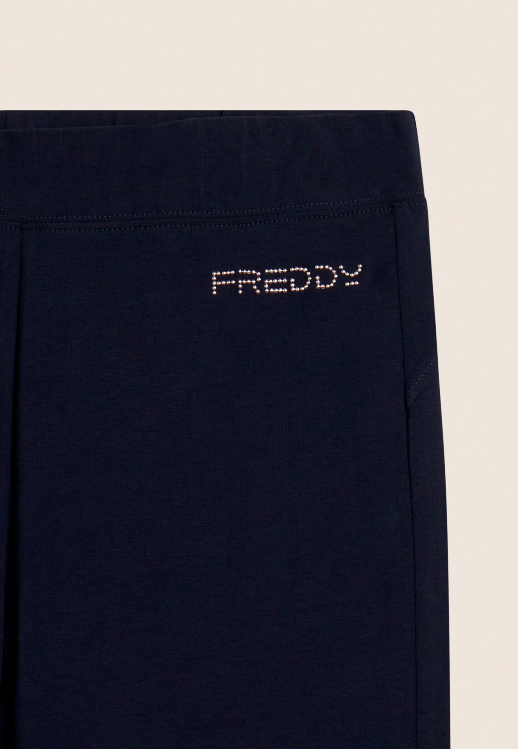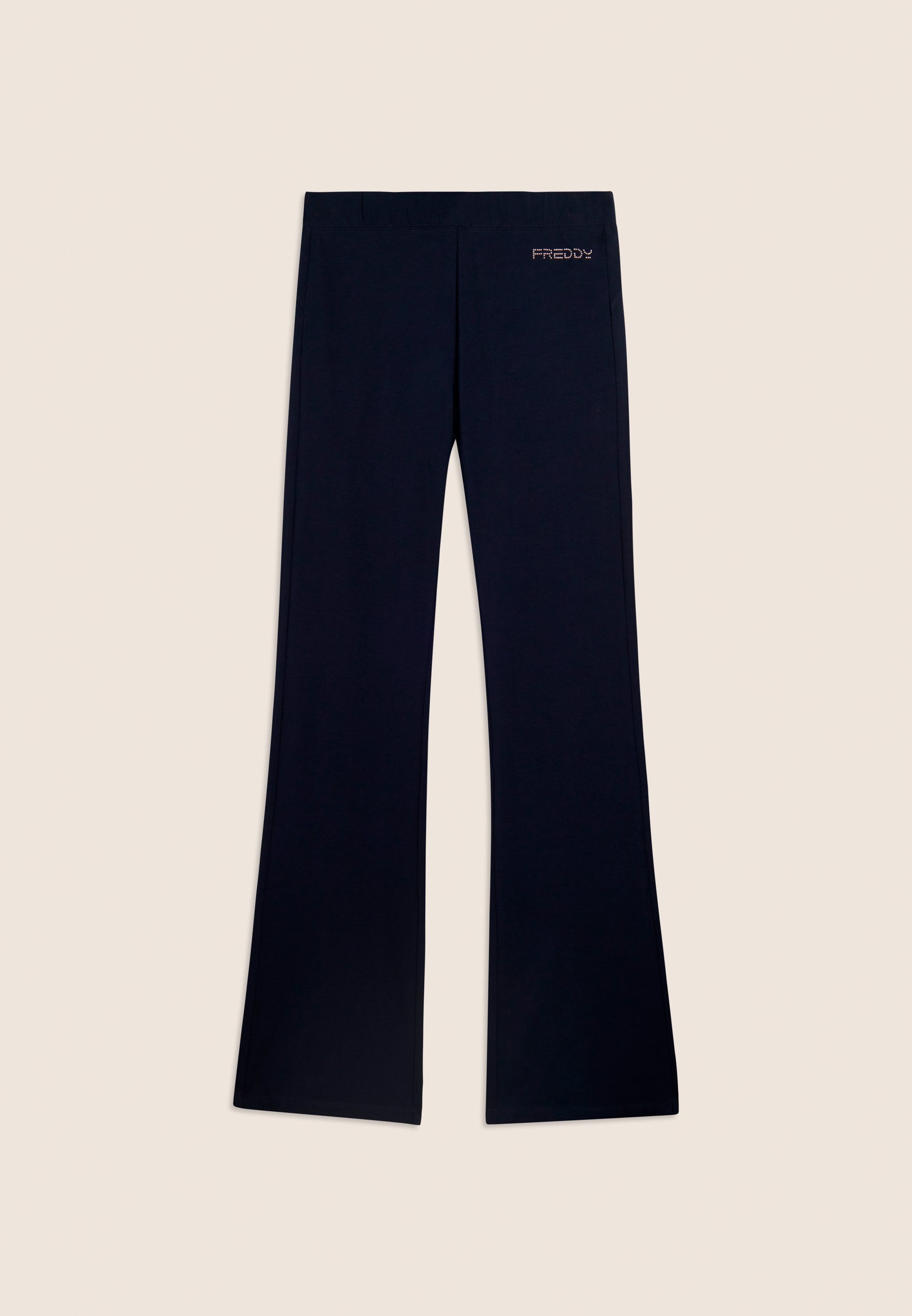 Tight-fitting leggings with flared leg bottoms and full length, offering a modern and versatile look. The regular waist ensures a comfortable fit. The FREDDY logo on the left front side, composed of light pink beads, adds a distinctive touch. Made of heavy cotton stretch jersey, they are ideal for dynamic leisure and low-intensity sports.