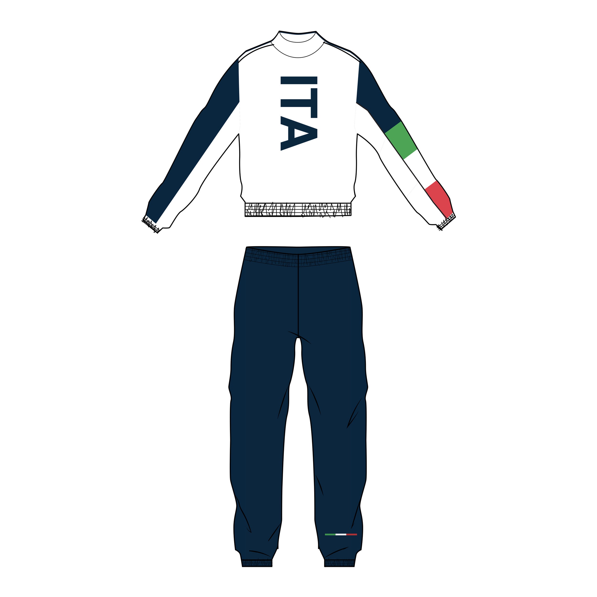 Il design bicolore – felpa bianca e pantalone blu – richiama i colori simbolo dell'Italia. La felpa è dotata di collo alto in costina, chiusura full zip, maniche bicolore e fondo con fascia in costina. Le tasche interne sono chiuse da zip, come anche quelle dei pantaloni, che presentano vita regular con coulisse interna regolabile e fondo in costina.