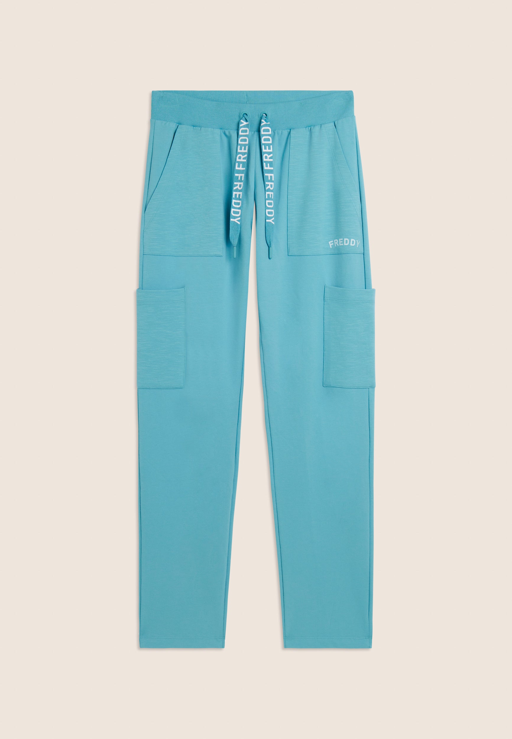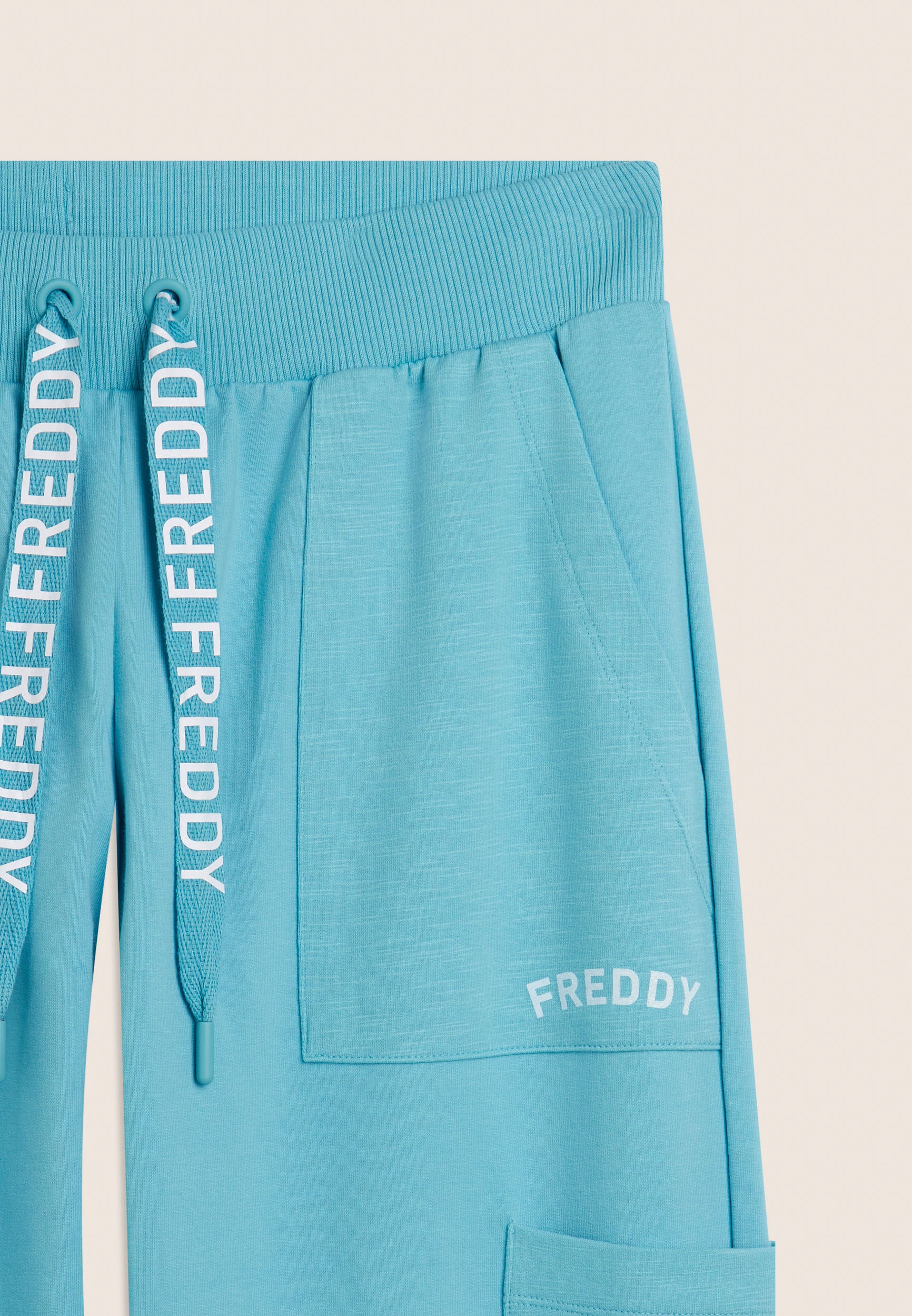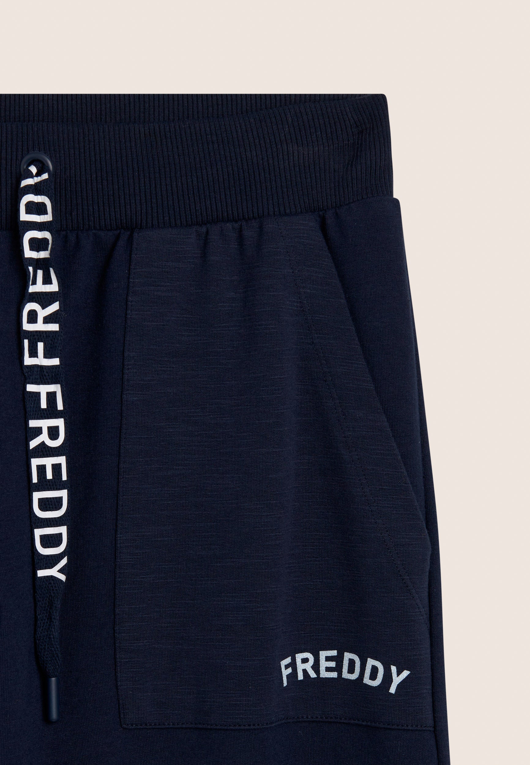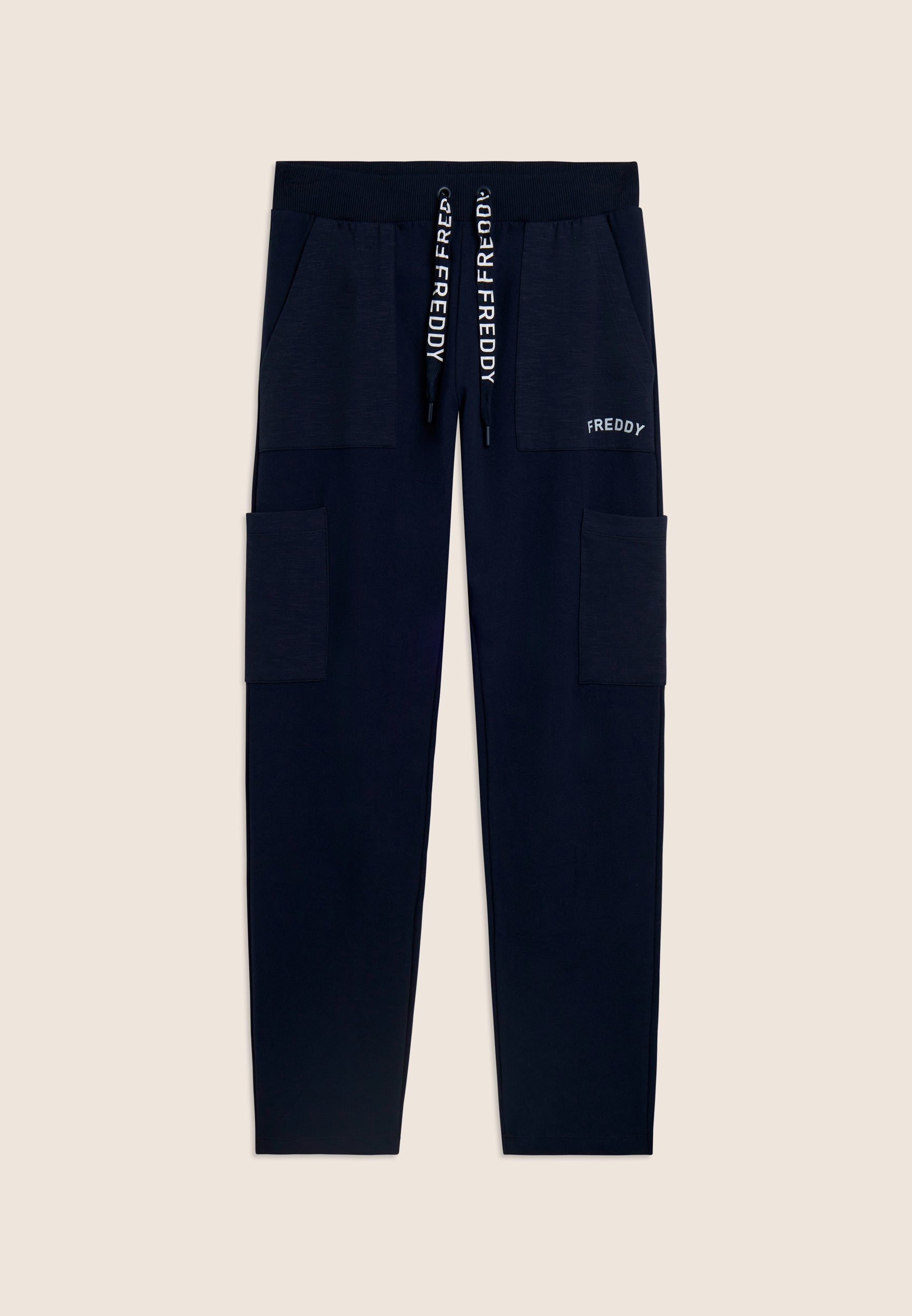 Regular straight-bottomed trousers with ribbed waist and FREDDY logo drawstring. The front and side pockets are made of slub fabric for a refined contrast of textures. The FREDDY glitter logo on the left side illuminates the garment. Ideal for mid-seasons, due to the stretch French Terry fabric.