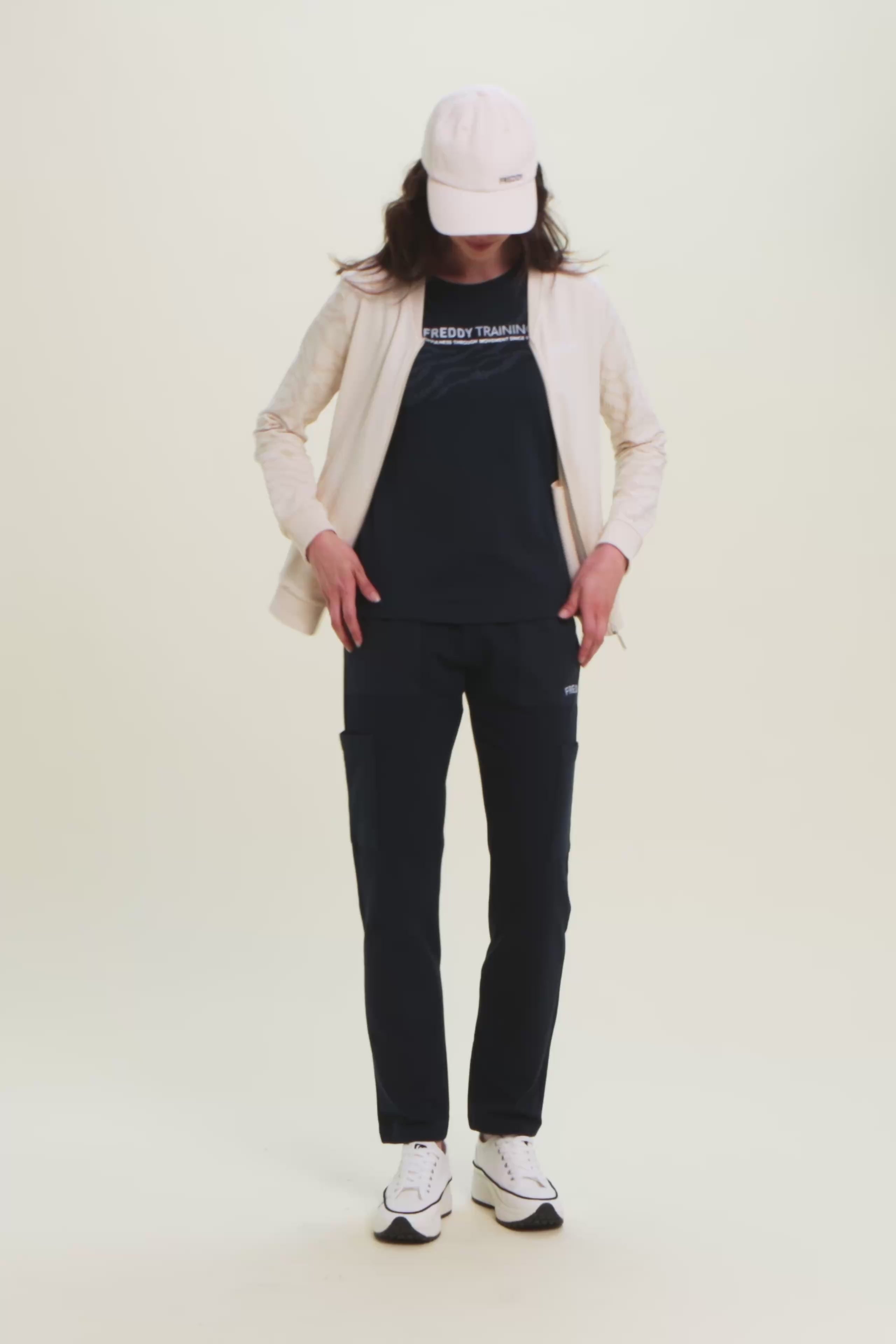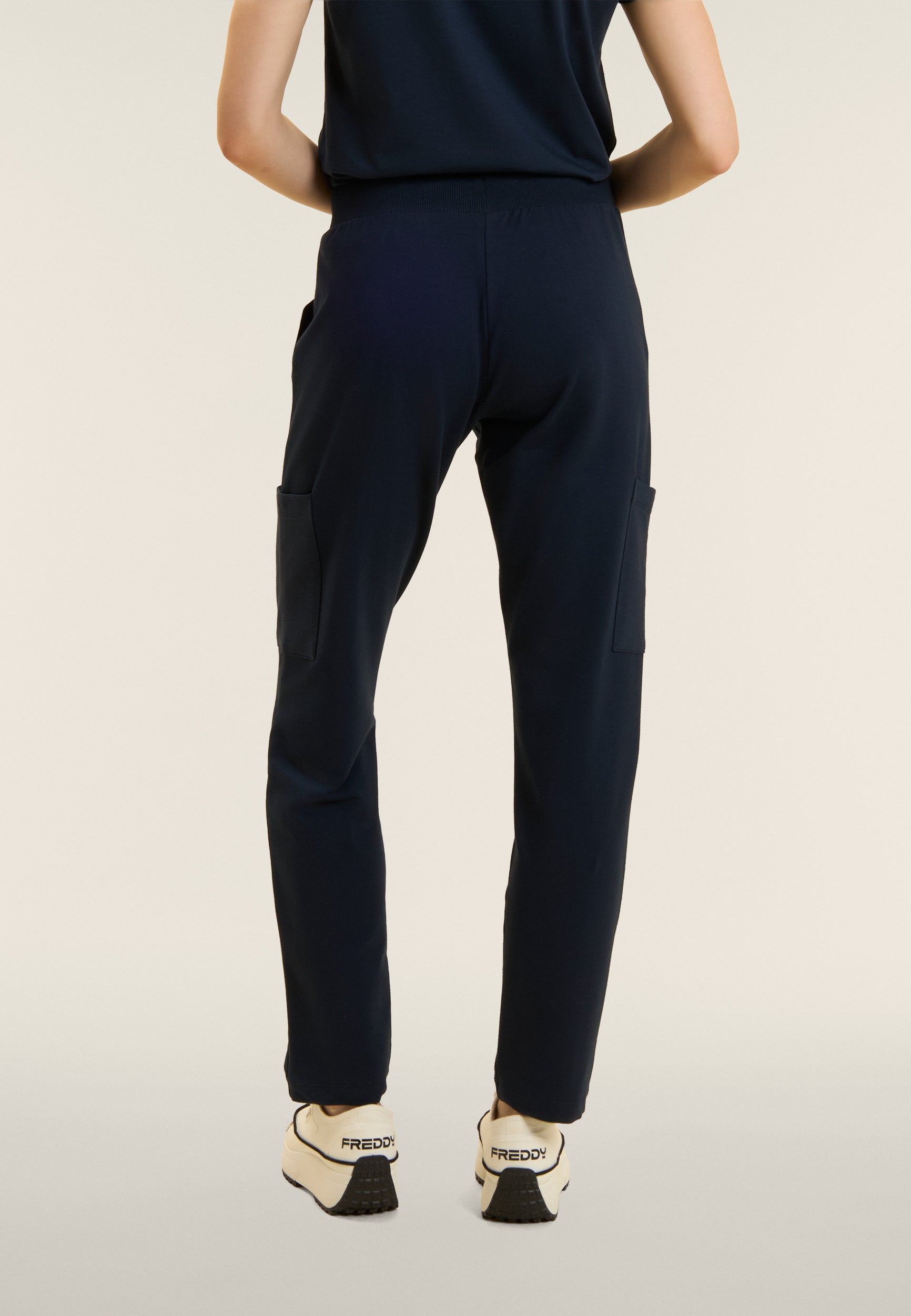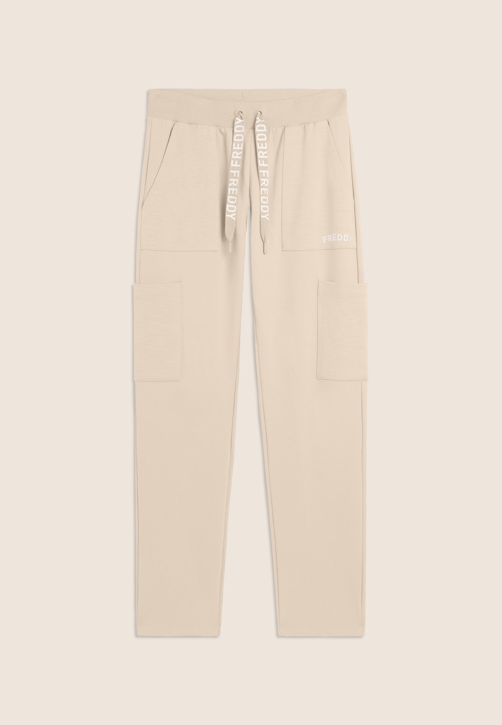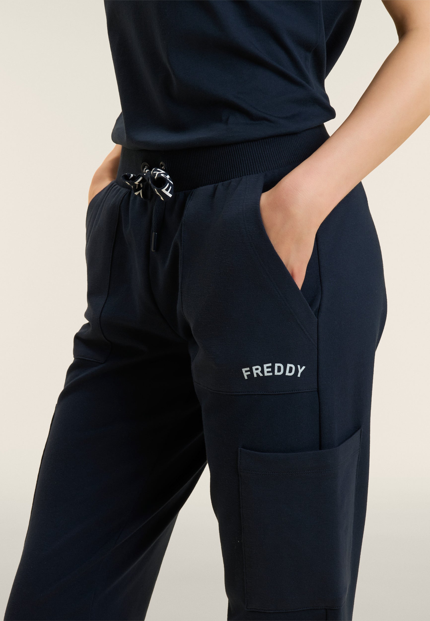 Regular straight-bottomed trousers with ribbed waist and FREDDY logo drawstring. The front and side pockets are made of slub fabric for a refined contrast of textures. The FREDDY glitter logo on the left side illuminates the garment. Ideal for mid-seasons, due to the stretch French Terry fabric.
