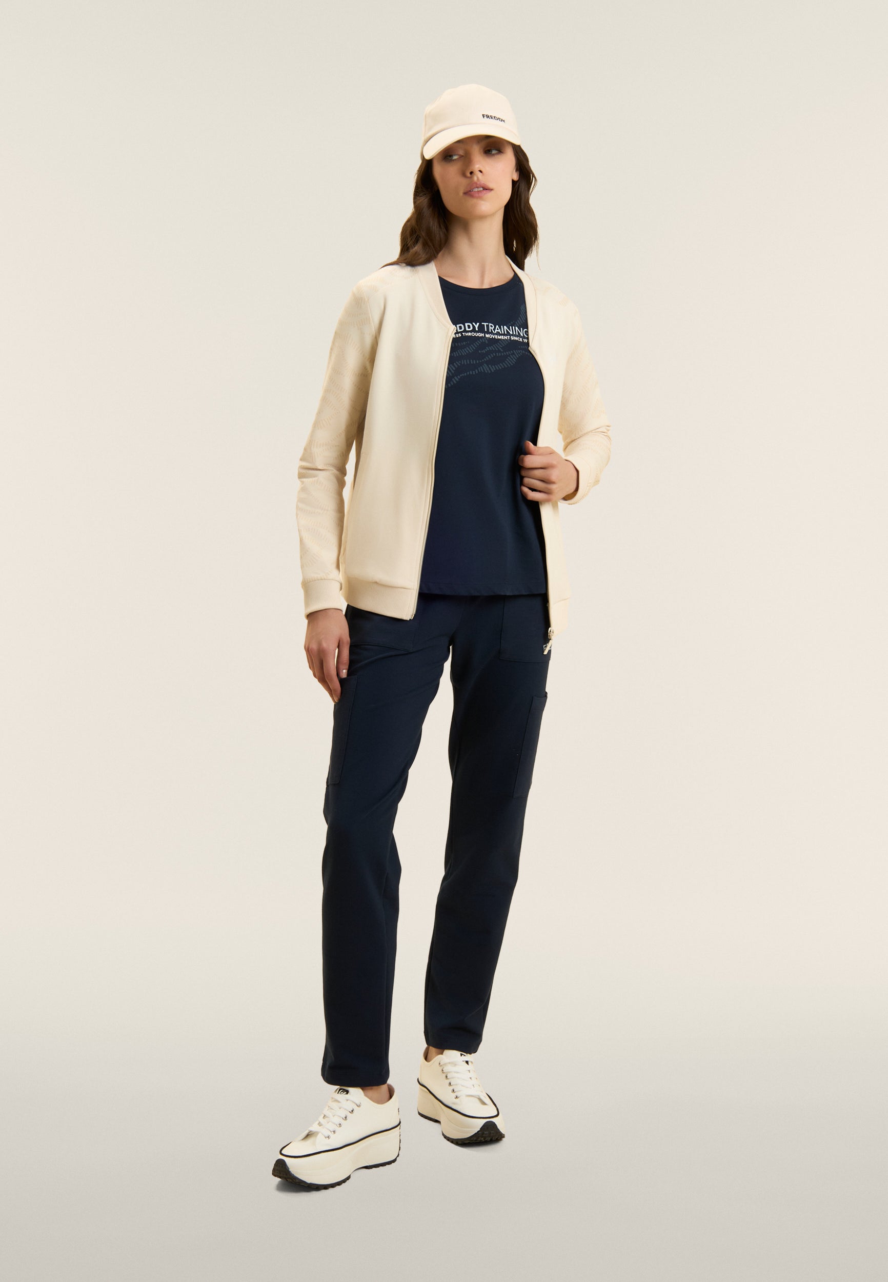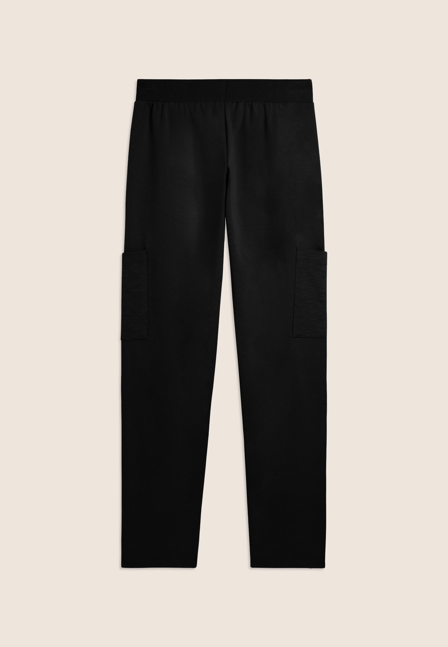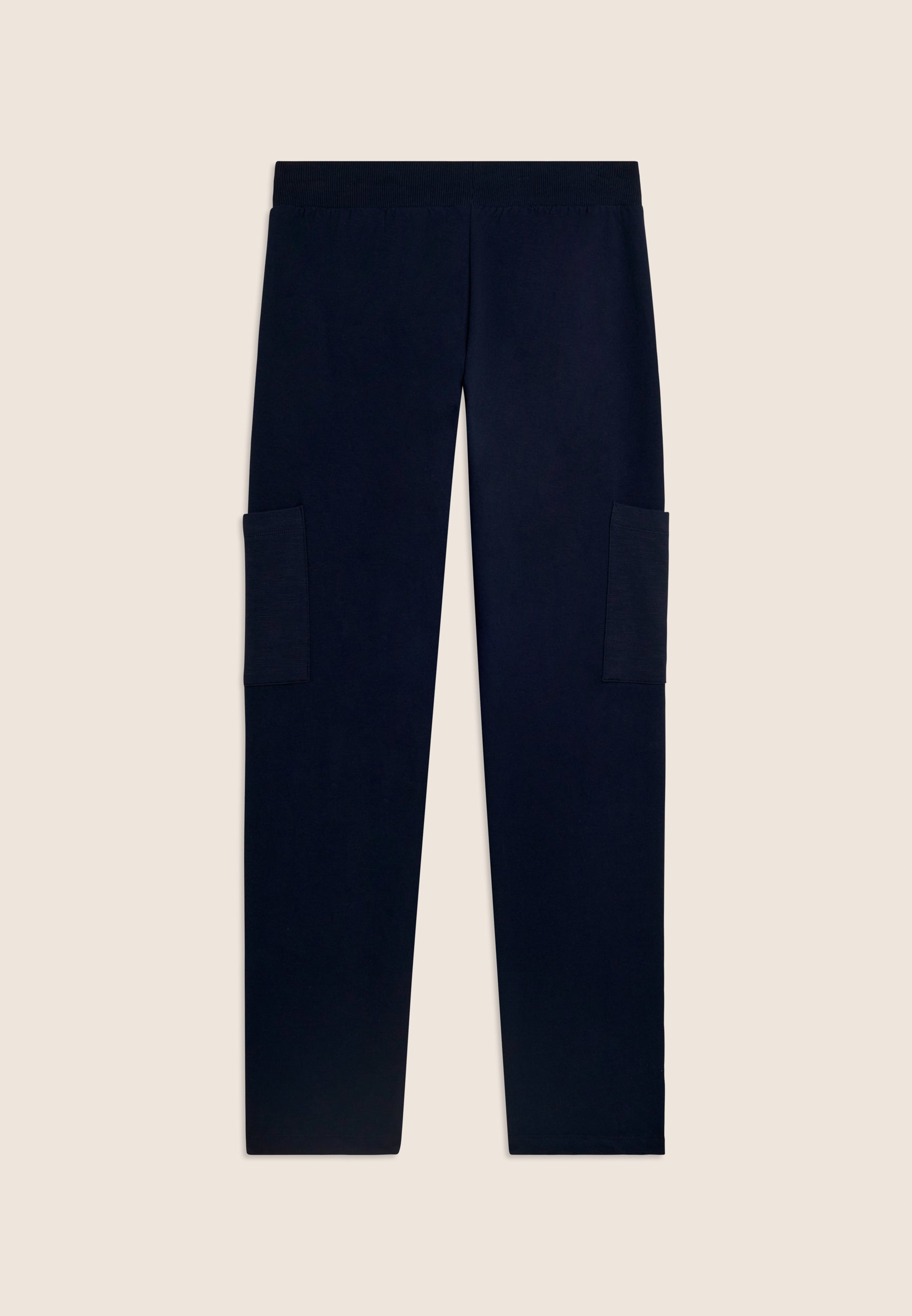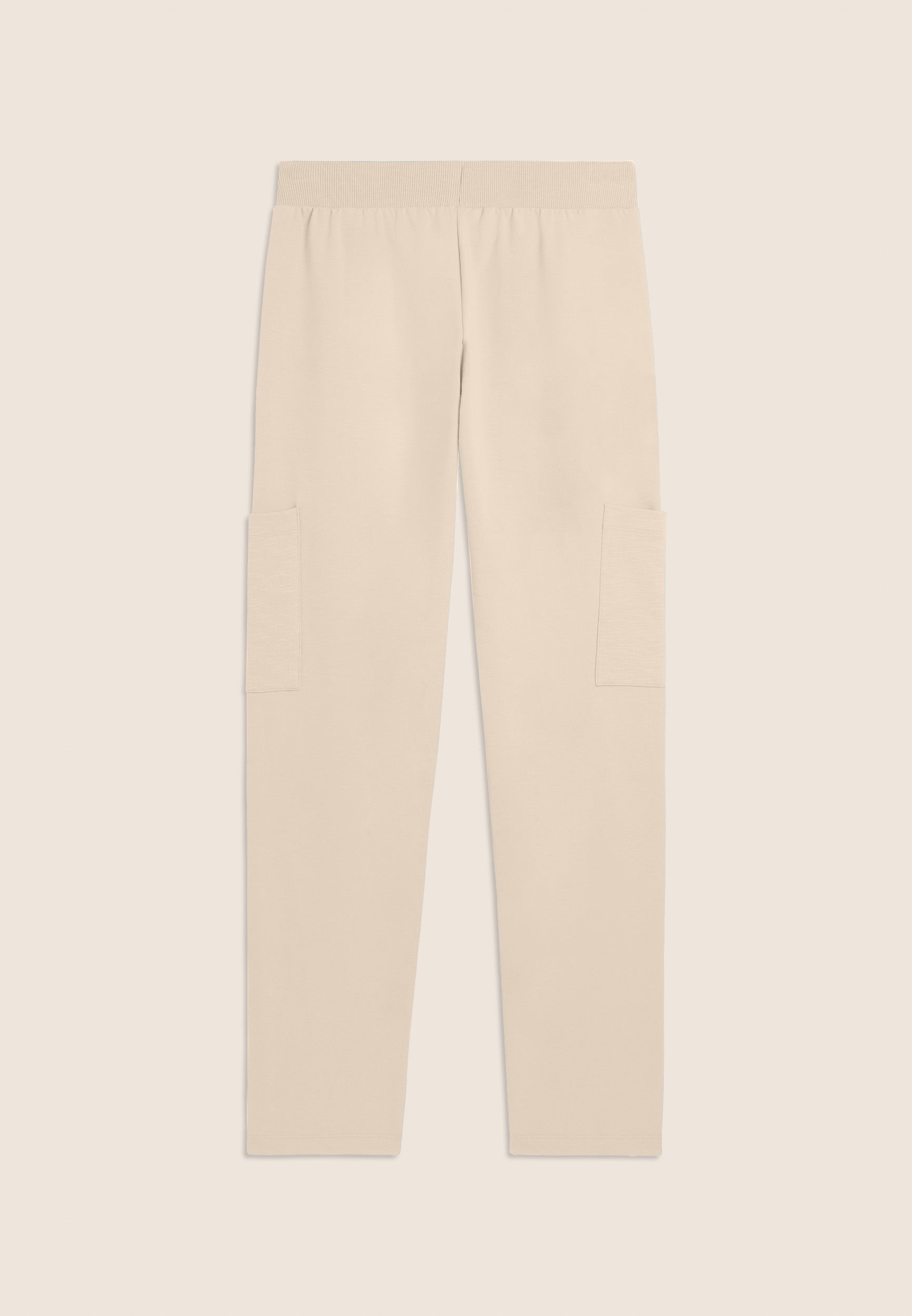 Regular straight-bottomed trousers with ribbed waist and FREDDY logo drawstring. The front and side pockets are made of slub fabric for a refined contrast of textures. The FREDDY glitter logo on the left side illuminates the garment. Ideal for mid-seasons, due to the stretch French Terry fabric.