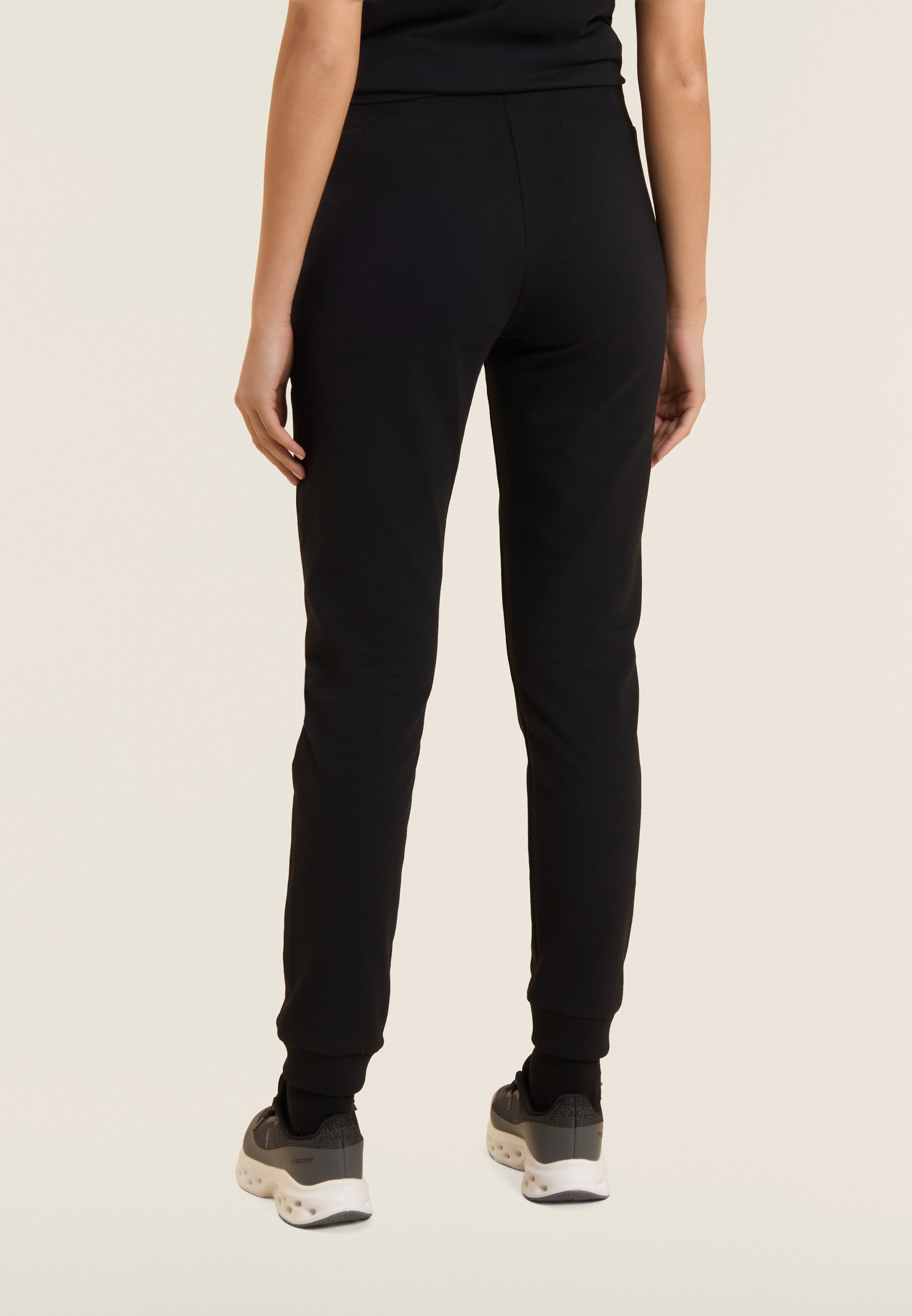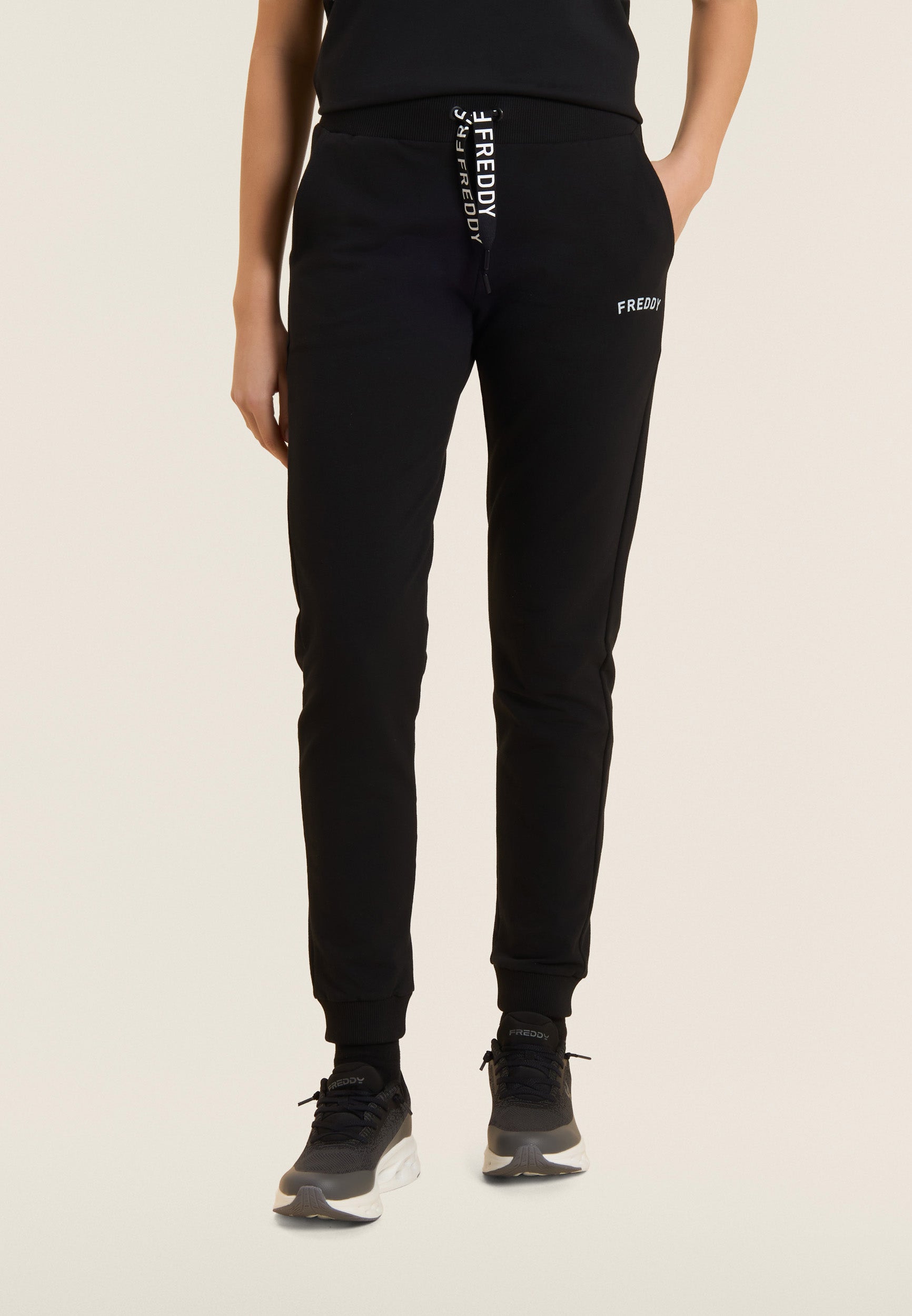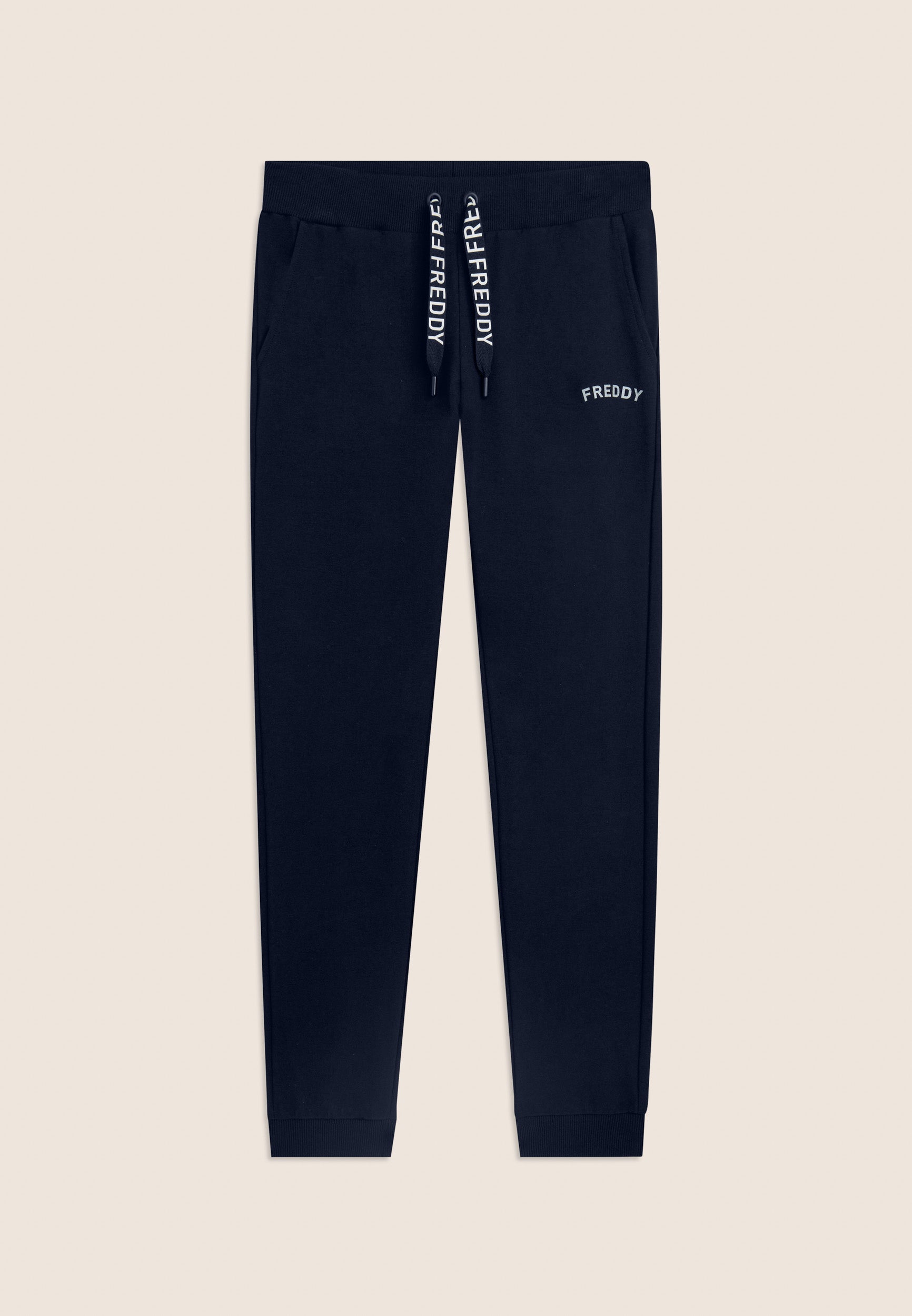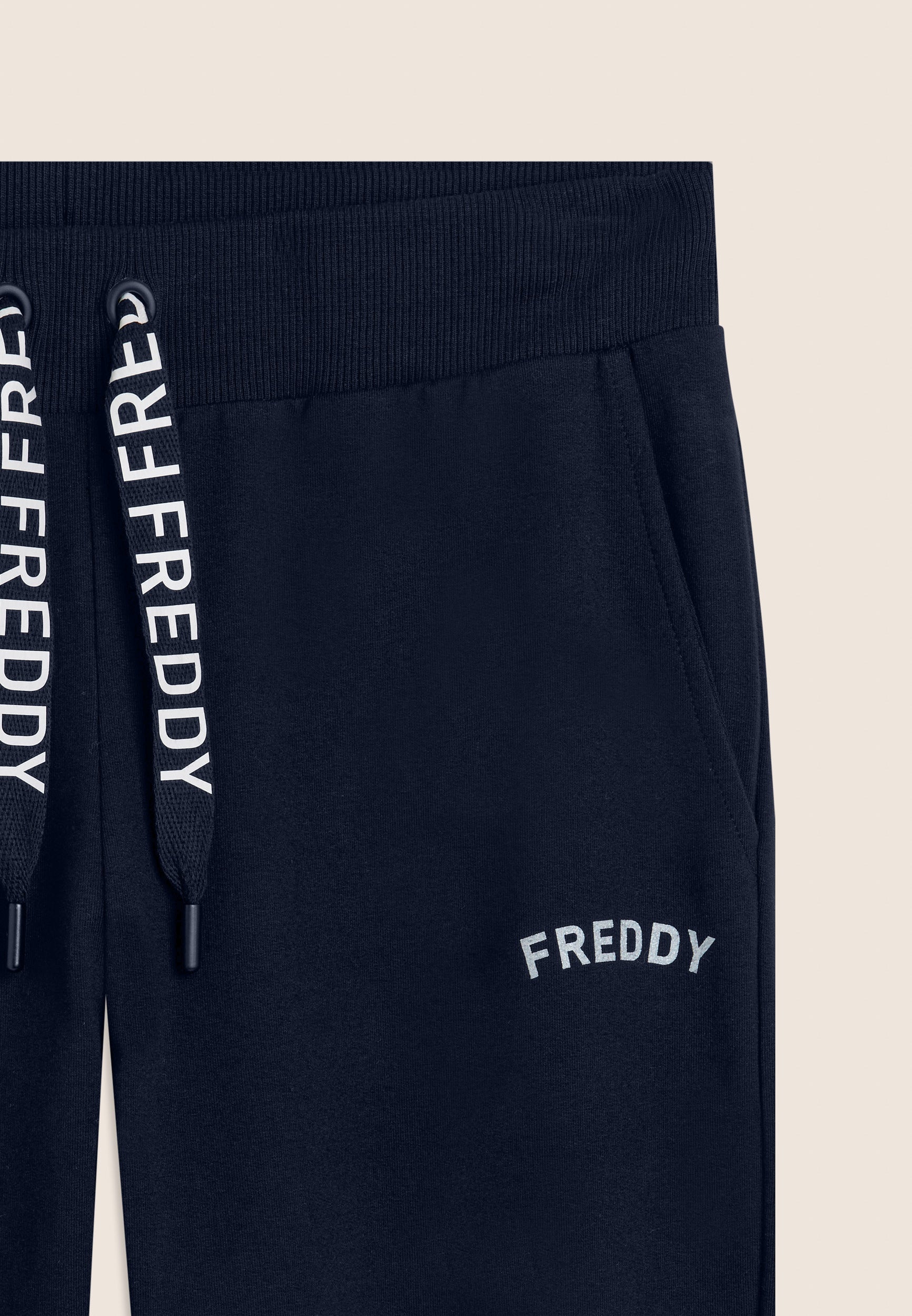 Regular-fit athletic trousers with a hem finished with ribbed cuffs for a sporty and restraining touch. The waistband is ribbed with a FREDDY logo drawstring for an adjustable fit. The small FREDDY logo in white glitter on the left side adds a discreet touch of light. Front besom pockets complete the garment, which is made of stretch French terry, perfect for everyday comfort in mid-season.
