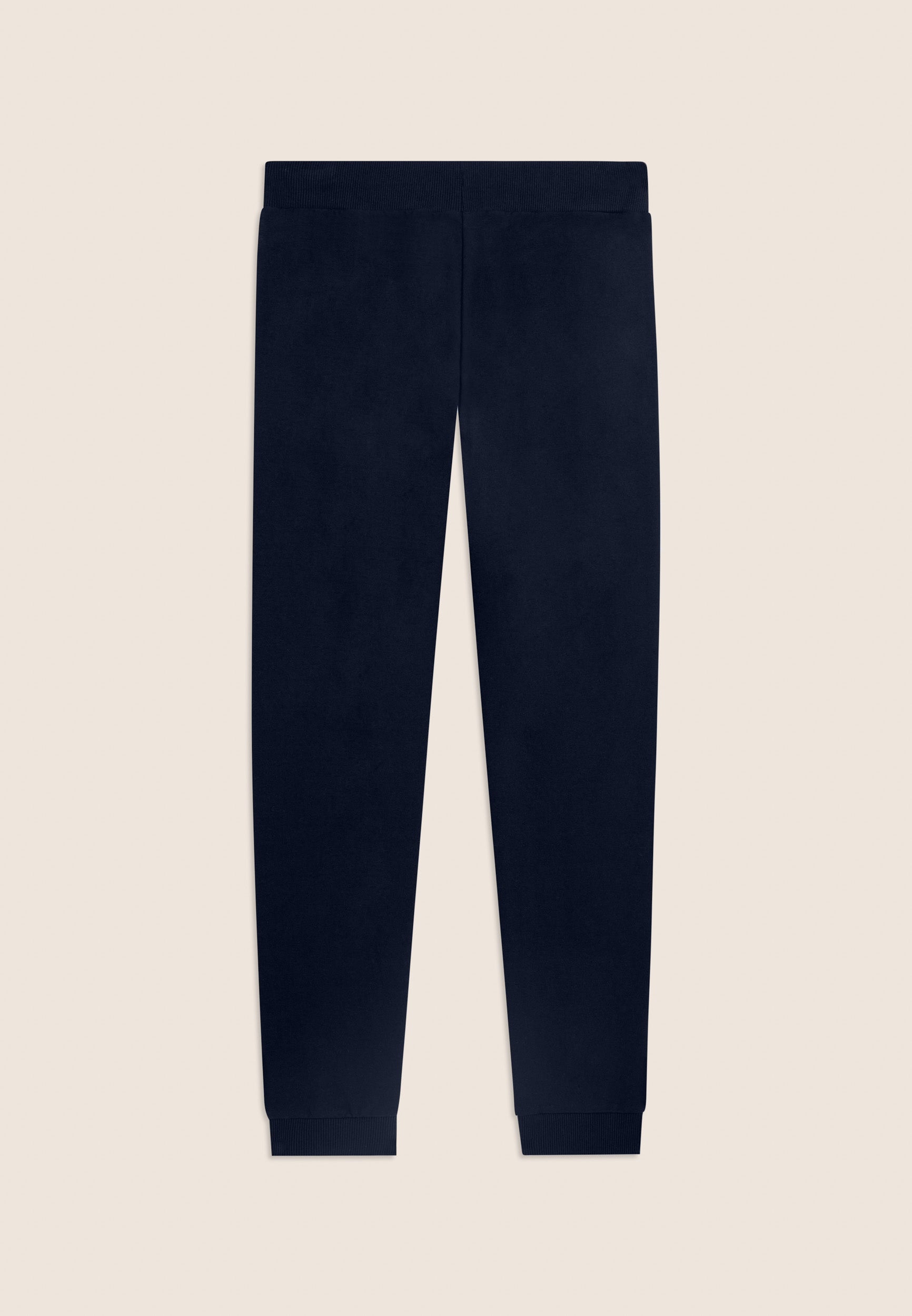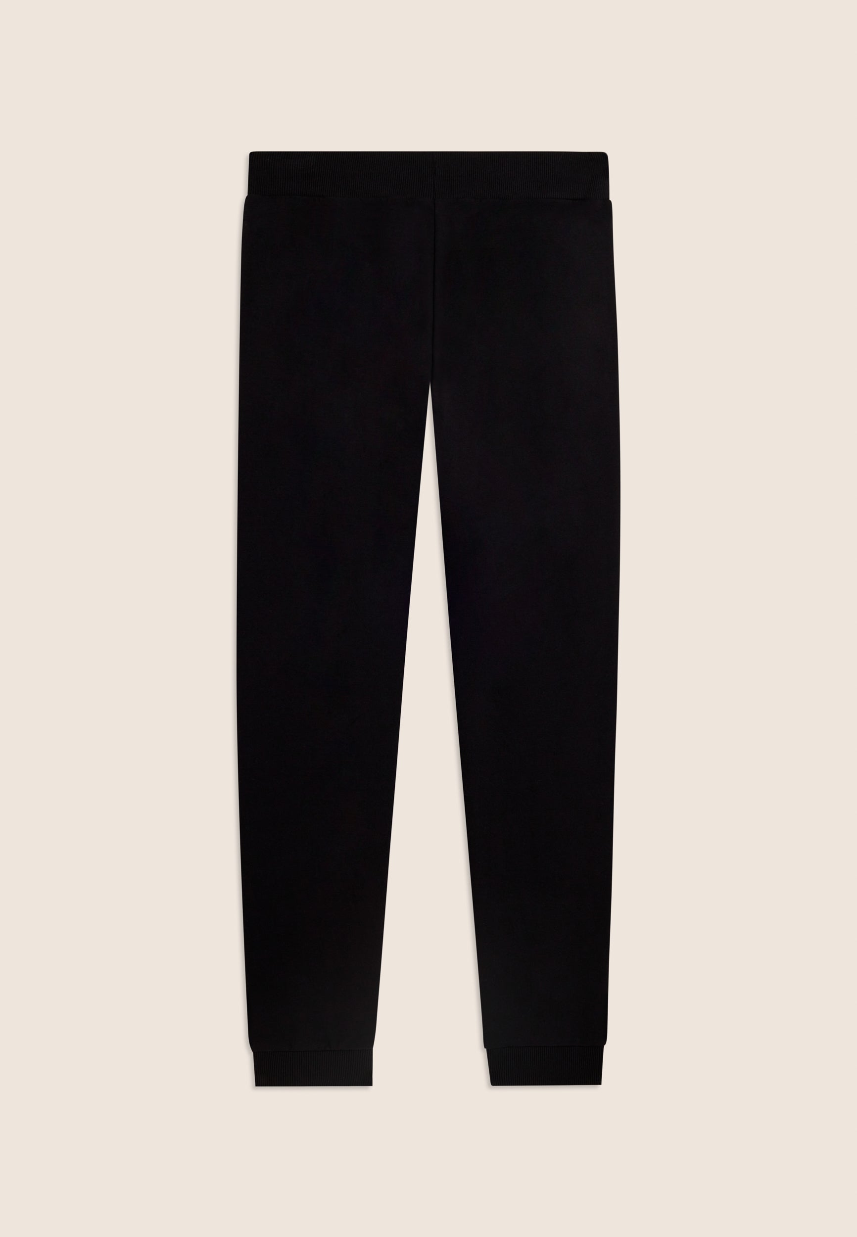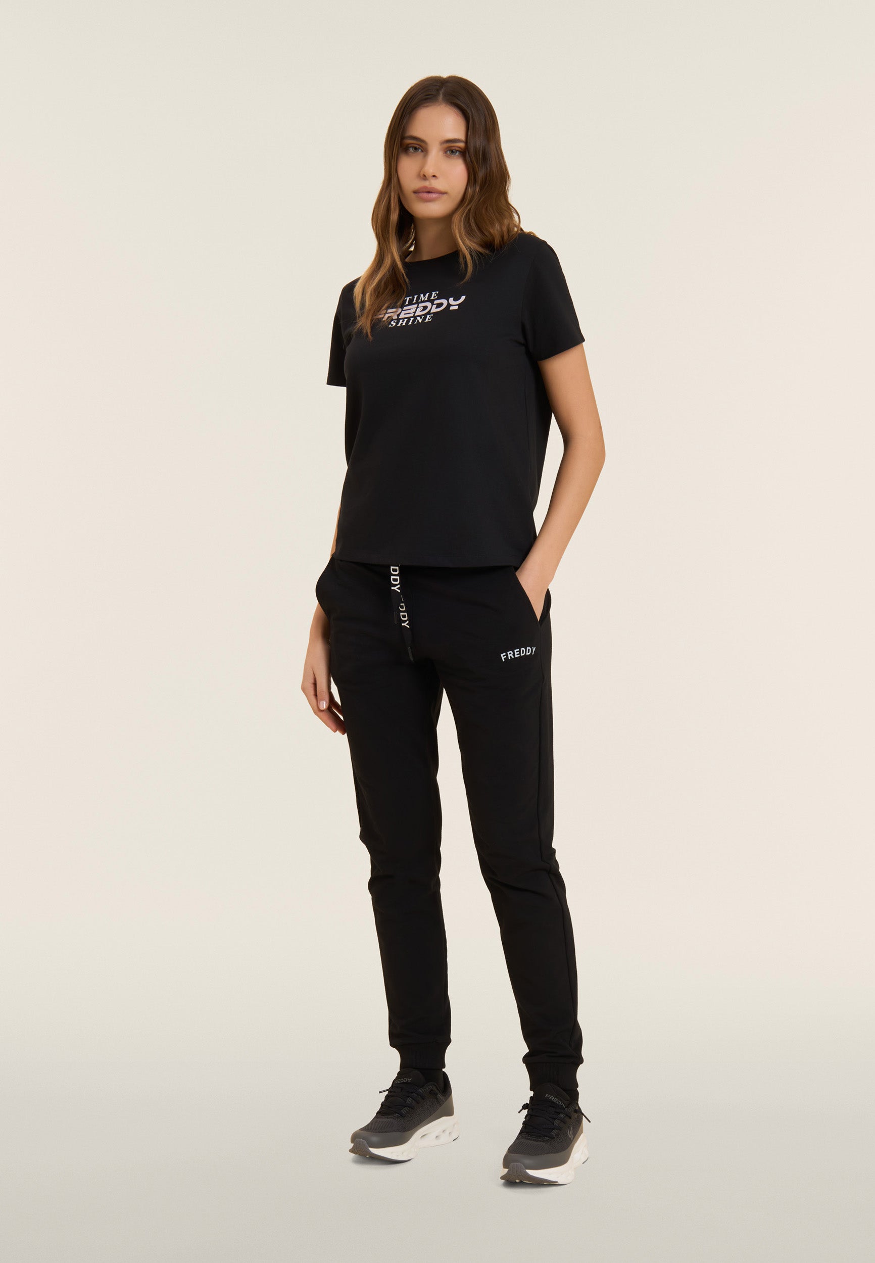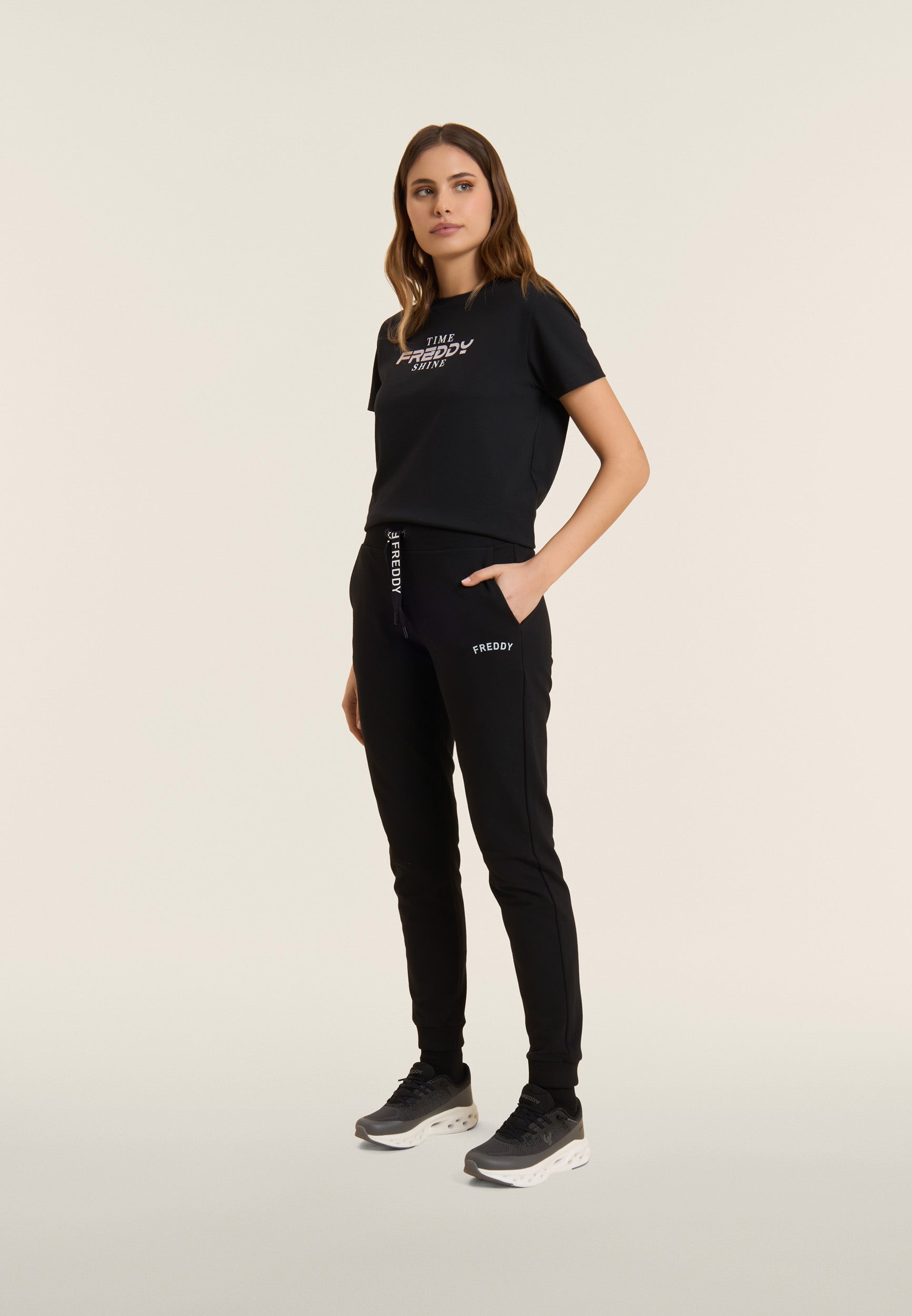 Regular-fit athletic trousers with a hem finished with ribbed cuffs for a sporty and restraining touch. The waistband is ribbed with a FREDDY logo drawstring for an adjustable fit. The small FREDDY logo in white glitter on the left side adds a discreet touch of light. Front besom pockets complete the garment, which is made of stretch French terry, perfect for everyday comfort in mid-season.