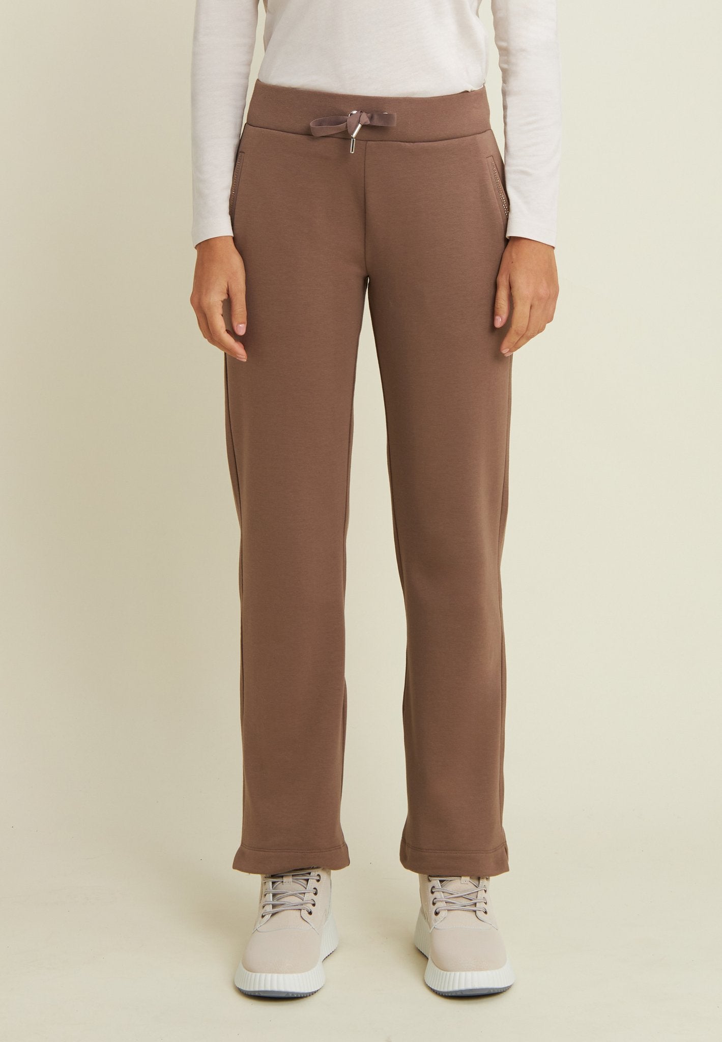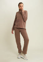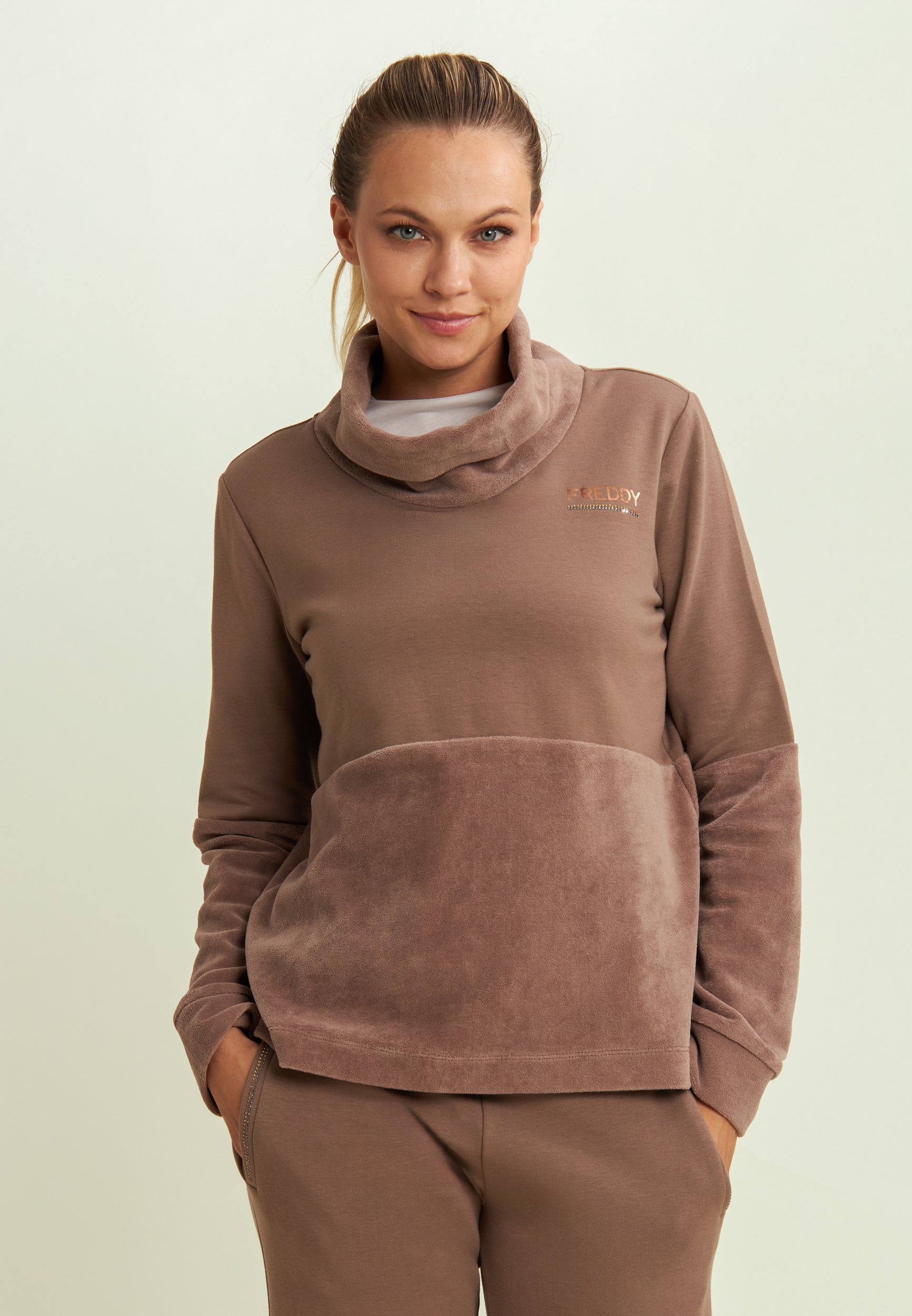 Pensato per chi cerca comfort e stile, questo bundle include una felpa da donna con fondo e collo alto in velluto, che presenta la parte alta di busto e maniche in felpa modal garzata elasticizzata e la parte bassa in velluto, incluso il collo alto. Le maniche sono rifinite con polsini e il logo FREDDY sul cuore è arricchito da strass. Inoltre, i pantaloni sportivi da donna con gamba dritta e dettagli luminosi combinano funzionalità e stile, grazie al tessuto in felpa modal garzata elasticizzata, caldo e delicato sulla pelle. La gamba dritta con piccoli spacchi sull’orlo dona movimento al look, mentre la vita in costina con coulisse, tasche alla francese e strass bicolori aggiungono un tocco di eleganza.