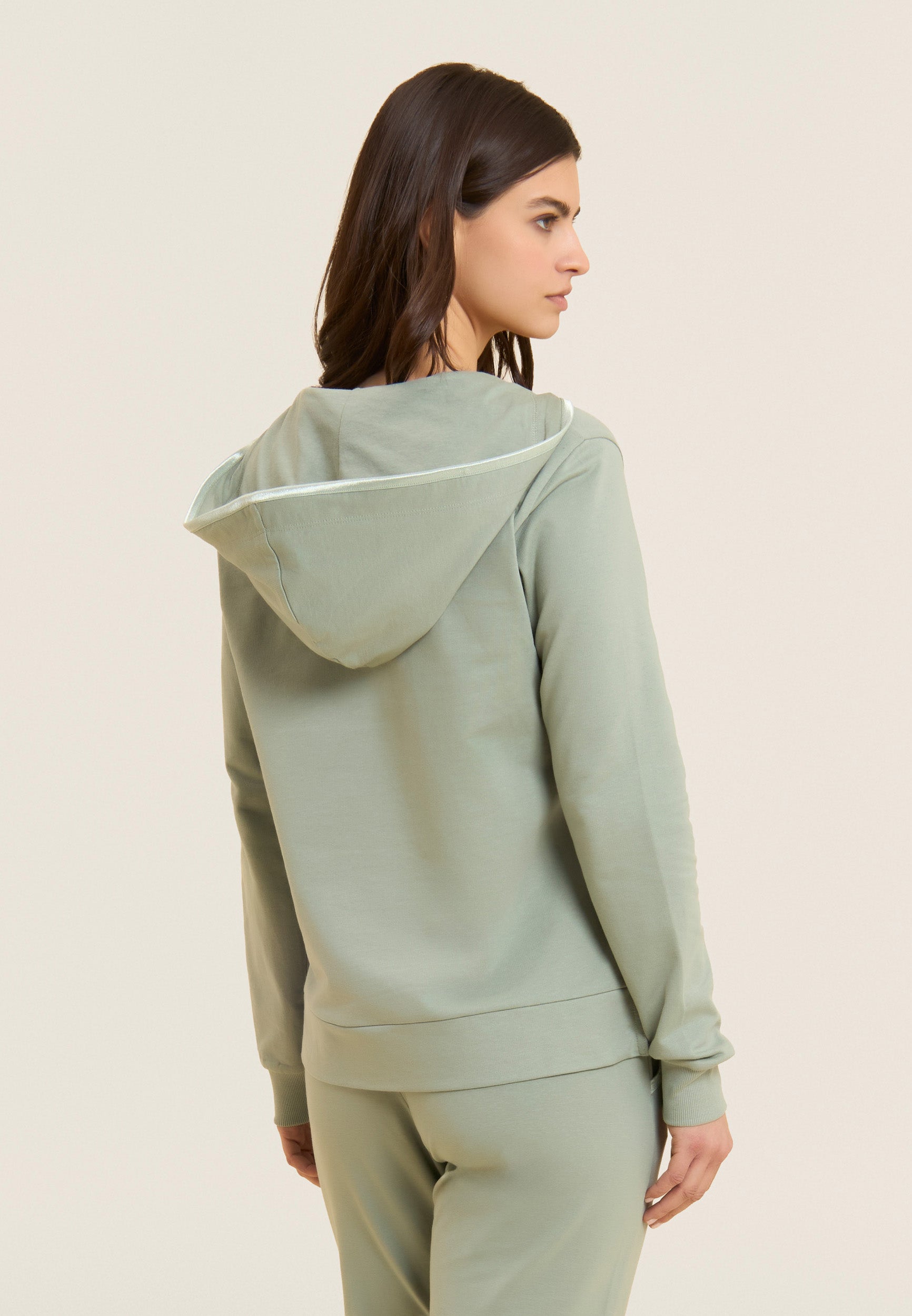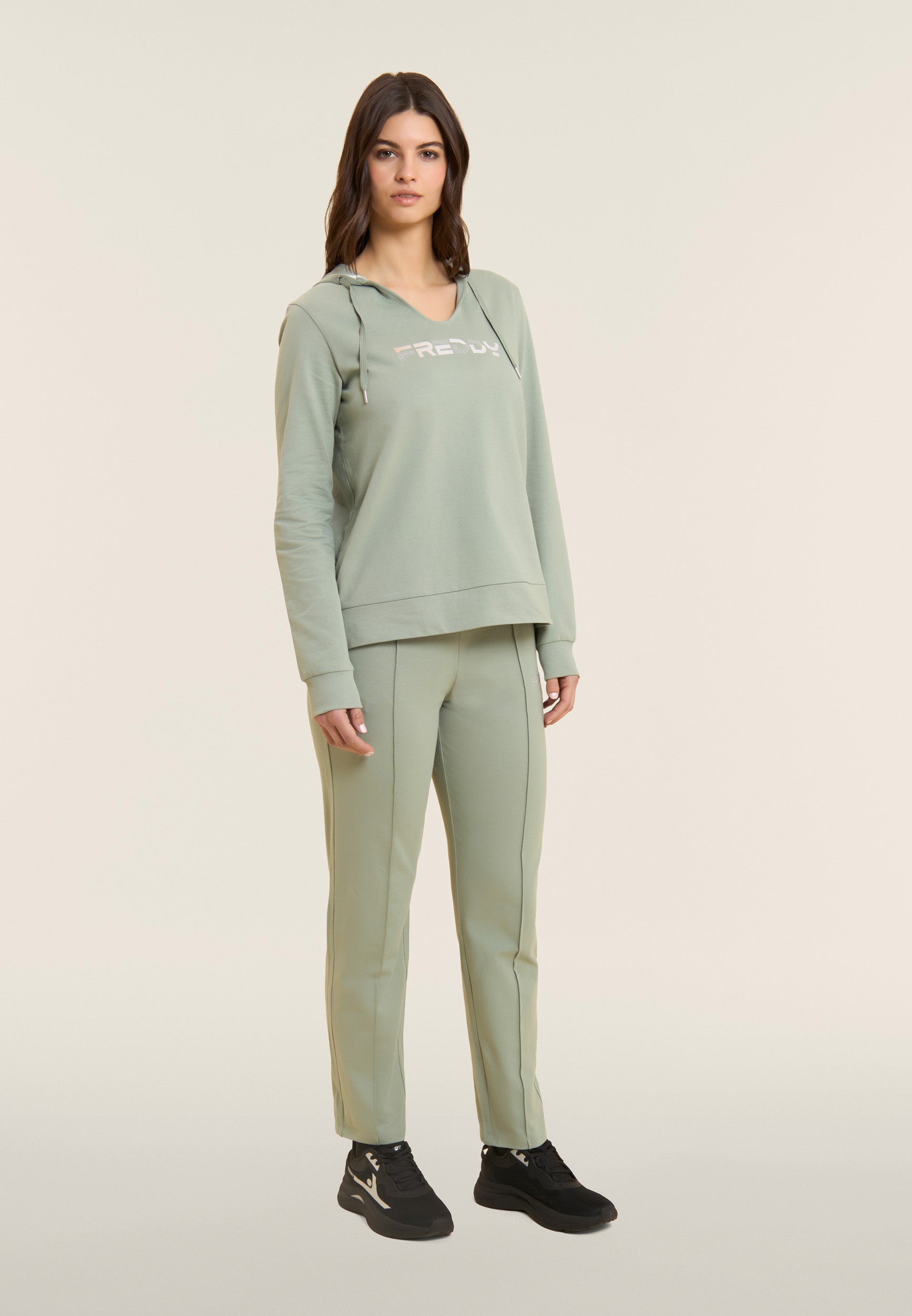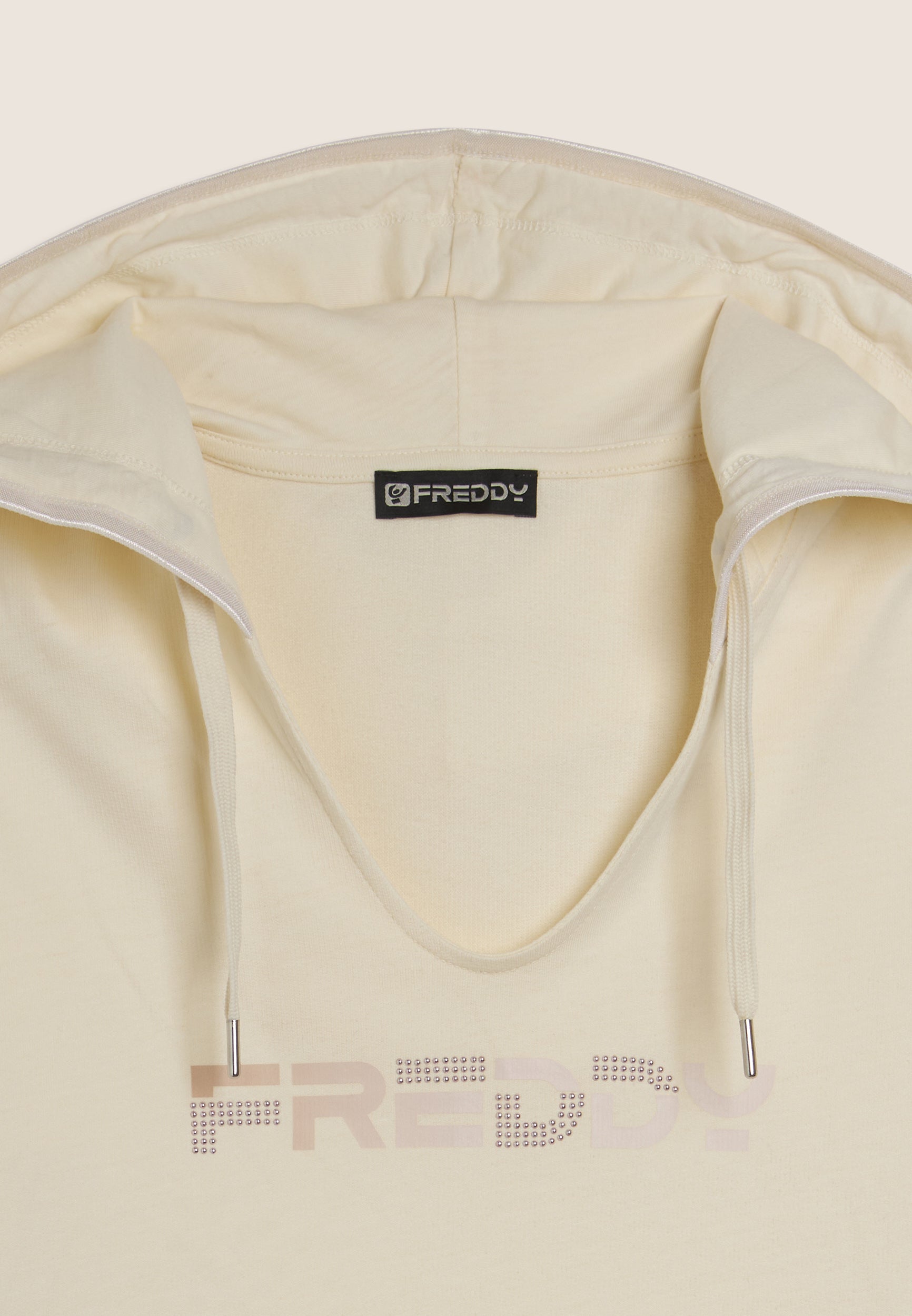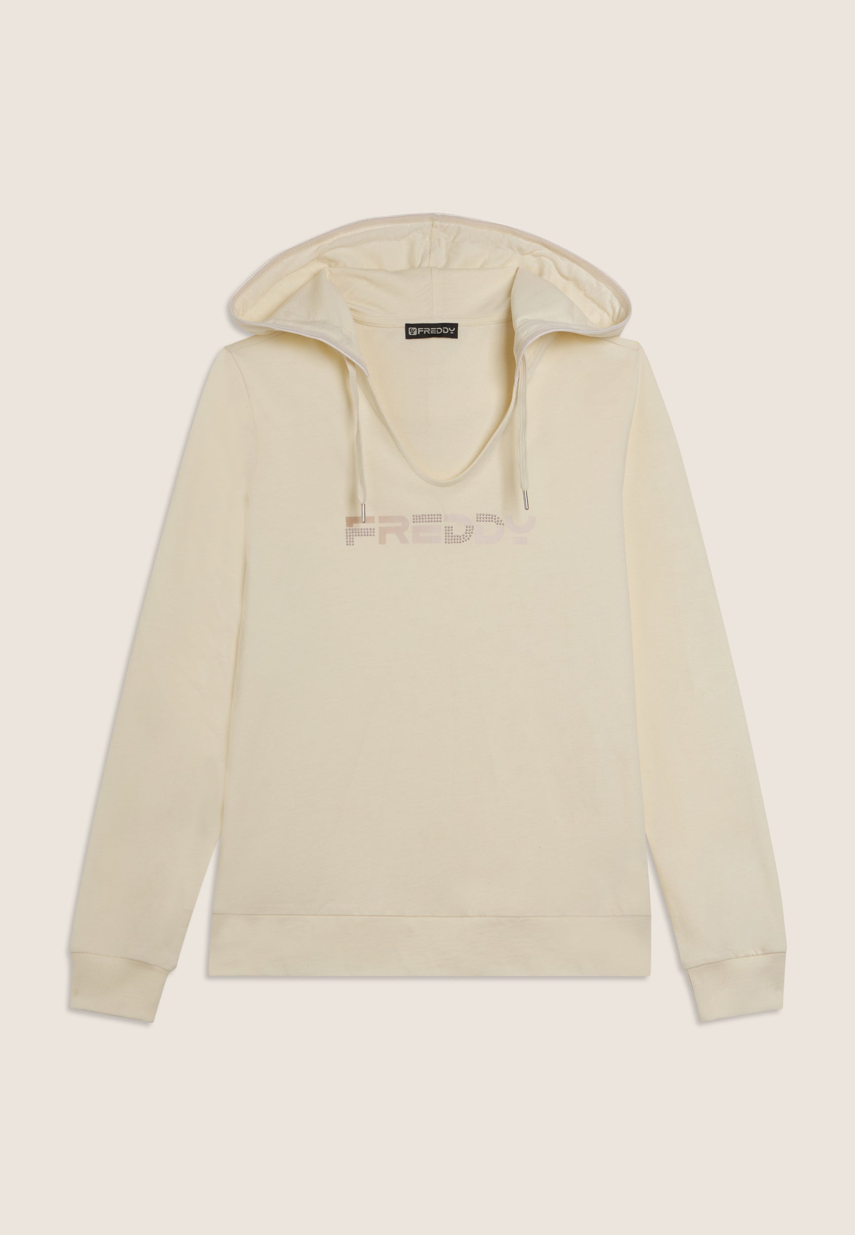 Lined hoodie with V-neck, modern and versatile design. The straight bottom with band in the same fabric and the side slits offer optimal comfort, and the drawstring hood adds practicality. The pink FREDDY logo in holographic effect and light pink beads on the front make it elegant and unique. Made of heavy cotton stretch jersey, it is perfect for leisure and low-intensity activities.