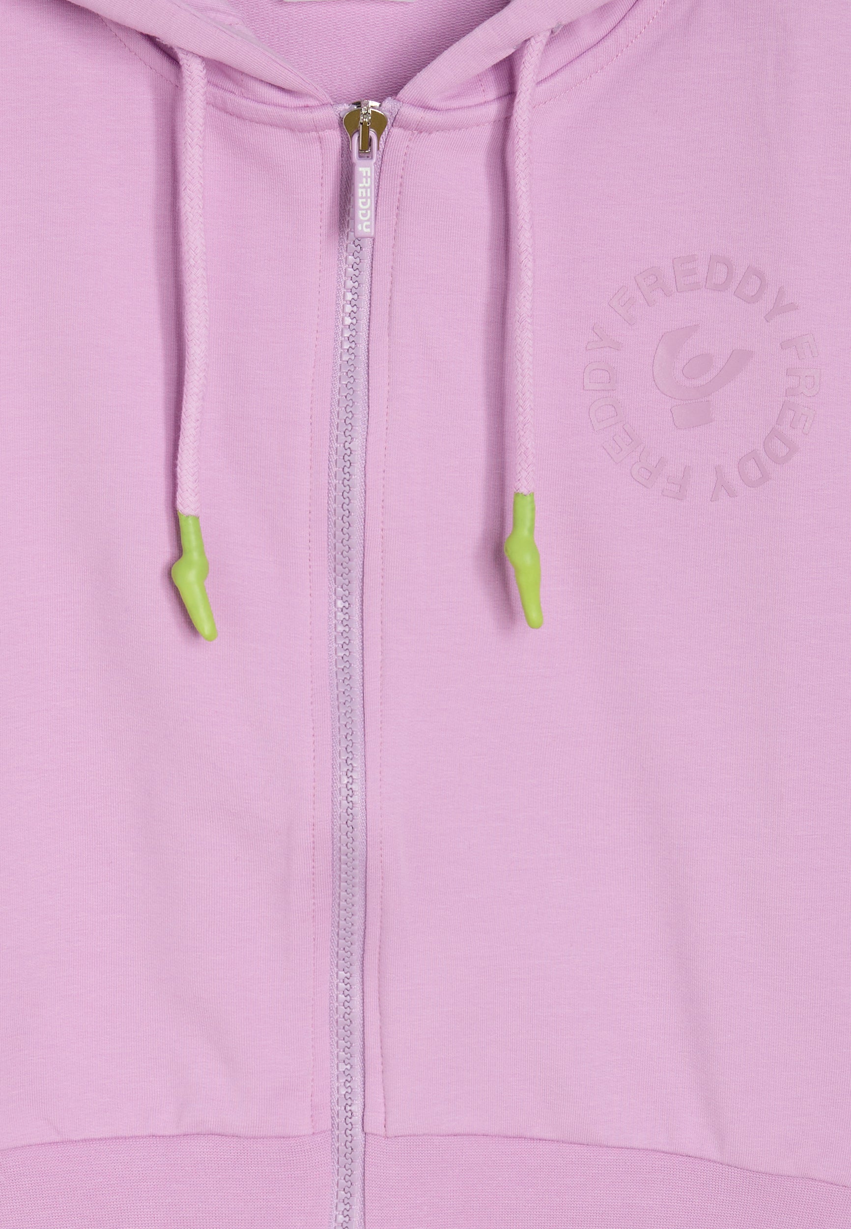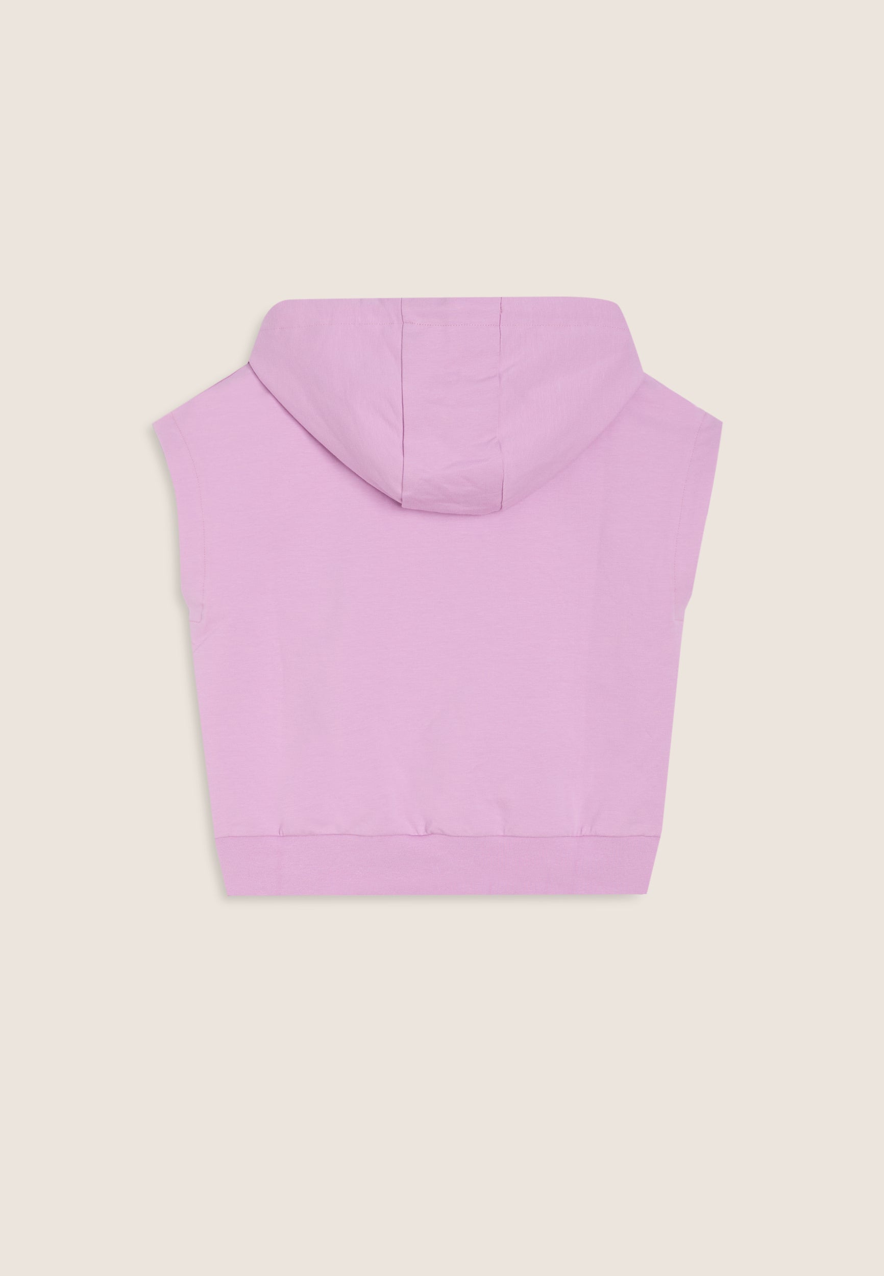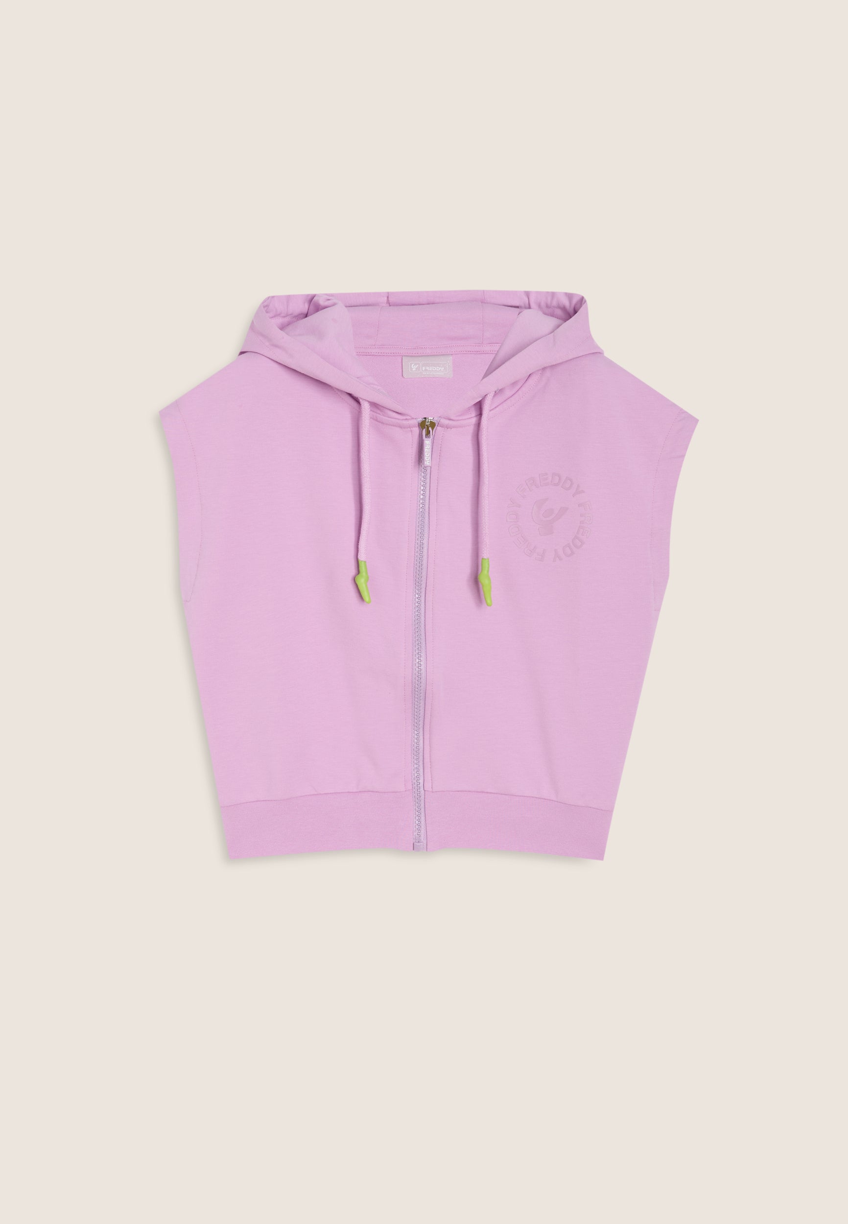 Perfetto per look a strati dal gusto sportivo, questo gilet da bambina in cotone elasticizzato con lunghezza cropped unisce comfort e stile contemporaneo. Il cappuccio foderato è dotato di coulisse con finalini in contrasto colore, un dettaglio ricercato che aggiunge un tocco distintivo. La chiusura full-zip rende il capo pratico da indossare, mentre la fascia in costina sul fondo assicura una vestibilità stabile. Il logo Freddy stampato in tono colore sul cuore completa il design con discrezione ed eleganza.