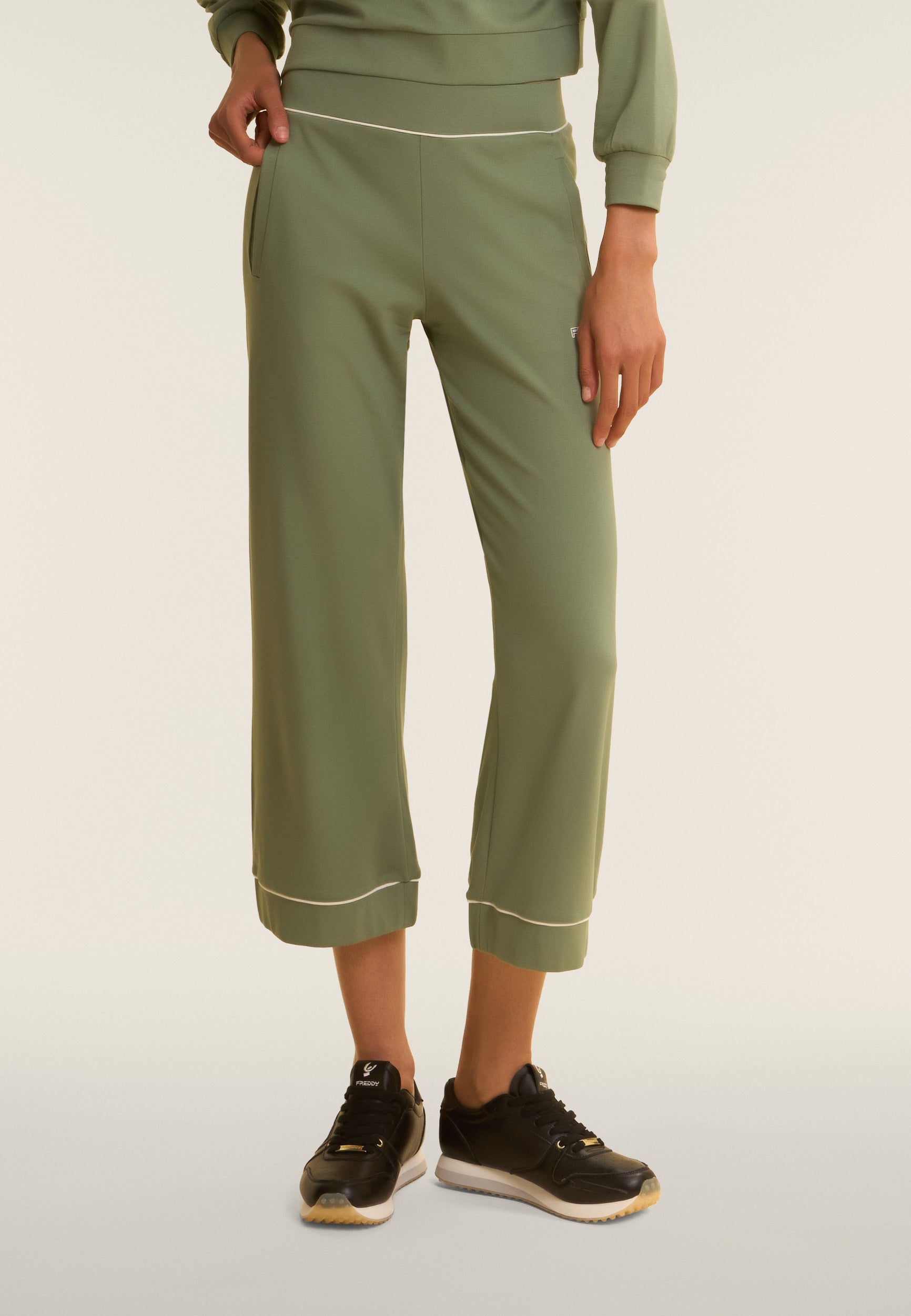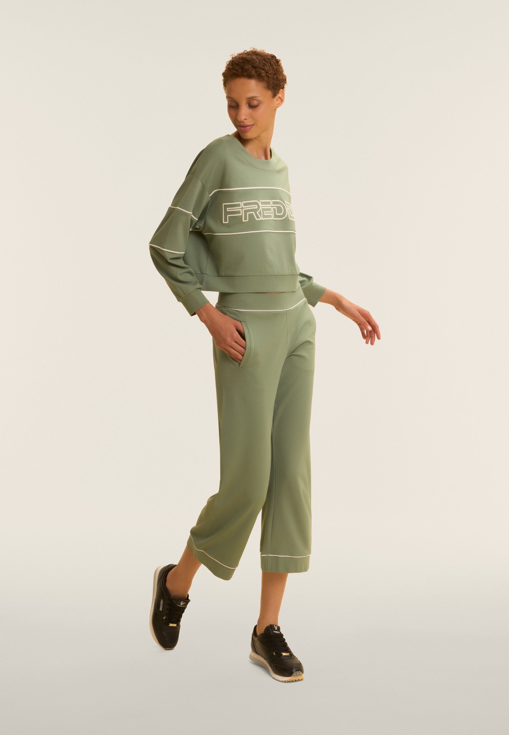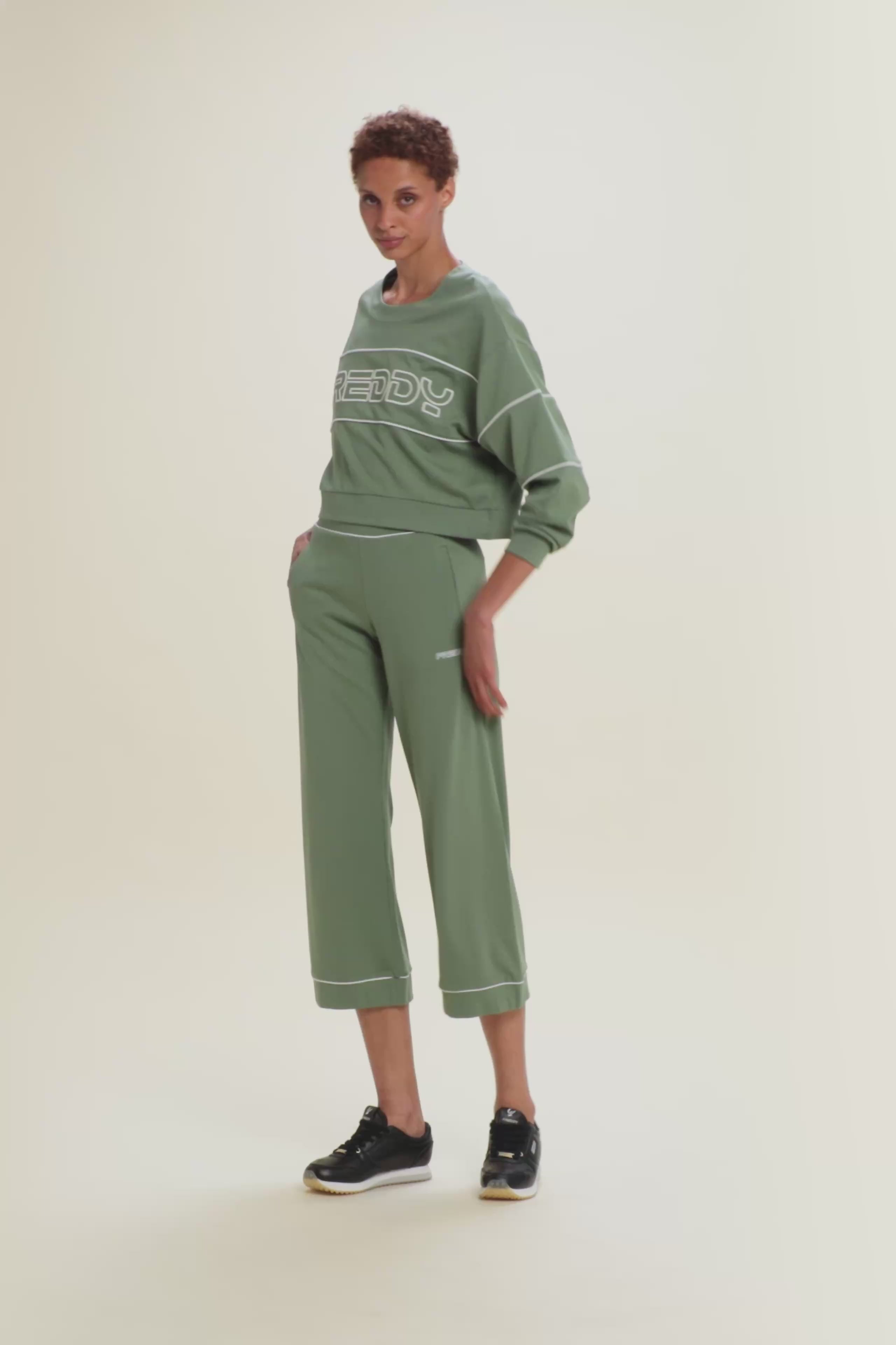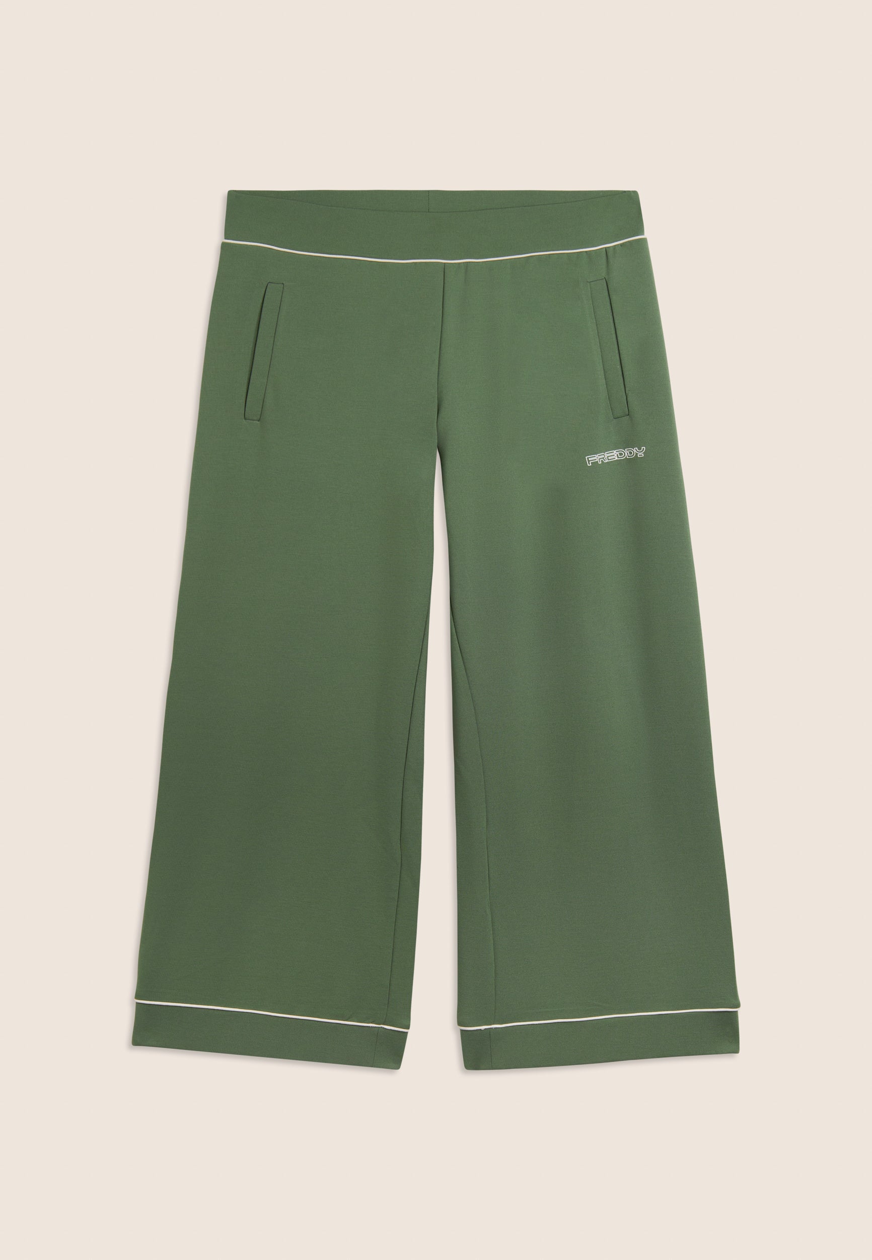Athletic trousers with a wide leg fit and cropped length, with a regular waist and bottom decorated with piping in a contrasting colour, for a sporty and striking look. The FREDDY logo printed on the left side adds a distinctive detail. Made of interlock stretch, a soft and durable fabric that combines comfort and style, these trousers are perfect for a casual and refined look.