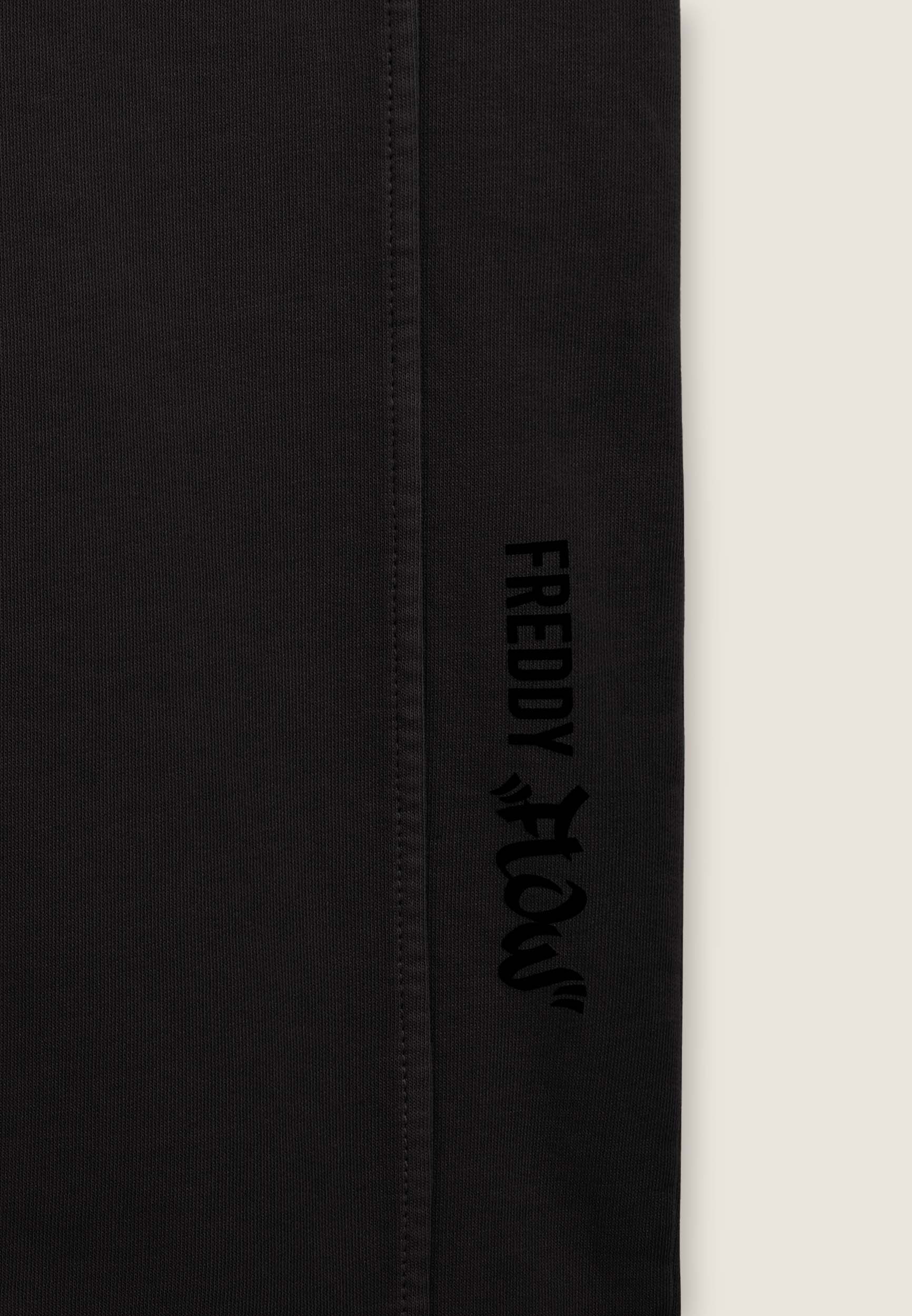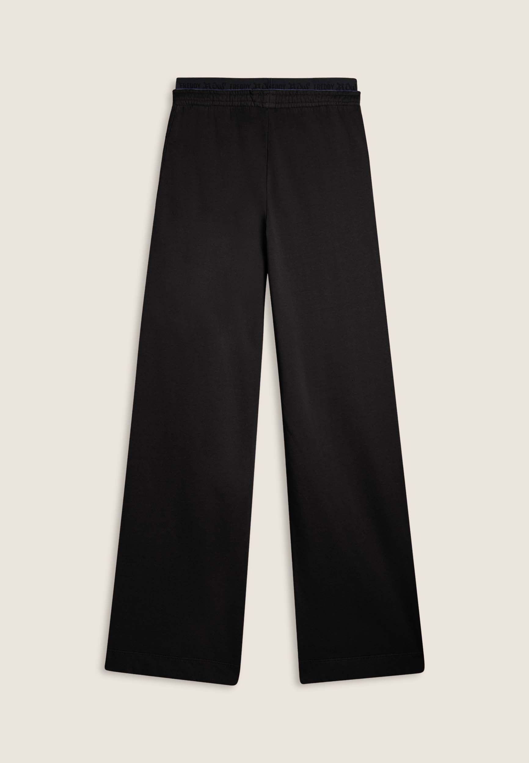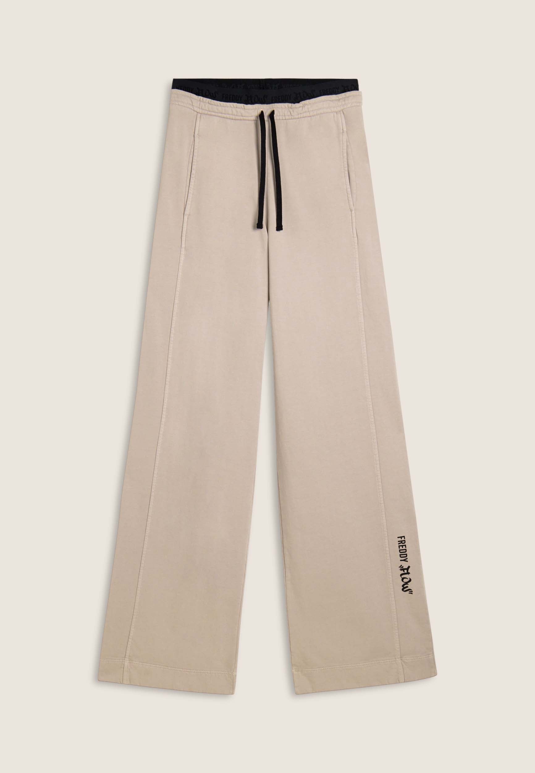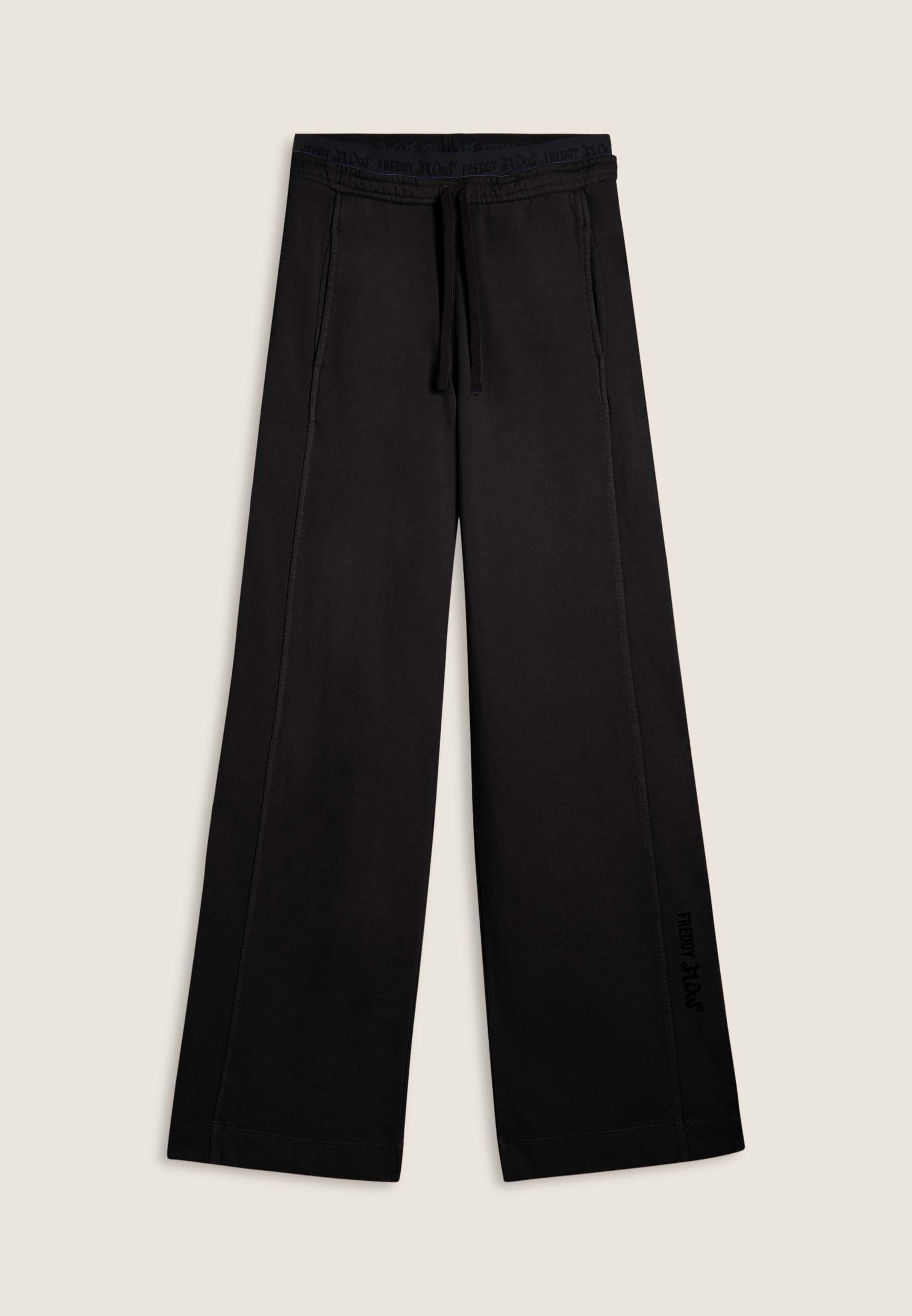 Wide leg and street details for these brushed fleece trousers. The “Flow” print with FREDDY logo on the side of the leg gives an artistic and original touch, while the logoed jacquard elastic waistband and drawstring ensure a comfortable fit. Intense colours and softness are guaranteed by the enzyme treatment: the must-have for a comfortable and trendy look.