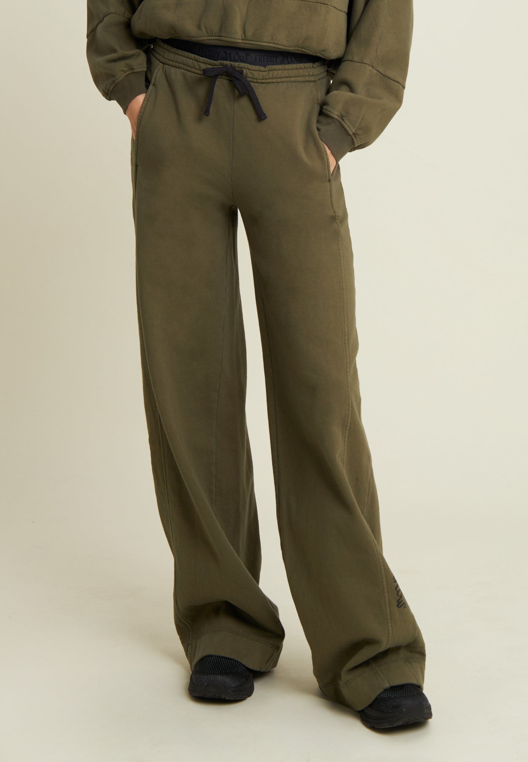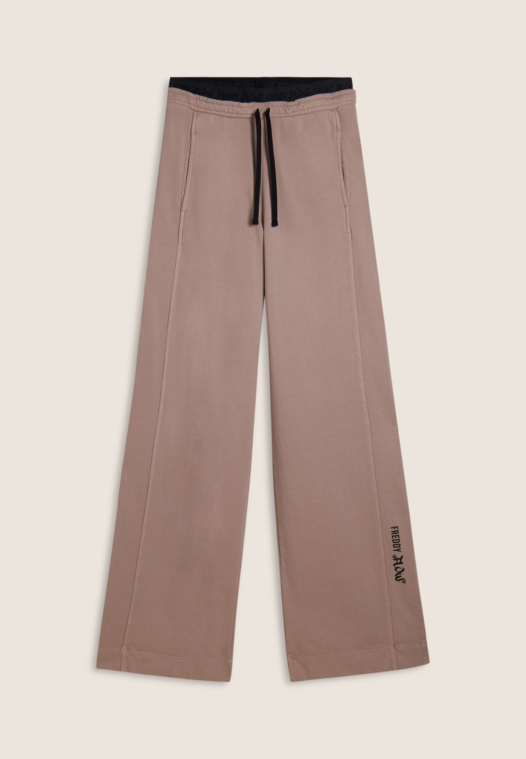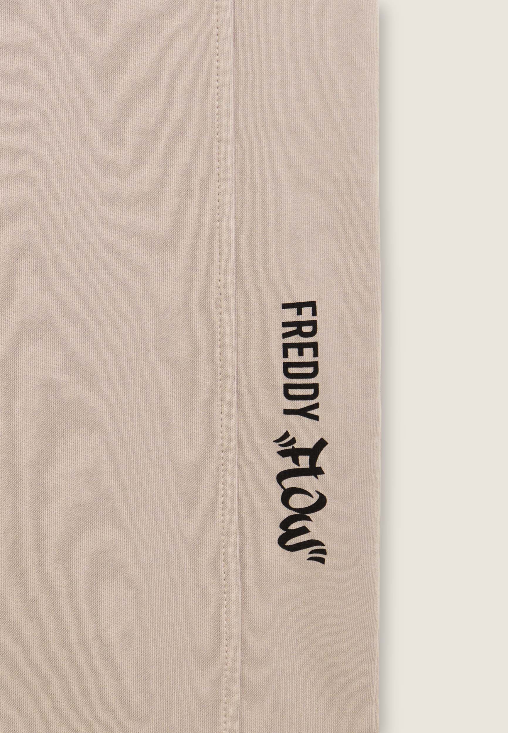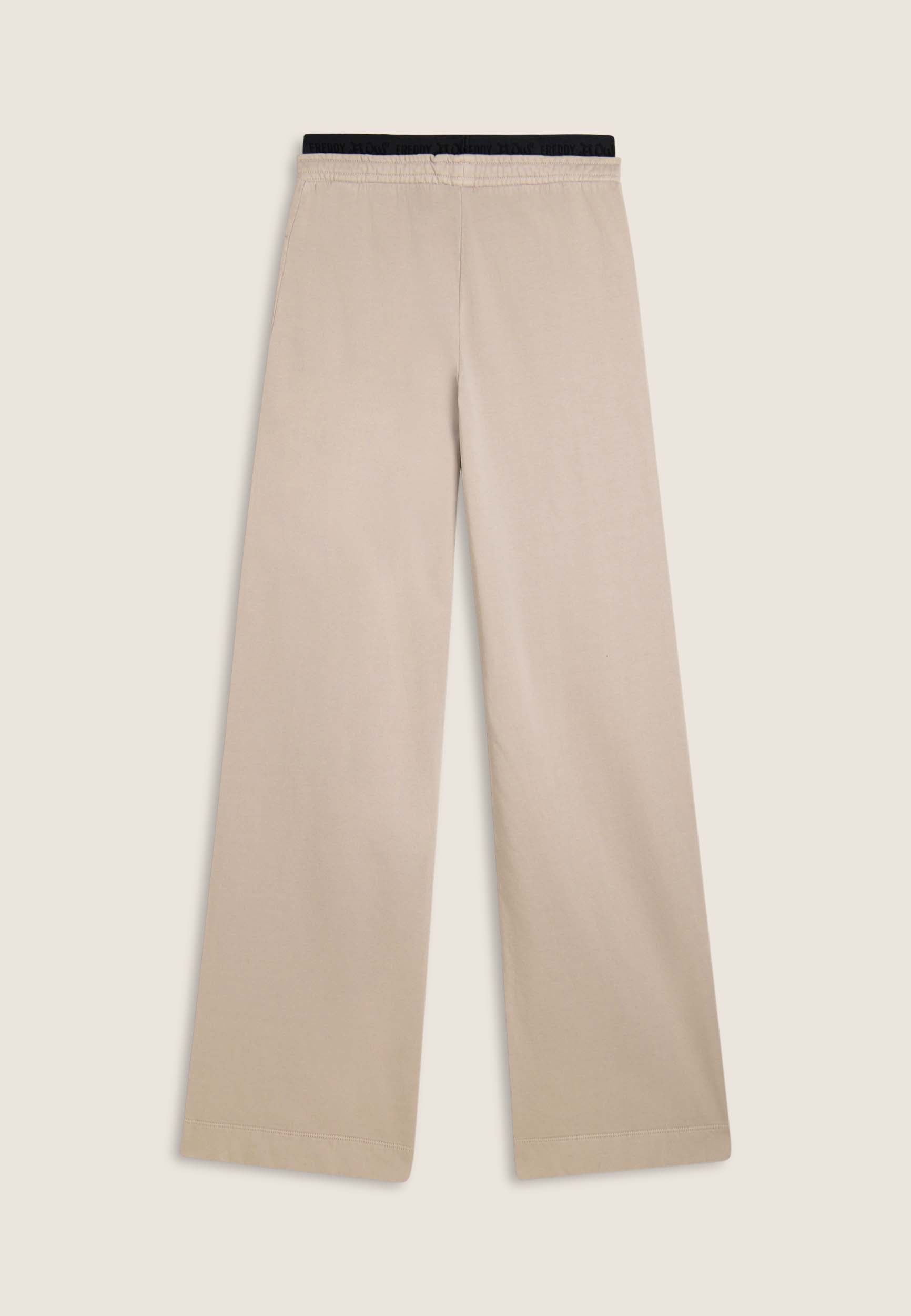 Wide leg and street details for these brushed fleece trousers. The “Flow” print with FREDDY logo on the side of the leg gives an artistic and original touch, while the logoed jacquard elastic waistband and drawstring ensure a comfortable fit. Intense colours and softness are guaranteed by the enzyme treatment: the must-have for a comfortable and trendy look.