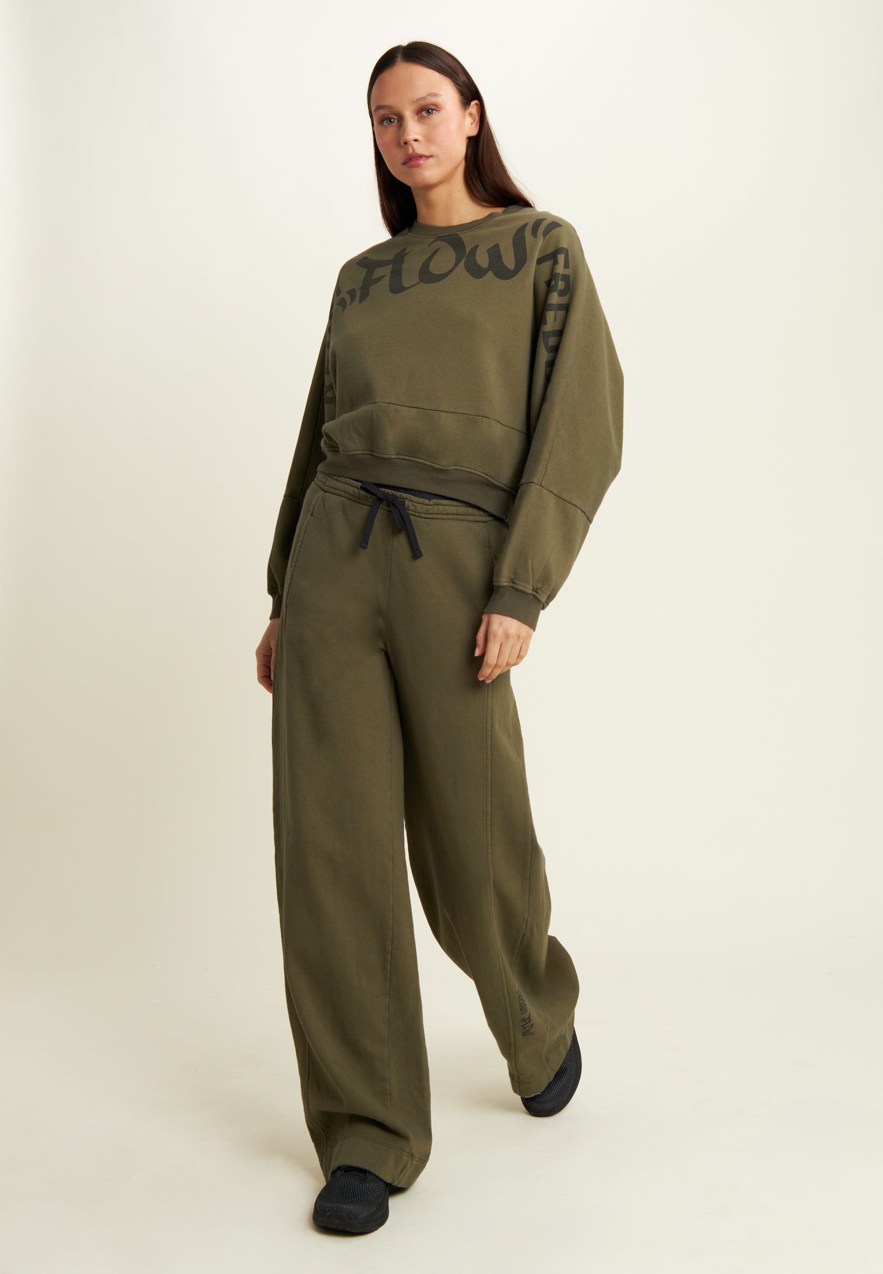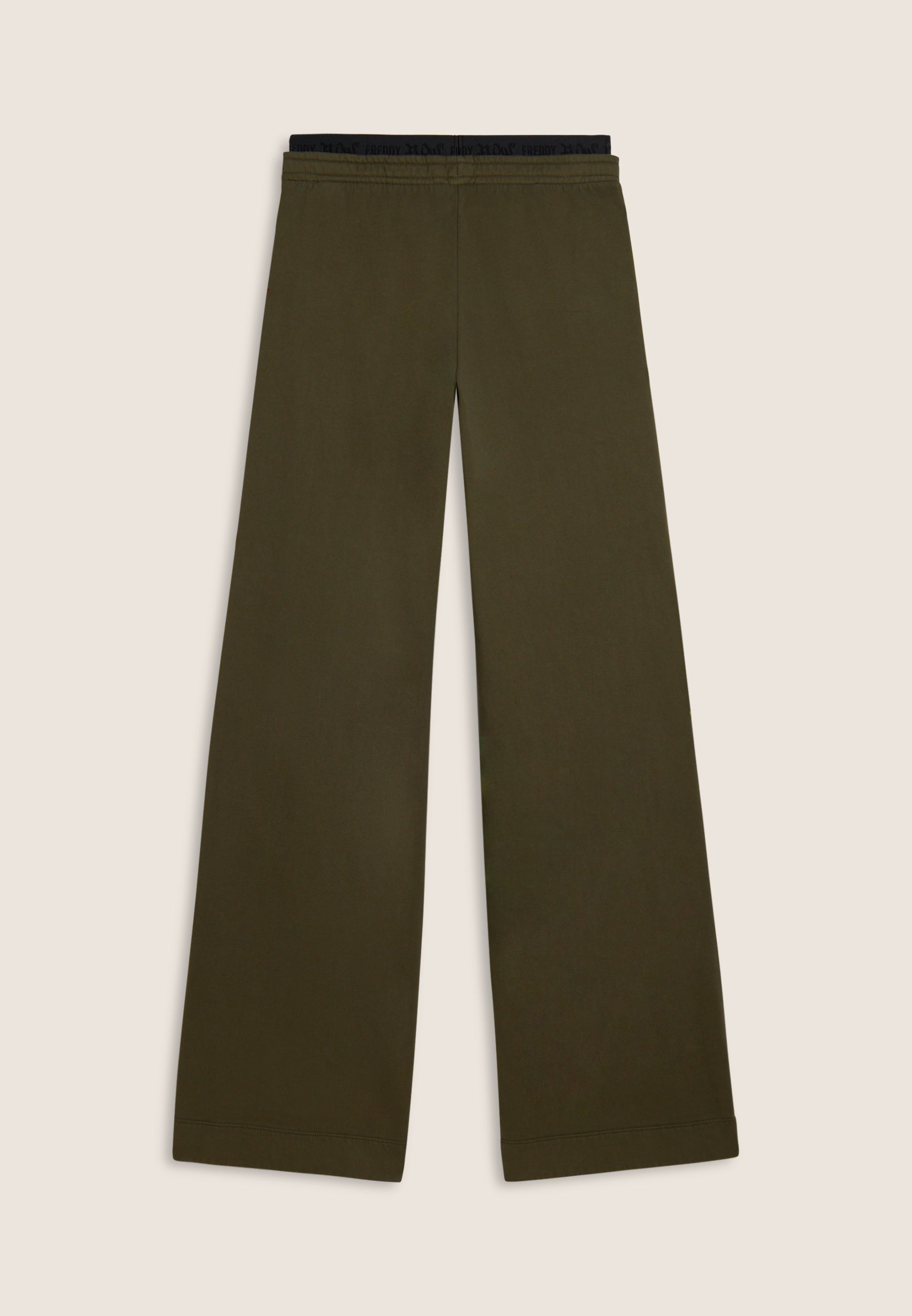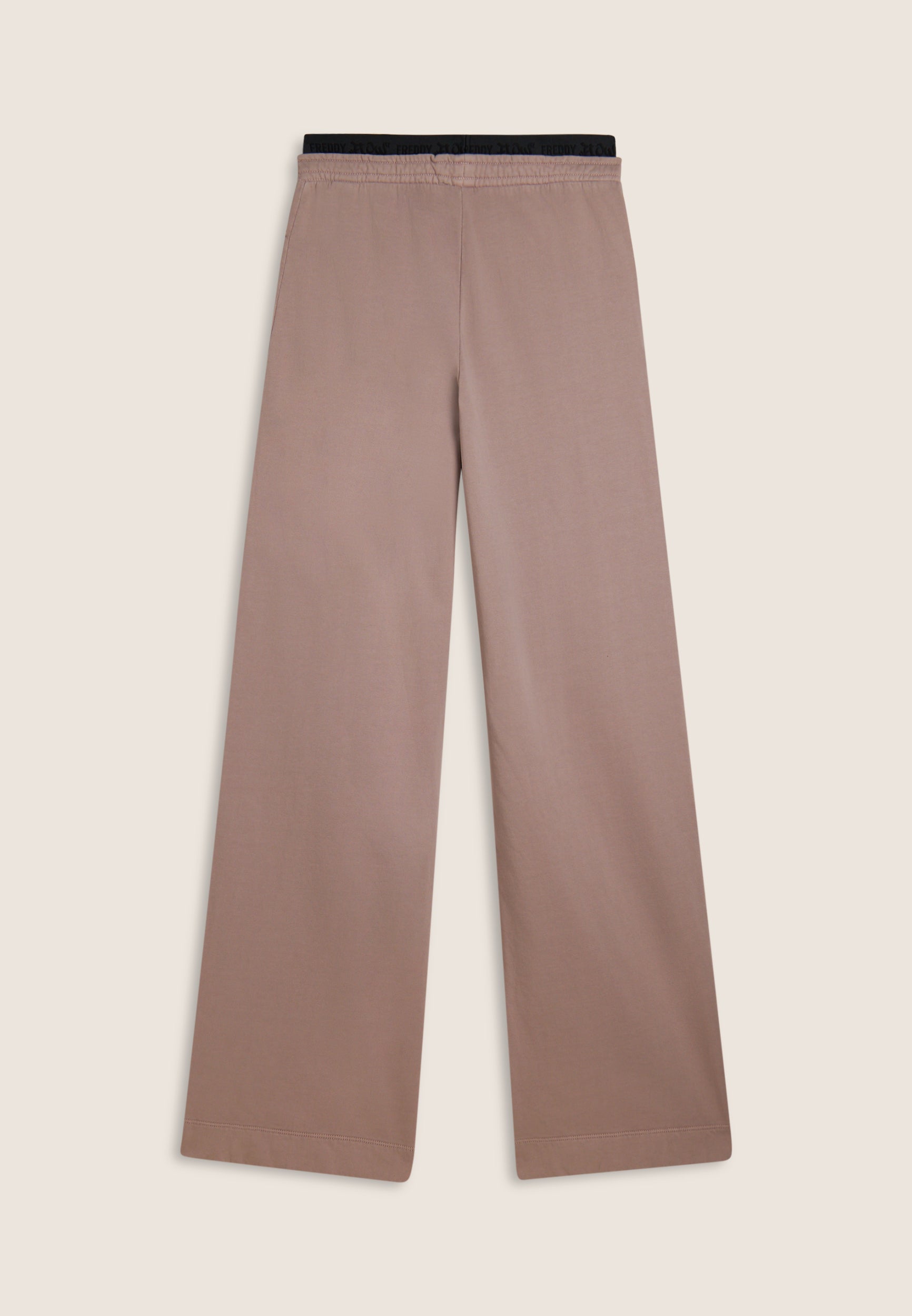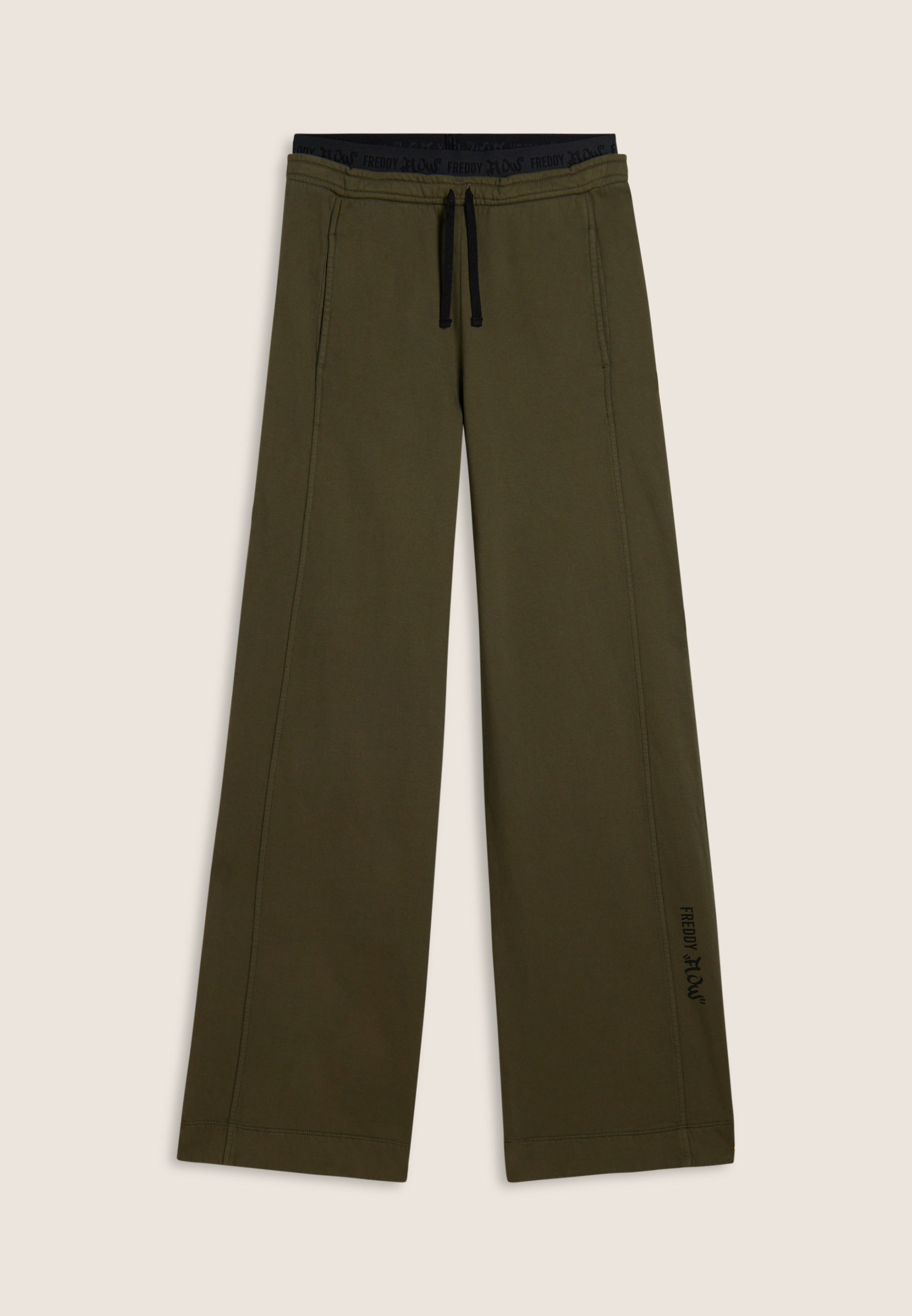 Wide leg and street details for these brushed fleece trousers. The “Flow” print with FREDDY logo on the side of the leg gives an artistic and original touch, while the logoed jacquard elastic waistband and drawstring ensure a comfortable fit. Intense colours and softness are guaranteed by the enzyme treatment: the must-have for a comfortable and trendy look.