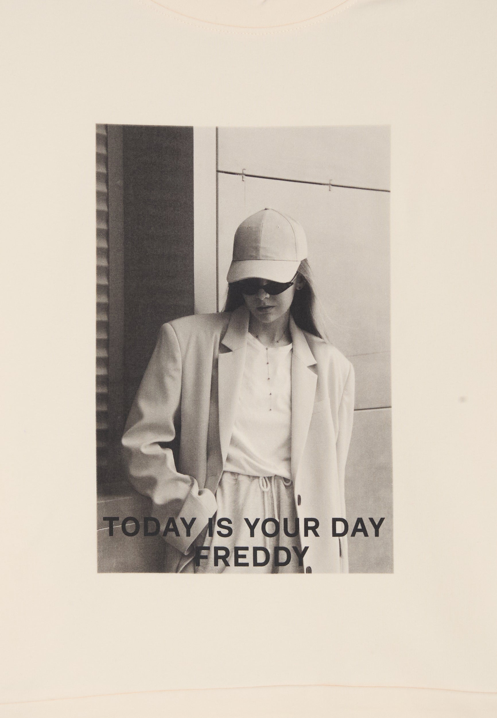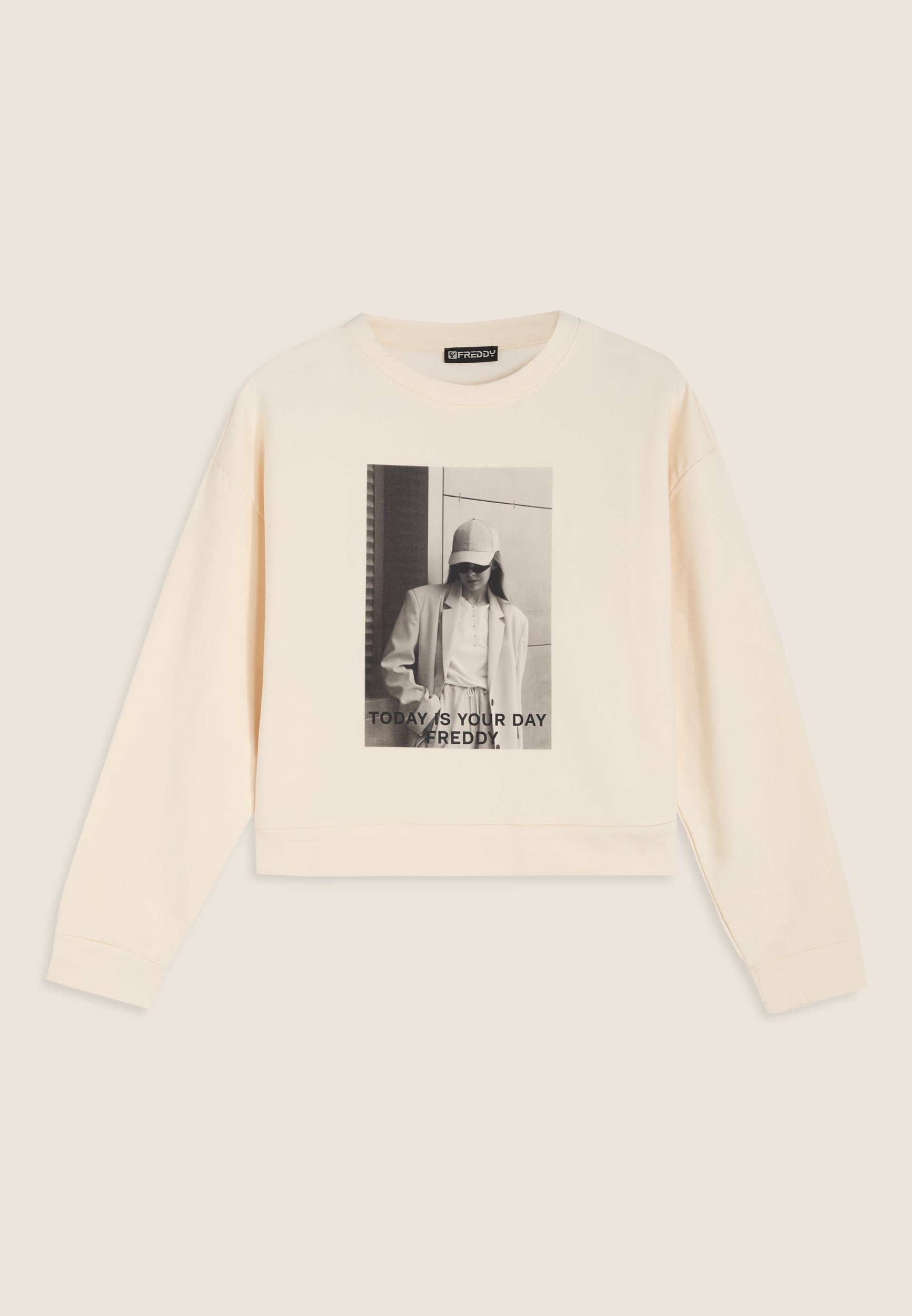 Women's sweatshirt in stretch brushed fleece, comfort fit and cropped length. The dropped sleeves and the front printed with a photographic image create an urban and contemporary style.