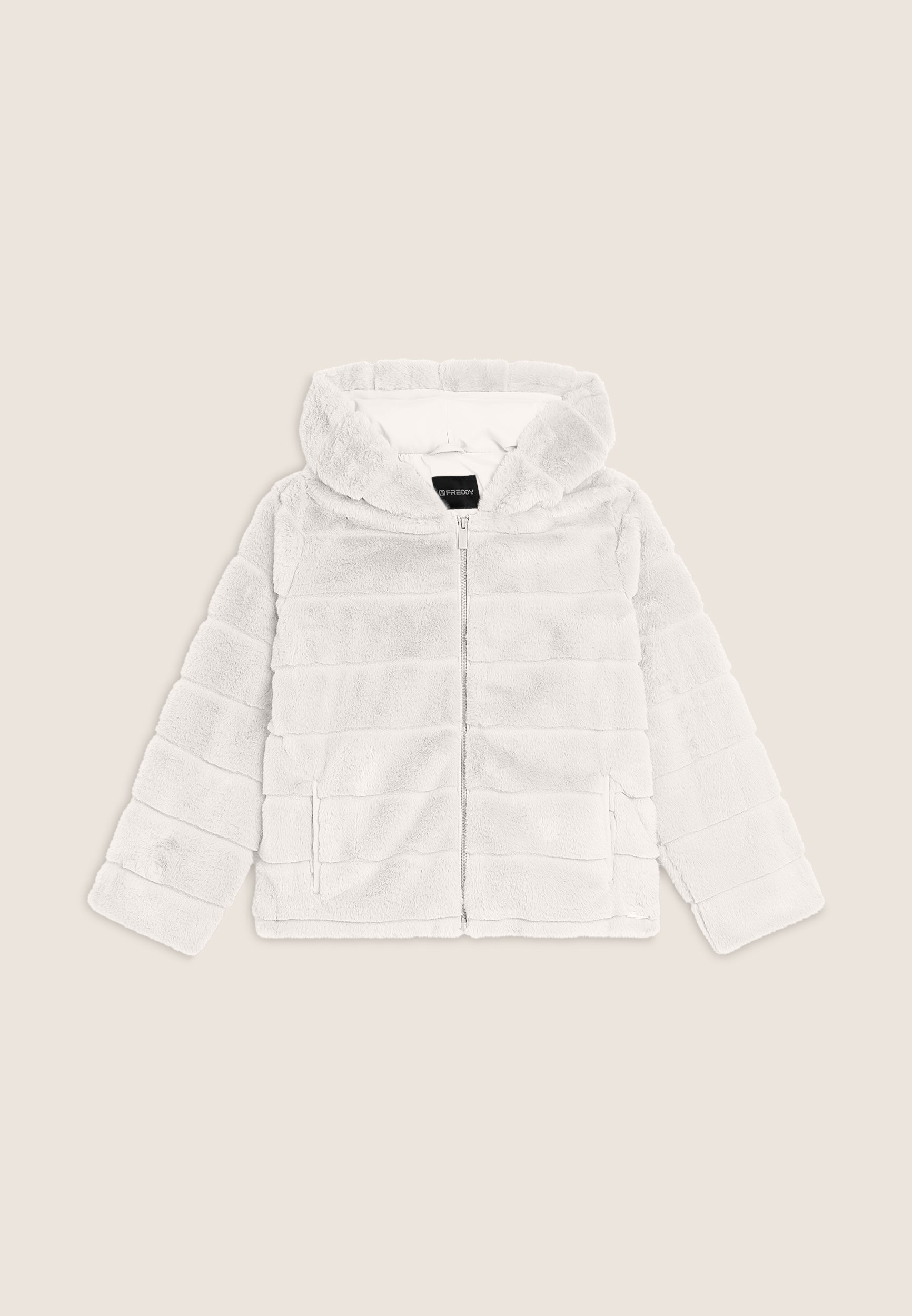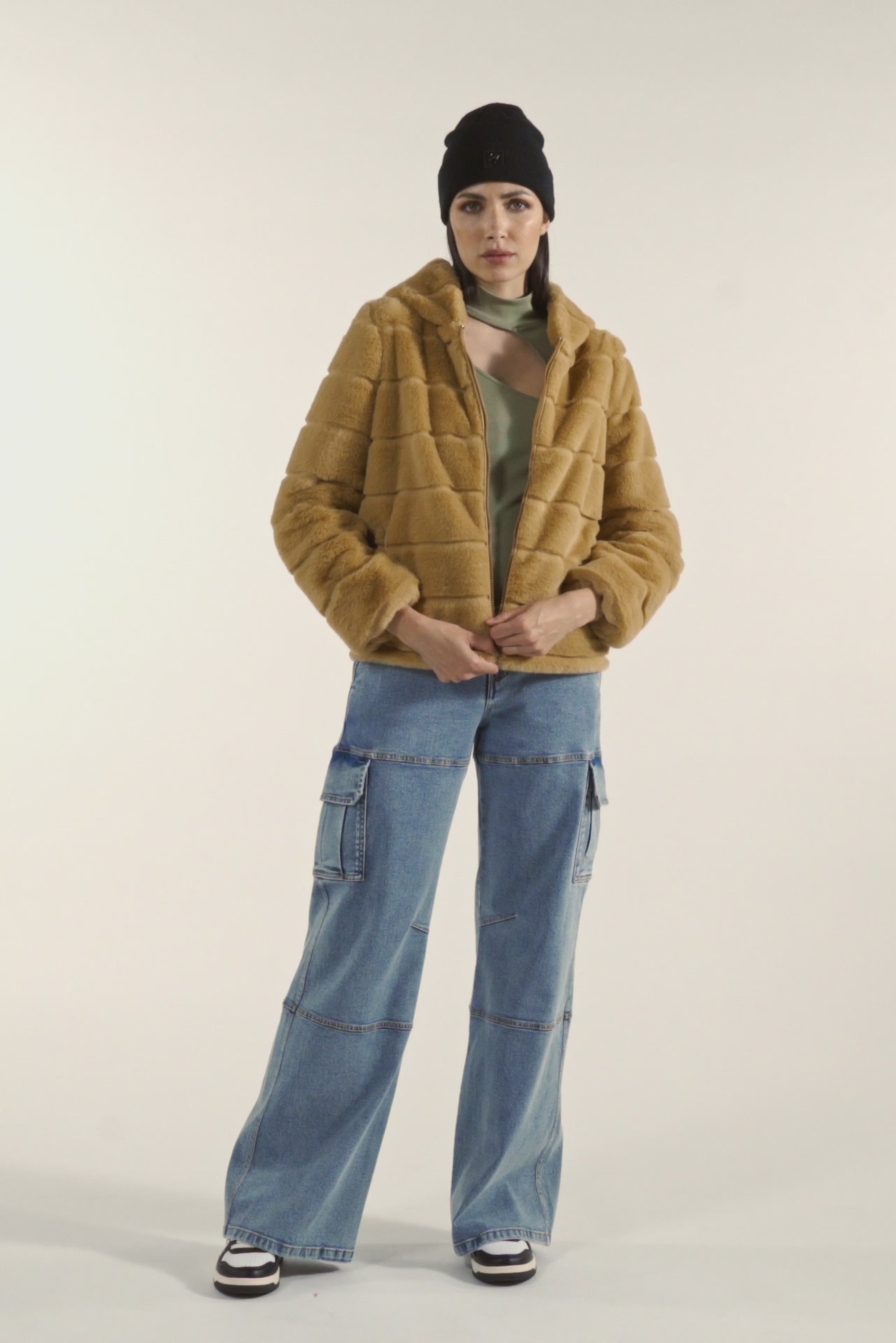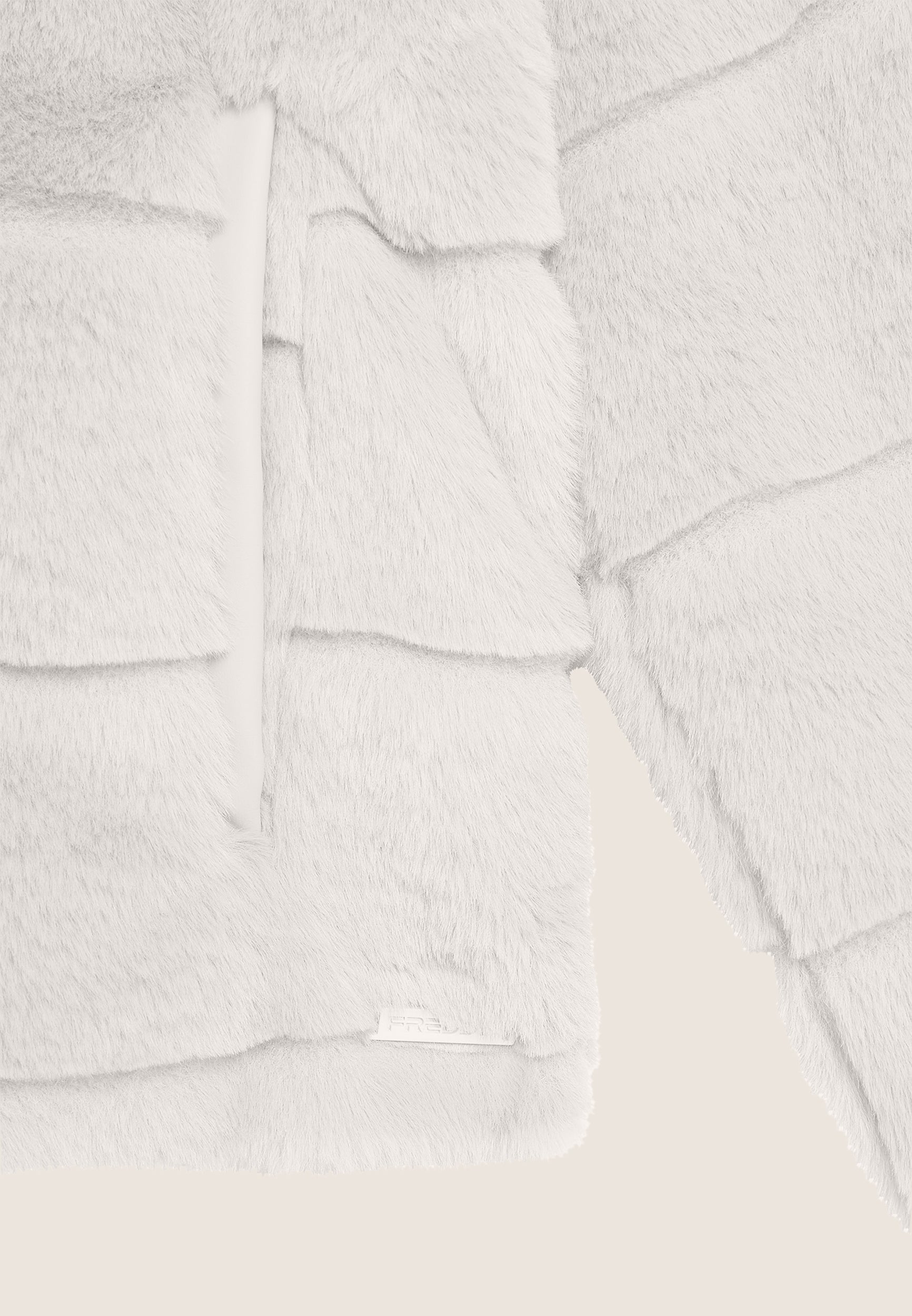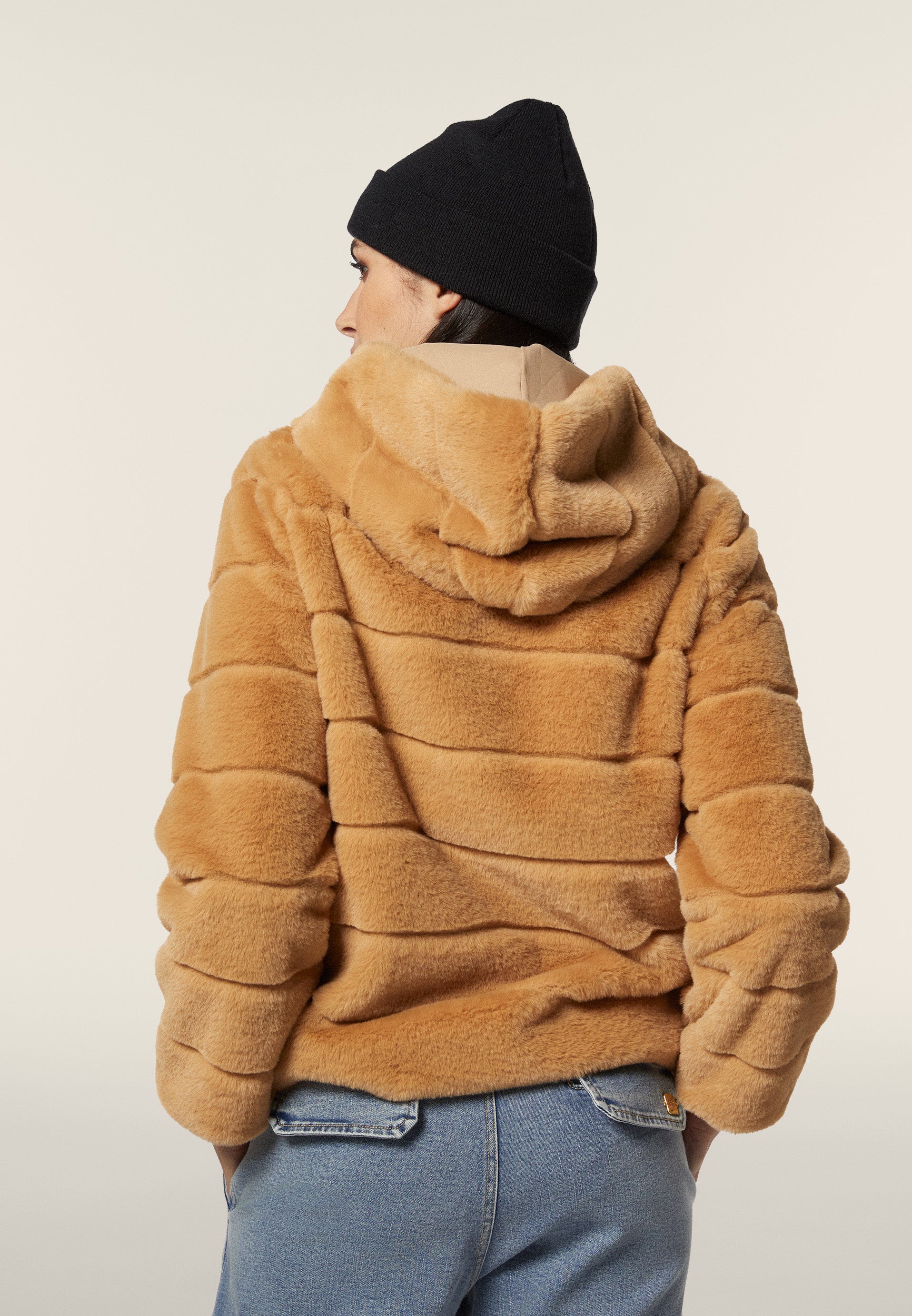 Complete your winter outfits with our synthetic fur jacket. Made from laser-cut synthetic fur, this jacket features a distinctive and eye-catching striped design. The hood offers additional protection against the cold, while the zip closure ensures a comfortable and practical fit.