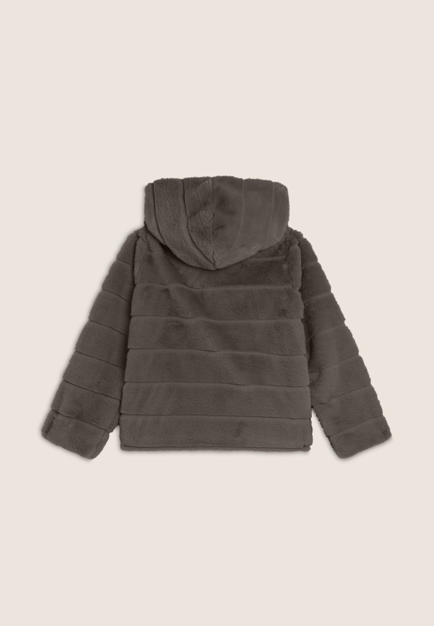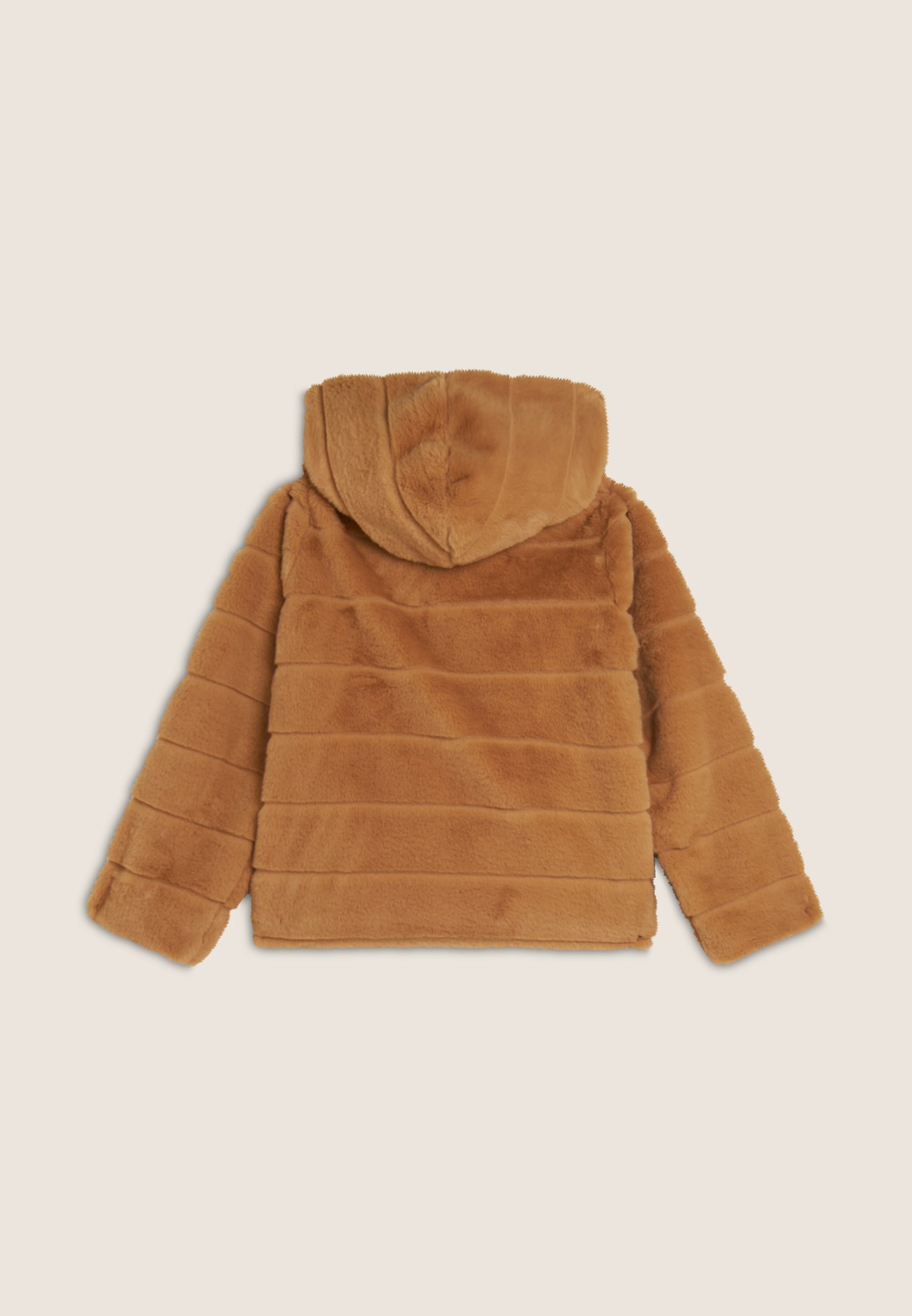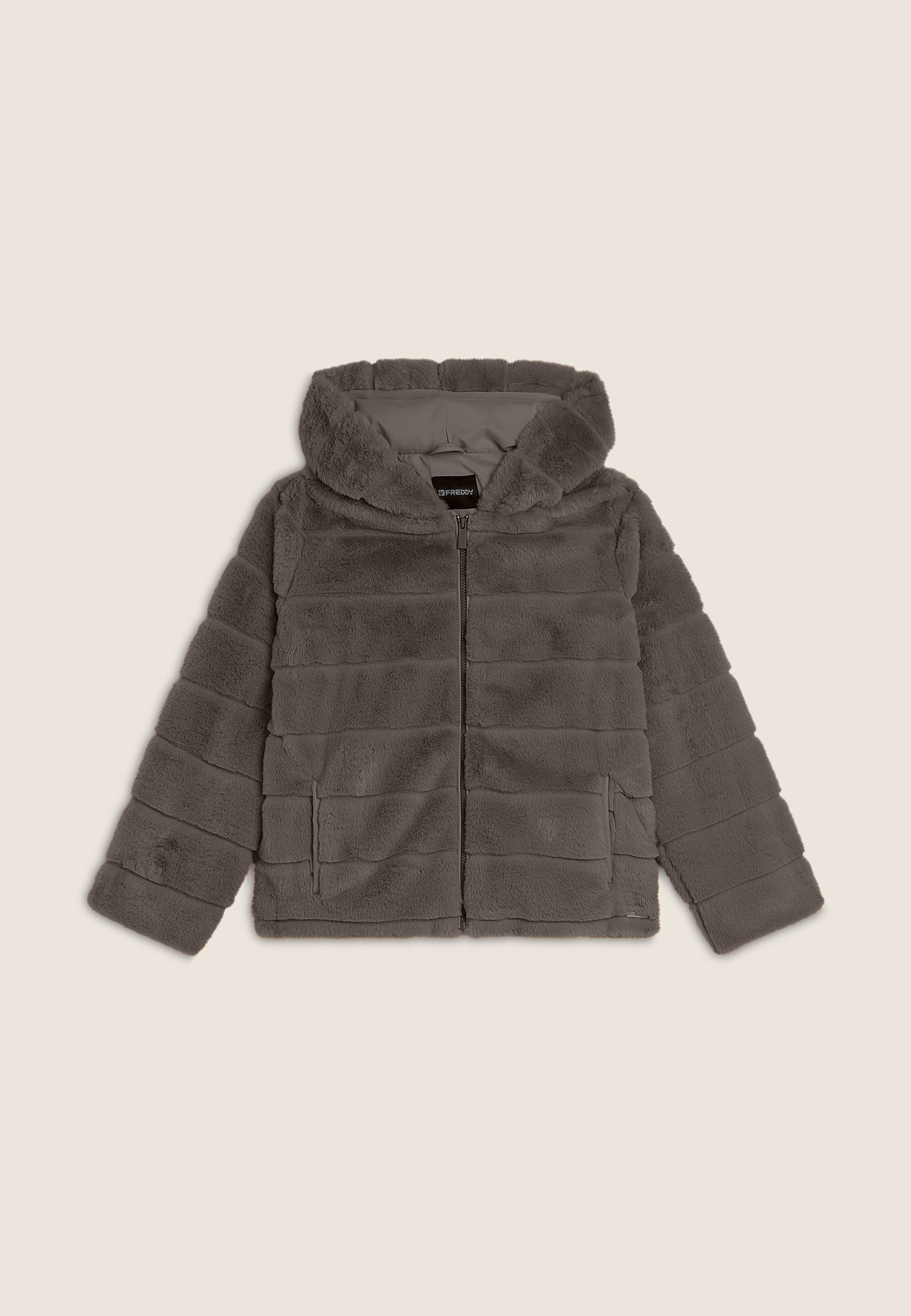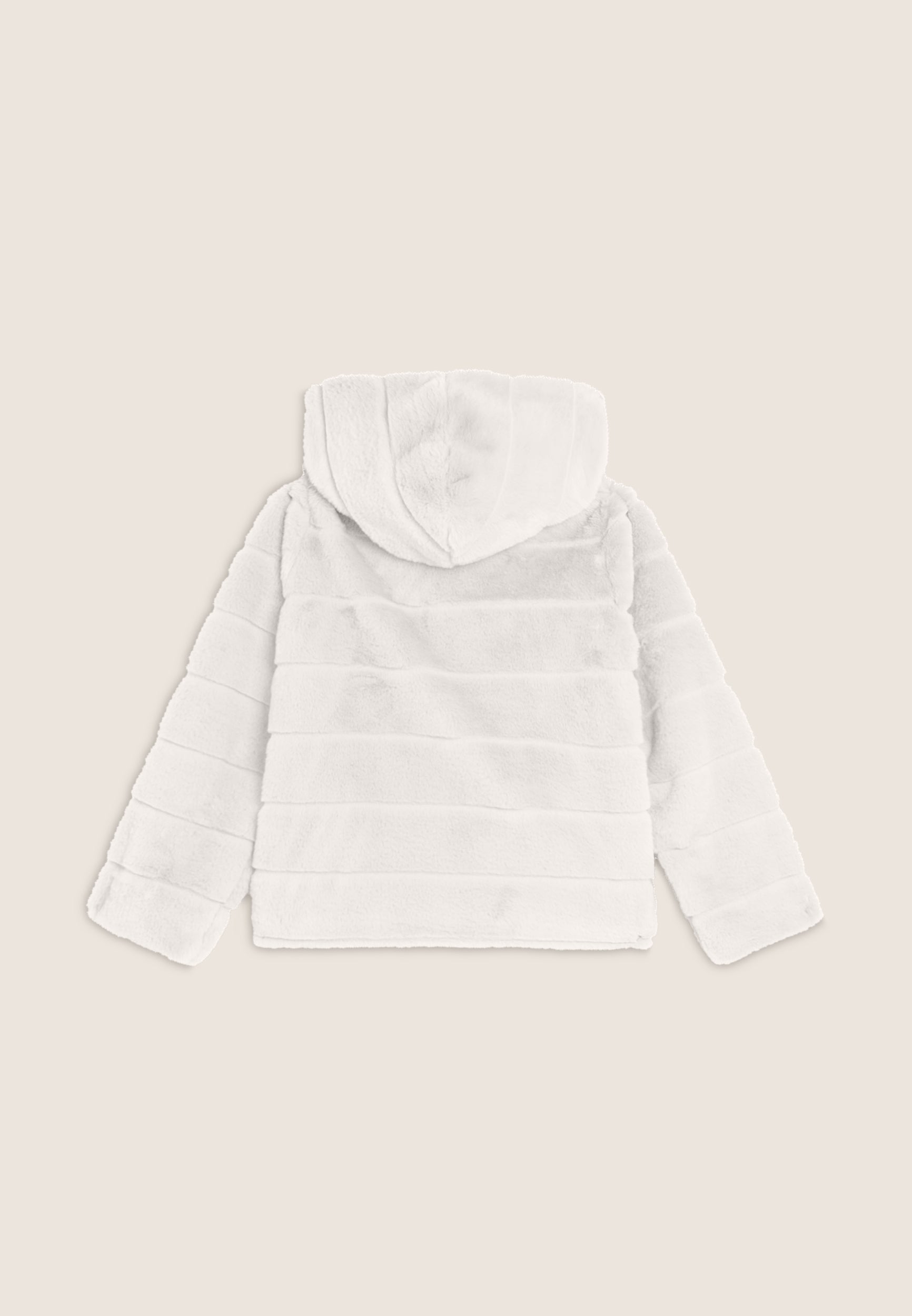 Complete your winter outfits with our synthetic fur jacket. Made from laser-cut synthetic fur, this jacket features a distinctive and eye-catching striped design. The hood offers additional protection against the cold, while the zip closure ensures a comfortable and practical fit.