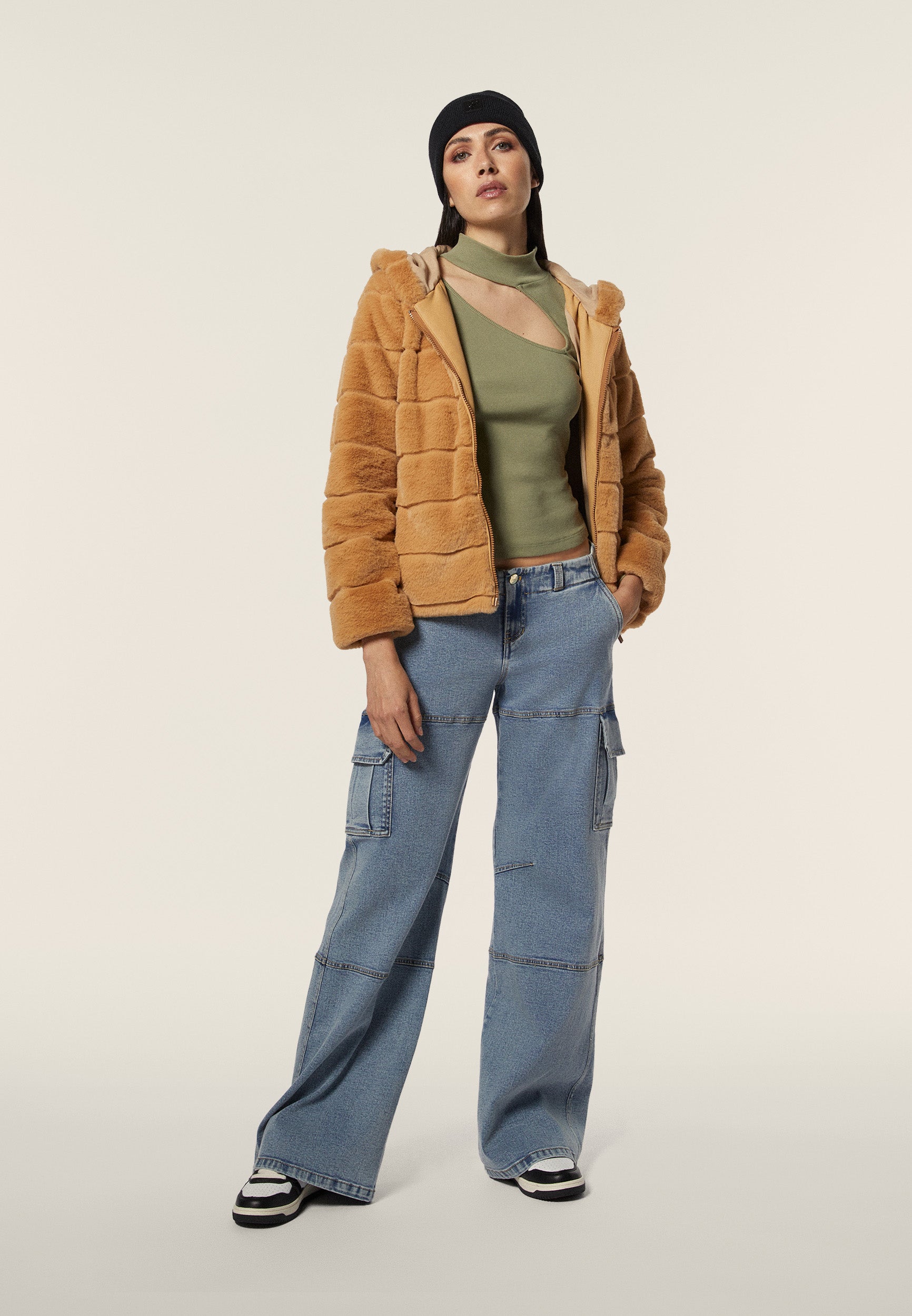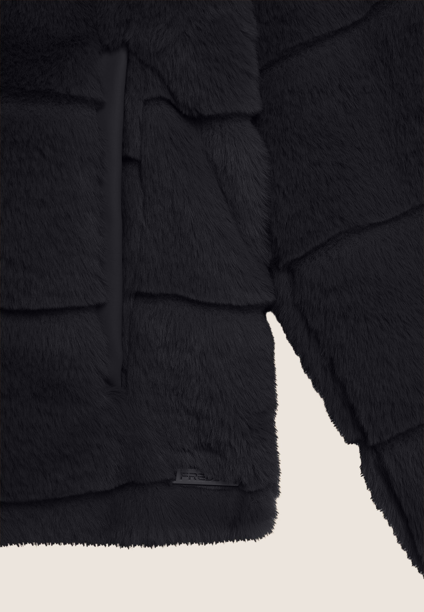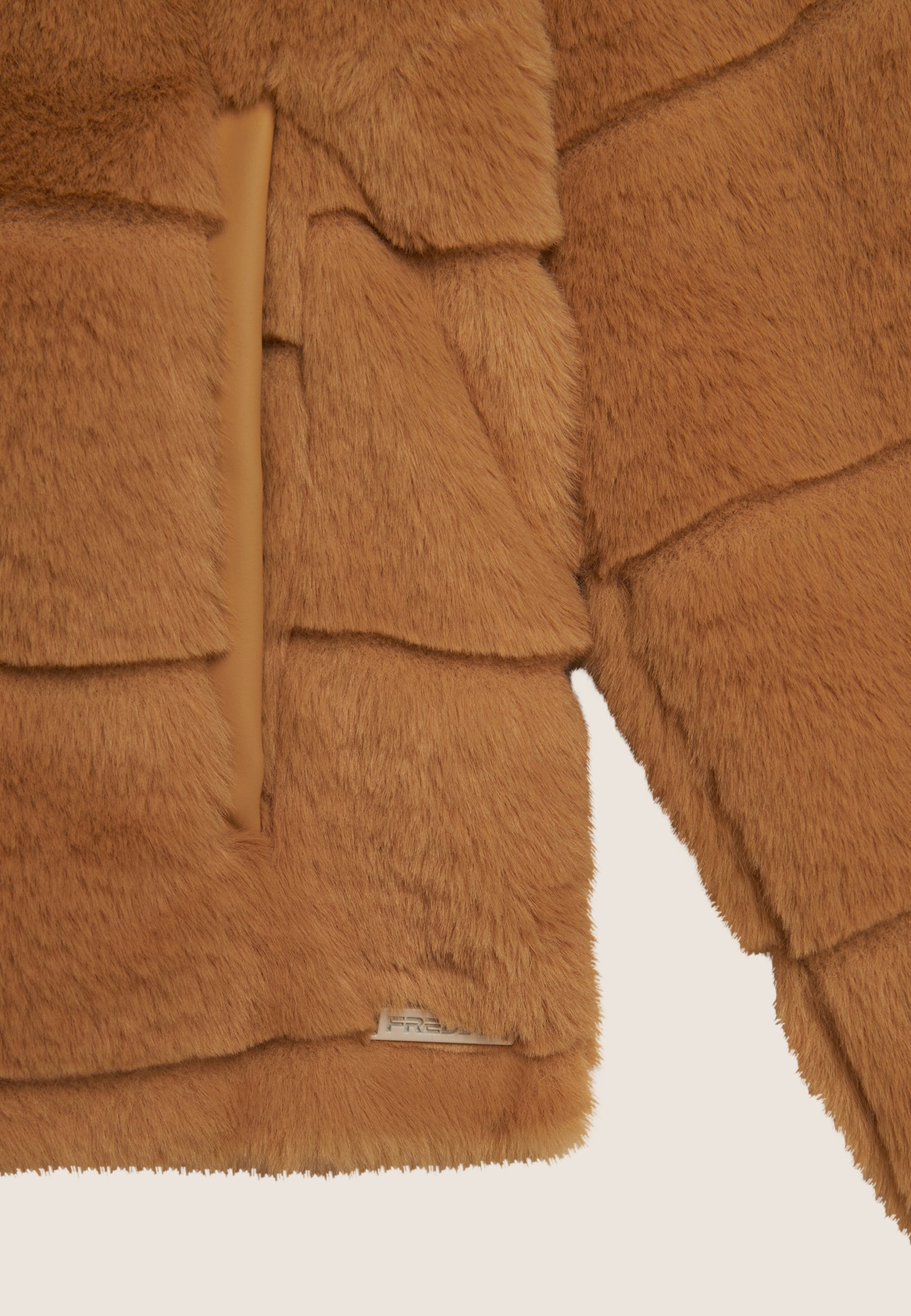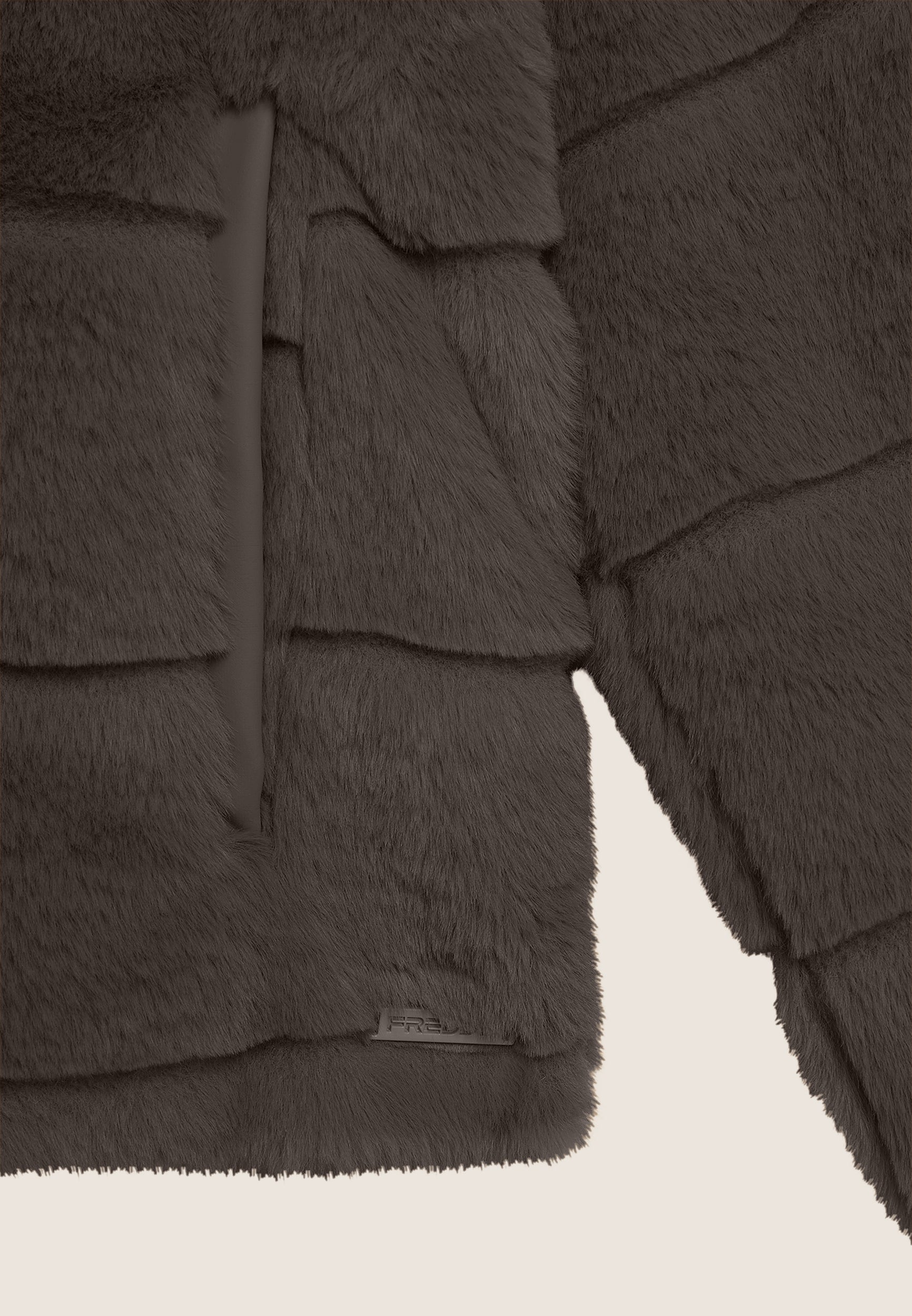 Complete your winter outfits with our synthetic fur jacket. Made from laser-cut synthetic fur, this jacket features a distinctive and eye-catching striped design. The hood offers additional protection against the cold, while the zip closure ensures a comfortable and practical fit.