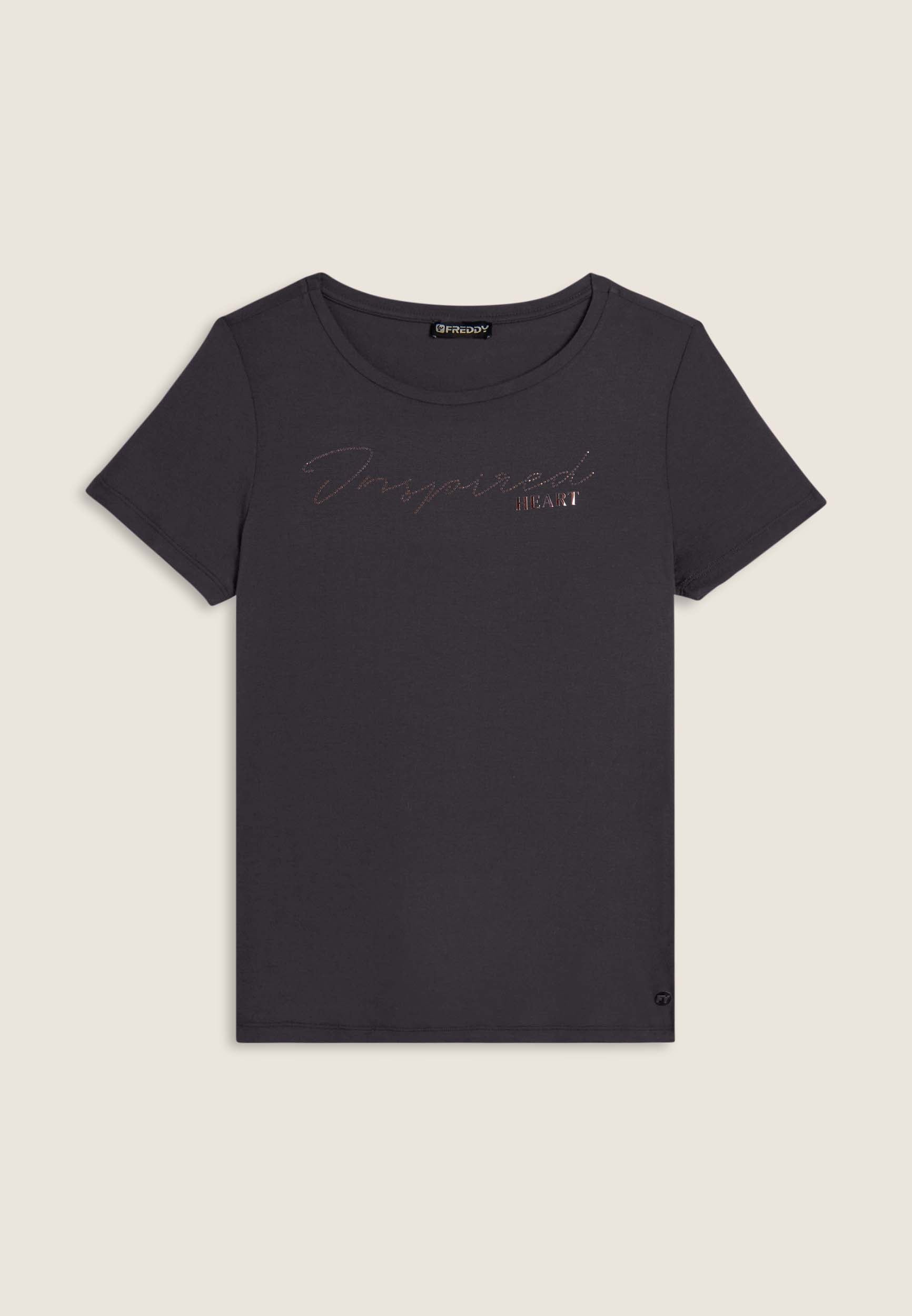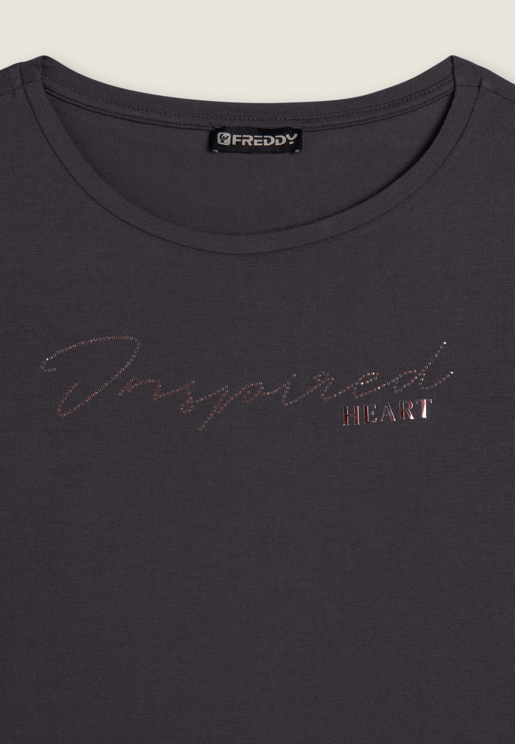 Women's T-shirt with longer rounded back. “Inspired Heart” graphic made from rhinestones with metallic logo on the bottom. In stretch viscose jersey, soft and elegant.