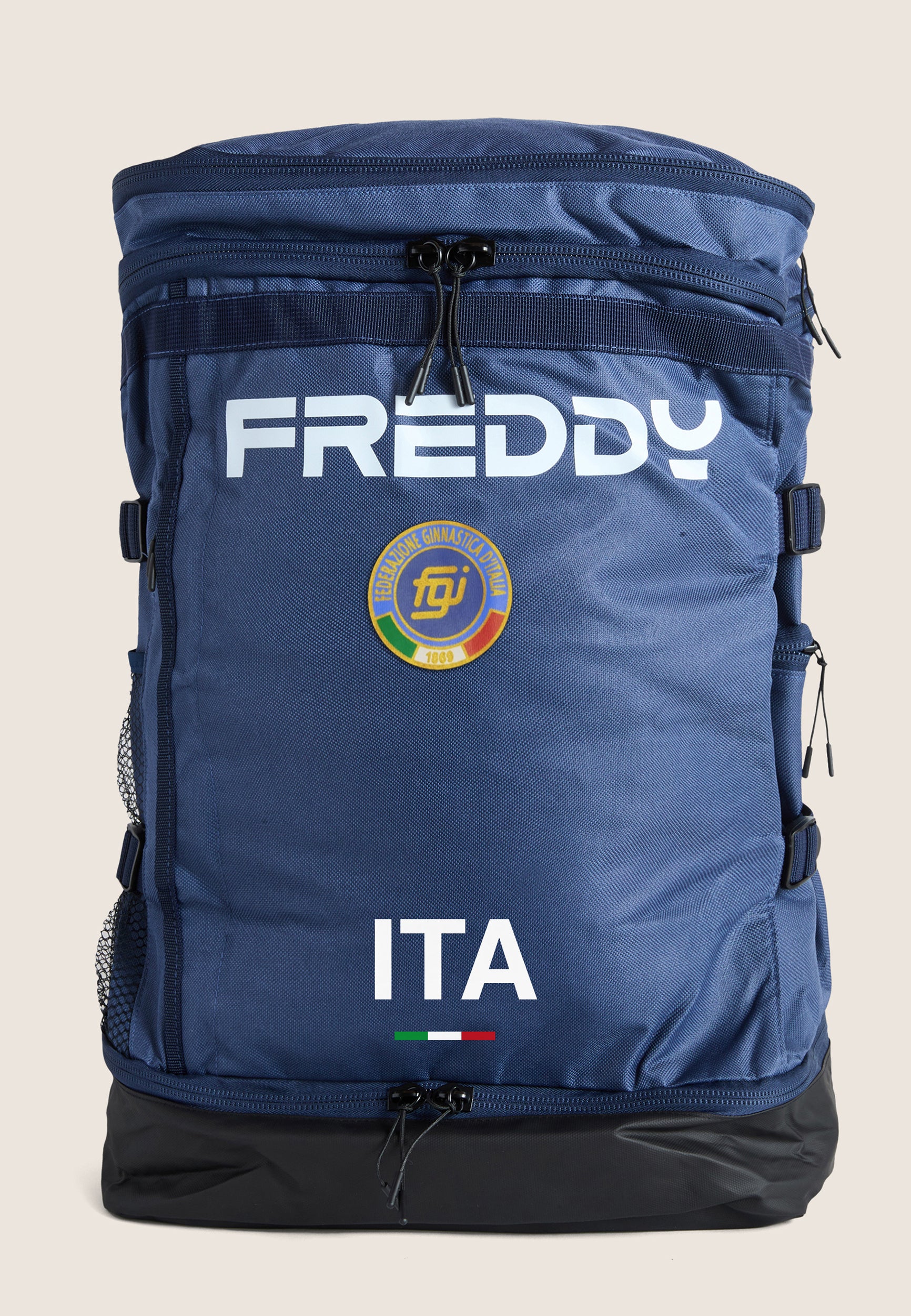 I loghi Freddy, Federazione Ginnastica d'Italia e la scritta ITA con grafica tricolore firmano questo accessorio indispensabile per la palestra e le trasferte.
