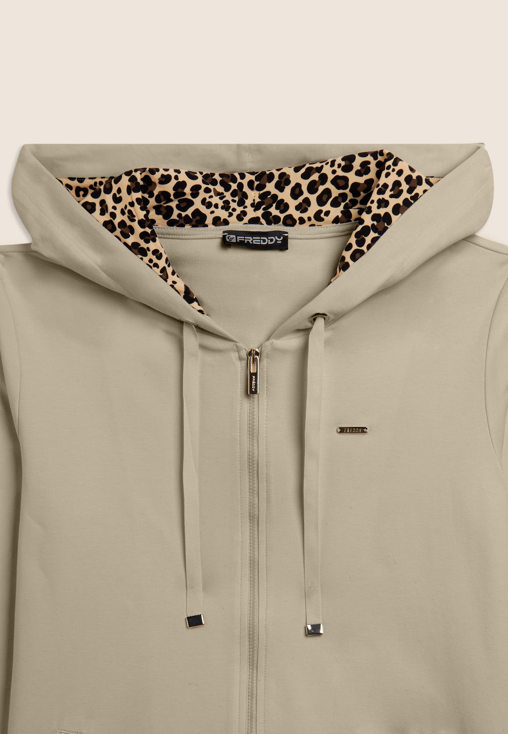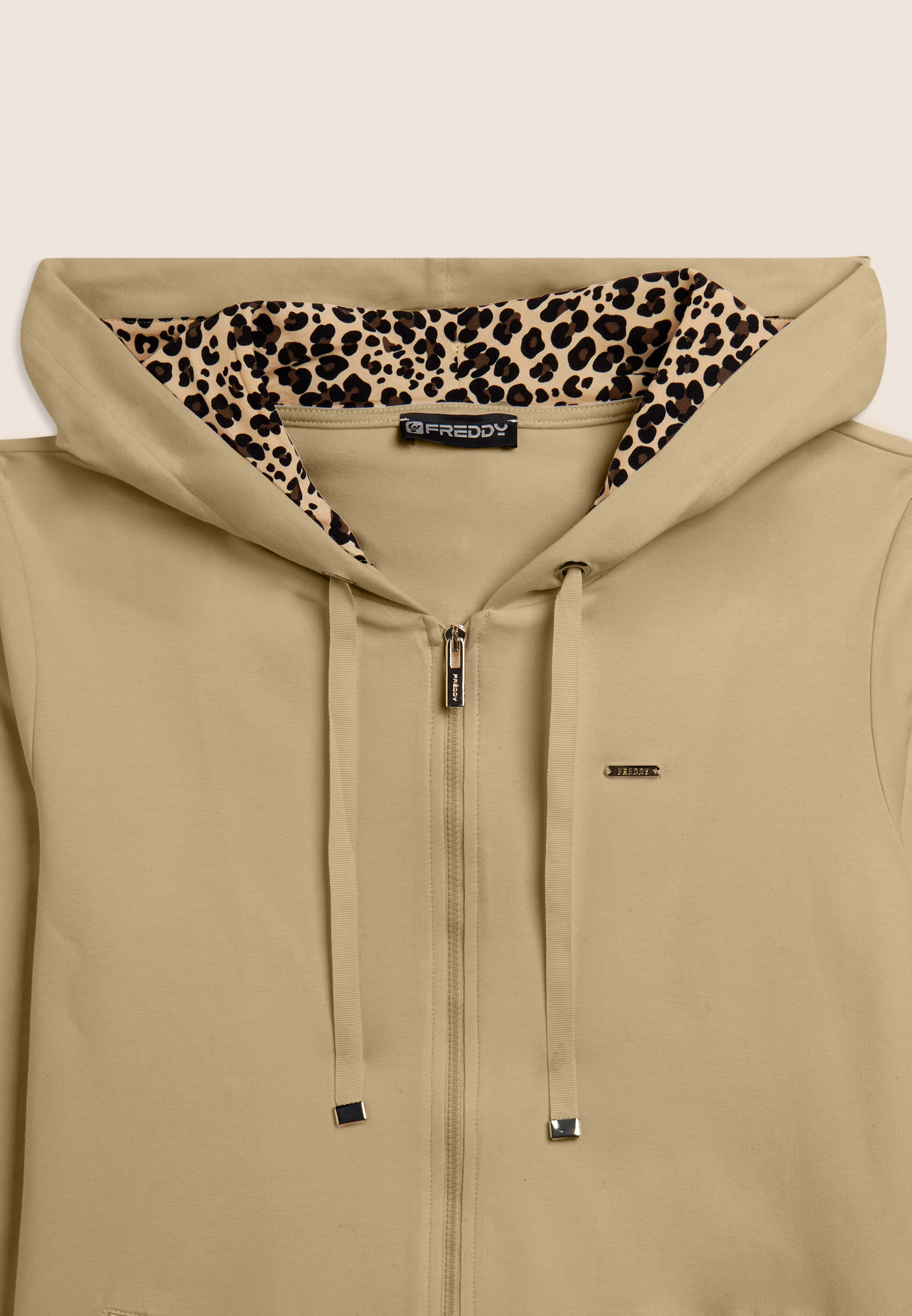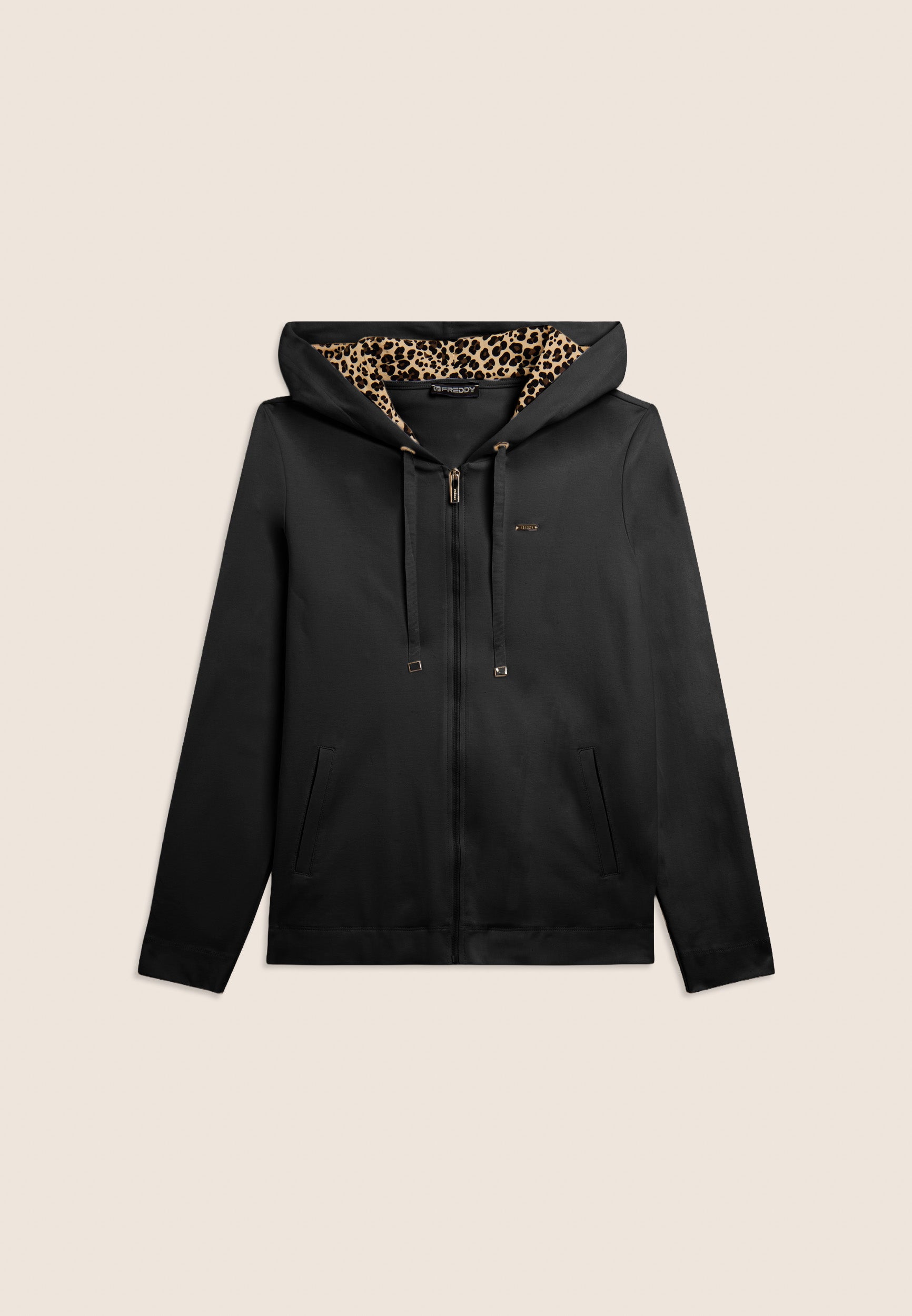 A zip hoodie with a regular fit and length, designed to combine everyday comfort with sophisticated details. The hood has a drawstring and is lined inside with viscose with an animal pattern, which adds a feminine and sophisticated touch. Besom pockets provide practicality without altering the clean design. The long sleeves without cuffs give a contemporary line. The small studded Freddy logo on the heart and the golden FREDDY logo tab on the left pocket opening complete the look. Made of heavy cotton stretch jersey.