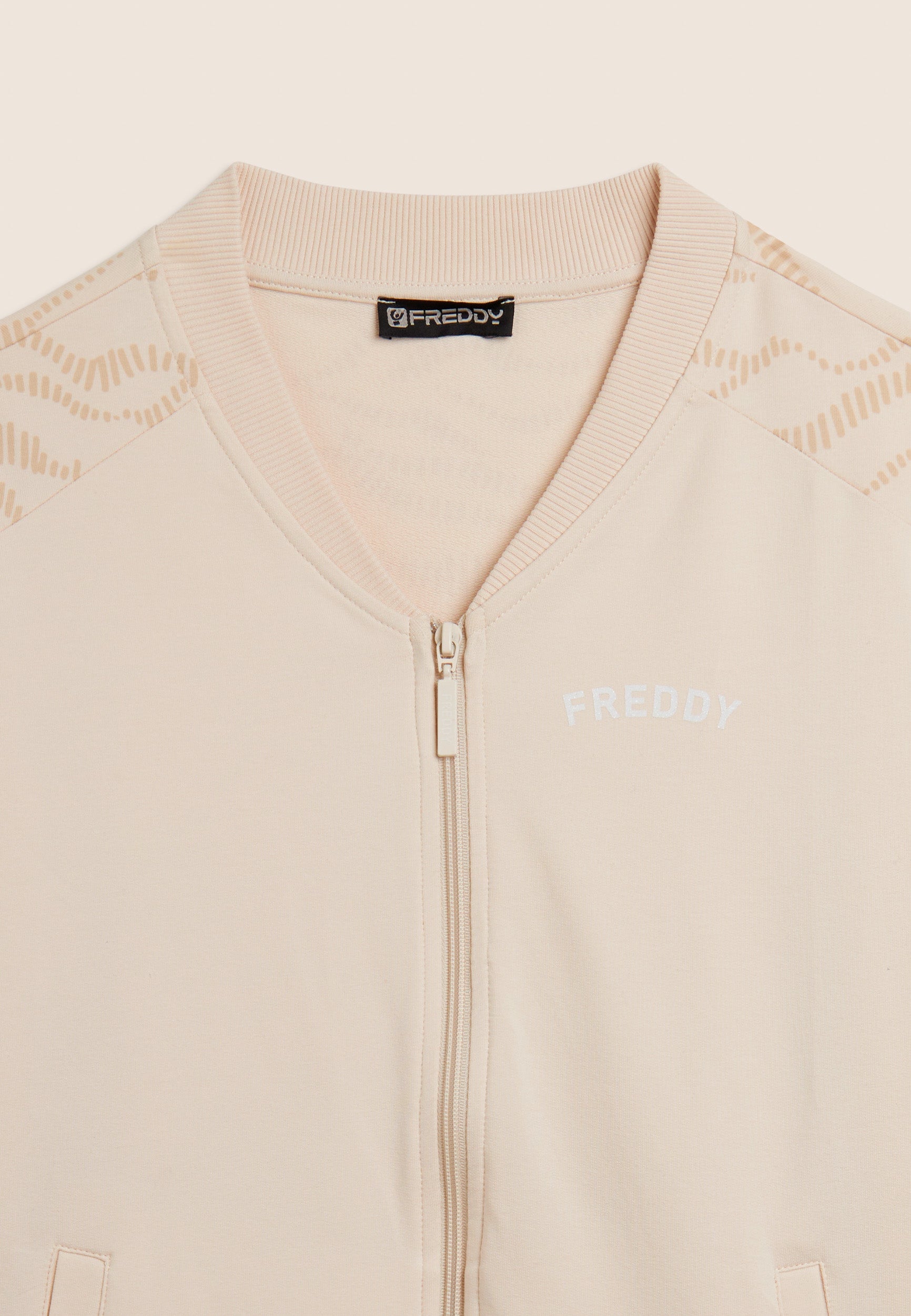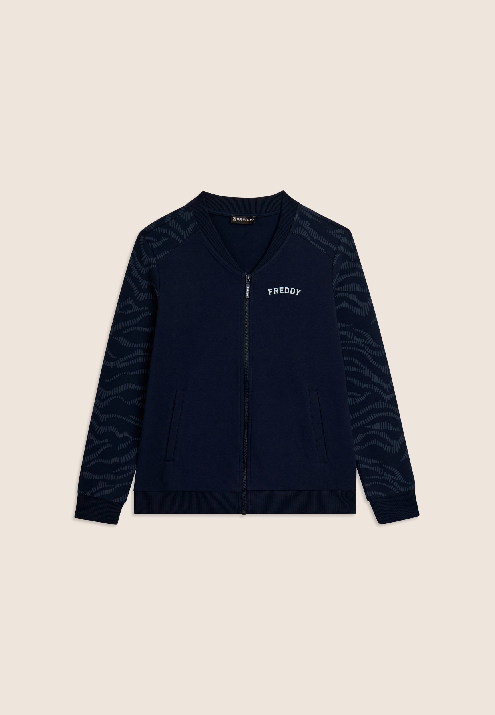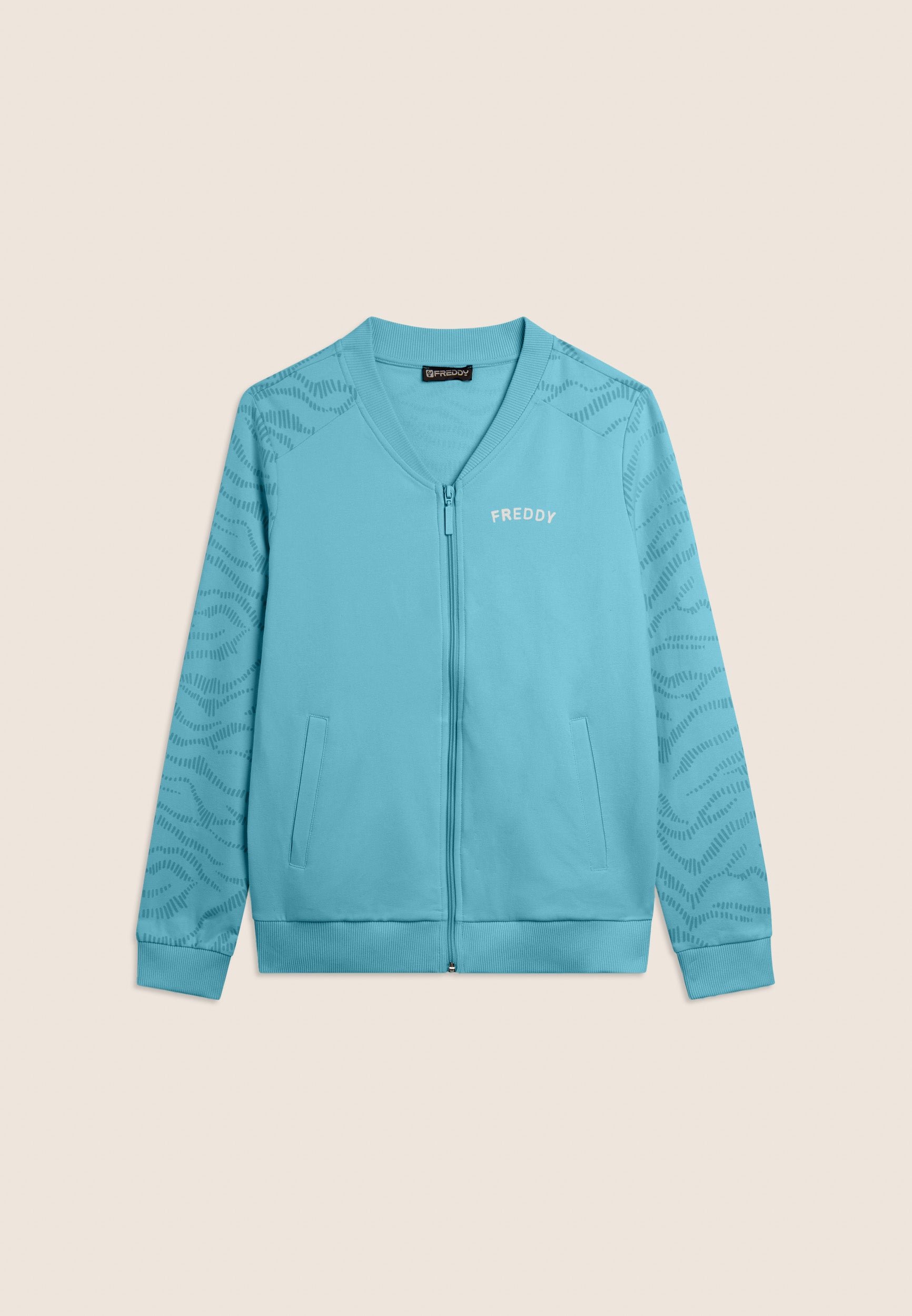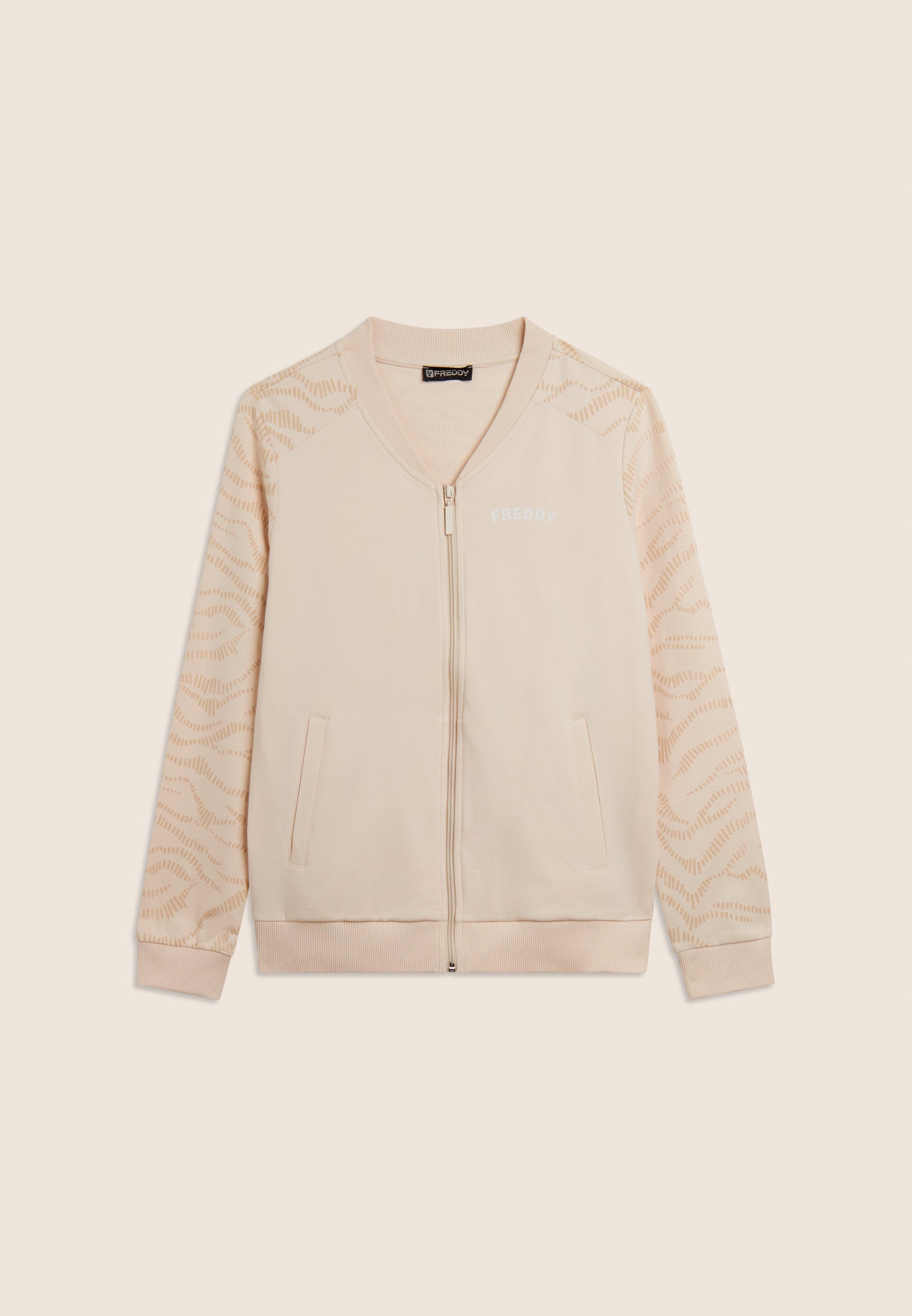 Zip sweatshirt and ribbed bottom, regular fit and perfect length for any casual occasion. The ribbed bomber-style collar, long sleeves with cuffs and a small FREDDY logo printed on the heart in white glitter offer a sporty and sophisticated look. The wavy graphic pattern on the back and sleeves, in a colour tone, adds a dynamic touch. Front besom pockets complete the practicality. Made of stretch French terry, it is ideal for mid-season and versatile year-round use.