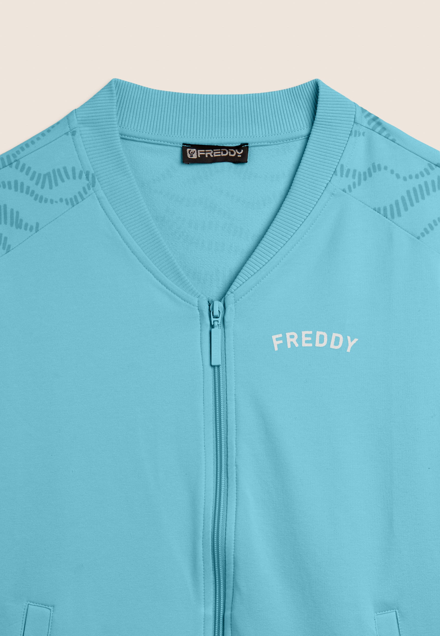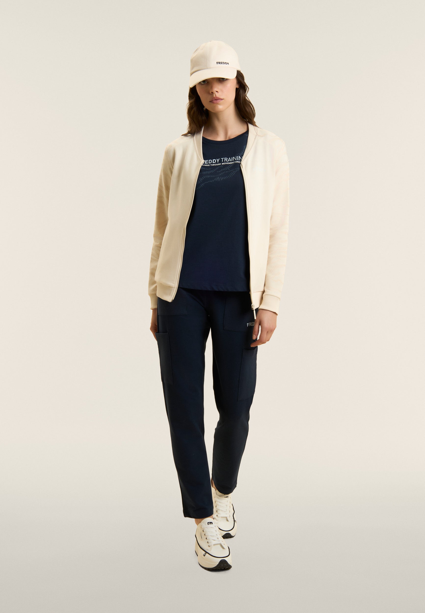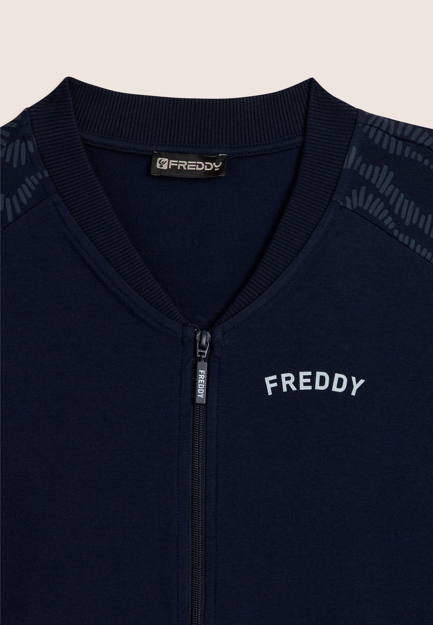 Zip sweatshirt and ribbed bottom, regular fit and perfect length for any casual occasion. The ribbed bomber-style collar, long sleeves with cuffs and a small FREDDY logo printed on the heart in white glitter offer a sporty and sophisticated look. The wavy graphic pattern on the back and sleeves, in a colour tone, adds a dynamic touch. Front besom pockets complete the practicality. Made of stretch French terry, it is ideal for mid-season and versatile year-round use.