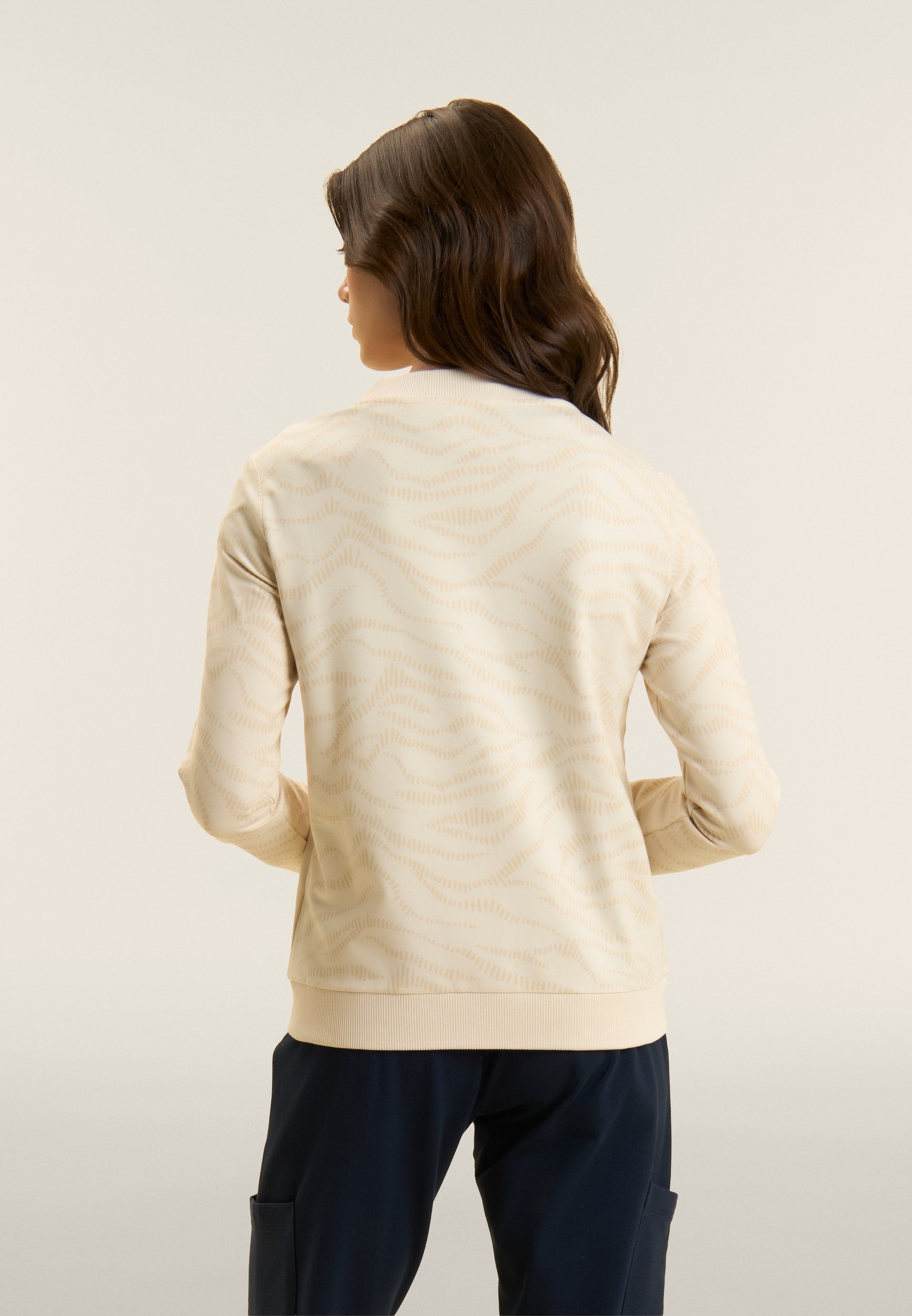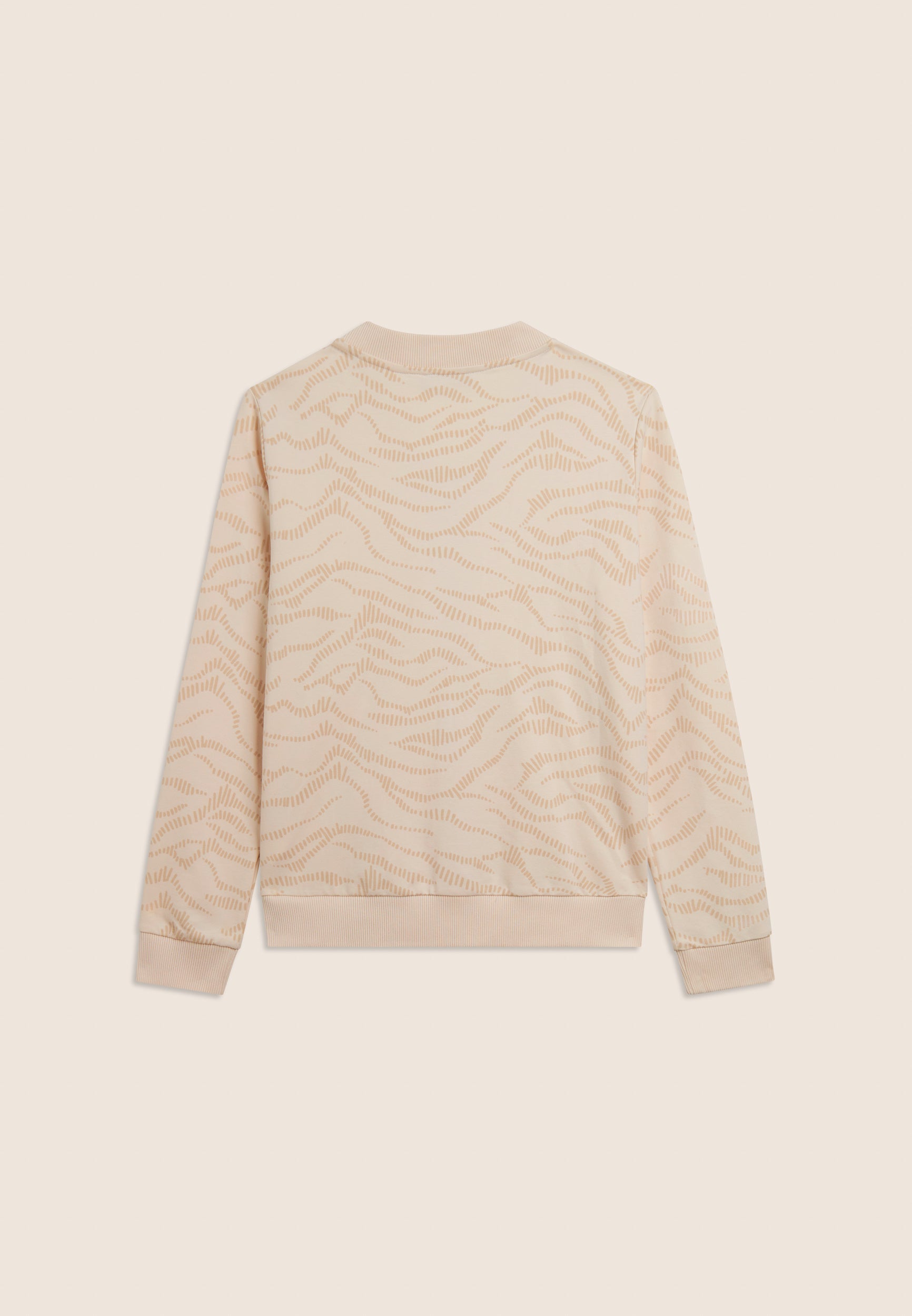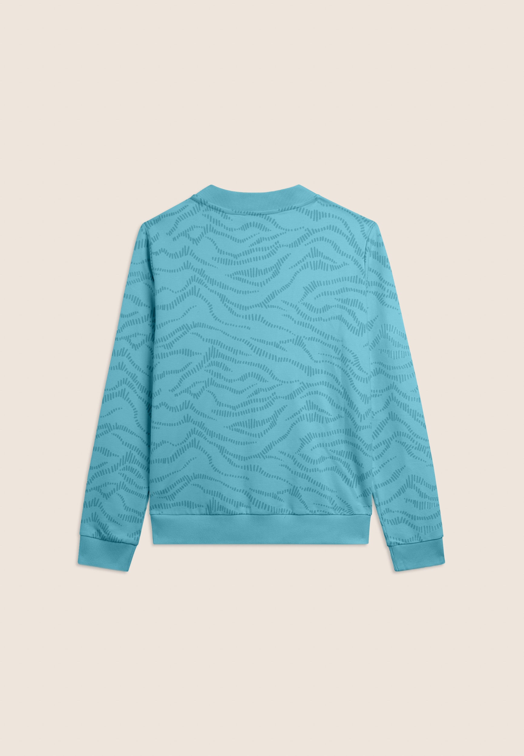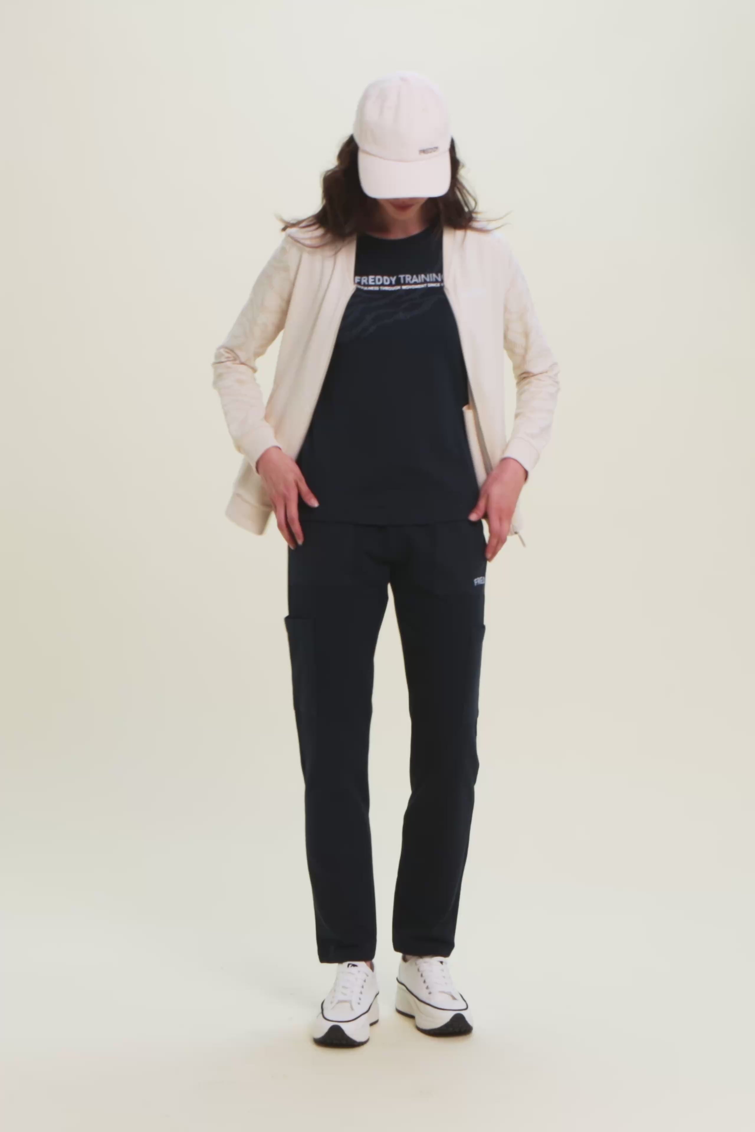 Zip sweatshirt and ribbed bottom, regular fit and perfect length for any casual occasion. The ribbed bomber-style collar, long sleeves with cuffs and a small FREDDY logo printed on the heart in white glitter offer a sporty and sophisticated look. The wavy graphic pattern on the back and sleeves, in a colour tone, adds a dynamic touch. Front besom pockets complete the practicality. Made of stretch French terry, it is ideal for mid-season and versatile year-round use.