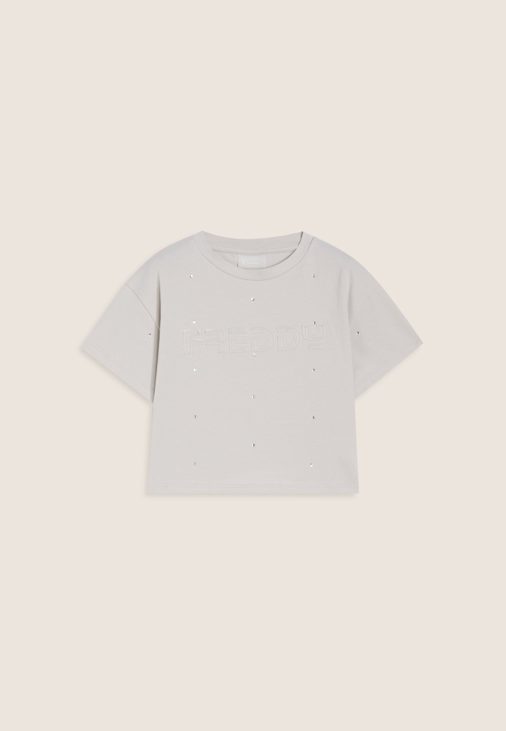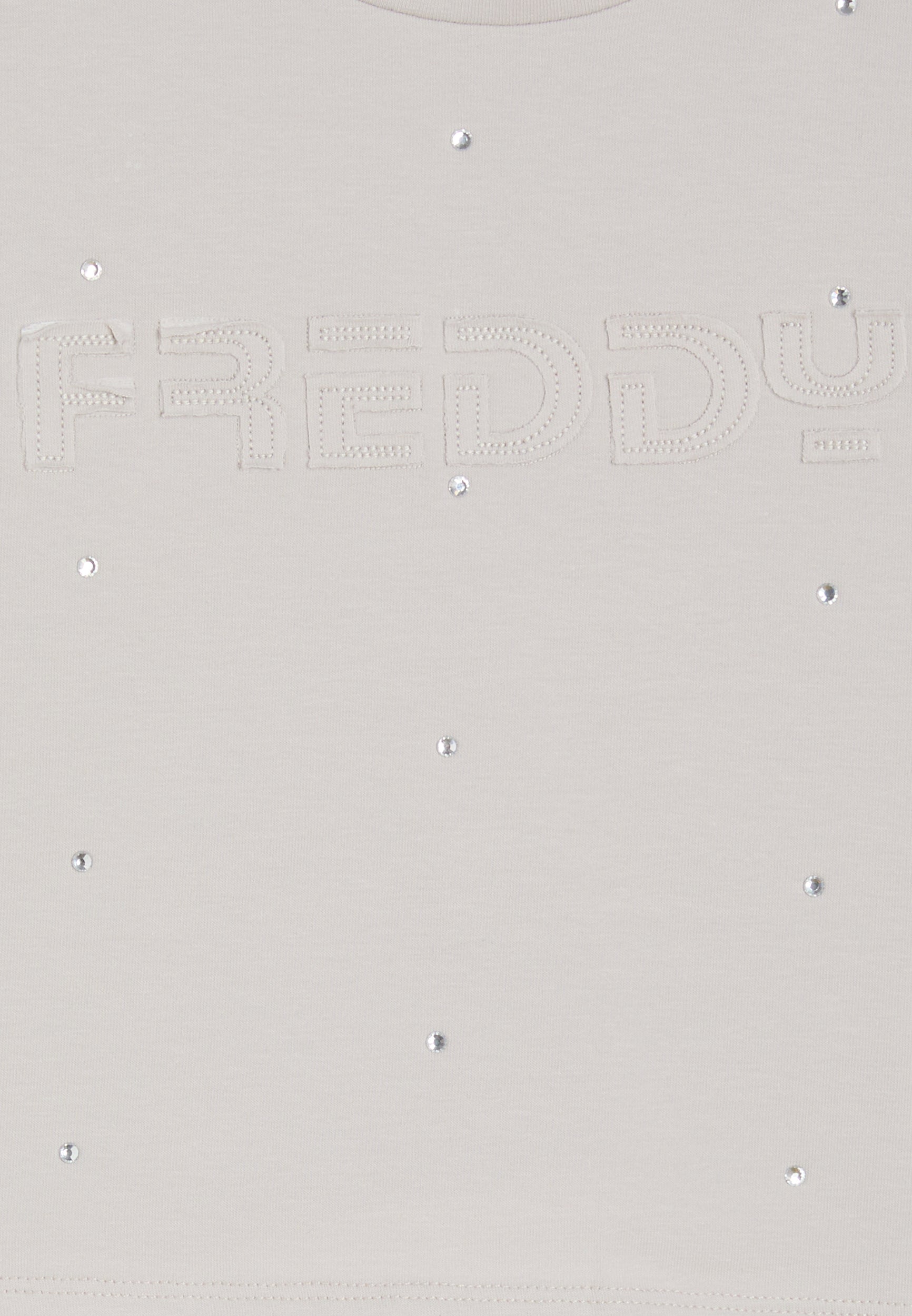 ¡Dale un toque desenfadado a tus conjuntos con esta camiseta comfort fit! El largo ligeramente recortado y el bajo recto la hacen perfecta para looks informales y actuales. El diseño con escote redondo y mangas cortas caídas con puños garantiza la comodidad, mientras que el estampado FREDDY con lunares de purpurina en la parte delantera añade un toque brillante y original.