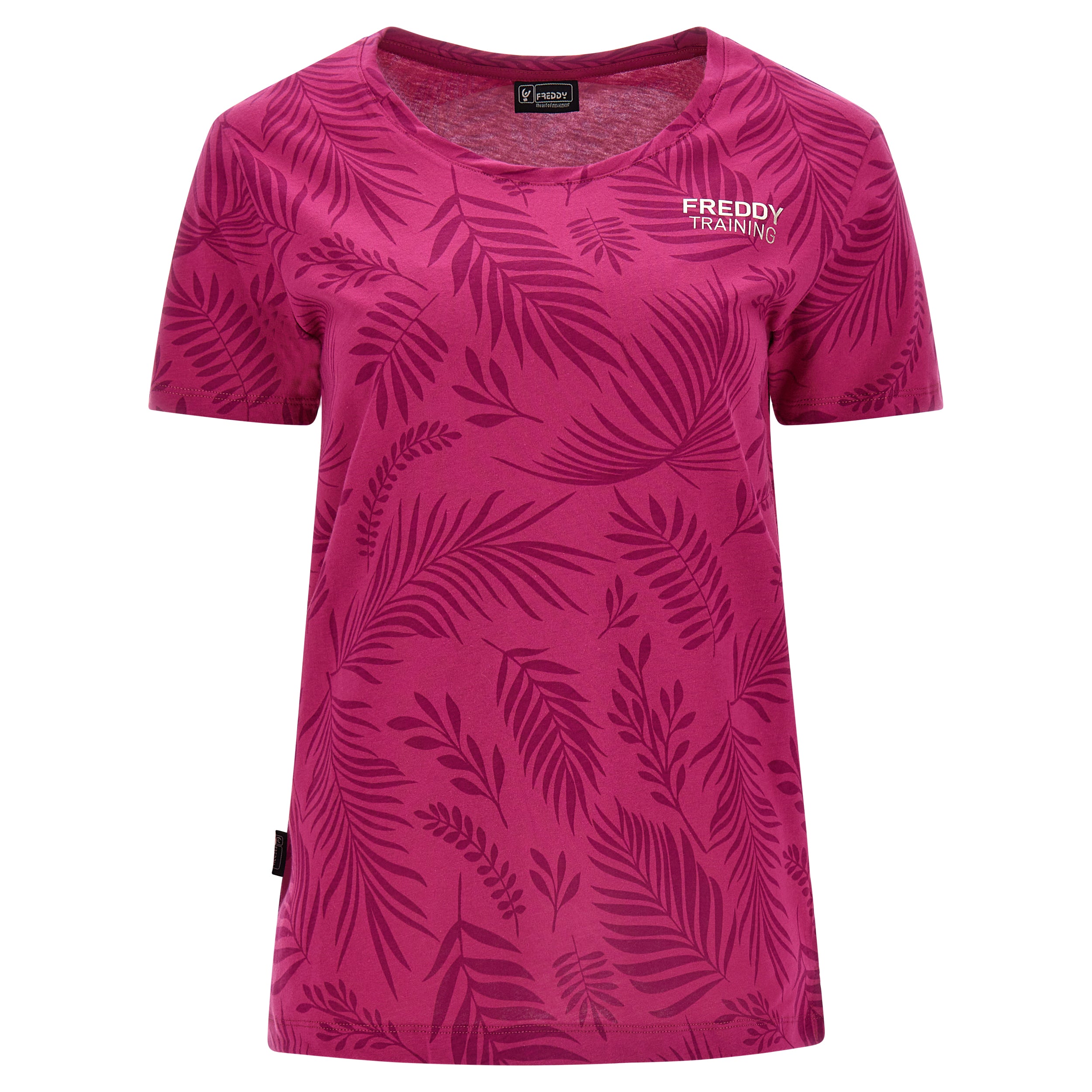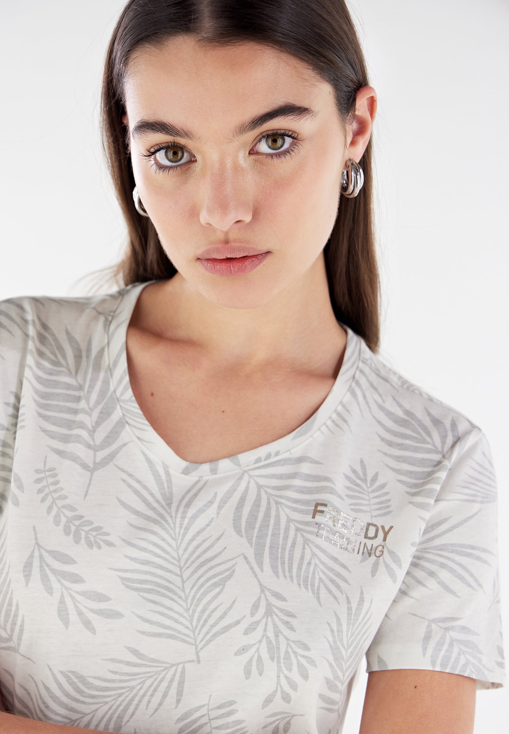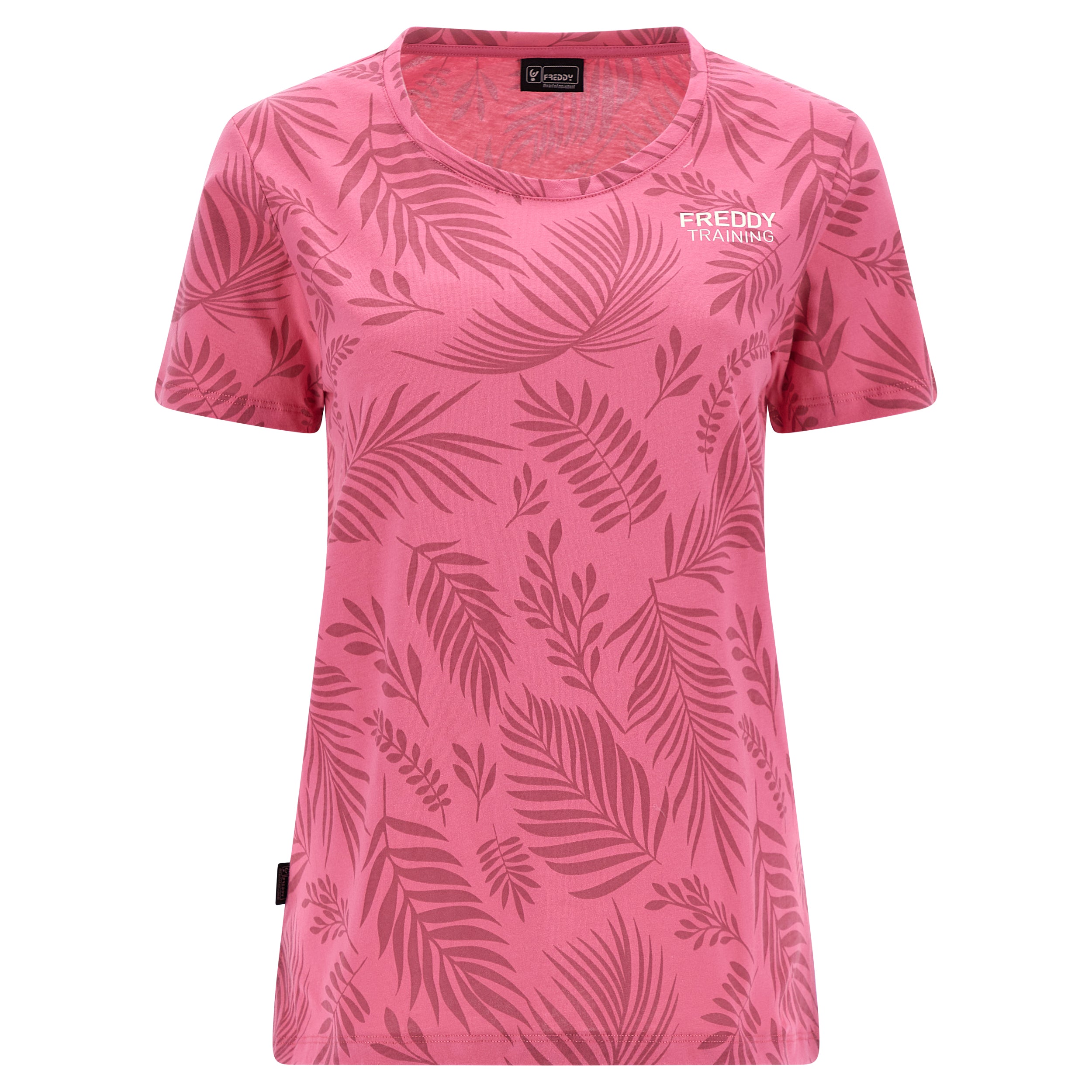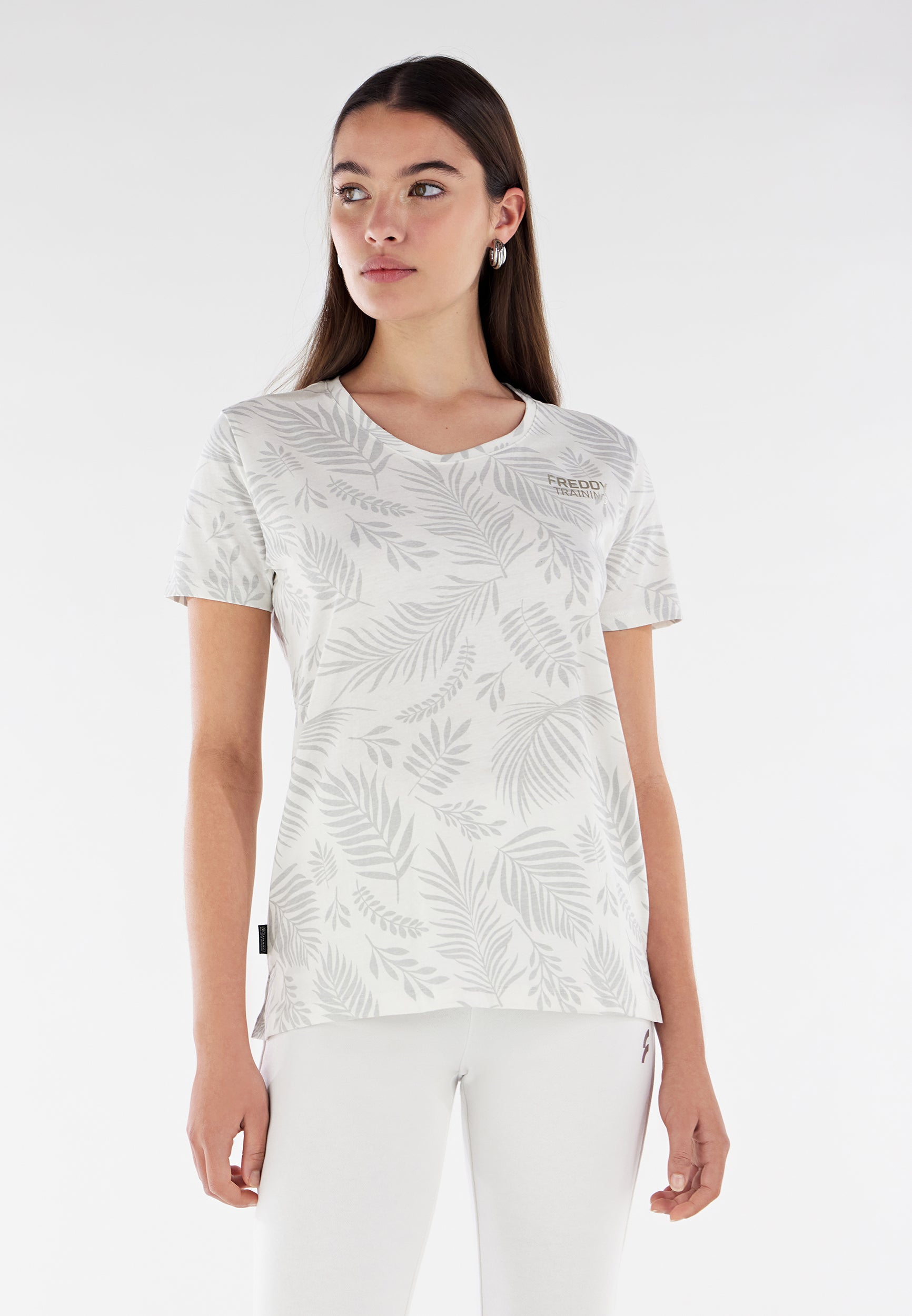 Camiseta de corte cómodo confeccionada en tejido de punto de algodón con estampado de hoja tropical en tono a juego por toda la prenda. Presenta un cuello redondo, manga corta y bajo recto con aberturas laterales. El pequeño estampado de FREDDY en color oro claro a la altura del corazón completa los detalles de estilo de esta prenda que apuesta por la comodidad, gracias a su corte amplio y a la suavidad natural de la tela. Una prenda versátil y en tonos exóticos, ideal para completar atuendos que apuestan por la libertad de movimientos.