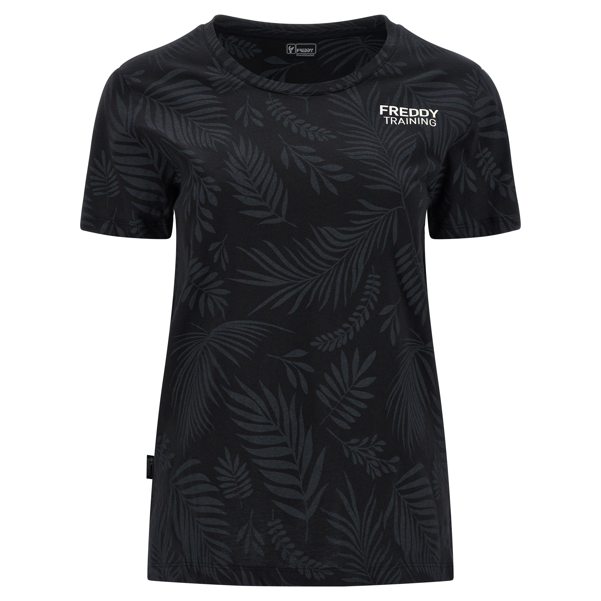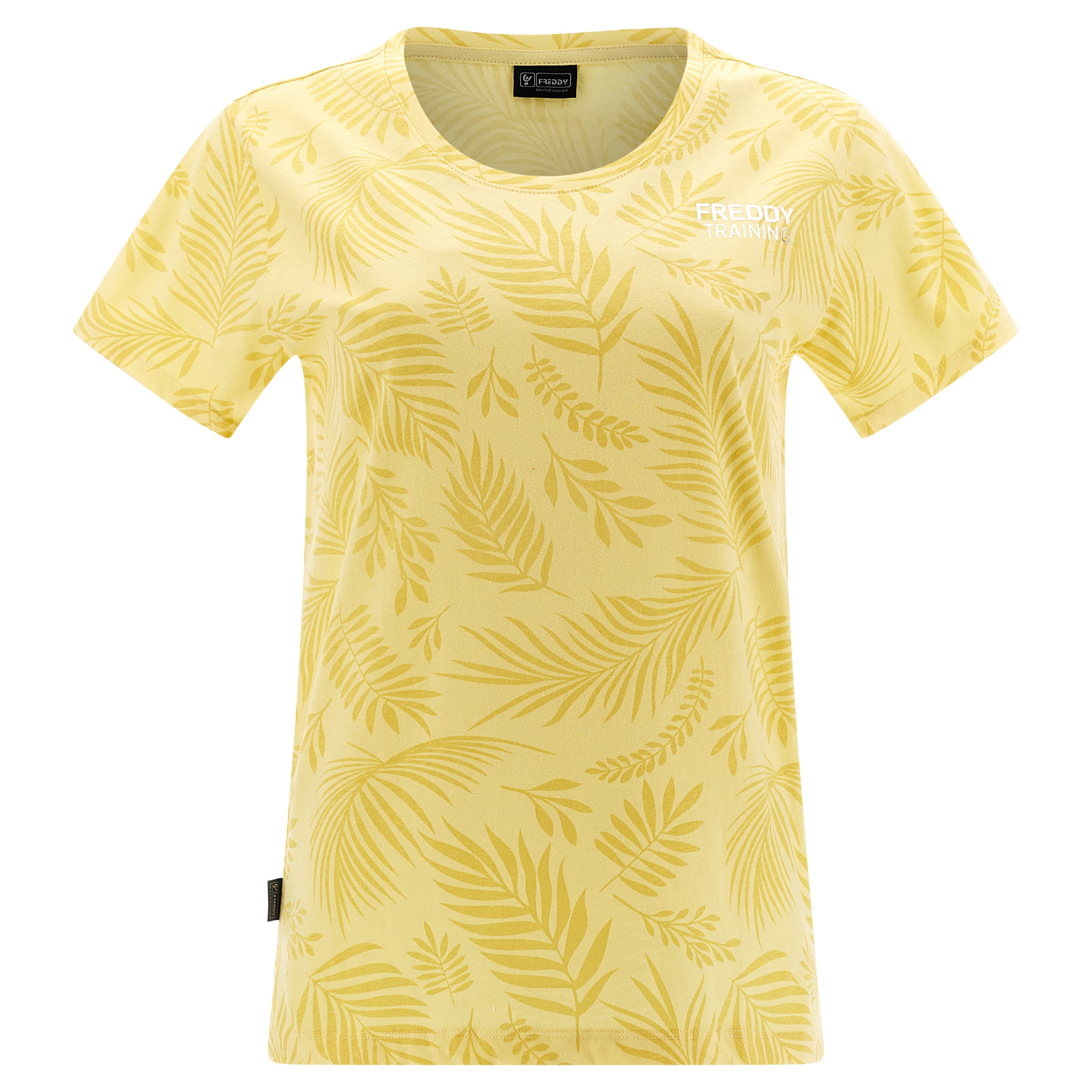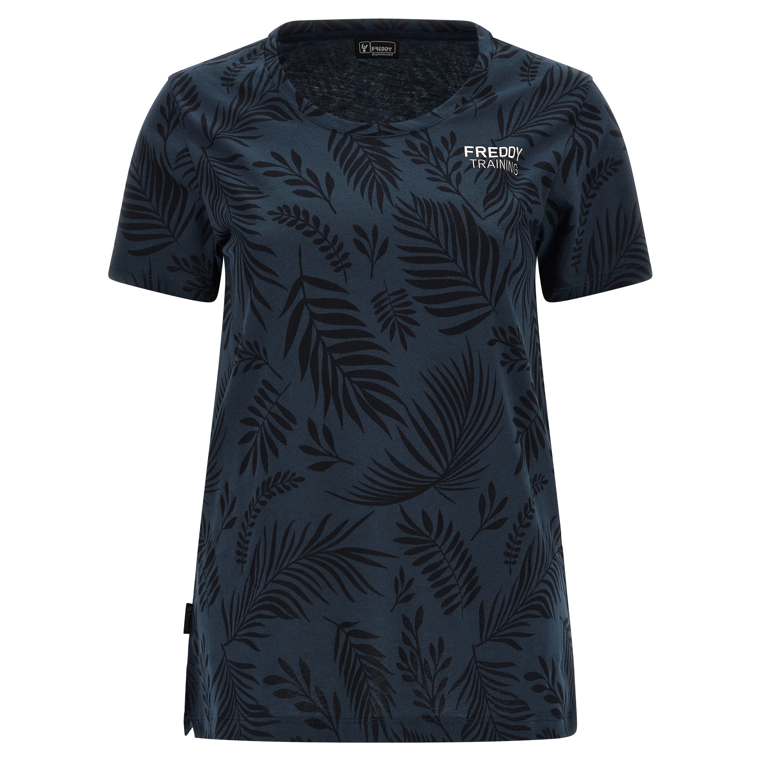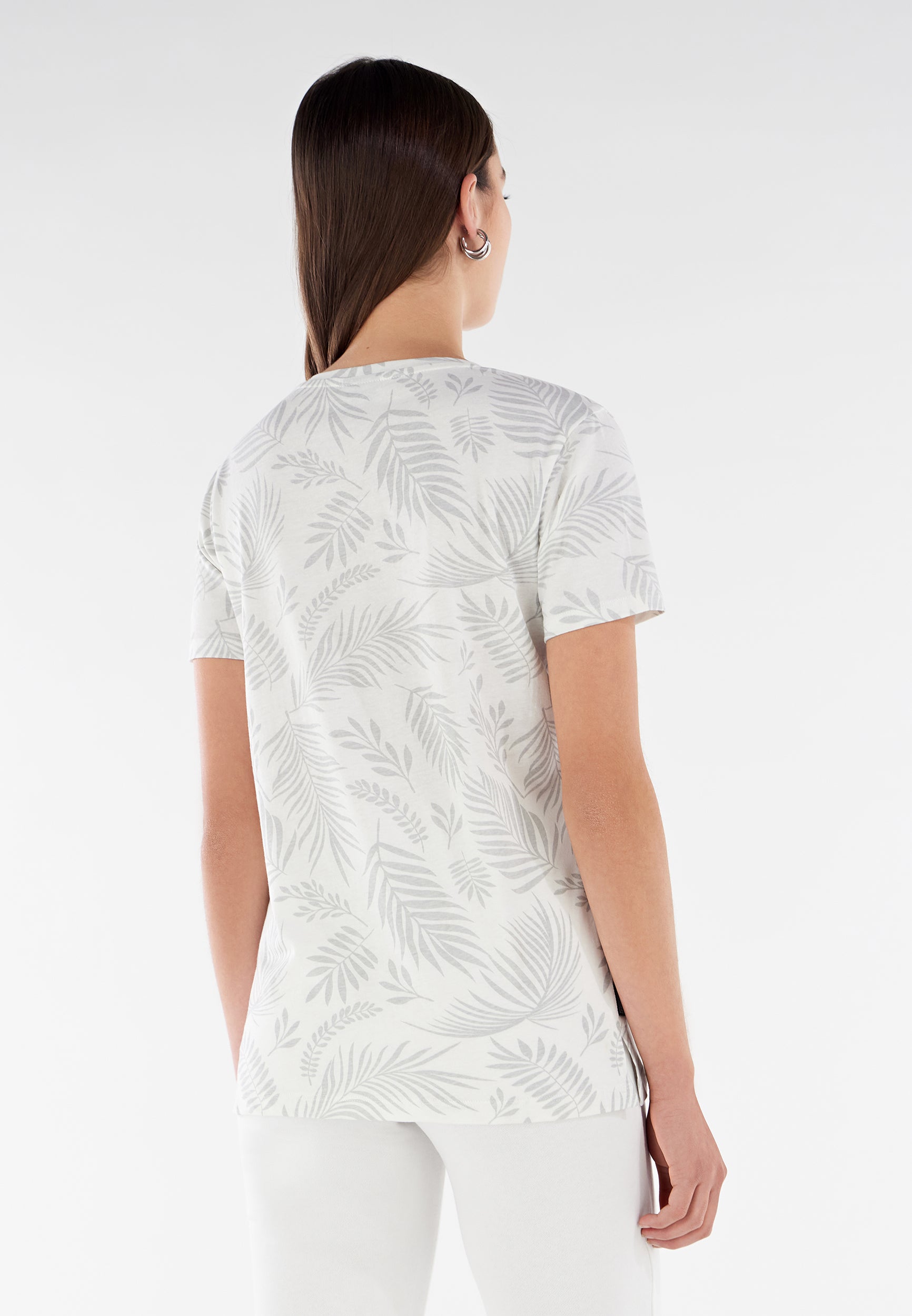 Camiseta de corte cómodo confeccionada en tejido de punto de algodón con estampado de hoja tropical en tono a juego por toda la prenda. Presenta un cuello redondo, manga corta y bajo recto con aberturas laterales. El pequeño estampado de FREDDY en color oro claro a la altura del corazón completa los detalles de estilo de esta prenda que apuesta por la comodidad, gracias a su corte amplio y a la suavidad natural de la tela. Una prenda versátil y en tonos exóticos, ideal para completar atuendos que apuestan por la libertad de movimientos.