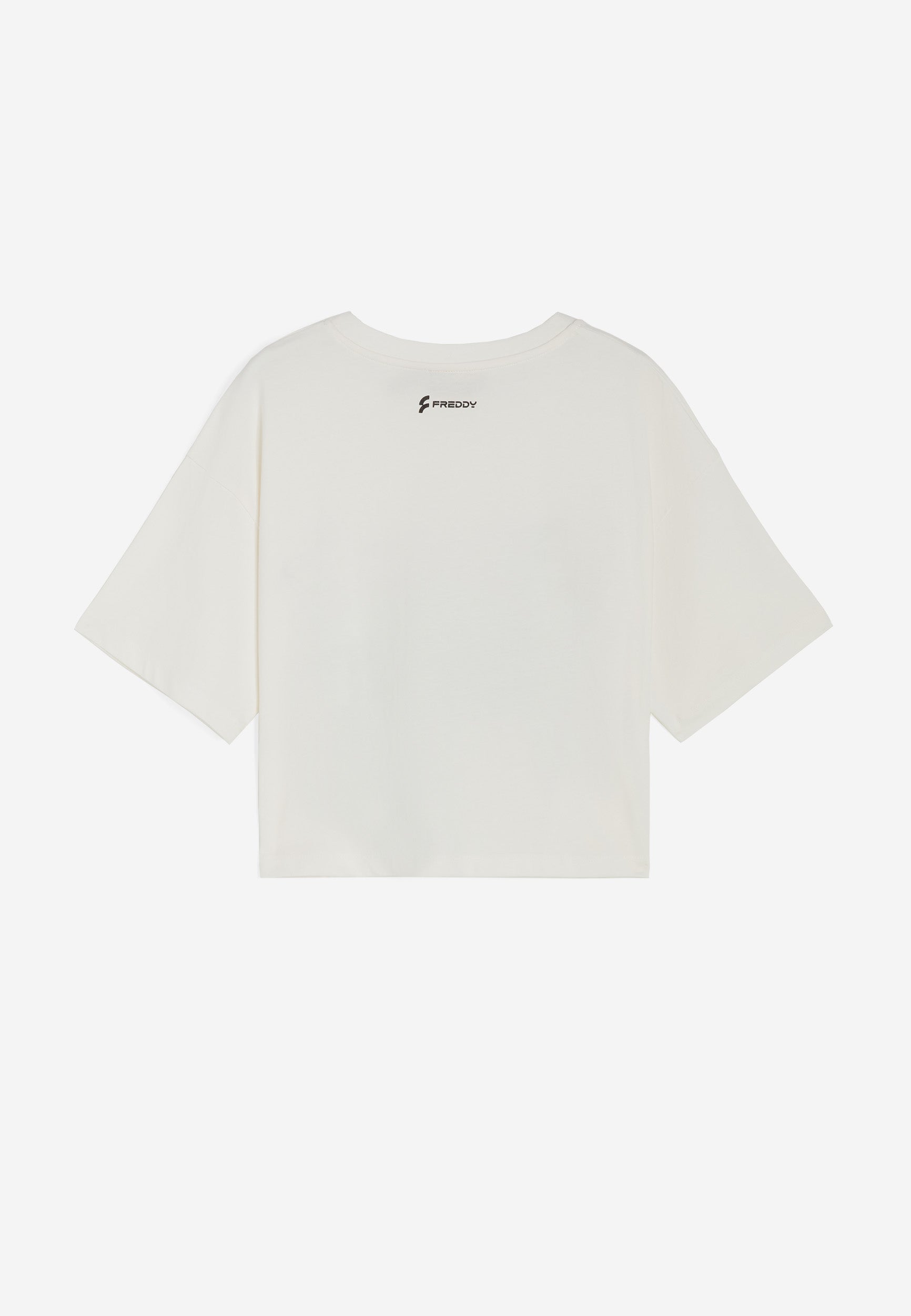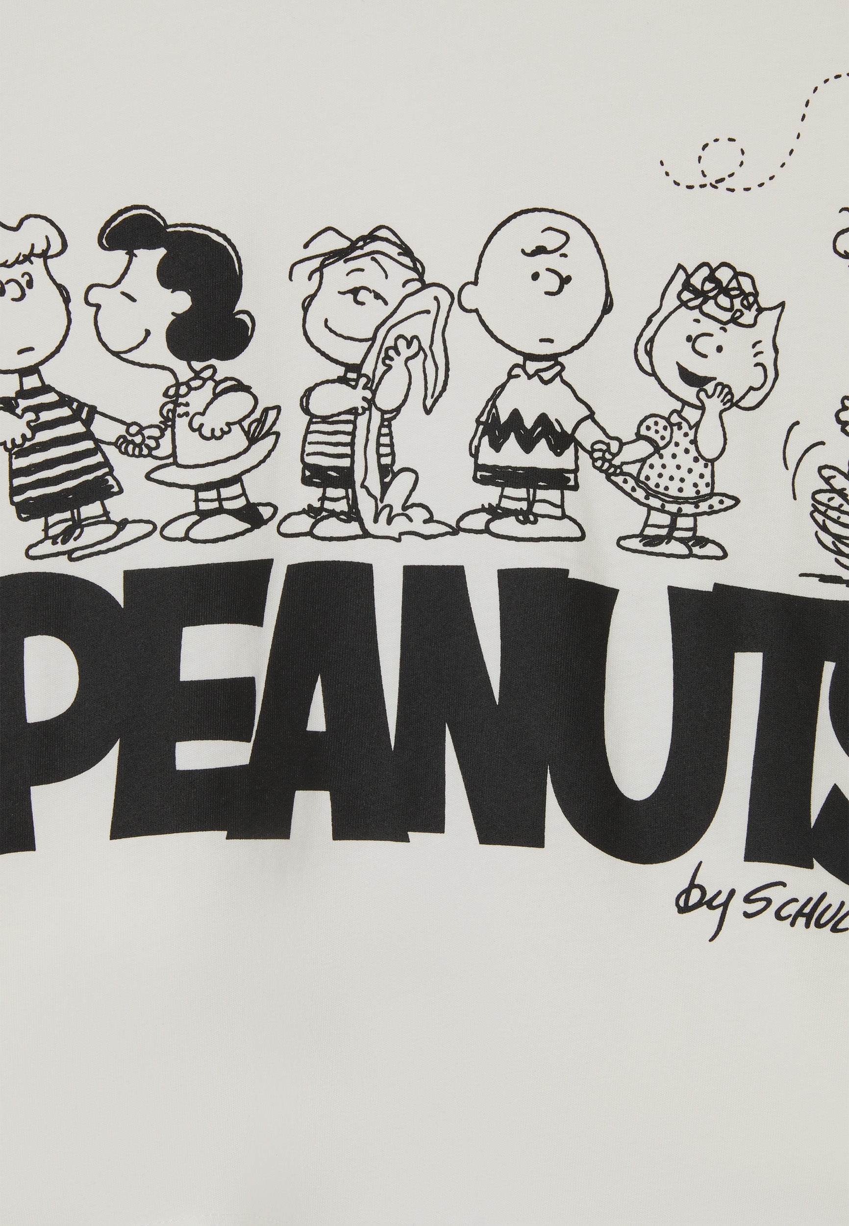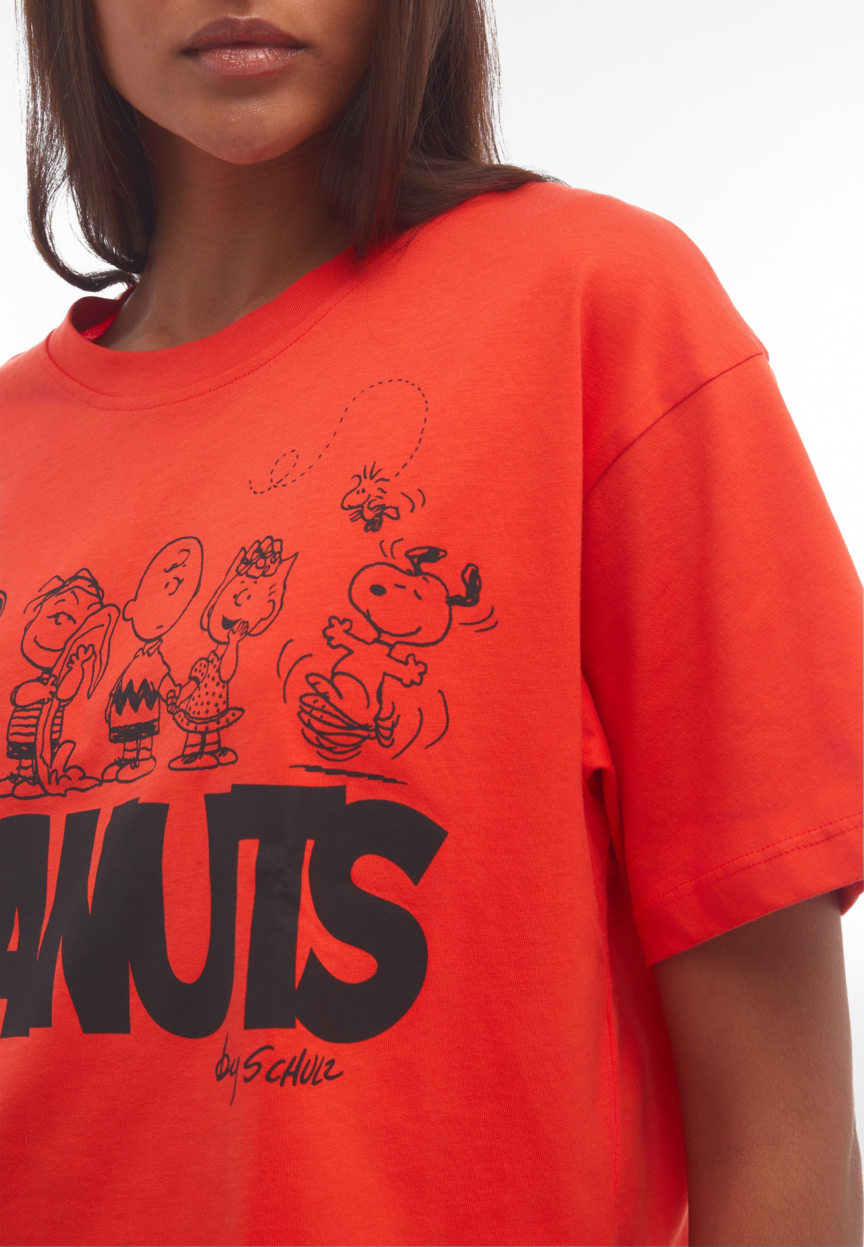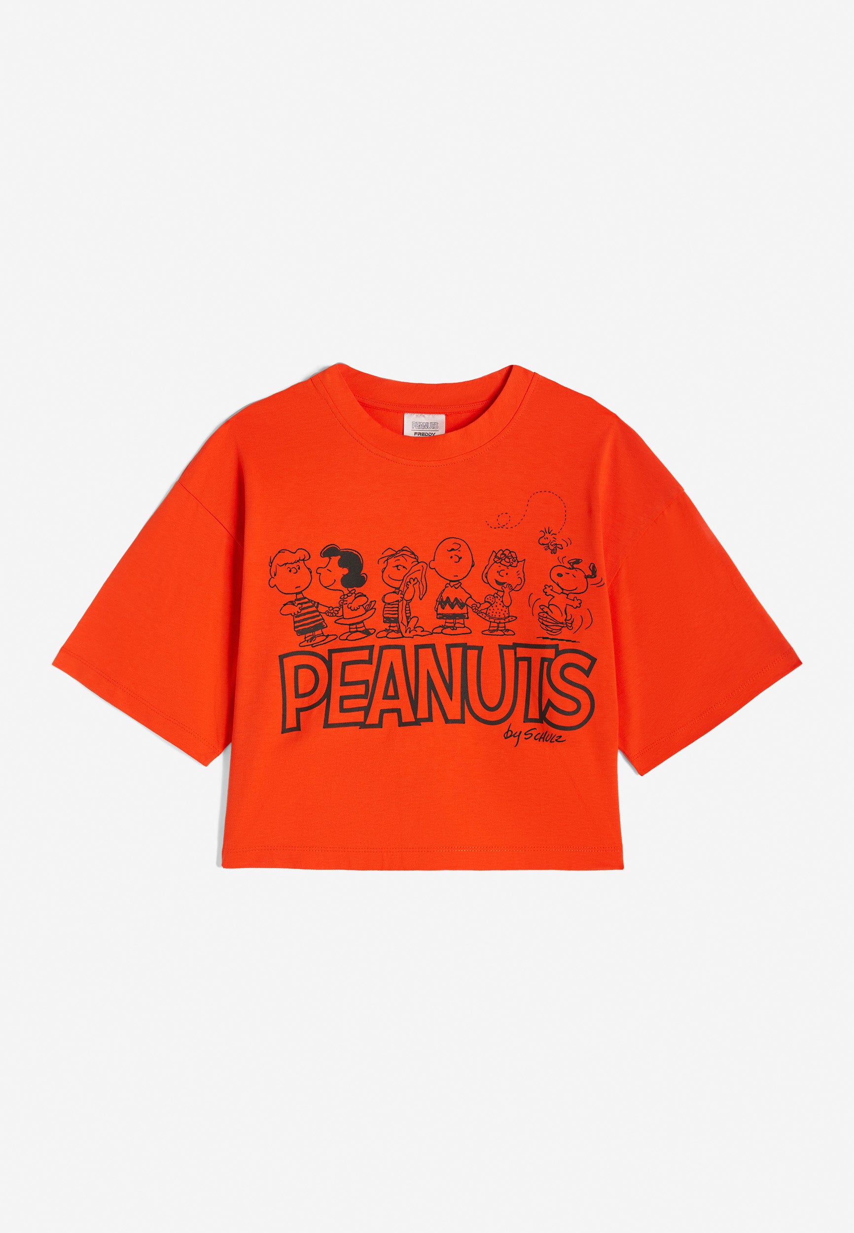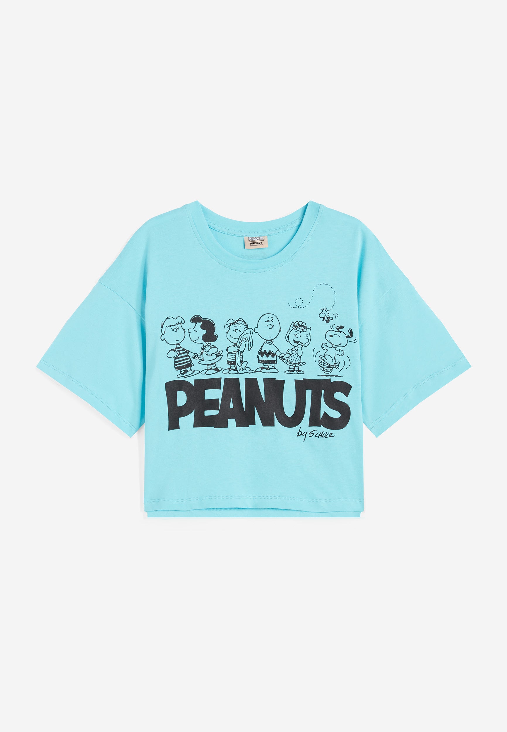 Esta camiseta de mujer tiene un corte oversize corto en la cintura para un look extremadamente actual y versátil al más puro estilo Y2K. El estampado de los protagonistas de Peanuts, el icónico cómic de Charles M. Schulz, le da un toque nostálgico y romántico.