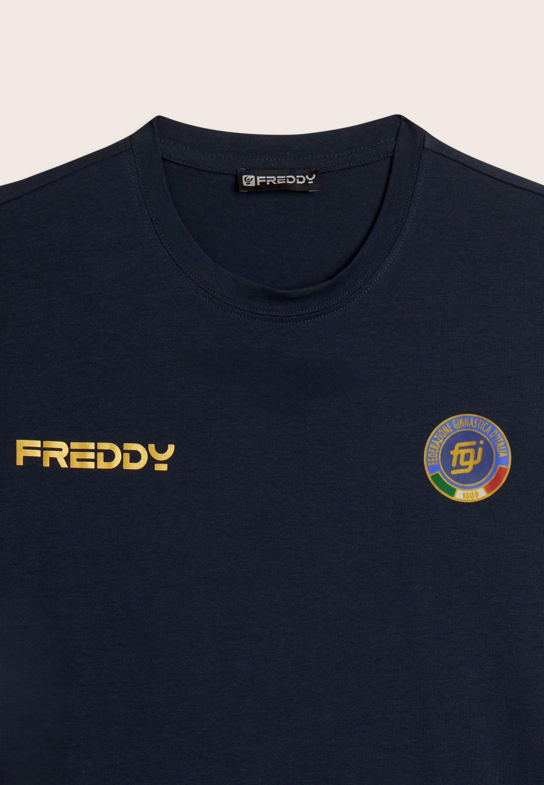 Entra a far parte della squadra nazionale con questa t-shirt blu replica ufficiale della Federazione Ginnastica d’Italia.