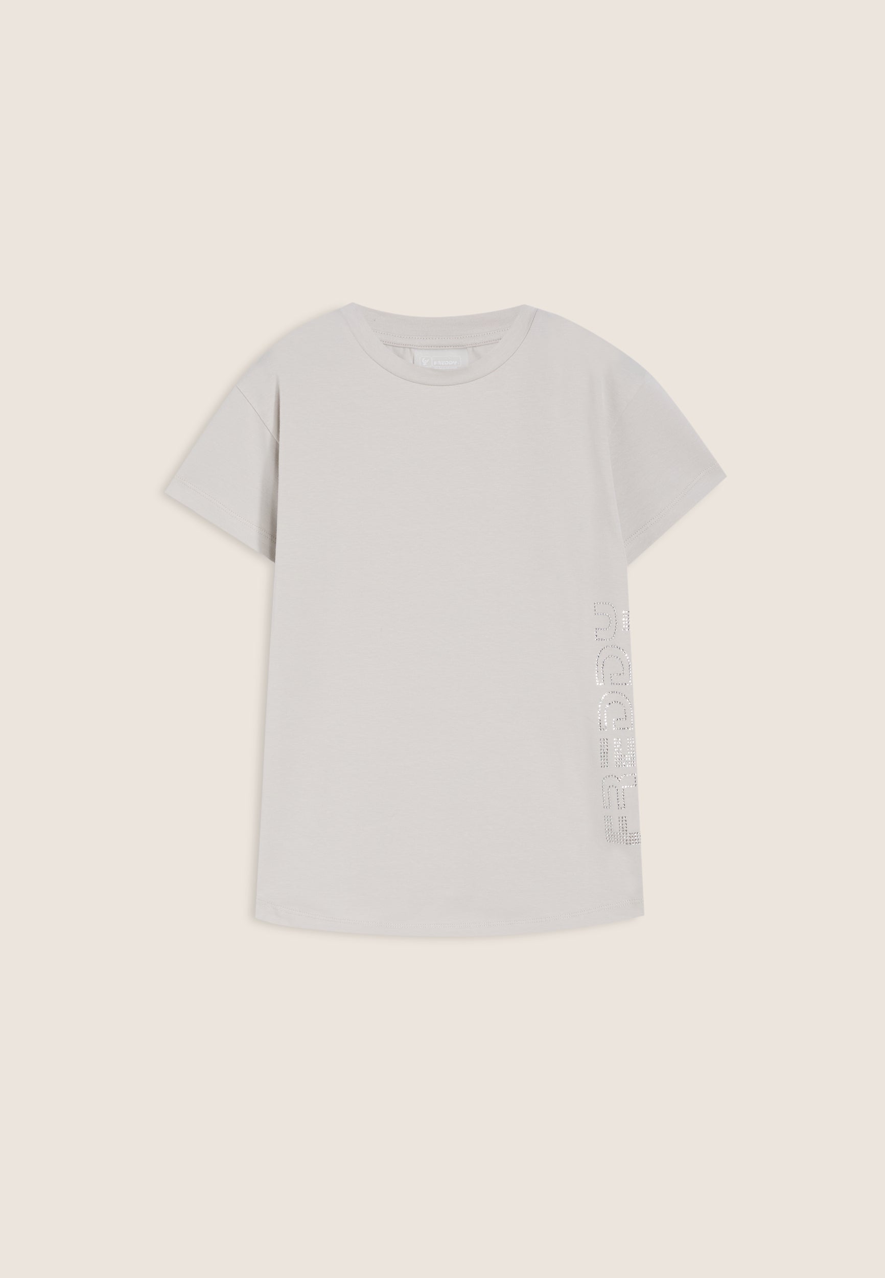Questa t-shirt da bambina in cotone elasticizzato con fit regolare è un capo essenziale arricchito da dettagli luminosi. Il design semplice e versatile presenta scollo girocollo, maniche corte e fondo dritto, perfetto per il quotidiano. Il tocco distintivo è il logo FREDDY composto da strass, posizionato in verticale sul fianco sinistro, che dona al capo un effetto brillante e moderno, perfetto per uno stile sportivo ma femminile.