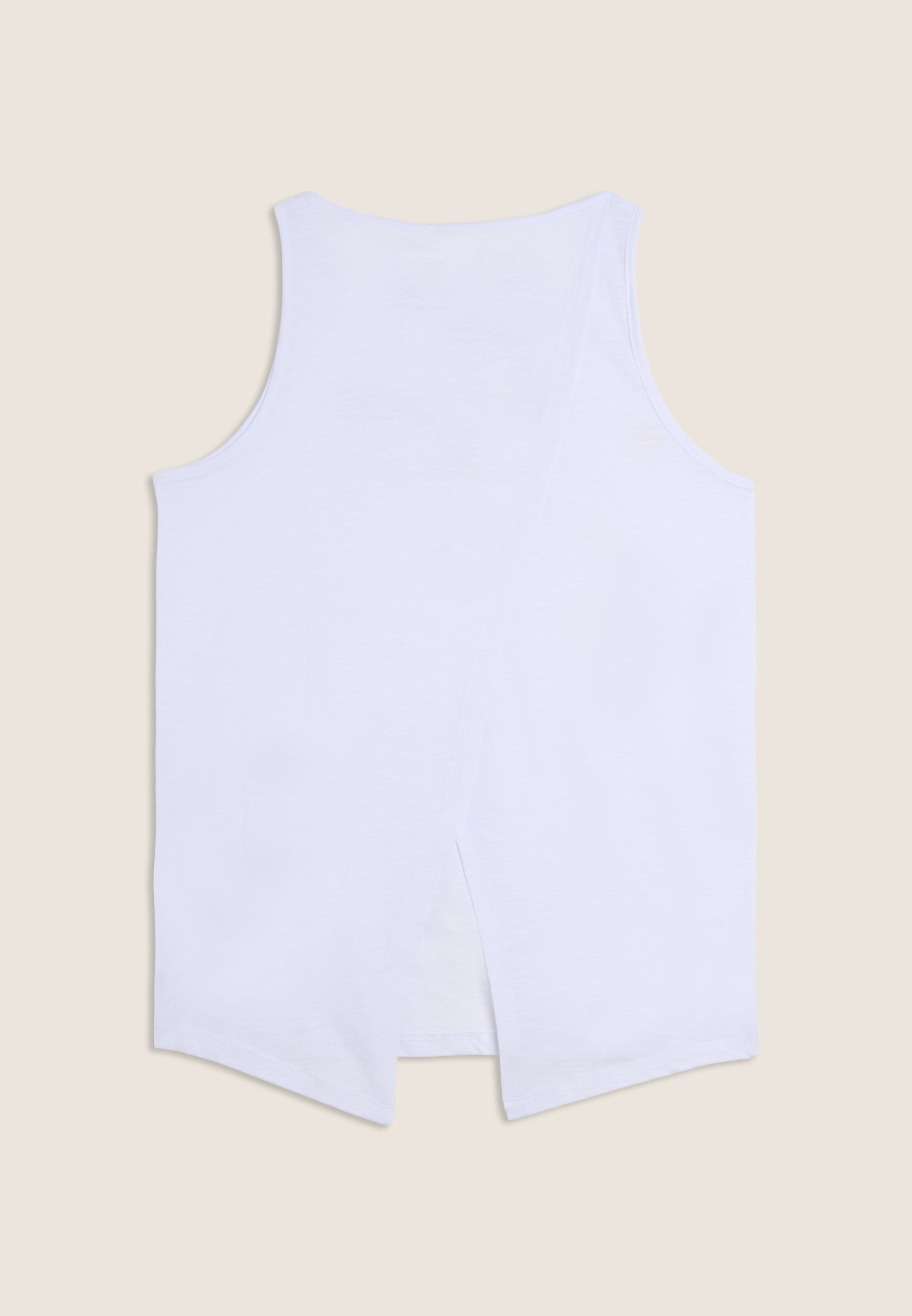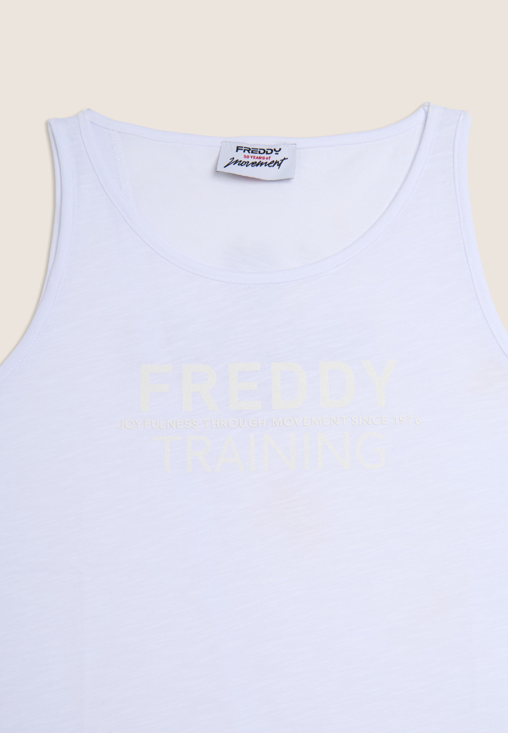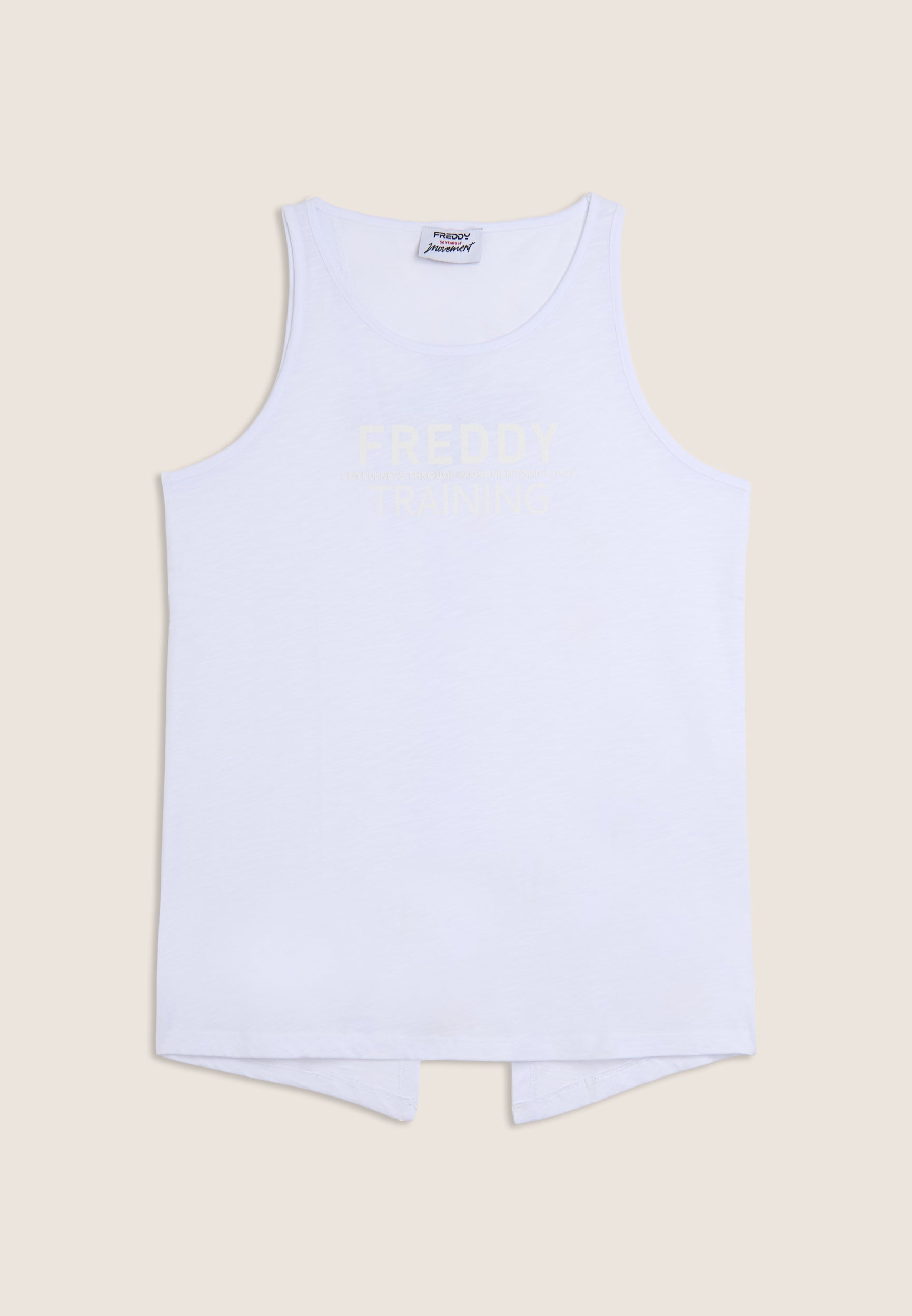 Camiseta sin mangas regular fit más corta por delante y abertura central en la espalda. El ligero tejido de punto flameado proporciona un efecto en melange muy actual. La parte delantera luce el gráfico «FREDDY TRAINING» en purpurina blanca para un aportar un look activo y brillante. Completan el diseño los tirantes anchos y el escote redondo.