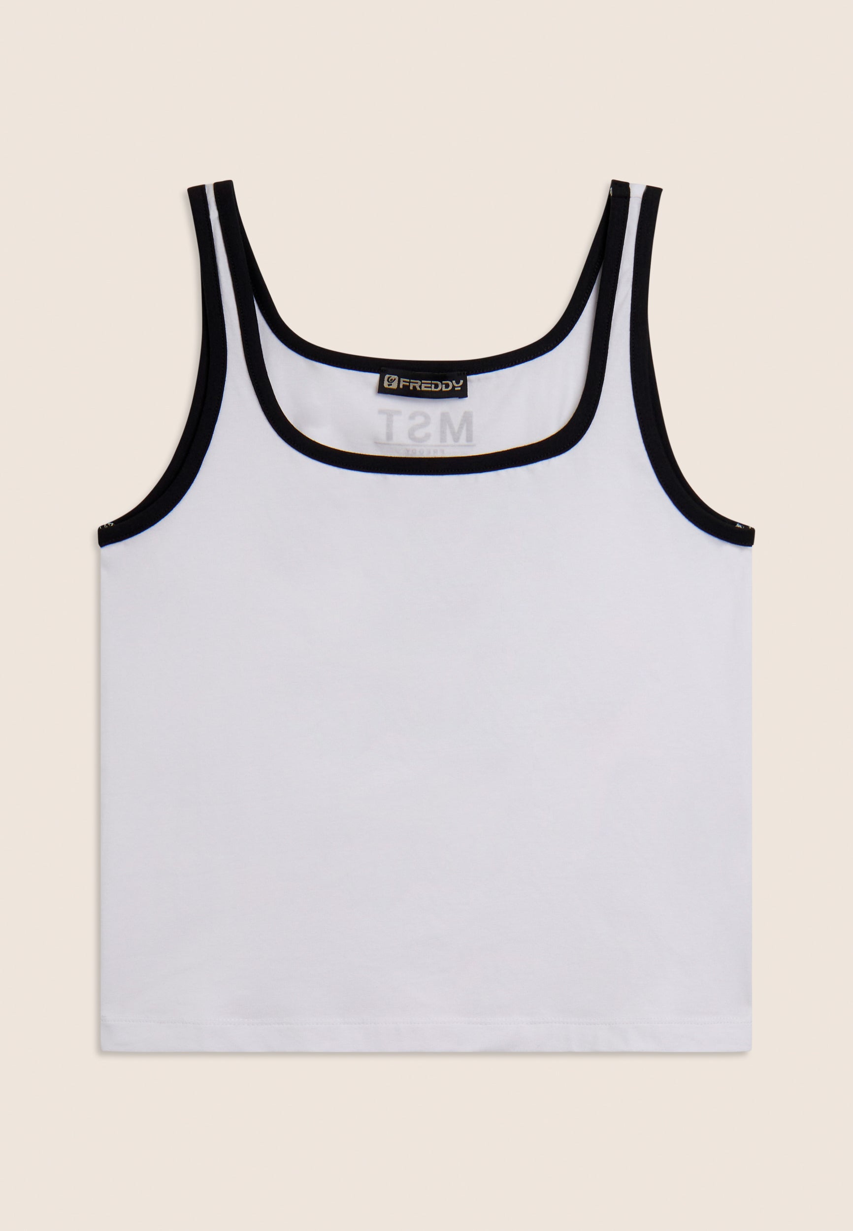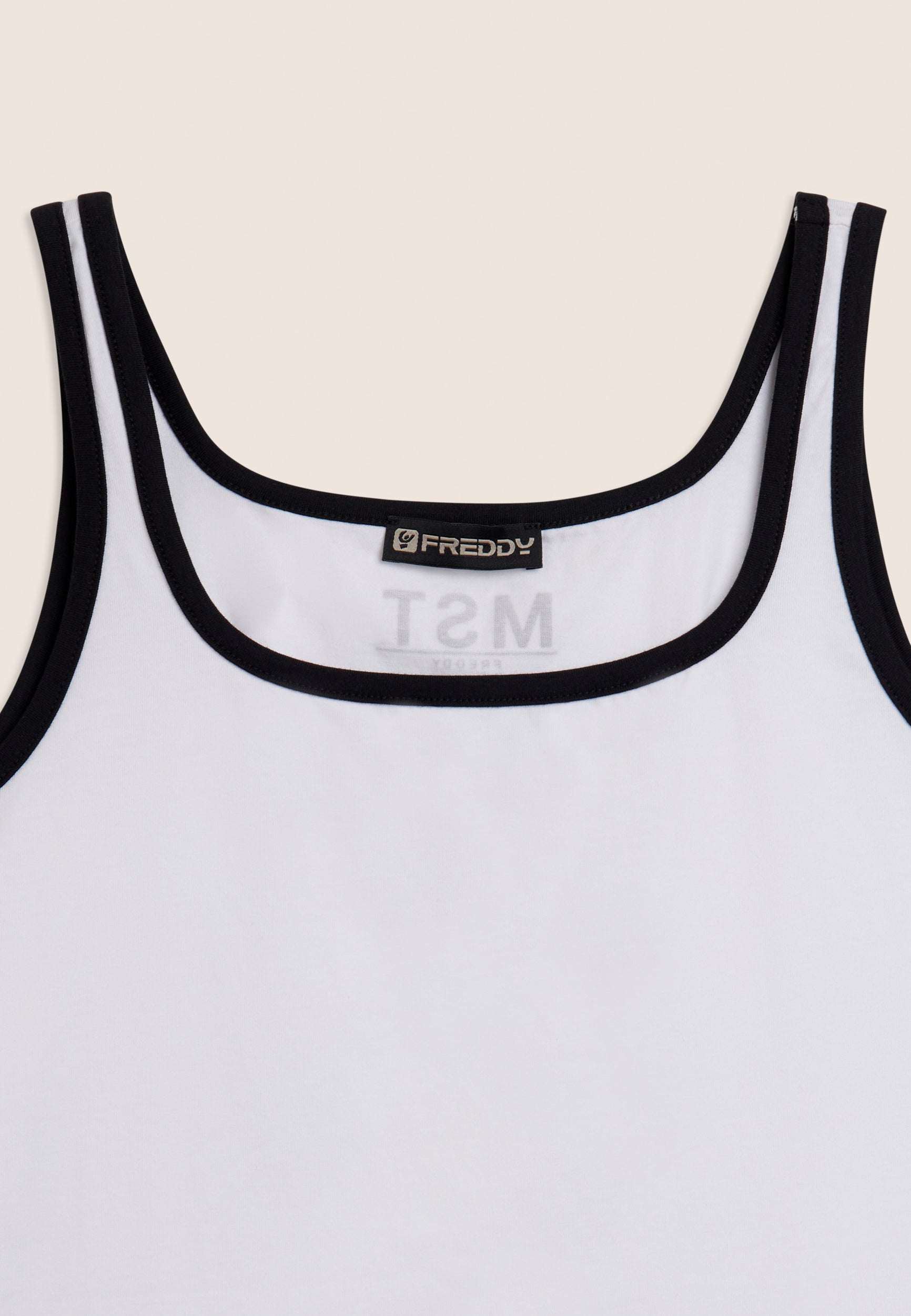 Canotta dal fit slim e dalla lunghezza regular, realizzata in jersey elasticizzato di cotone per garantire comfort e traspirabilità. Il fondo dritto e lo scollo leggermente squadrato creano una silhouette snella, mentre le spalline sottili completano il design elegante. Lo scollo e le spalline sono bordati in contrasto colore per un tocco di stile in più. La piccola stampa MST FREDDY sul petto aggiunge un dettaglio grafico sobrio e raffinato, rendendo questa canotta un capo versatile e moderno.