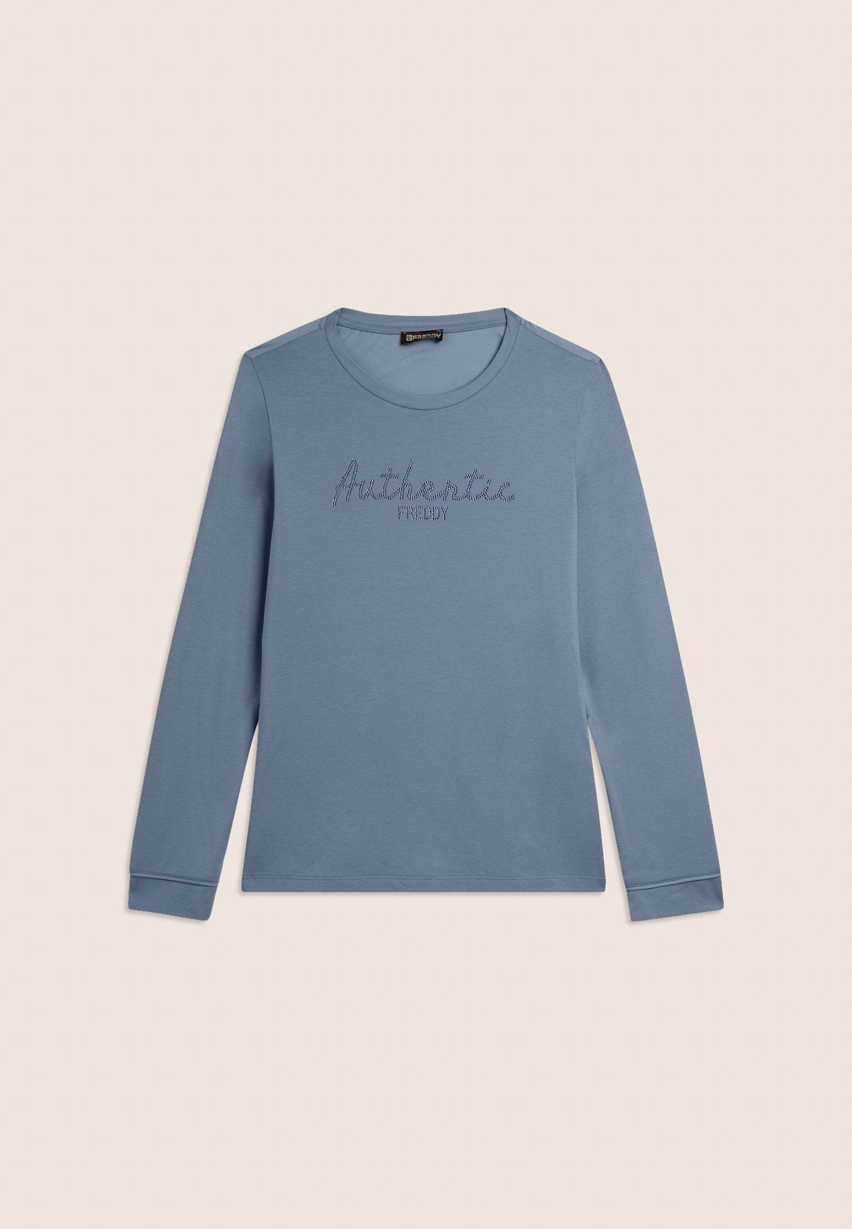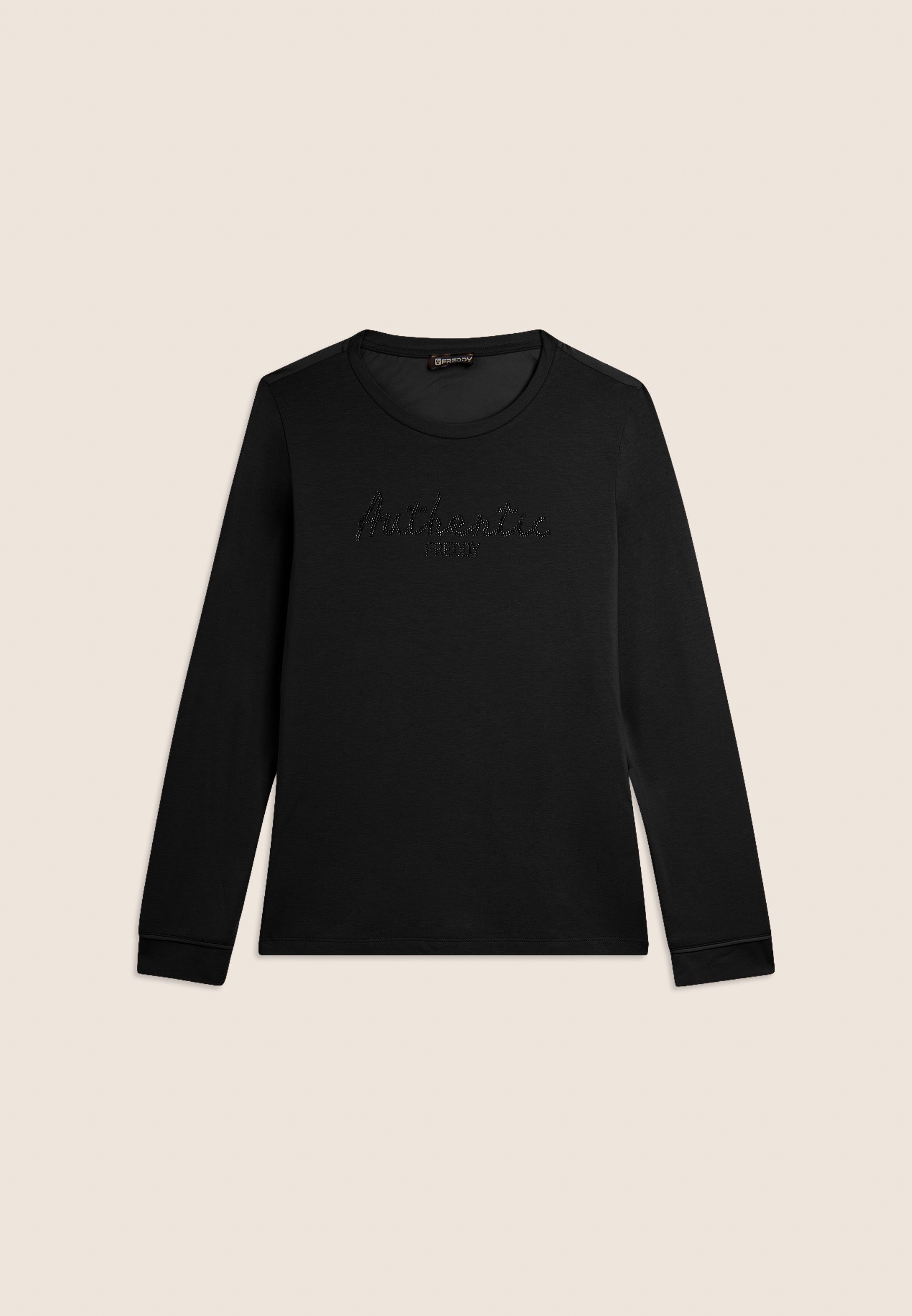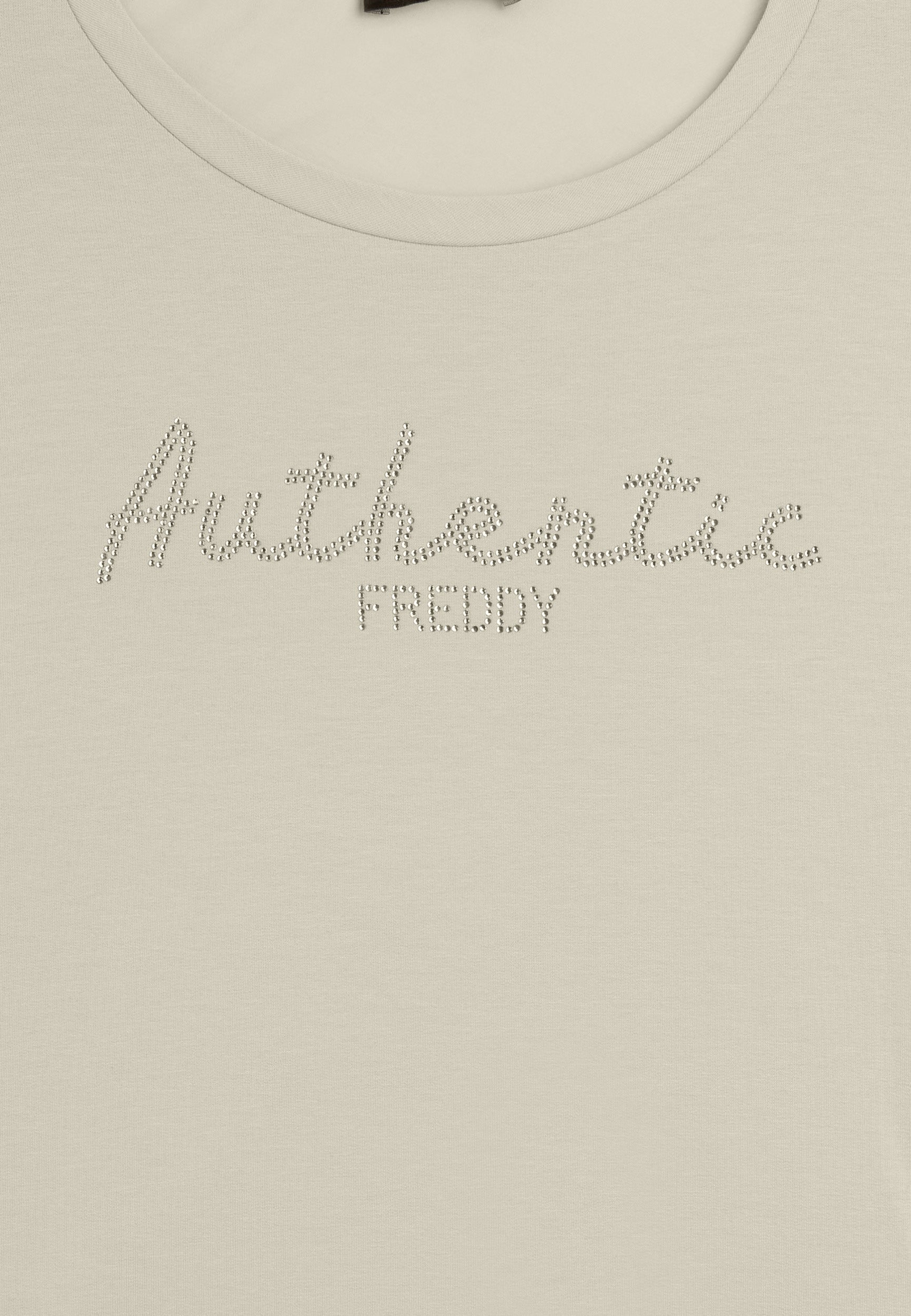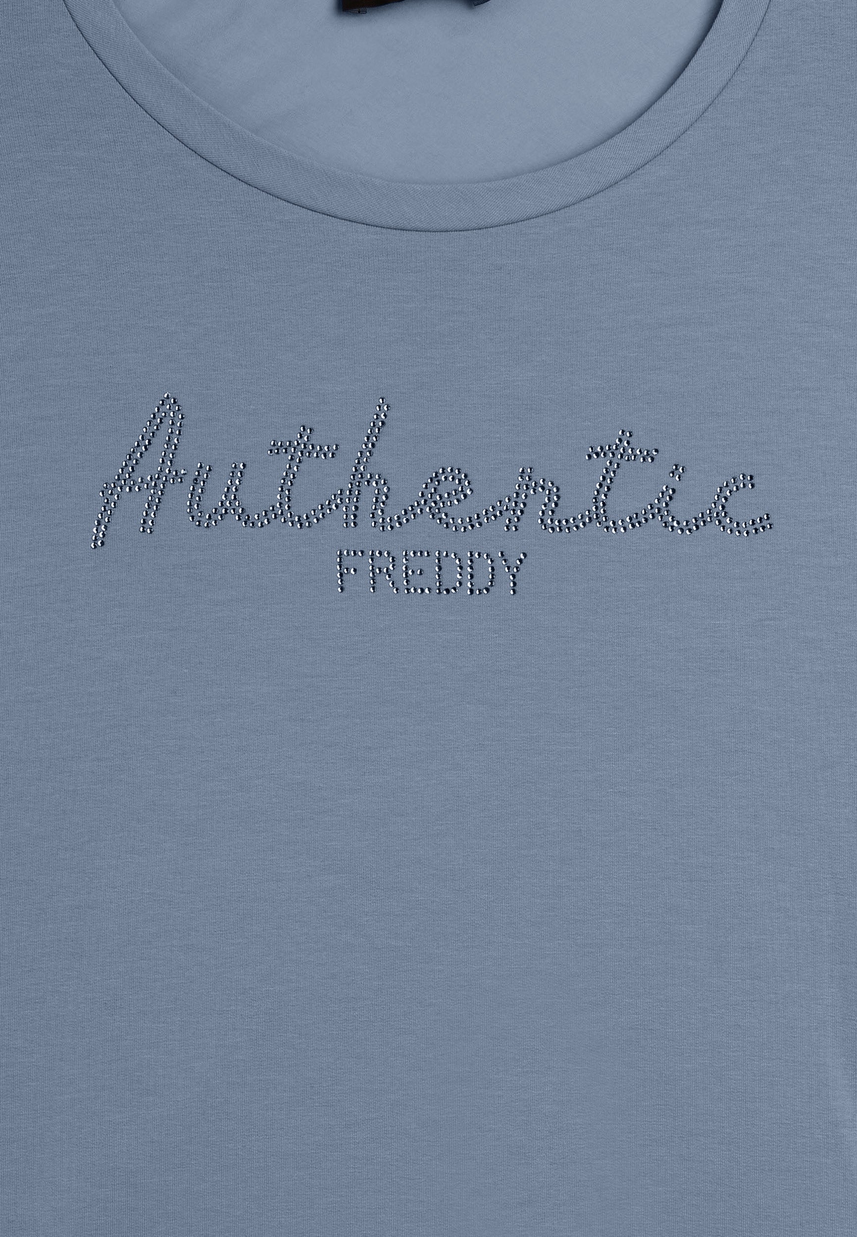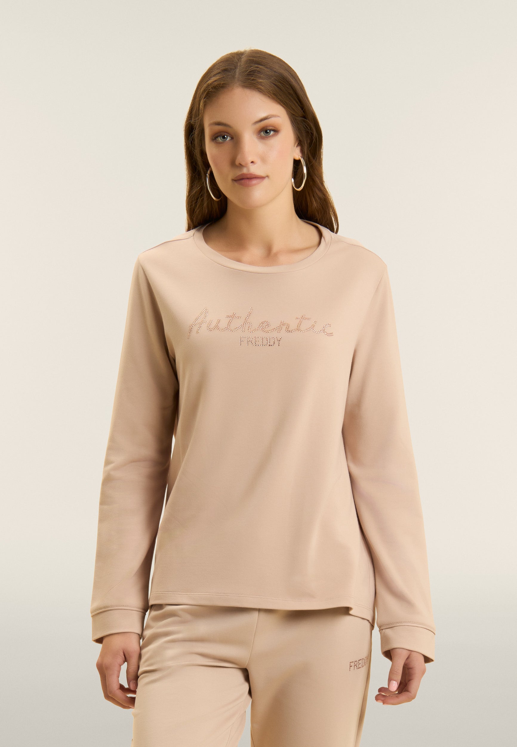 Felpa con vestibilità comfort e lunghezza regular, dal fondo leggermente svasato. Scollo girocollo e maniche con polsini. Il fronte è decorato dalla scritta "Authentic" con il logo FREDDY, entrambi realizzati con strass in tono colore, aggiungendo un tocco di eleganza e luminosità. Il tessuto French Terry, una combinazione di modal, cotone ed elastane, garantisce una vestibilità morbida e traspirante, ideale per un look sofisticato e casual.