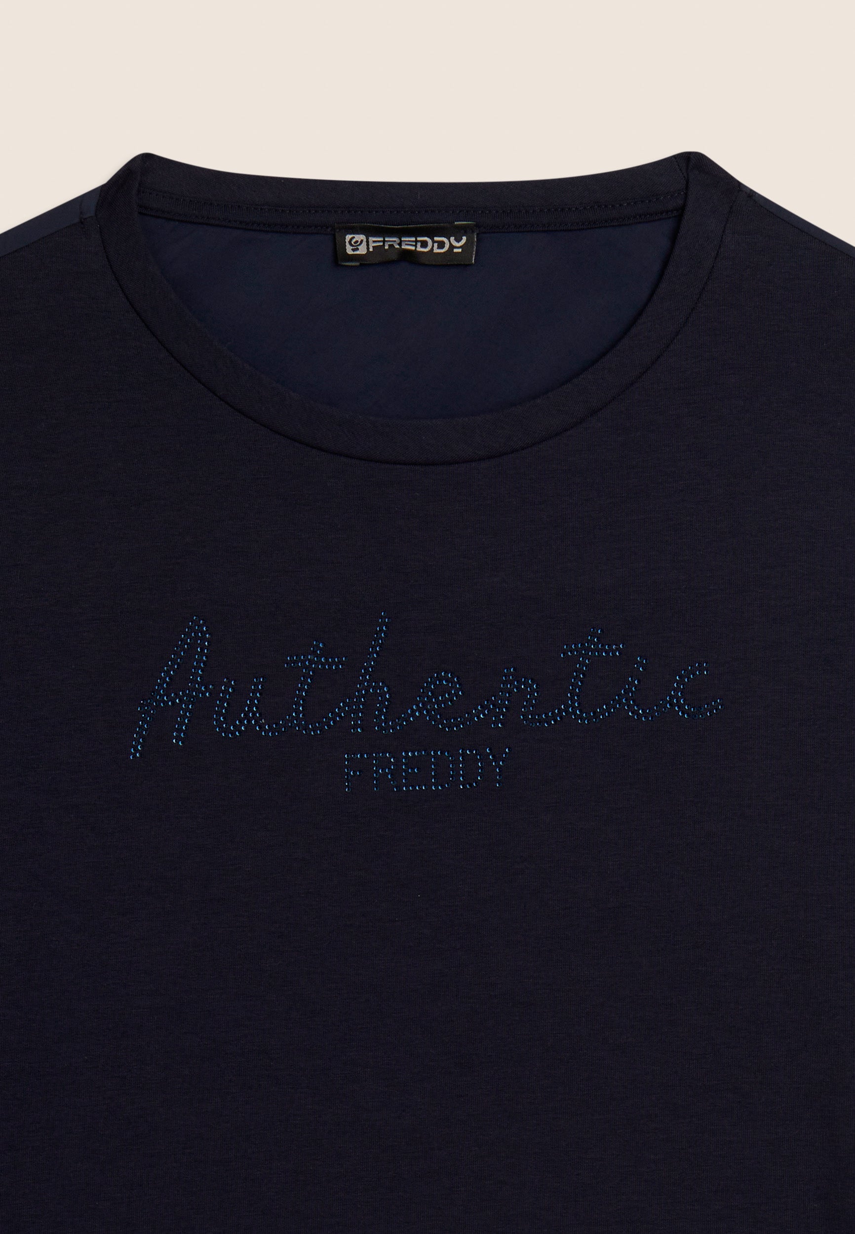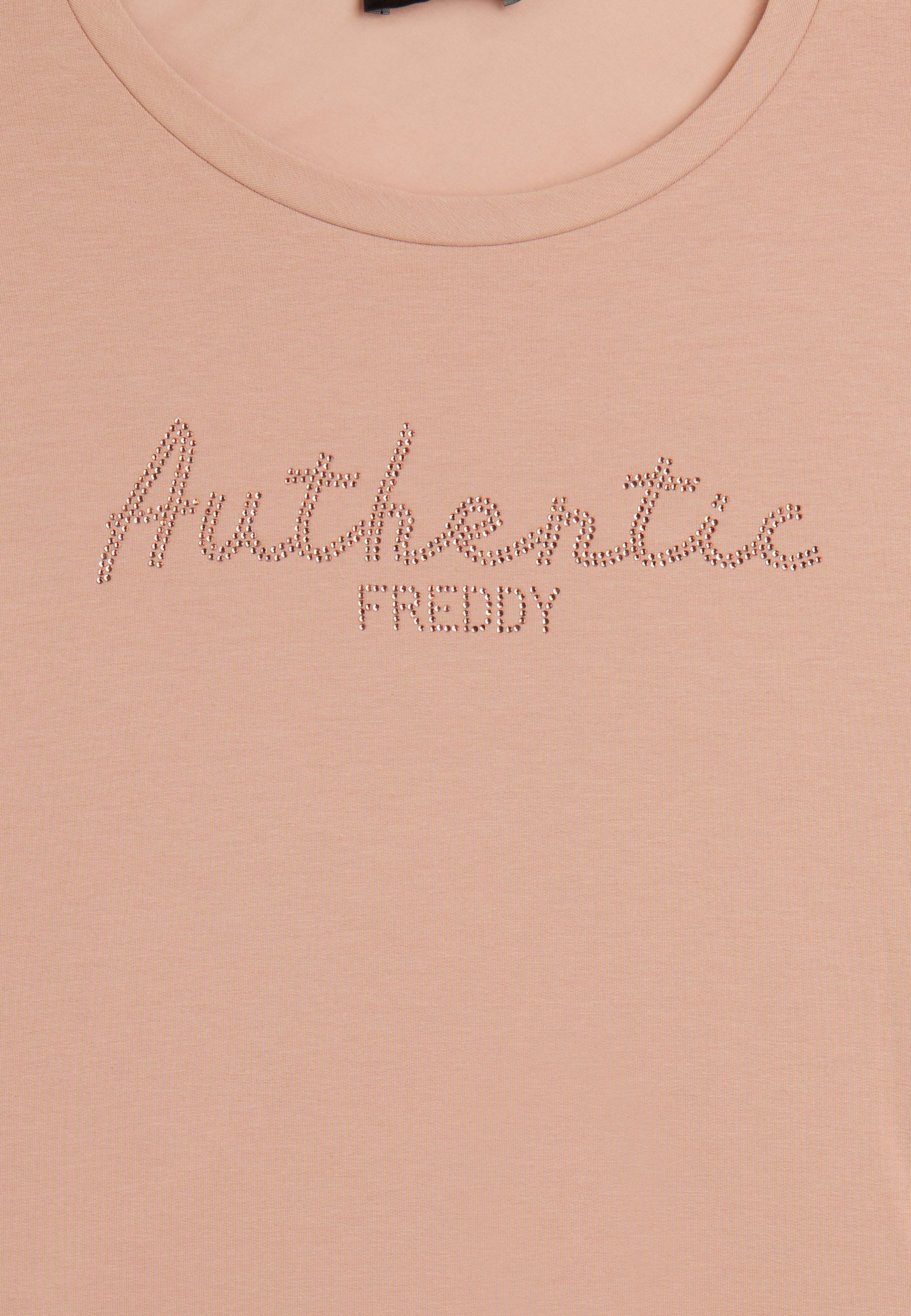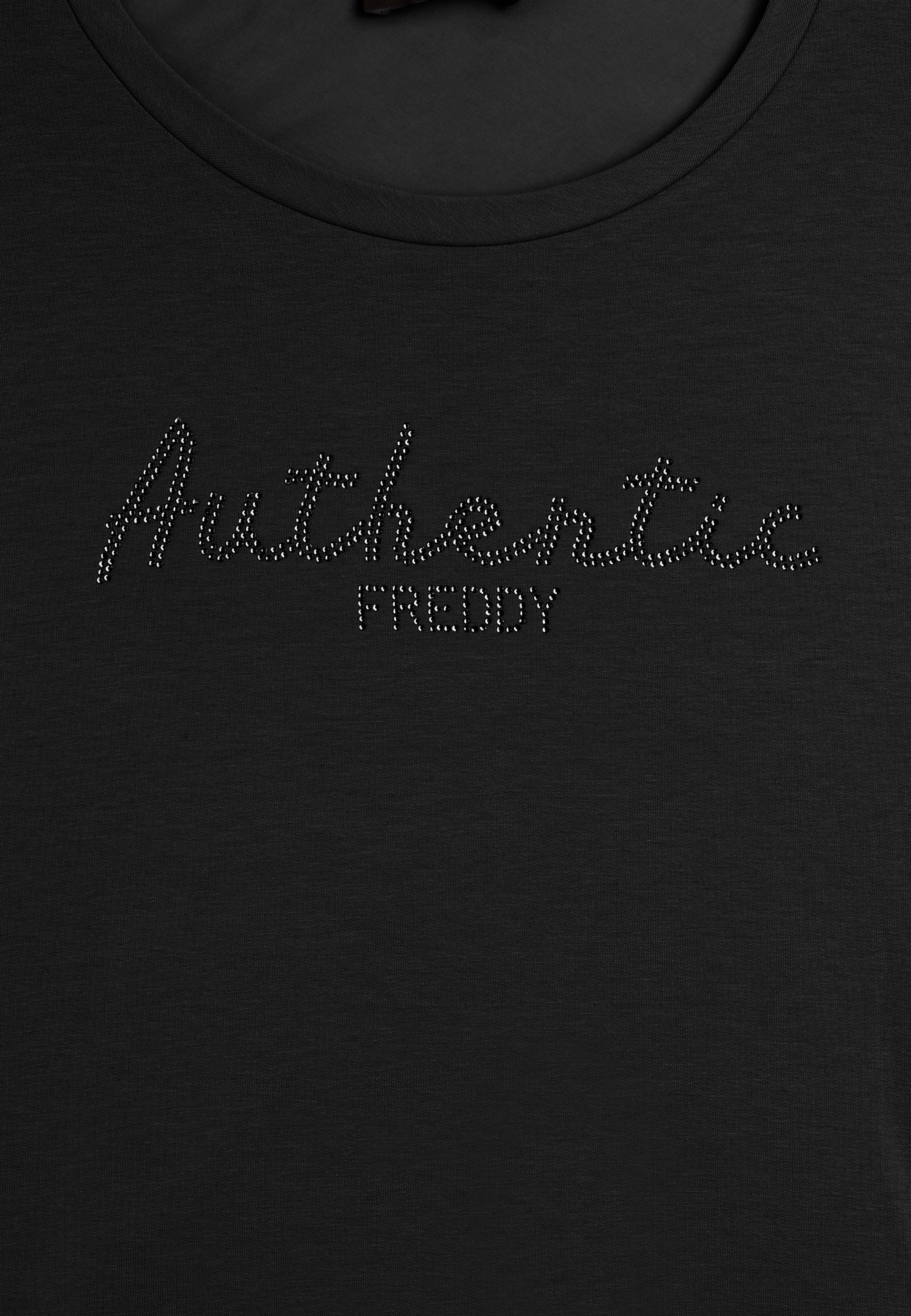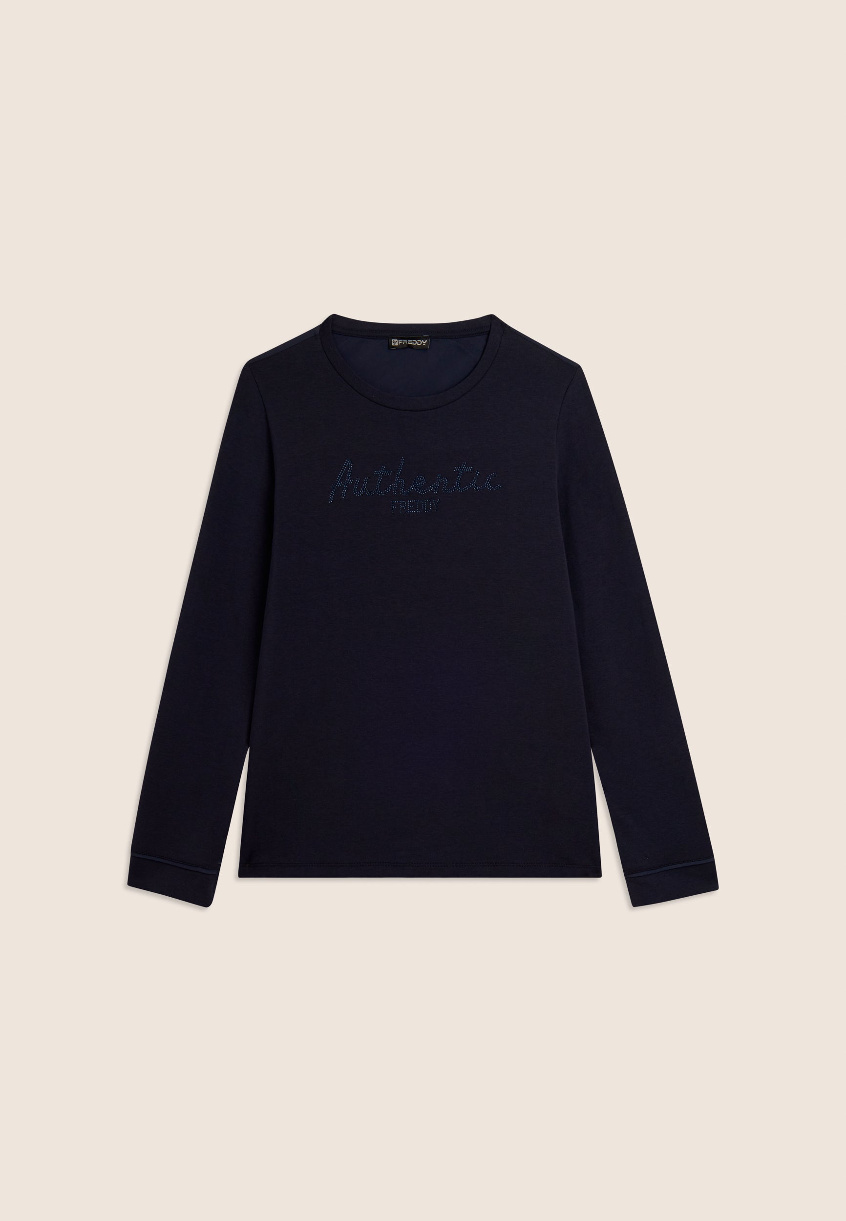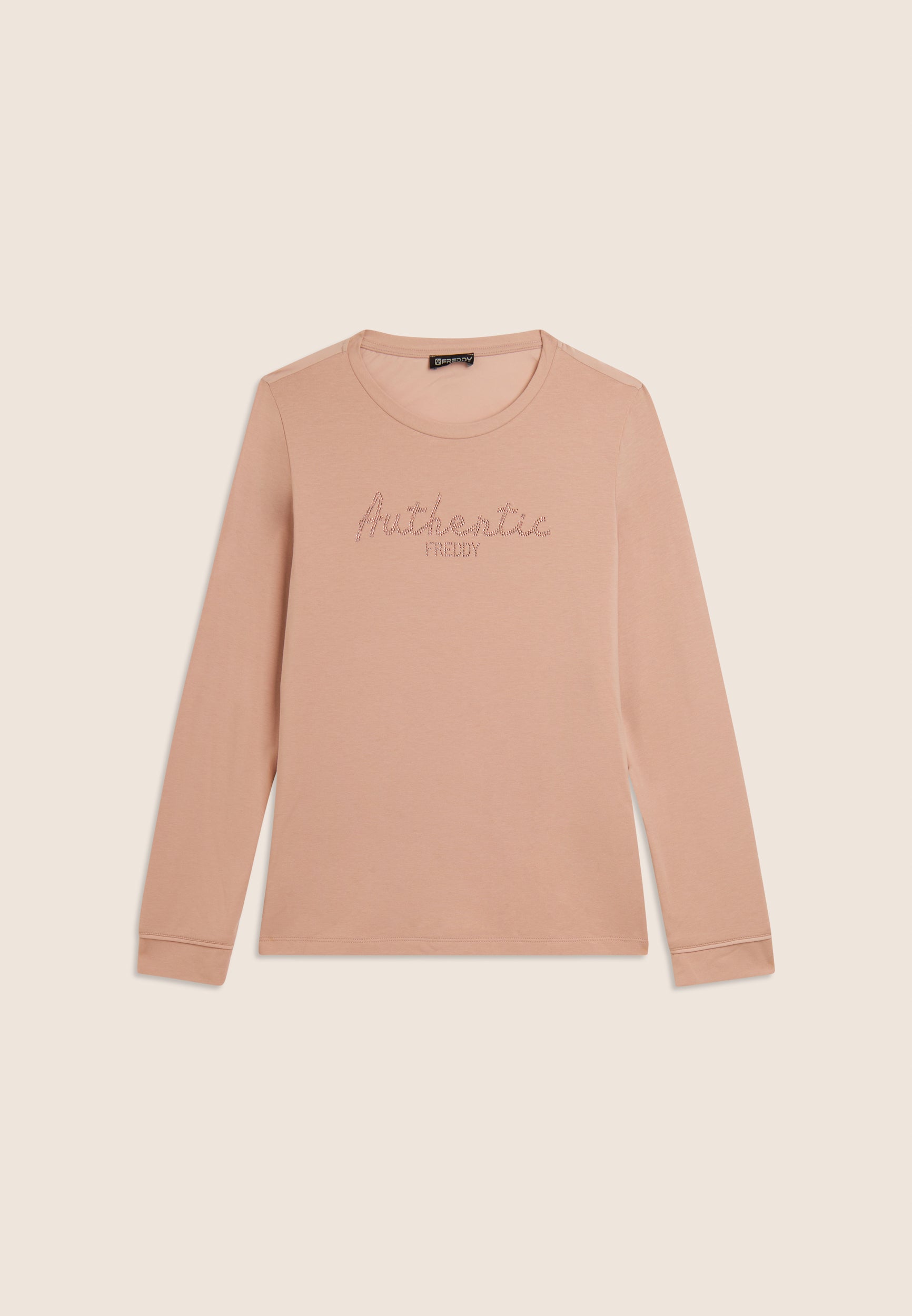 Felpa con vestibilità comfort e lunghezza regular, dal fondo leggermente svasato. Scollo girocollo e maniche con polsini. Il fronte è decorato dalla scritta "Authentic" con il logo FREDDY, entrambi realizzati con strass in tono colore, aggiungendo un tocco di eleganza e luminosità. Il tessuto French Terry, una combinazione di modal, cotone ed elastane, garantisce una vestibilità morbida e traspirante, ideale per un look sofisticato e casual.