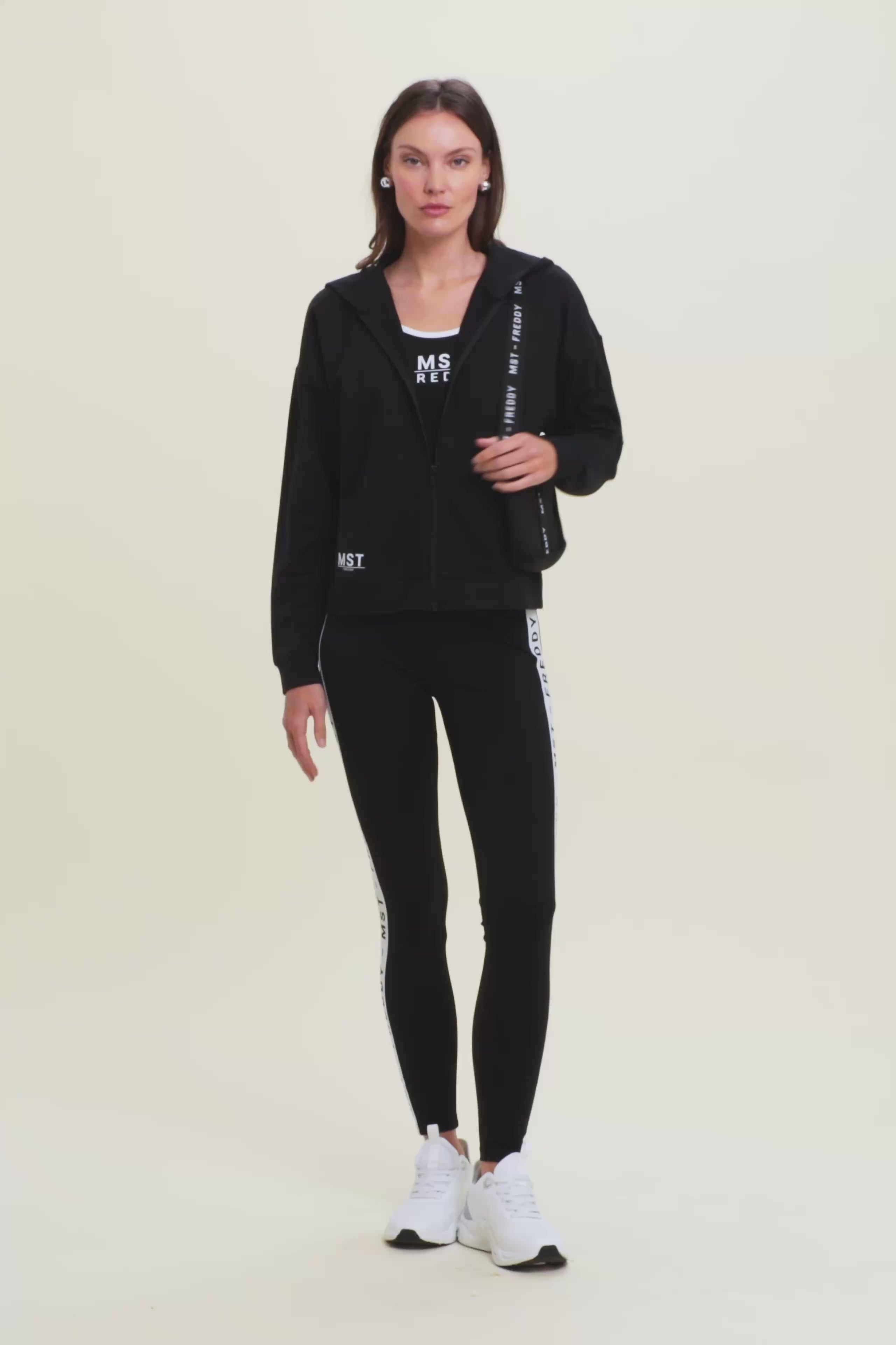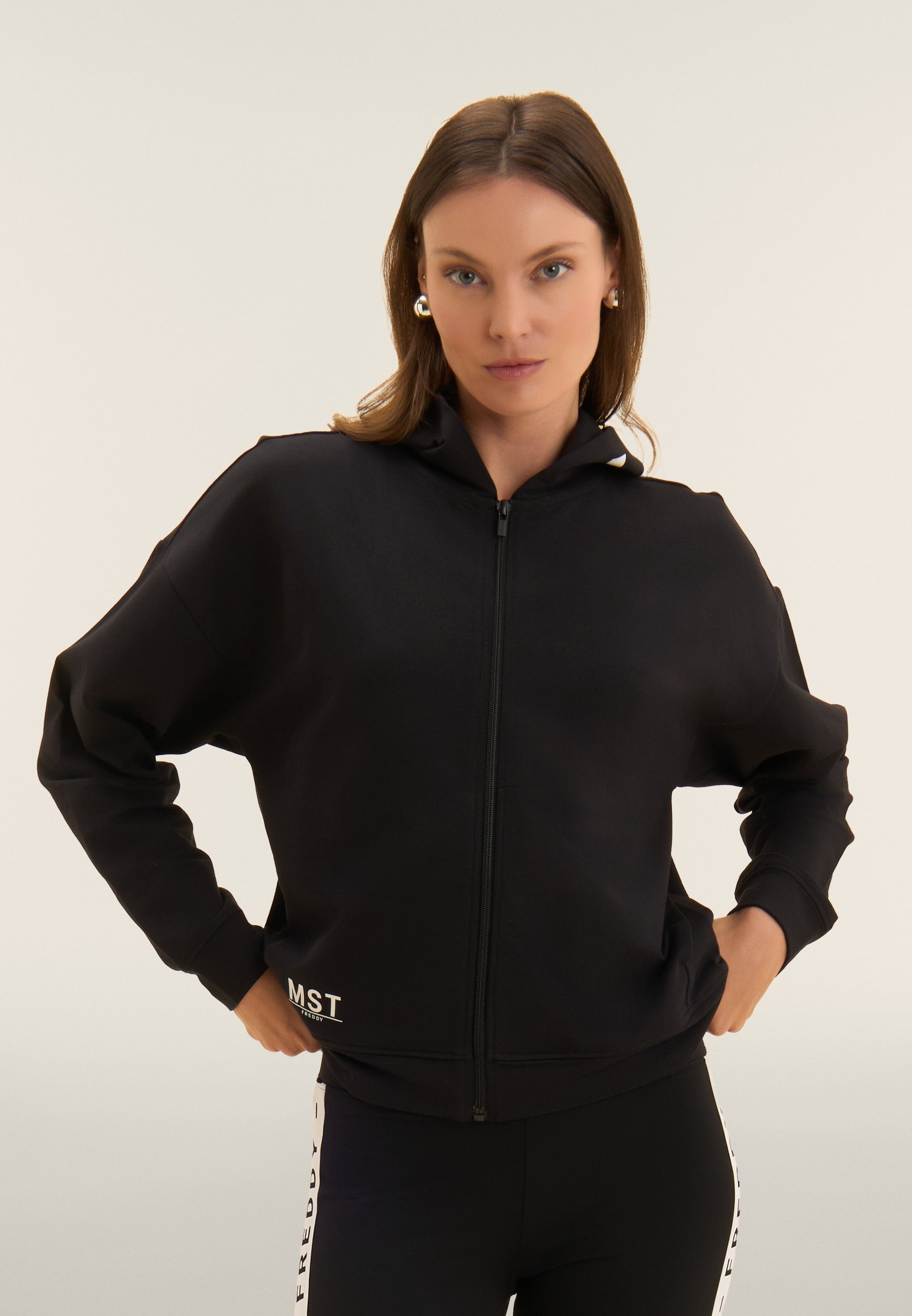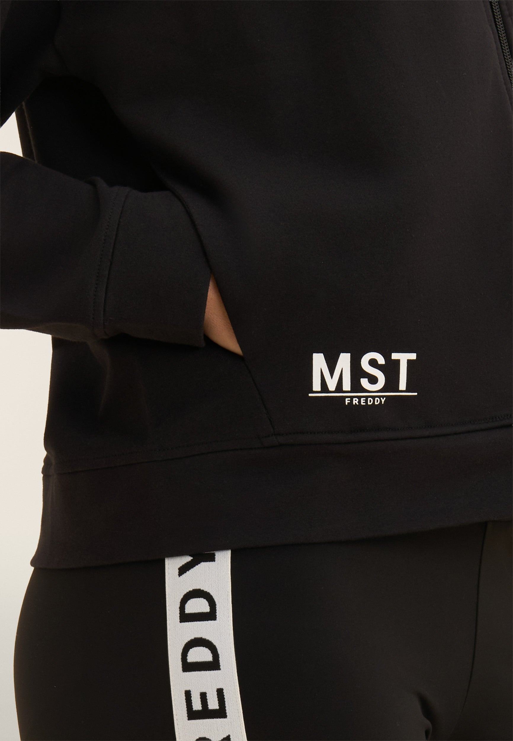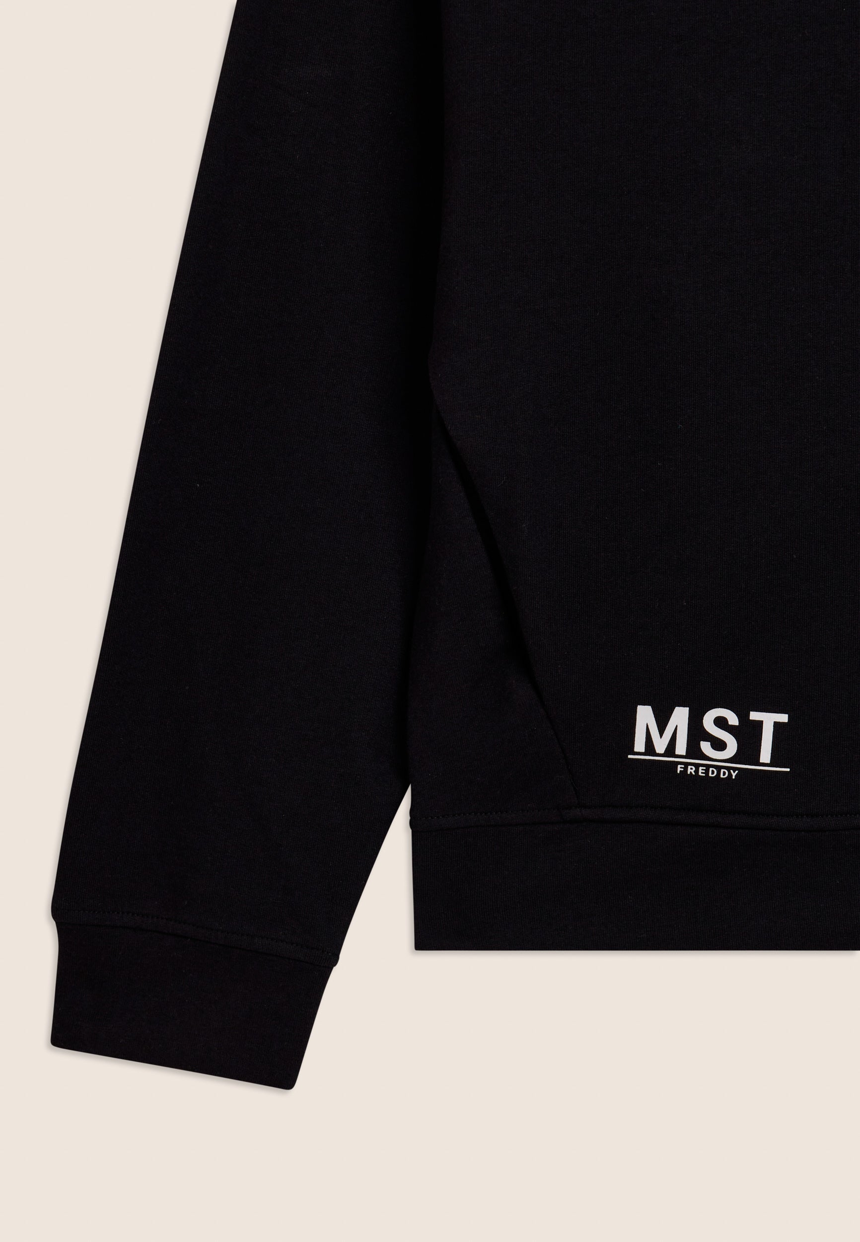 Felpa con cappuccio e zip, realizzata in french terry elasticizzato di cotone, che offre una vestibilità comfort e una lunghezza appena sopra i fianchi. La chiusura con zip e la fascia sul fondo creano un design pratico e versatile. Le maniche con spalla molto scesa e polsini garantiscono un comfort totale. La maxi stampa MST sul lato destro del cappuccio e la piccola stampa MST FREDDY sul fondo destro sono dettagli eleganti che arricchiscono il capo. Le tasche interne completano questa felpa dal design pulito e funzionale.