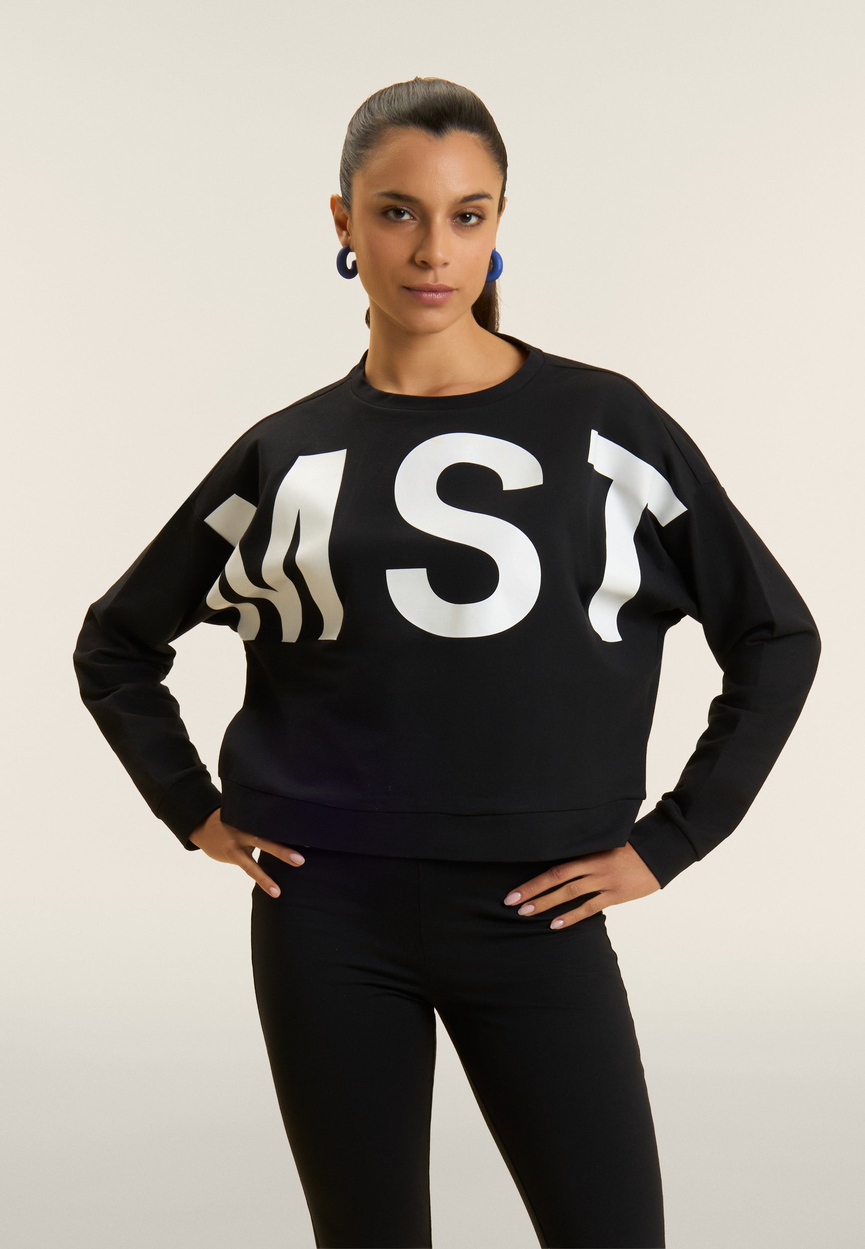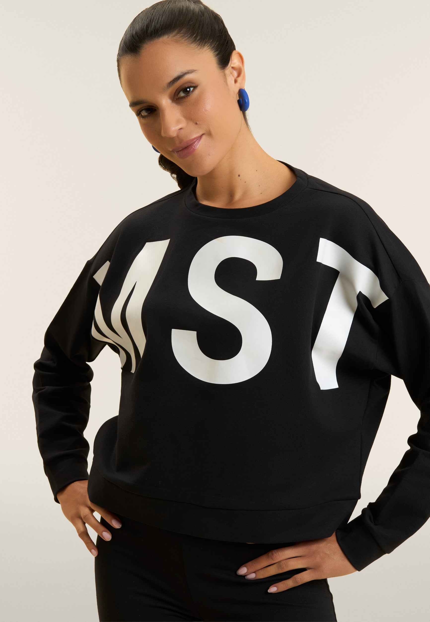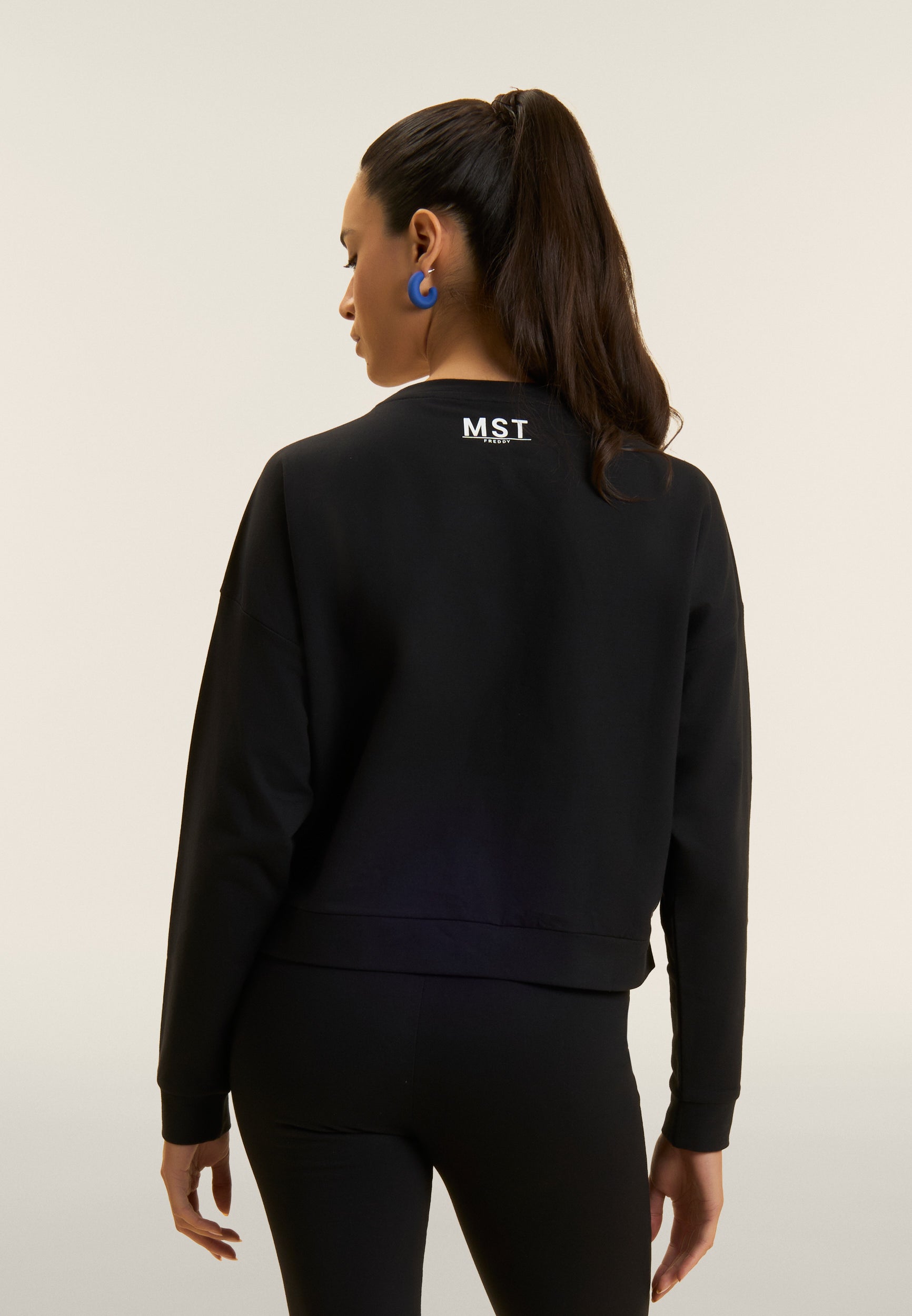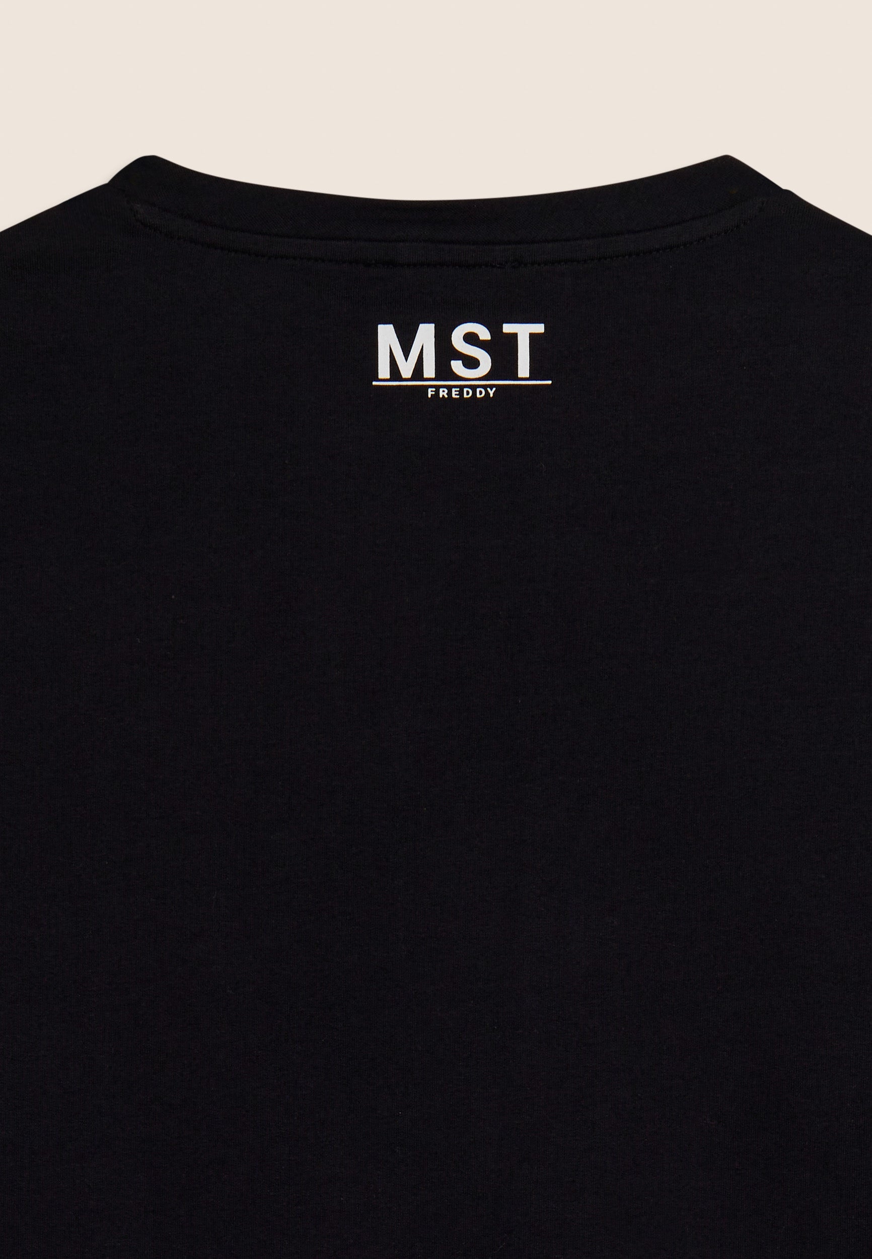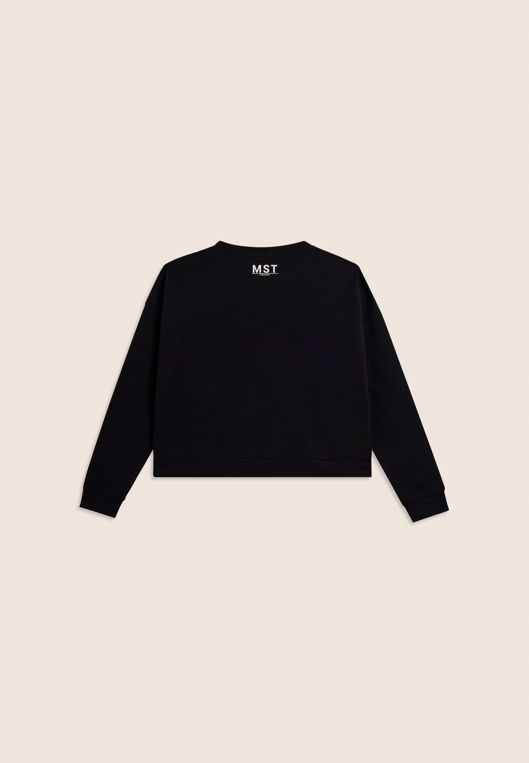 Felpa dal design minimalista e funzionale, realizzata in french terry elasticizzato di cotone, che offre una vestibilità comfort e una lunghezza appena sopra i fianchi. Il fondo è rifinito da una fascia, mentre lo scollo girocollo e le maniche con spalla molto scesa e polsini creano una silhouette rilassata. La maxi stampa MST sul fronte aggiunge un tocco deciso di stile, mentre la piccola stampa MST FREDDY sotto lo scollo posteriore completa il capo con un dettaglio elegante e discreto. Un capo che unisce comfort e raffinatezza.