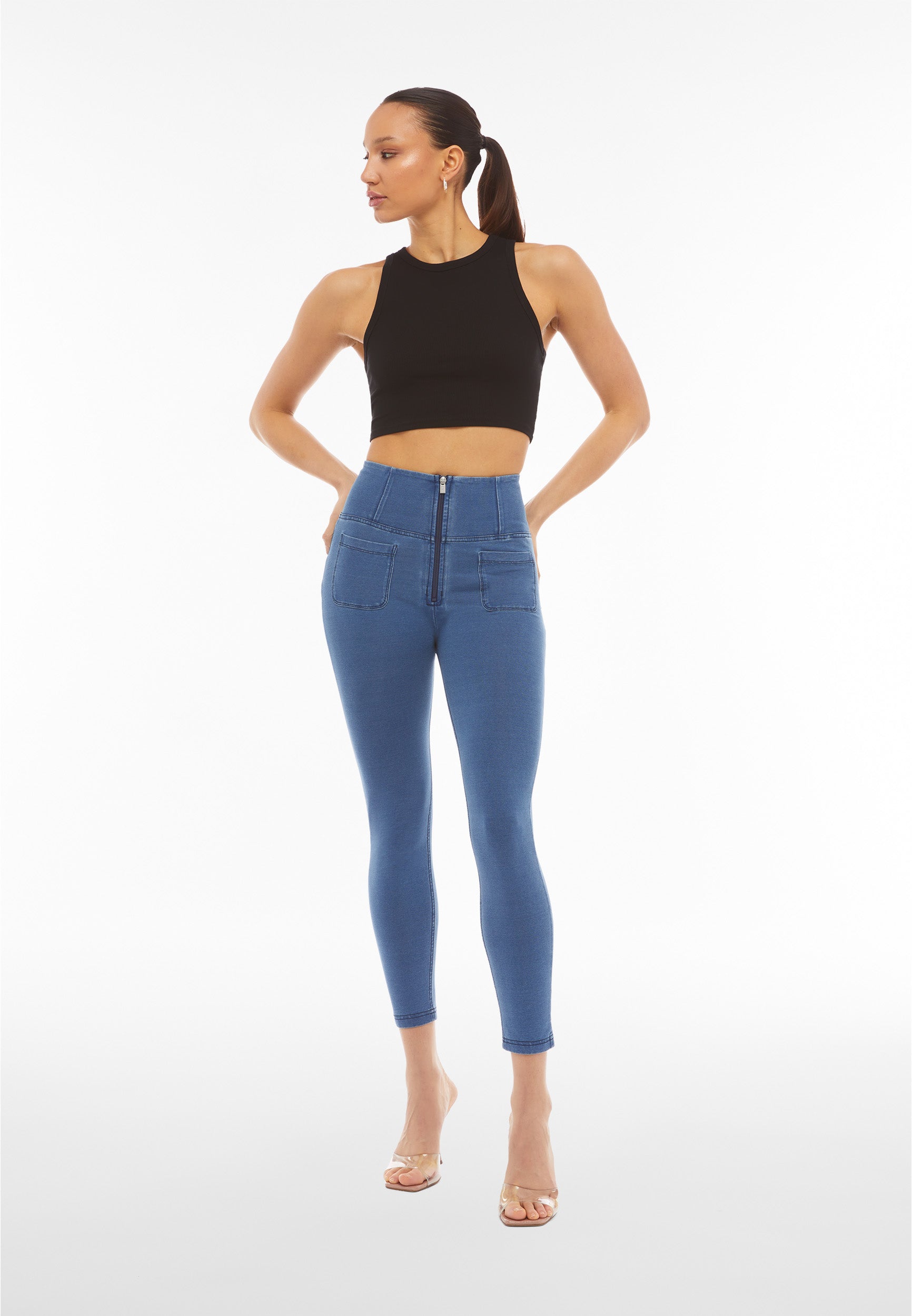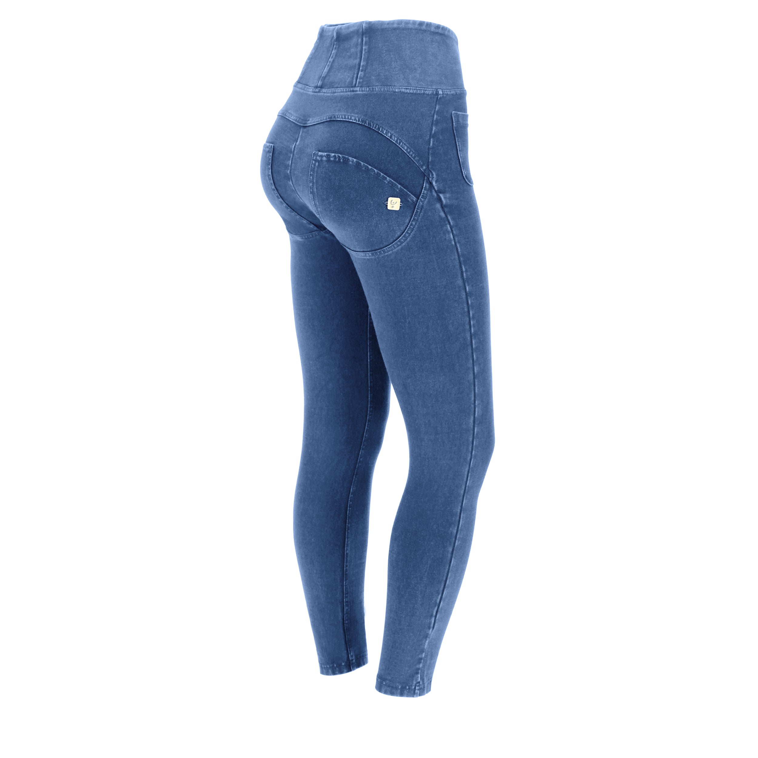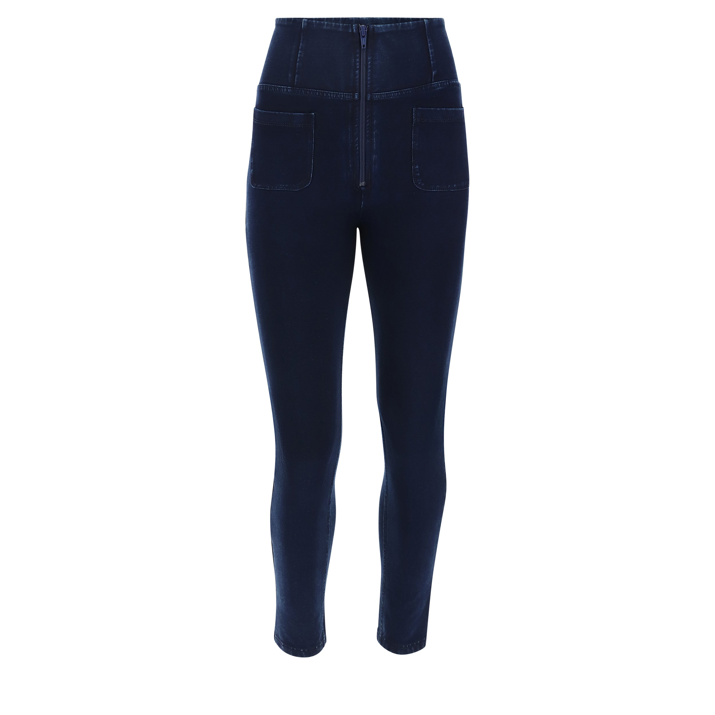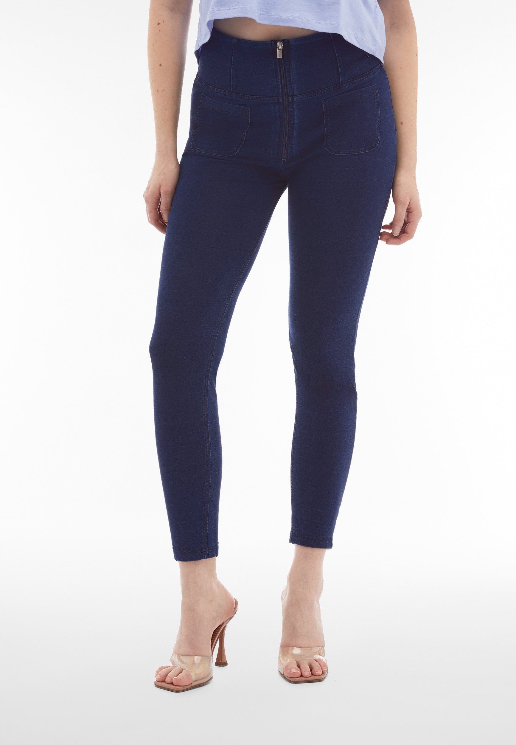Pantalón push up con pequeños bolsillos frontales de plastrón de la línea WR.UP® en tejido de punto efecto denim elaborado con algodón orgánico y elastano reciclado, perfecto para resaltar tu feminidad en cualquier momento del día sin renunciar a la libertad de movimiento. El modelo presenta cintura super alta cerrada con cremallera frontal que esculpe el talle, largo 7/8 tobillero y ajuste superskinny para ceñir al máximo las formas del cuerpo, enfatizadas aún más por el agradable efecto shaping de la innovadora tecnología WR.UP® patentada por Freddy que mejora la silueta y da un agradable efecto moldeador y push up gracias a un sistema especial de inserciones y costuras.