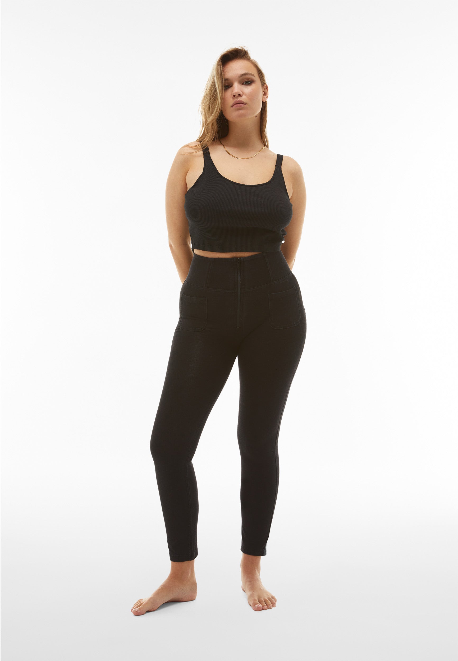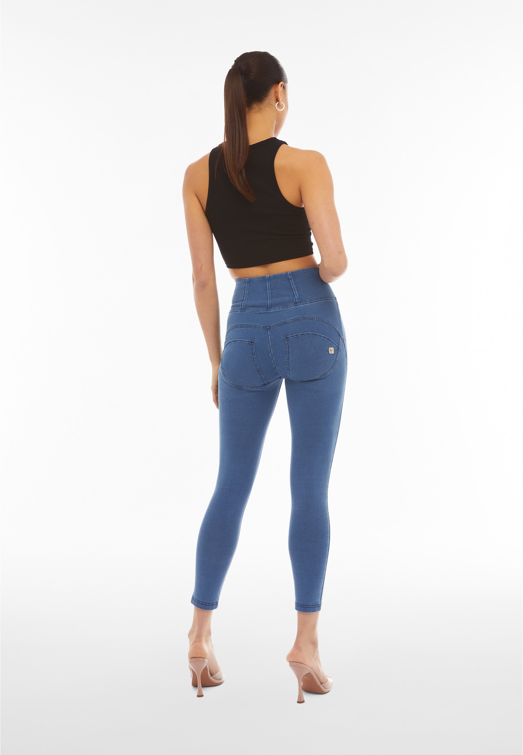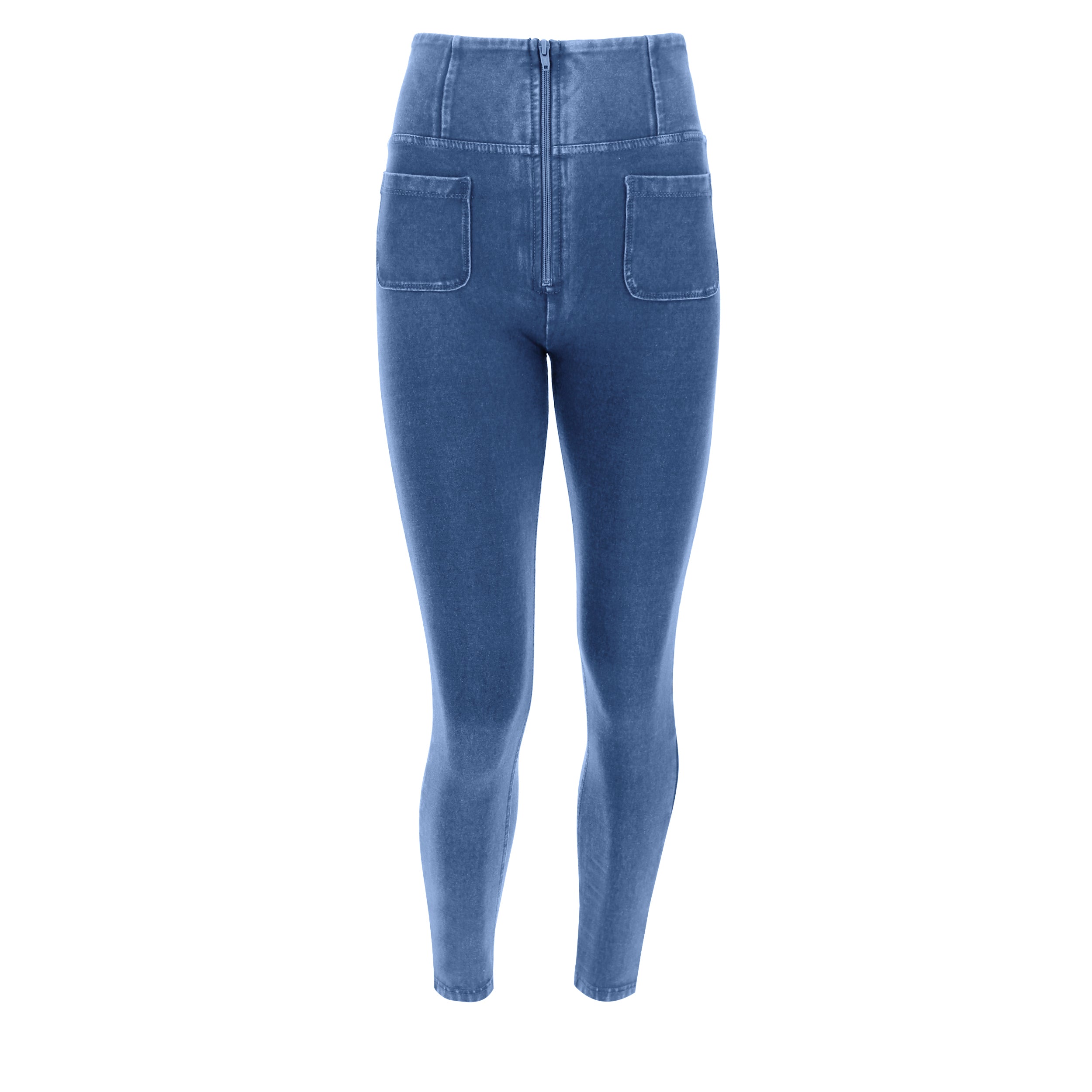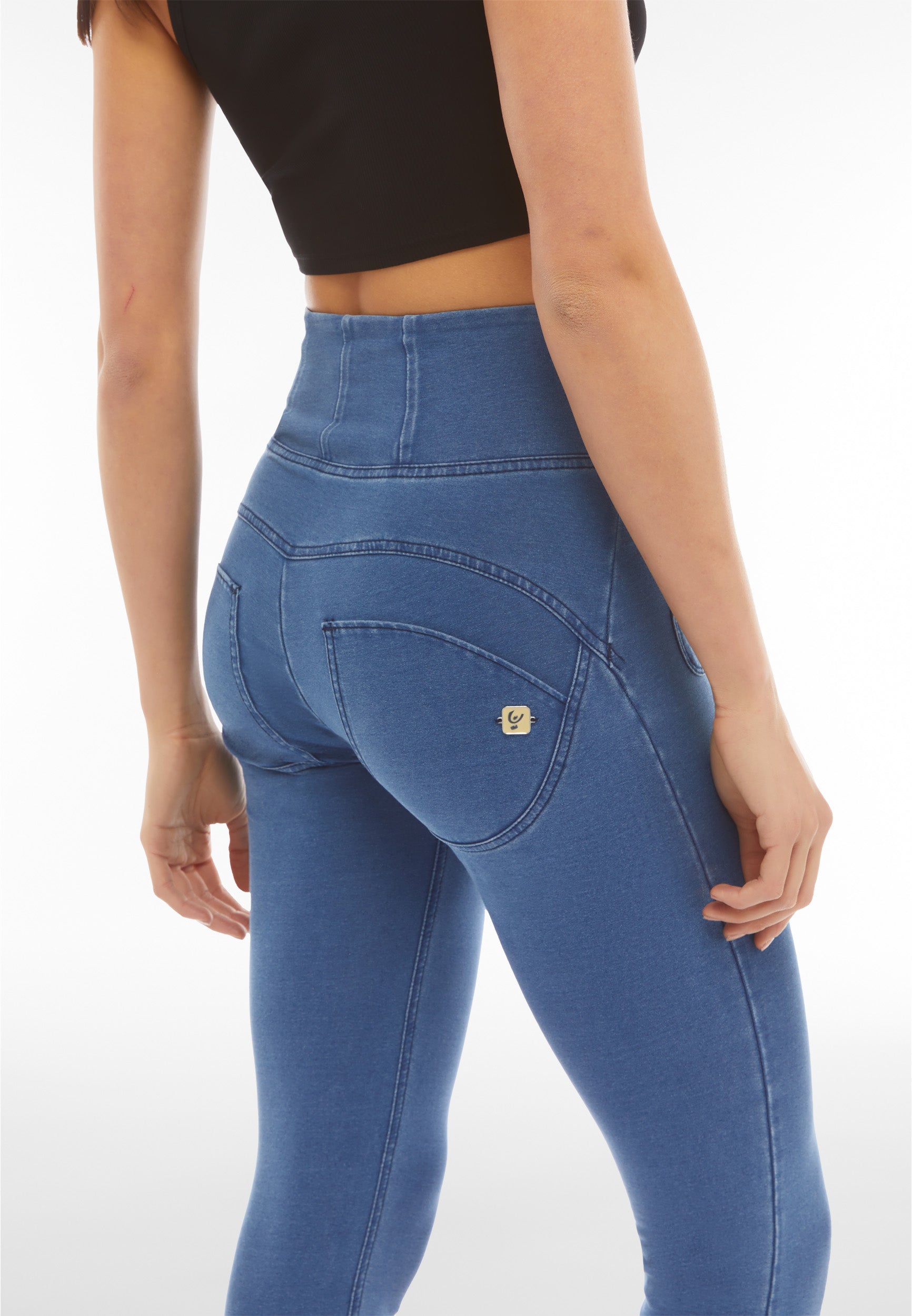 Pantalón push up con pequeños bolsillos frontales de plastrón de la línea WR.UP® en tejido de punto efecto denim elaborado con algodón orgánico y elastano reciclado, perfecto para resaltar tu feminidad en cualquier momento del día sin renunciar a la libertad de movimiento. El modelo presenta cintura super alta cerrada con cremallera frontal que esculpe el talle, largo 7/8 tobillero y ajuste superskinny para ceñir al máximo las formas del cuerpo, enfatizadas aún más por el agradable efecto shaping de la innovadora tecnología WR.UP® patentada por Freddy que mejora la silueta y da un agradable efecto moldeador y push up gracias a un sistema especial de inserciones y costuras.