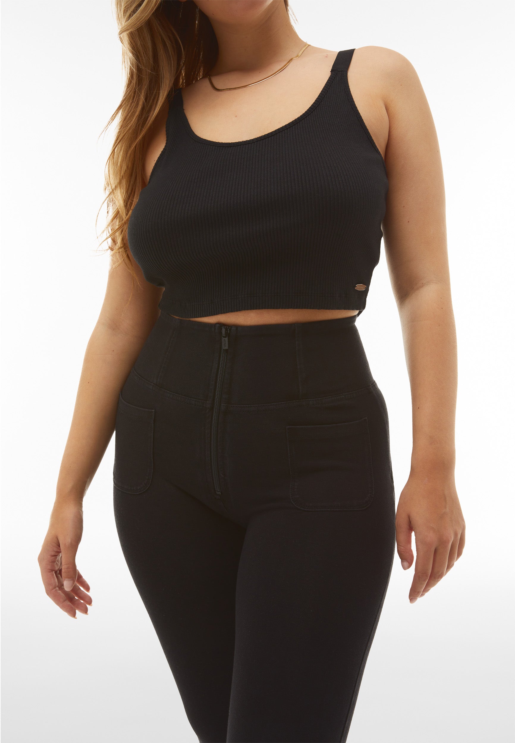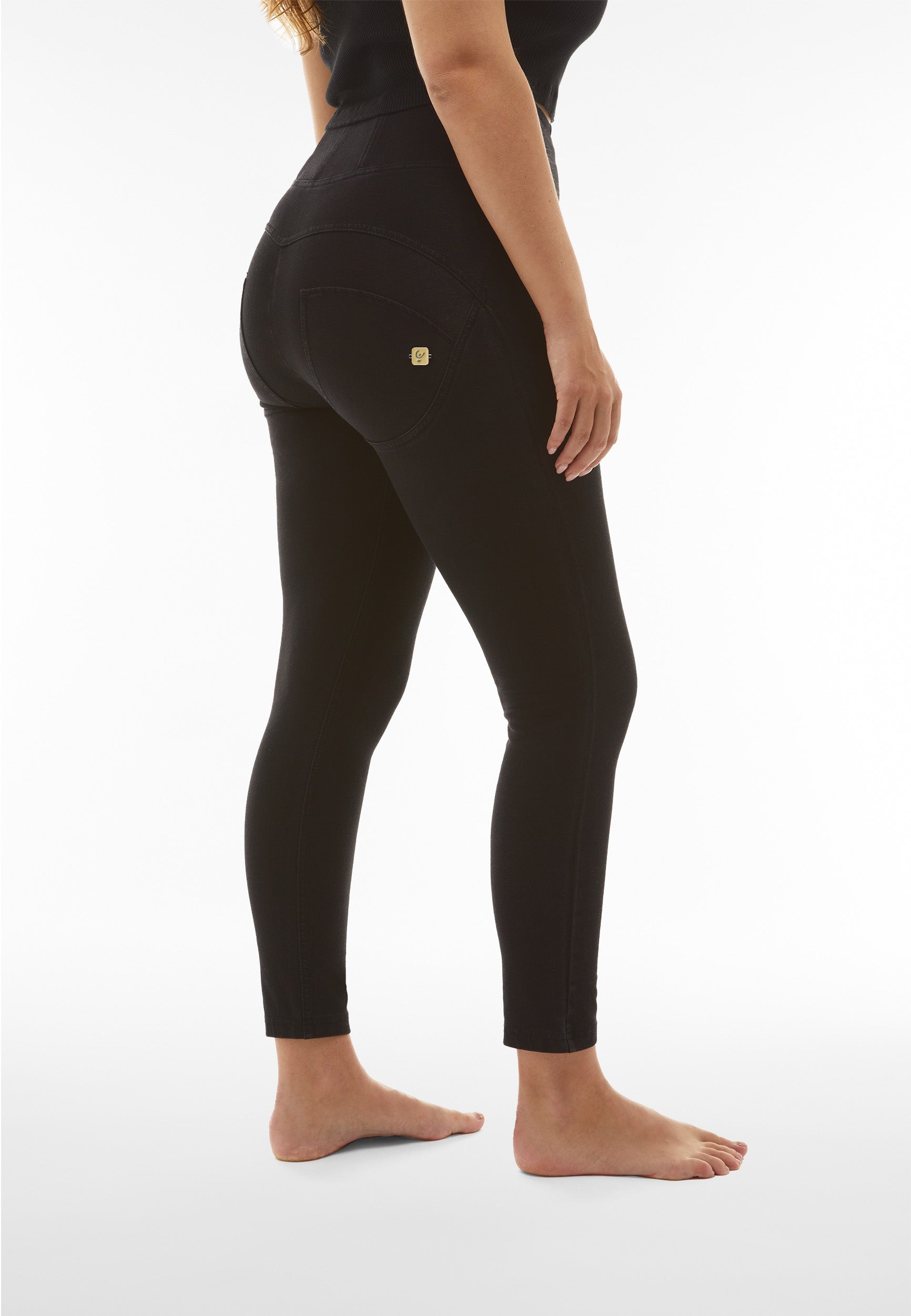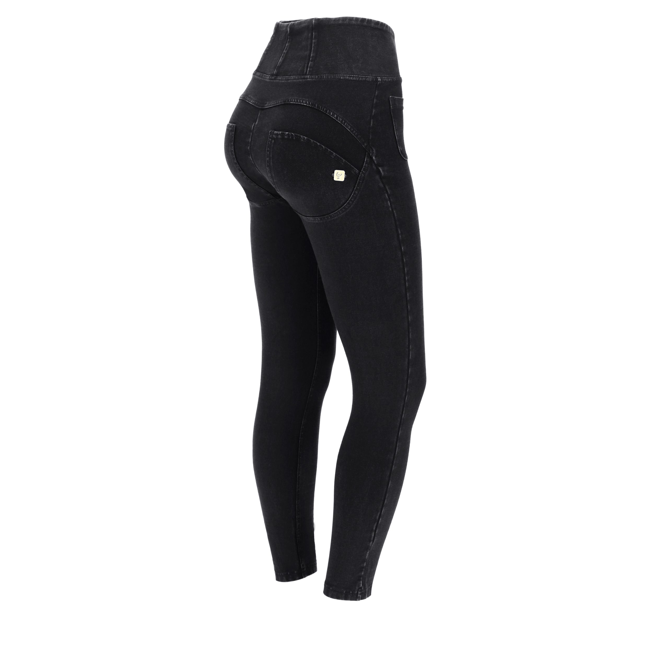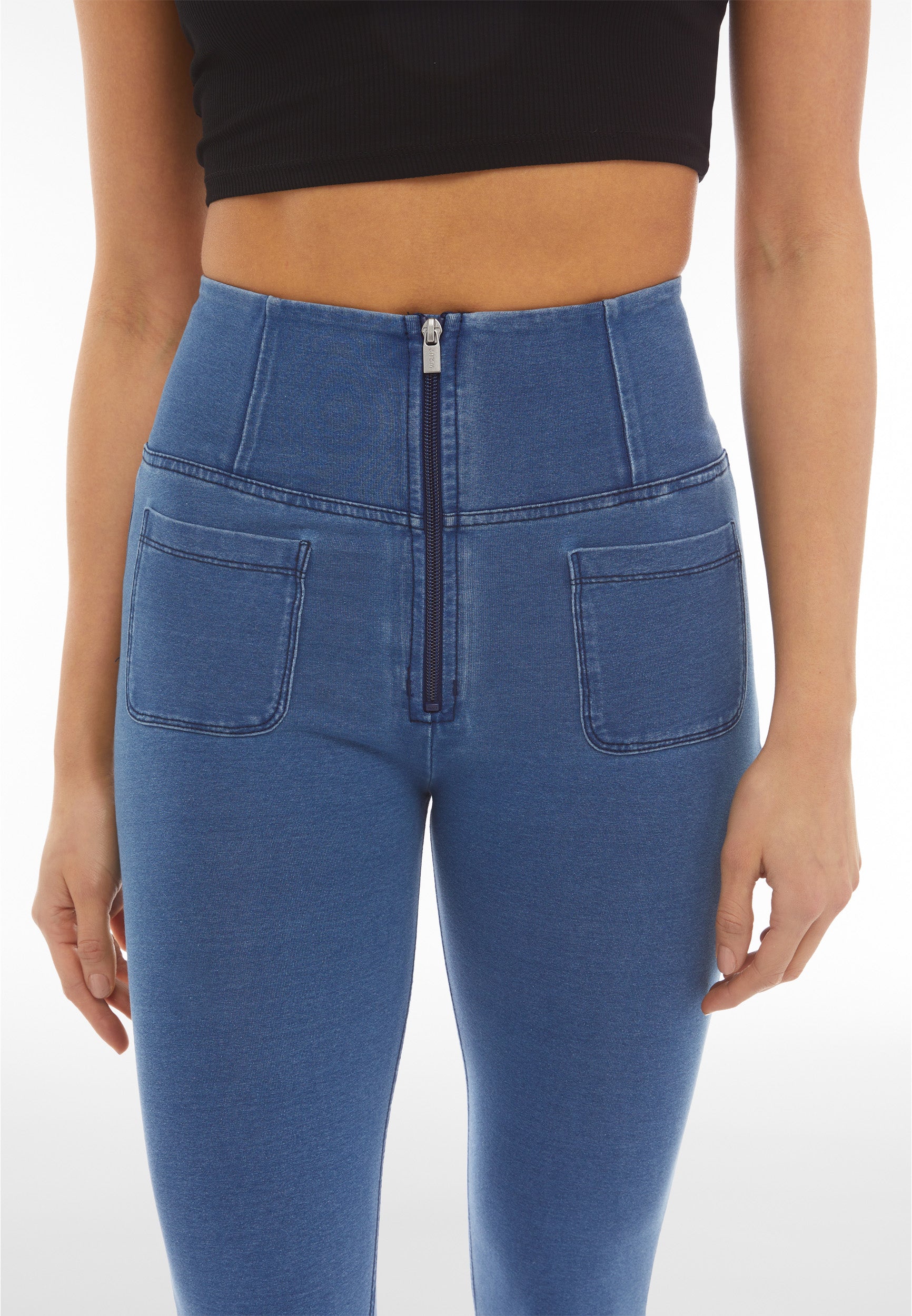 Pantalón push up con pequeños bolsillos frontales de plastrón de la línea WR.UP® en tejido de punto efecto denim elaborado con algodón orgánico y elastano reciclado, perfecto para resaltar tu feminidad en cualquier momento del día sin renunciar a la libertad de movimiento. El modelo presenta cintura super alta cerrada con cremallera frontal que esculpe el talle, largo 7/8 tobillero y ajuste superskinny para ceñir al máximo las formas del cuerpo, enfatizadas aún más por el agradable efecto shaping de la innovadora tecnología WR.UP® patentada por Freddy que mejora la silueta y da un agradable efecto moldeador y push up gracias a un sistema especial de inserciones y costuras.