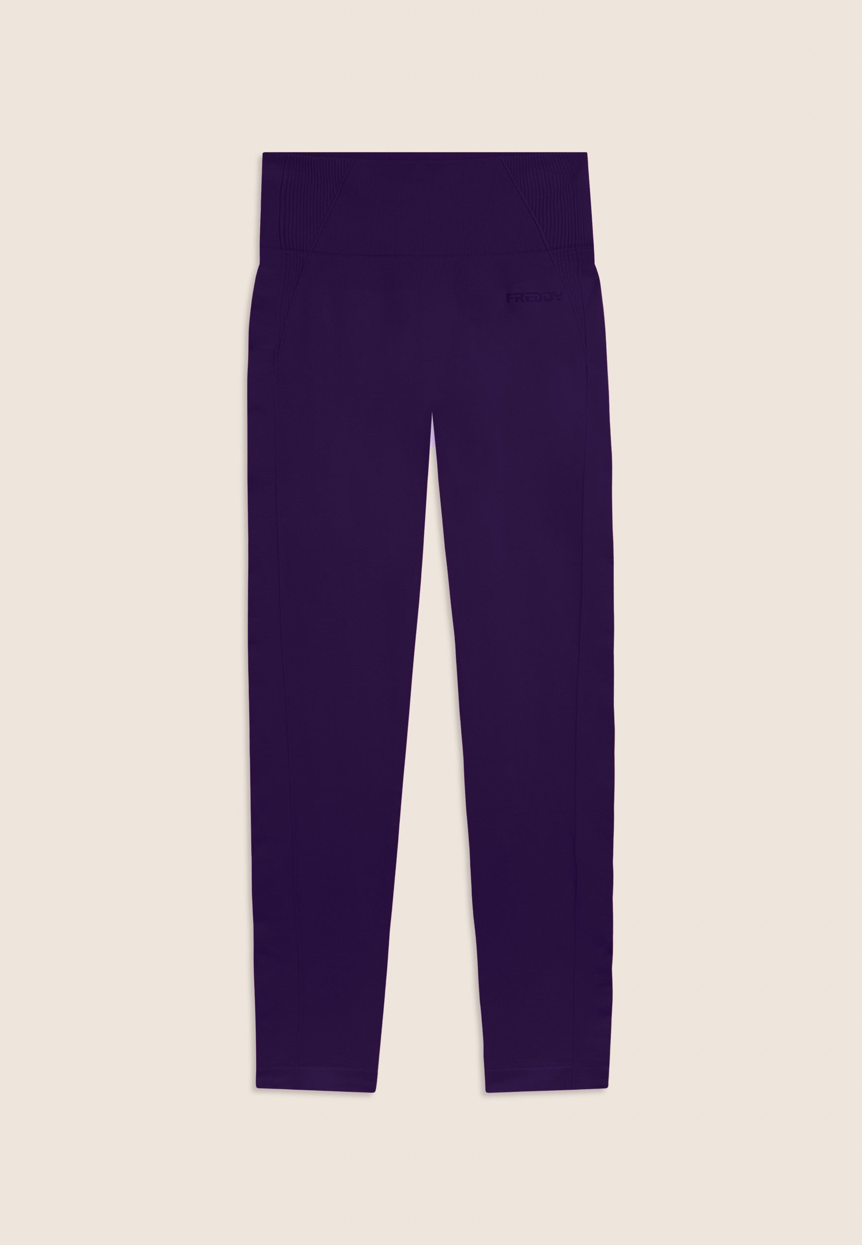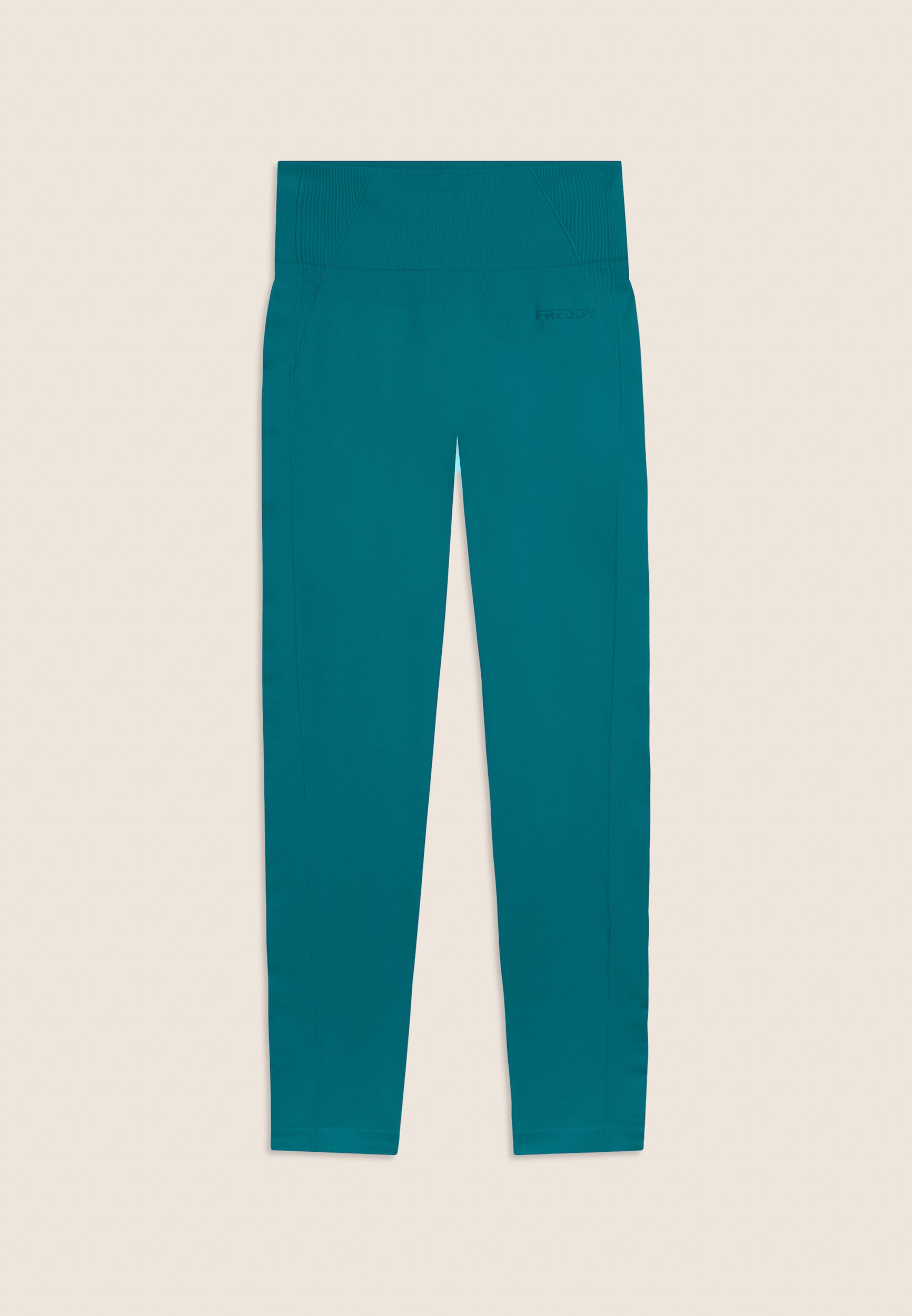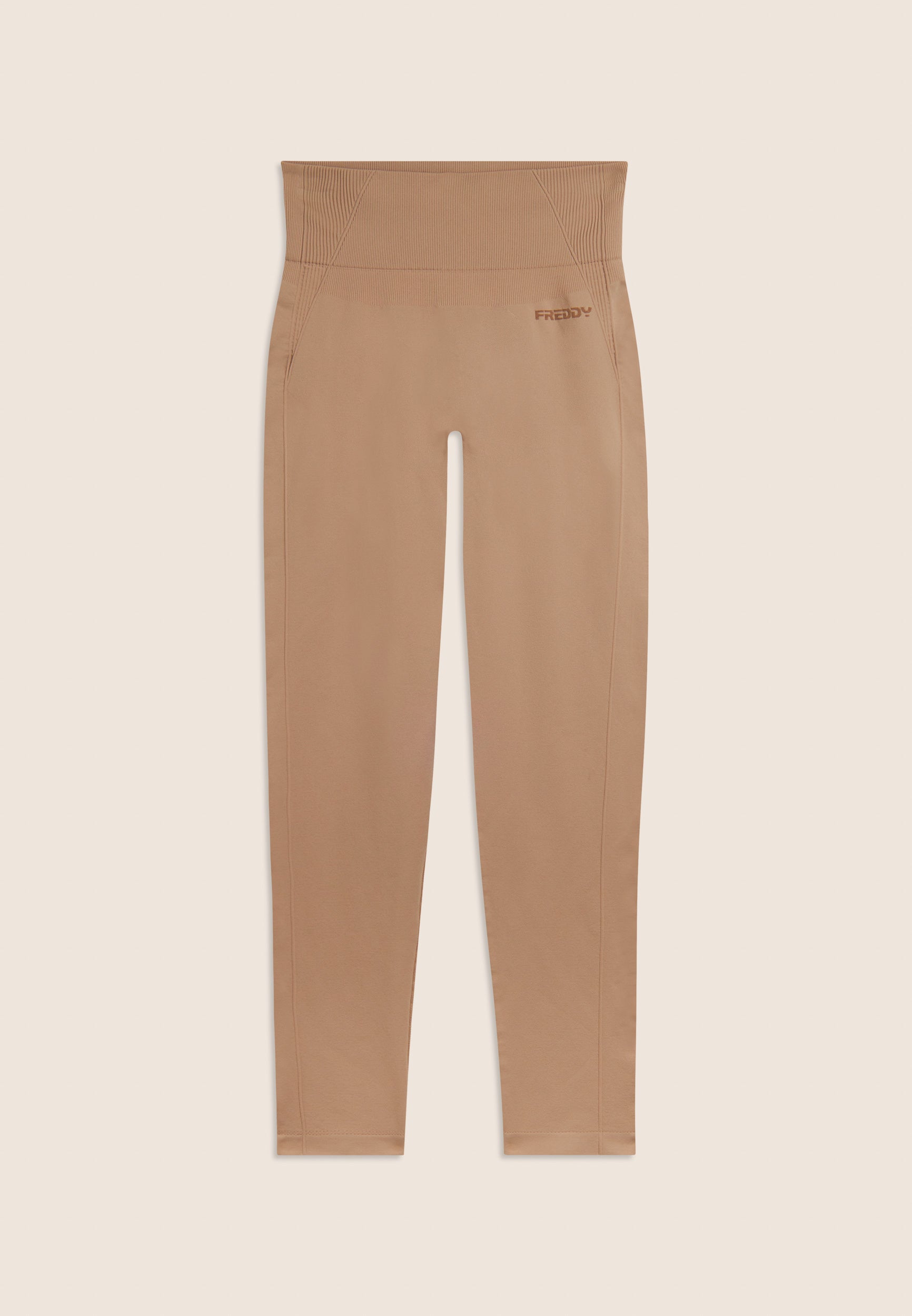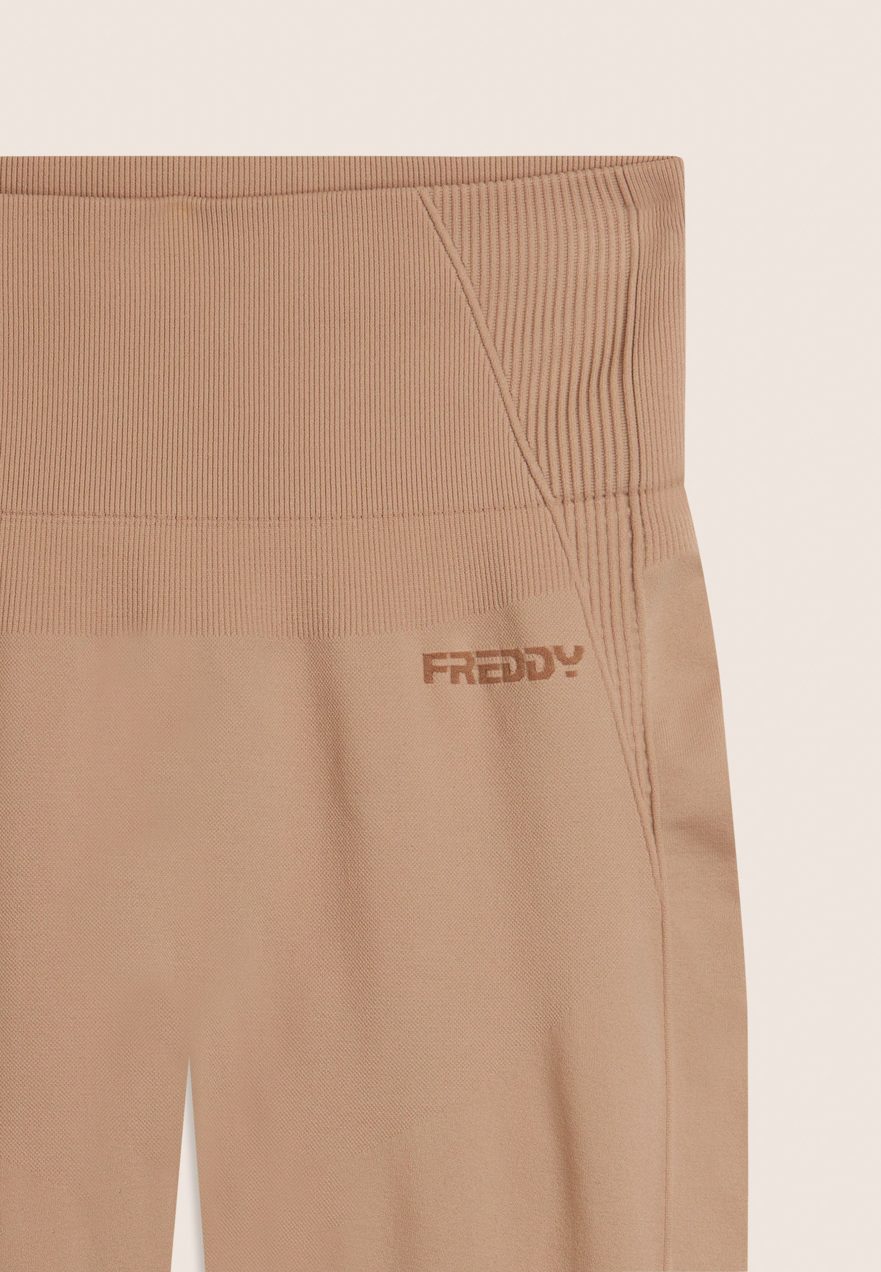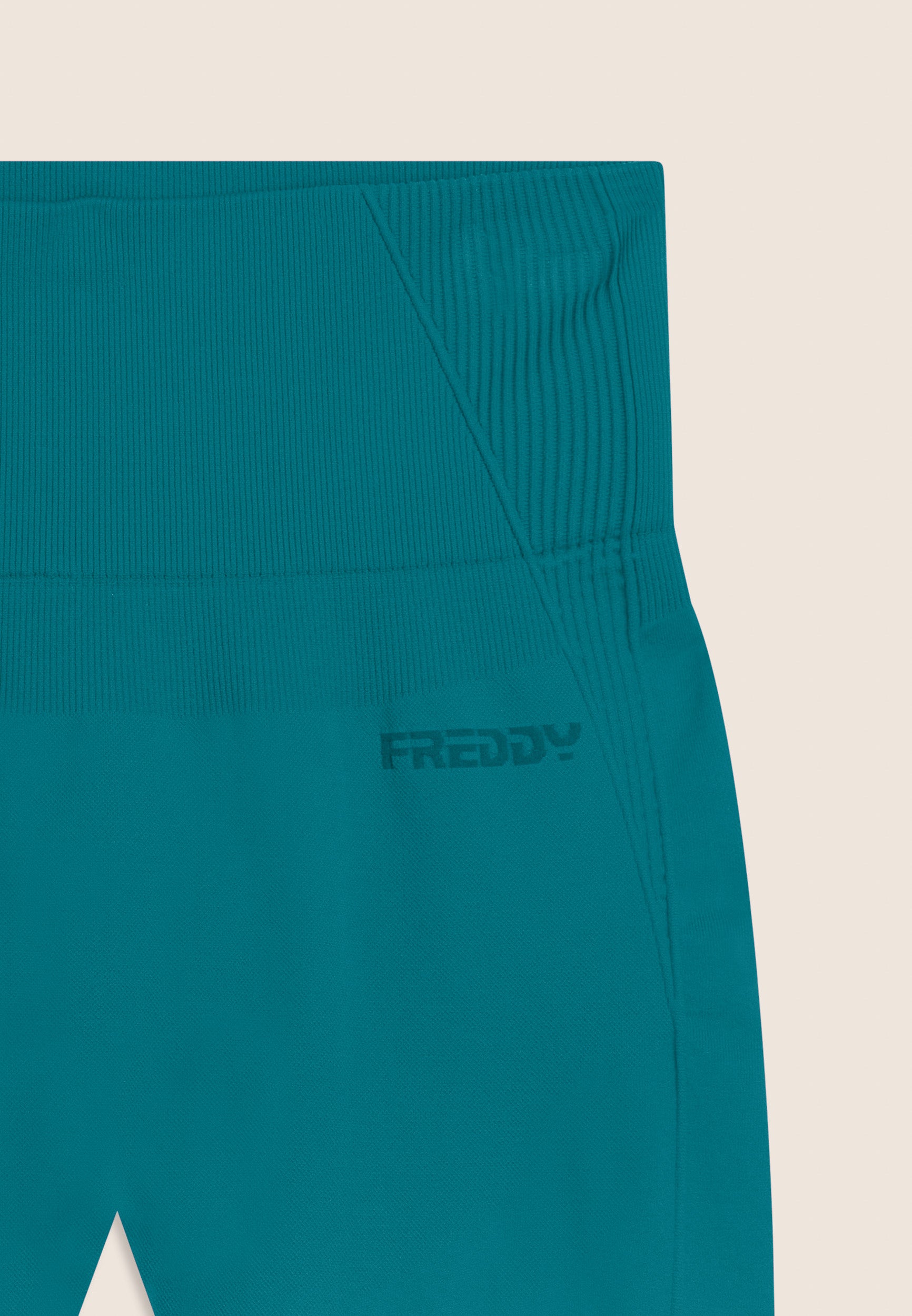I leggings seamless 7/8 con vita alta offrono un fit aderente e comodo, ideali per l'attività sportiva. Gli inserti in costina sul retro modellano e sostengono delicatamente le curve femminili, mentre il tessuto seamless garantisce una sensazione di morbidezza e comfort. Il logo FREDDY sul fianco anteriore e l'iconico "omino" sul fianco posteriore aggiungono un tocco distintivo a questo capo sportivo.