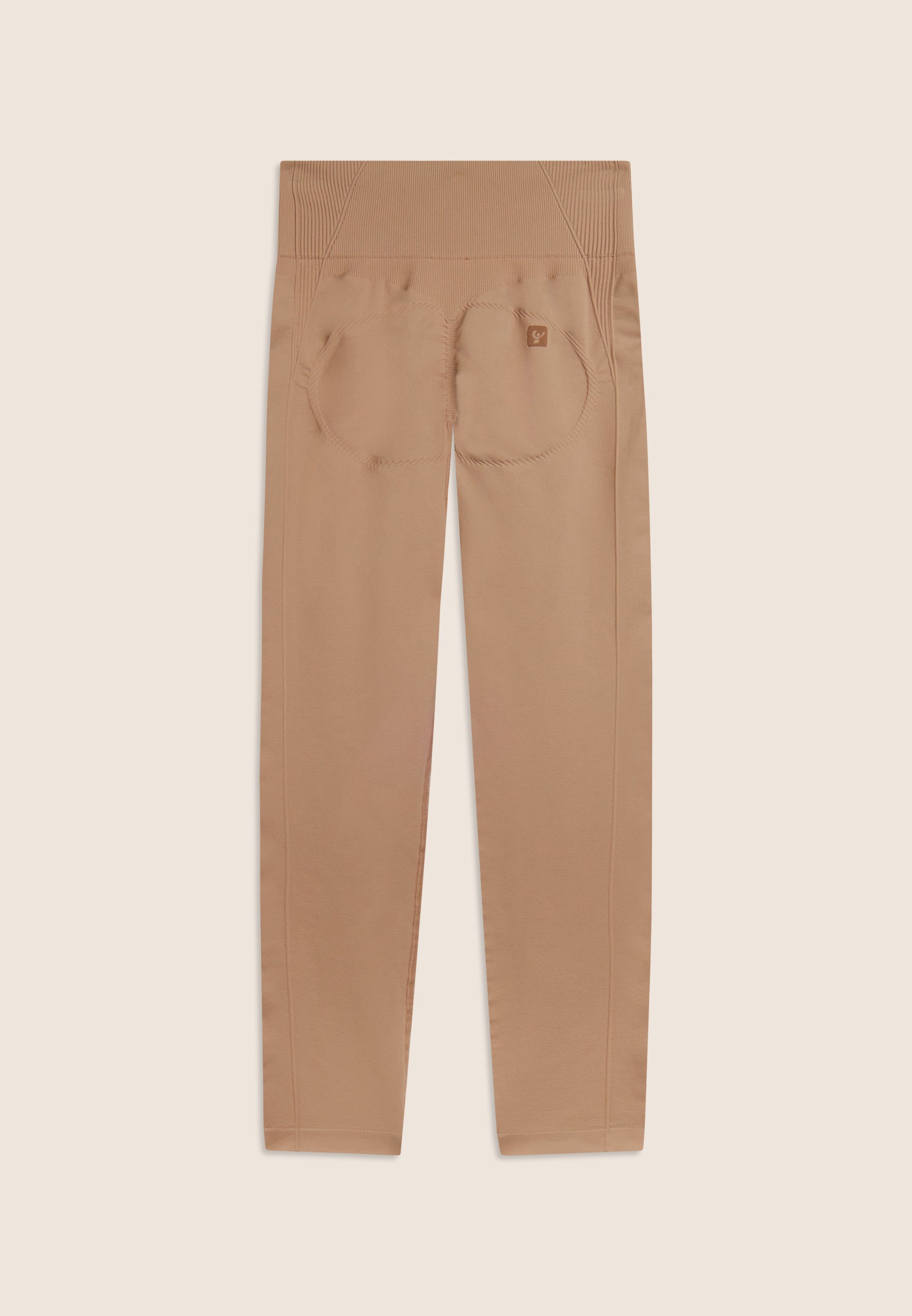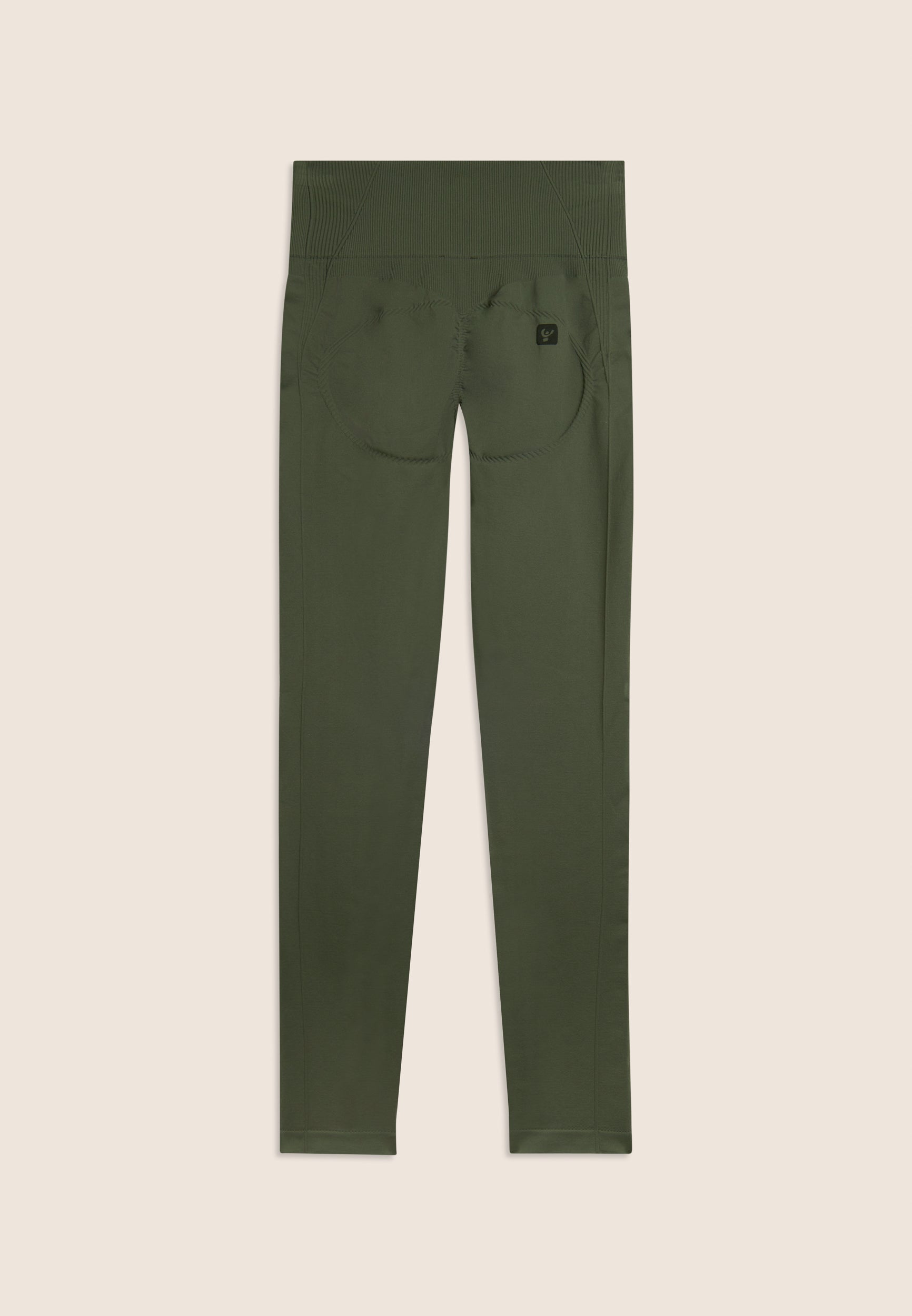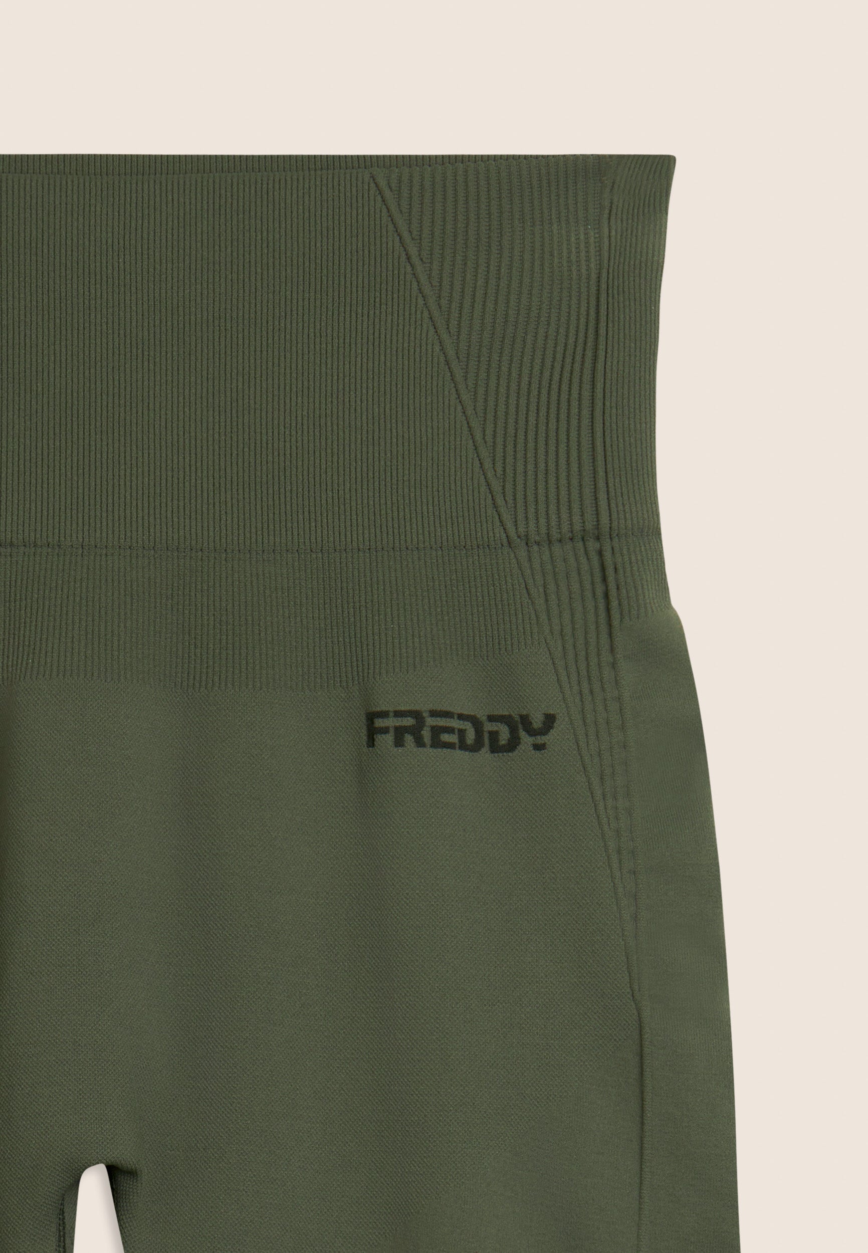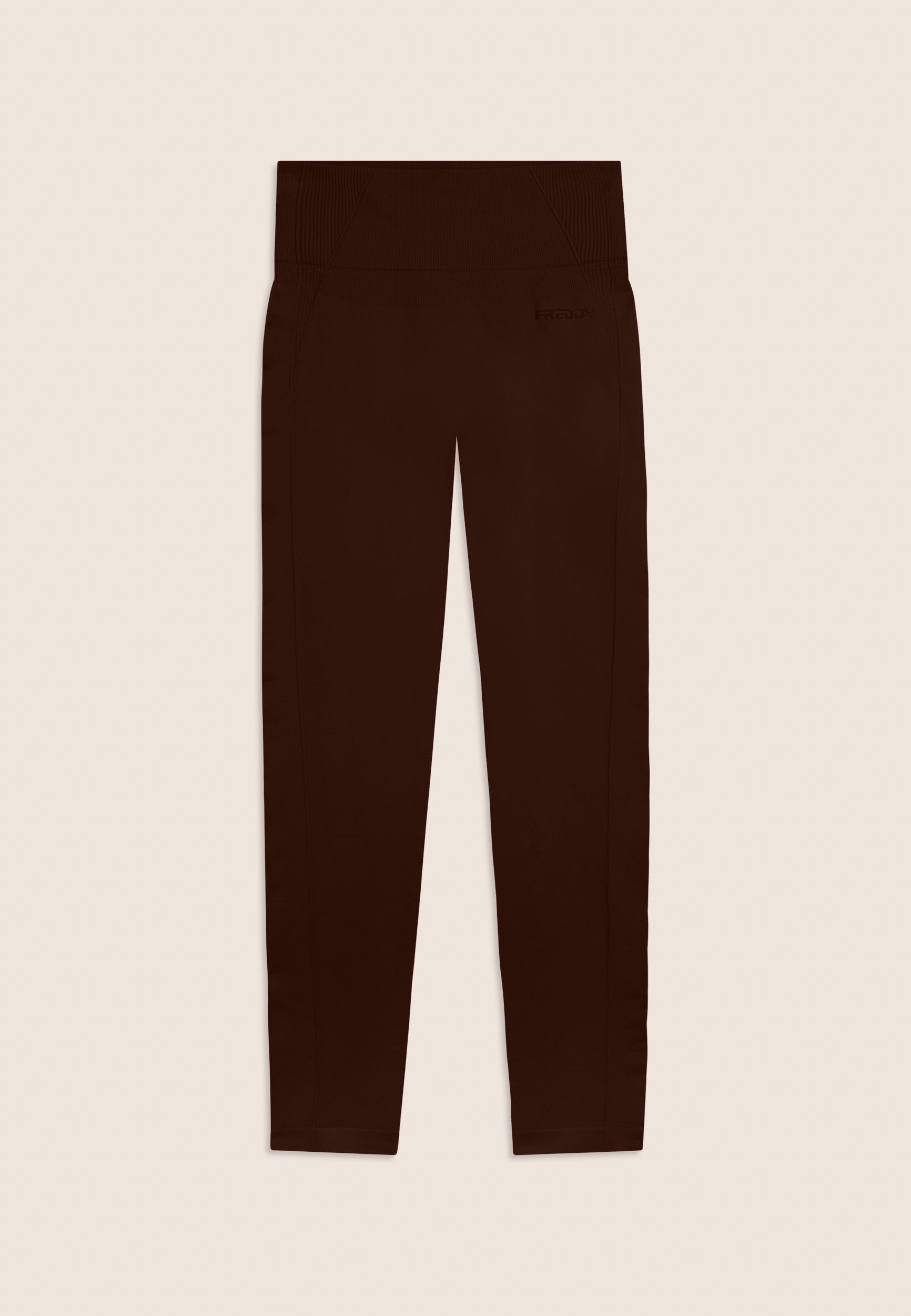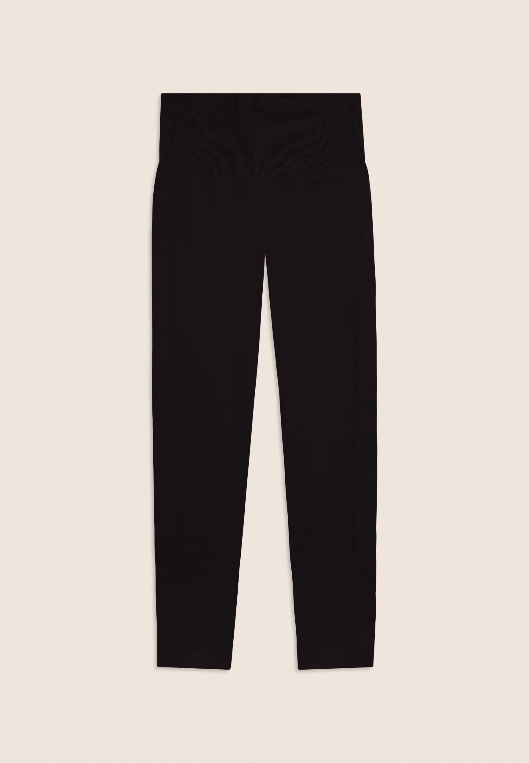 I leggings seamless 7/8 con vita alta offrono un fit aderente e comodo, ideali per l'attività sportiva. Gli inserti in costina sul retro modellano e sostengono delicatamente le curve femminili, mentre il tessuto seamless garantisce una sensazione di morbidezza e comfort. Il logo FREDDY sul fianco anteriore e l'iconico "omino" sul fianco posteriore aggiungono un tocco distintivo a questo capo sportivo.