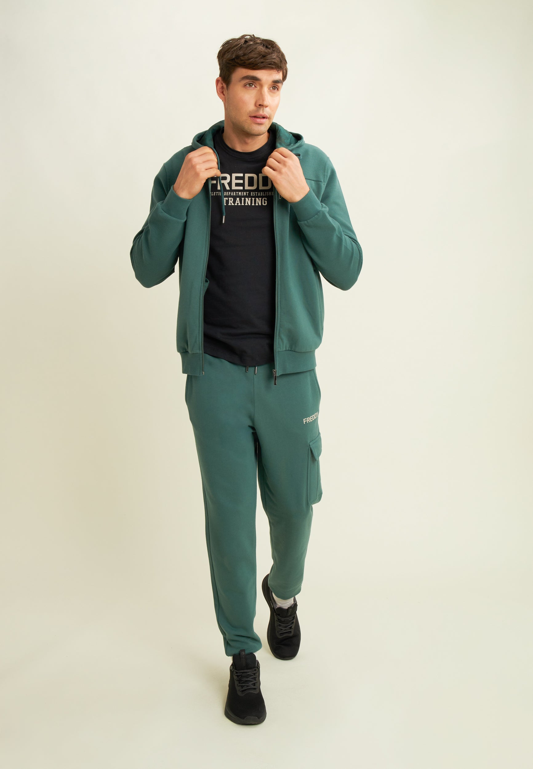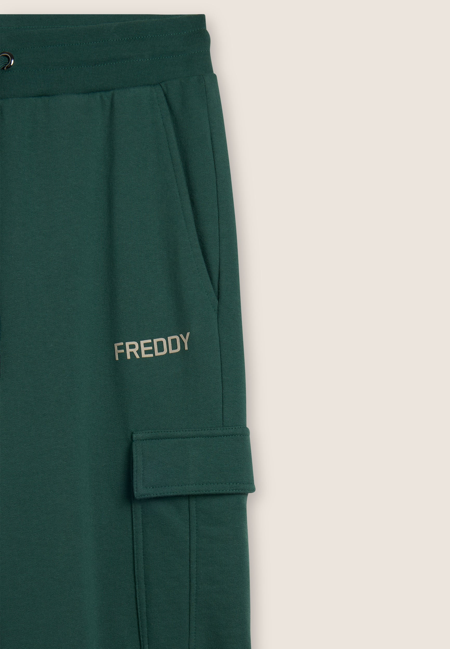 Pantalón deportivo en felpa perchada 100 % algodón con corte estándar y bajo acanalado. Cintura acanalada con cordón, bolsillos internos y bolsillo con solapa en el muslo izquierdo. Logotipo FREDDY estampado en el lateral.