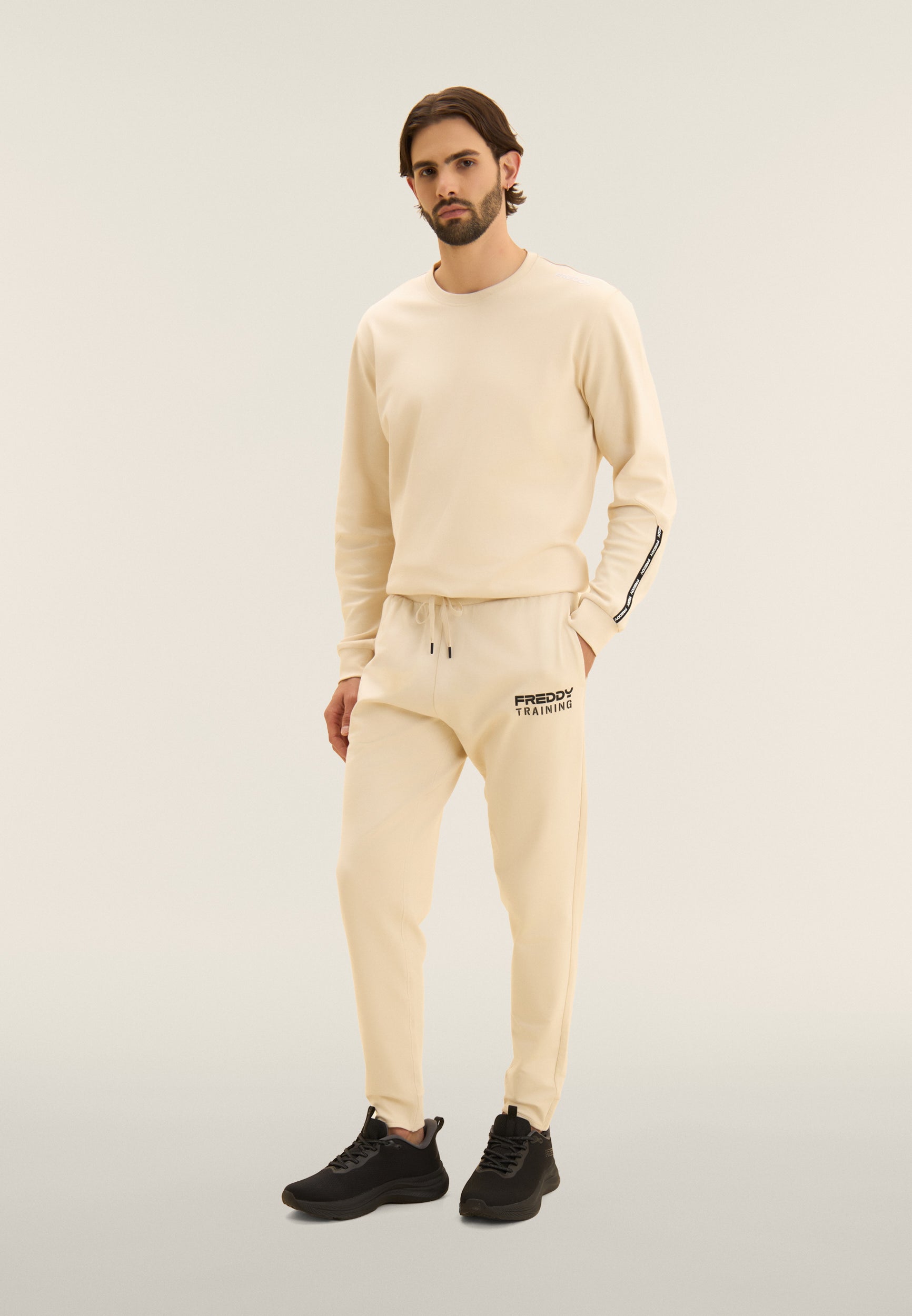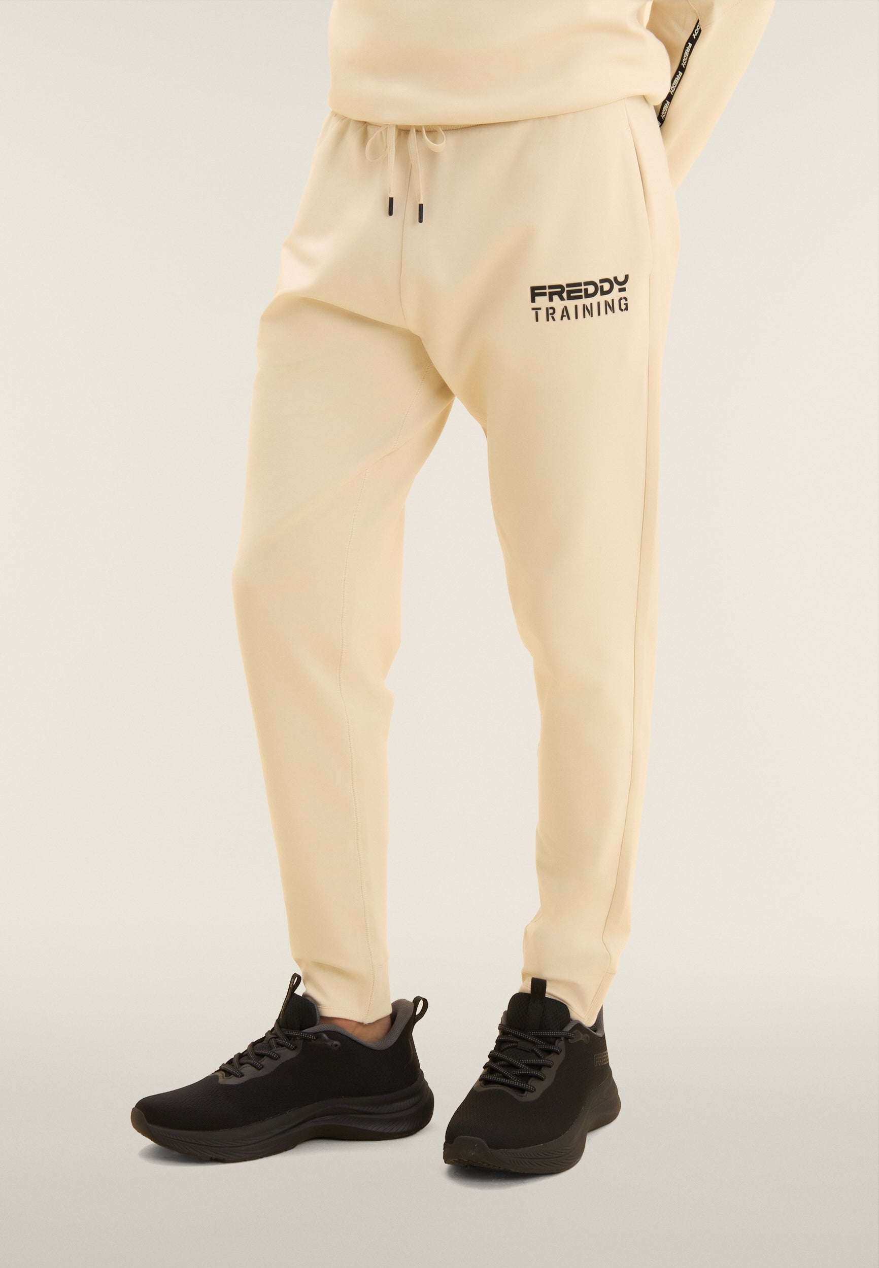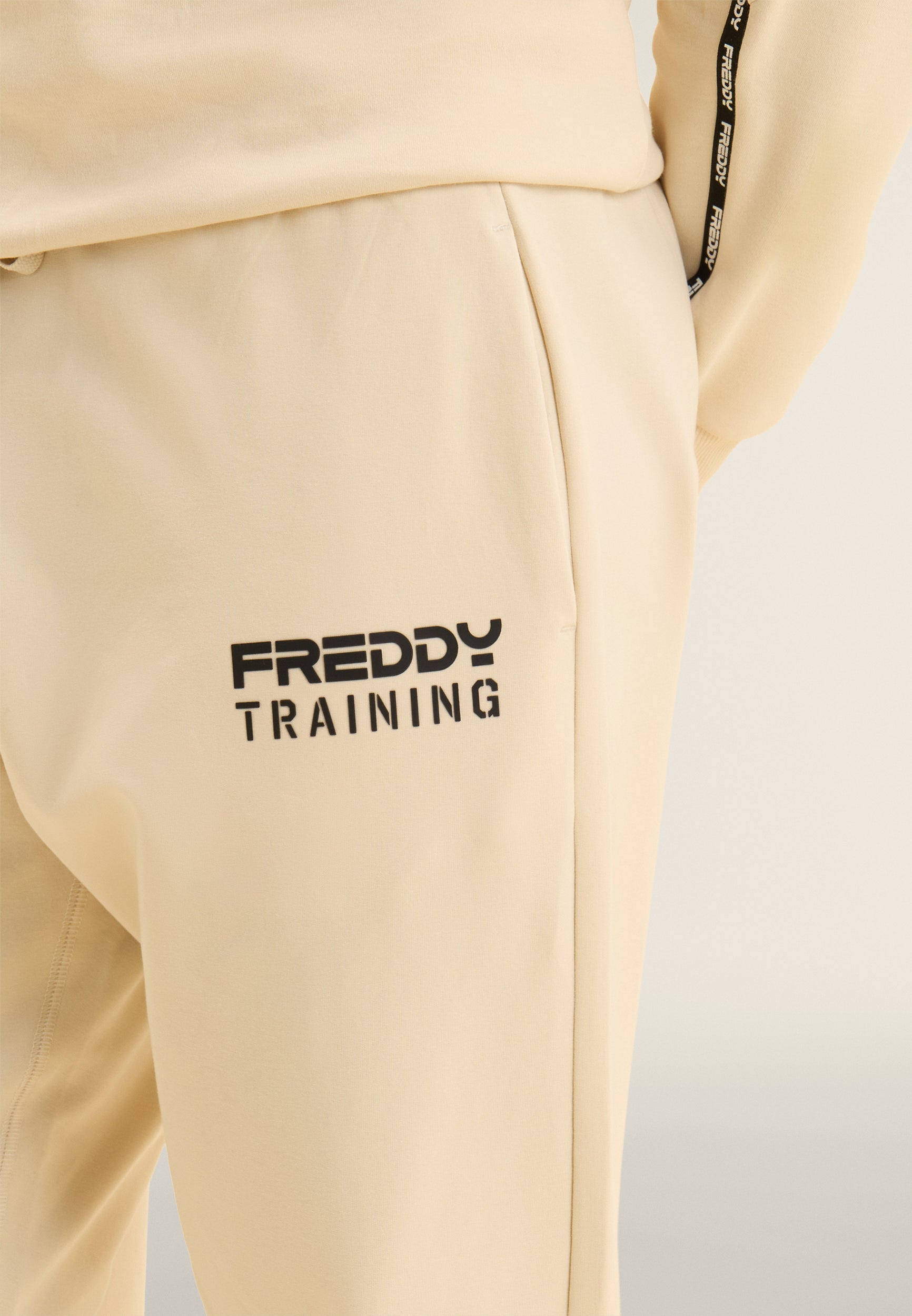 Pantalón deportivo de corte ceñido y largo recortado, ideal para entrenar o para días activos. La cintura regular de canalé está dotada de cordón para un ajuste regulable. La pernera ceñida termina con un bajo recto en la parte delantera y una inserción acanalada en la parte posterior, un detalle técnico que combina estilo y funcionalidad. El estampado «FREDDY TRAINING» en relieve en el lado izquierdo confiere personalidad a la prenda. Completan el diseño los bolsillos delanteros interiores y el bolsillo posterior con cremallera. Confeccionado en felpa francesa ligera para el máximo confort.
