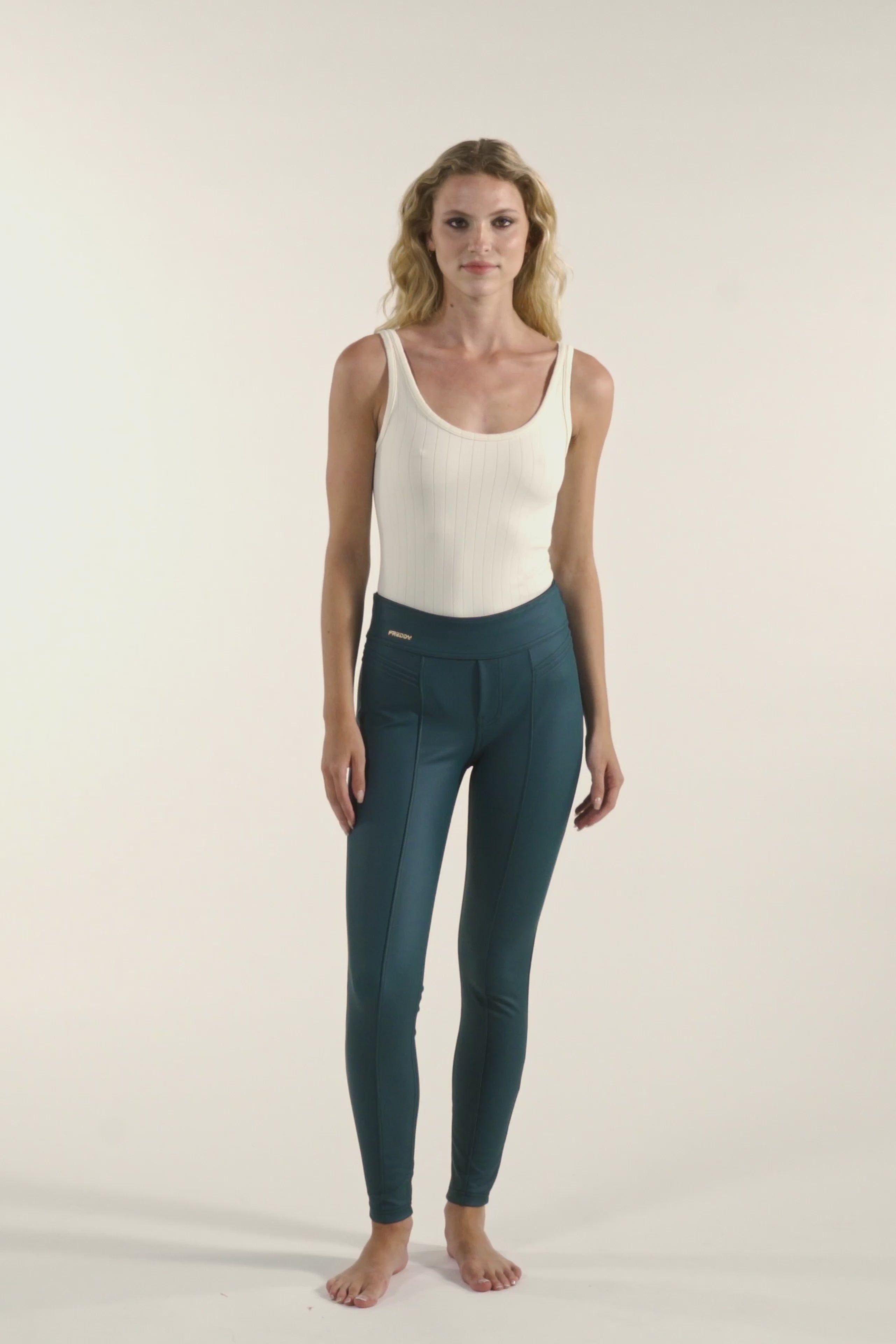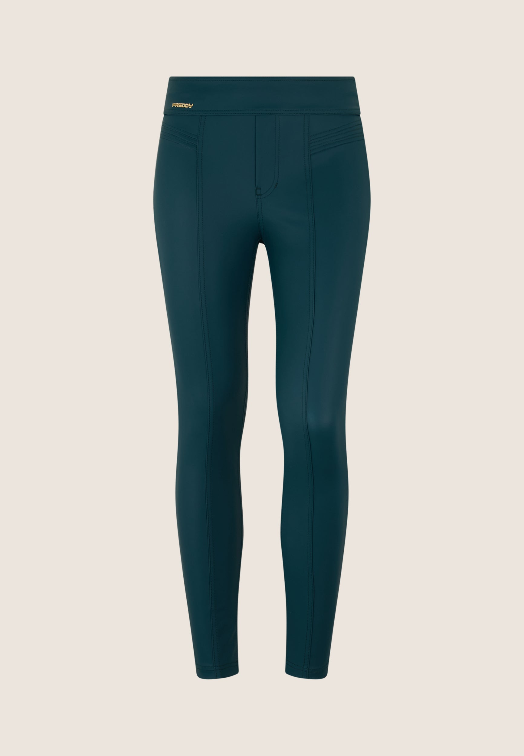 El tratamiento de revestimiento laminado otorga al tejido un acabado brillante y sofisticado, perfecto para un aspecto moderno y llamativo. La costura vertical en el centro de las perneras estiliza la figura, mientras que la ausencia de bolsillos en la parte delantera crea un diseño limpio y refinado. Las costuras superpuestas que decoran las caderas añaden un toque adicional de estilo y originalidad.