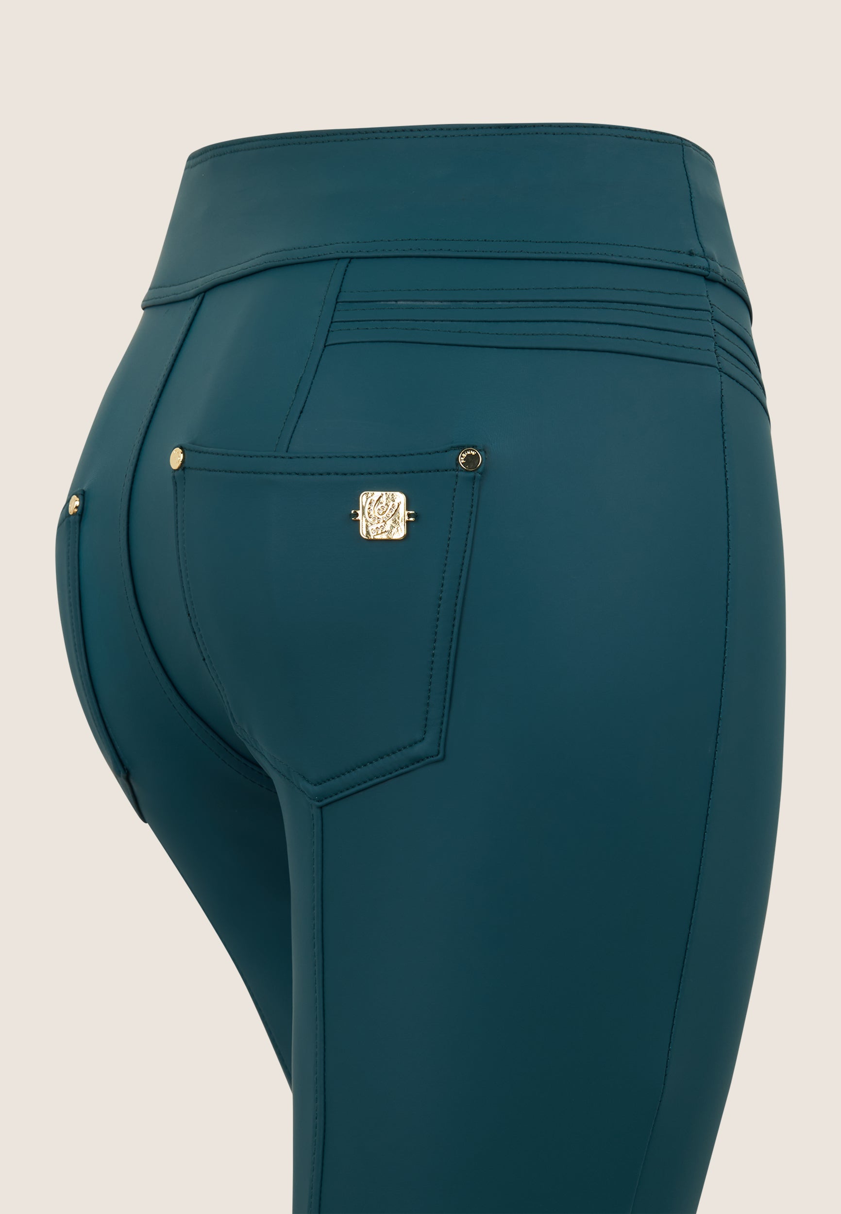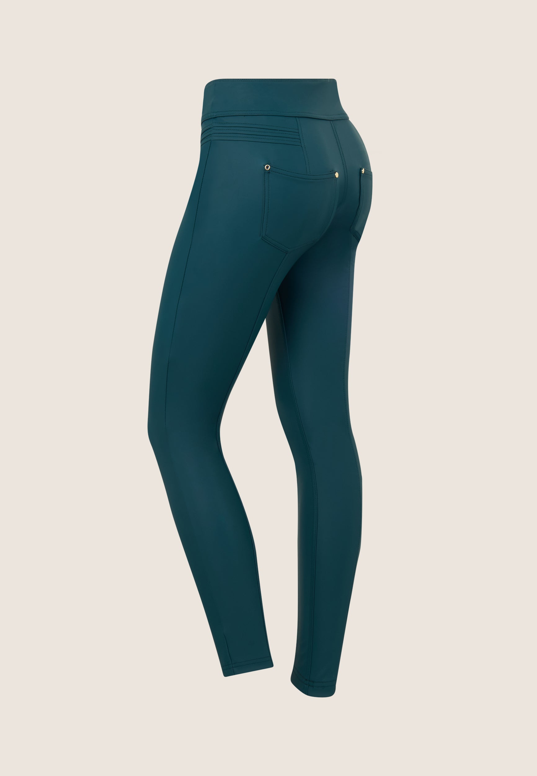 Explora un look atrevido y sostenible con los pantalones superpitillo N.O.W.® de imitación cuero laminado, con cintura alta y largo normal. Fabricados en poliéster a partir de fibras recicladas de botellas de plástico, estos pantalones son una opción ecológica y vanguardista.